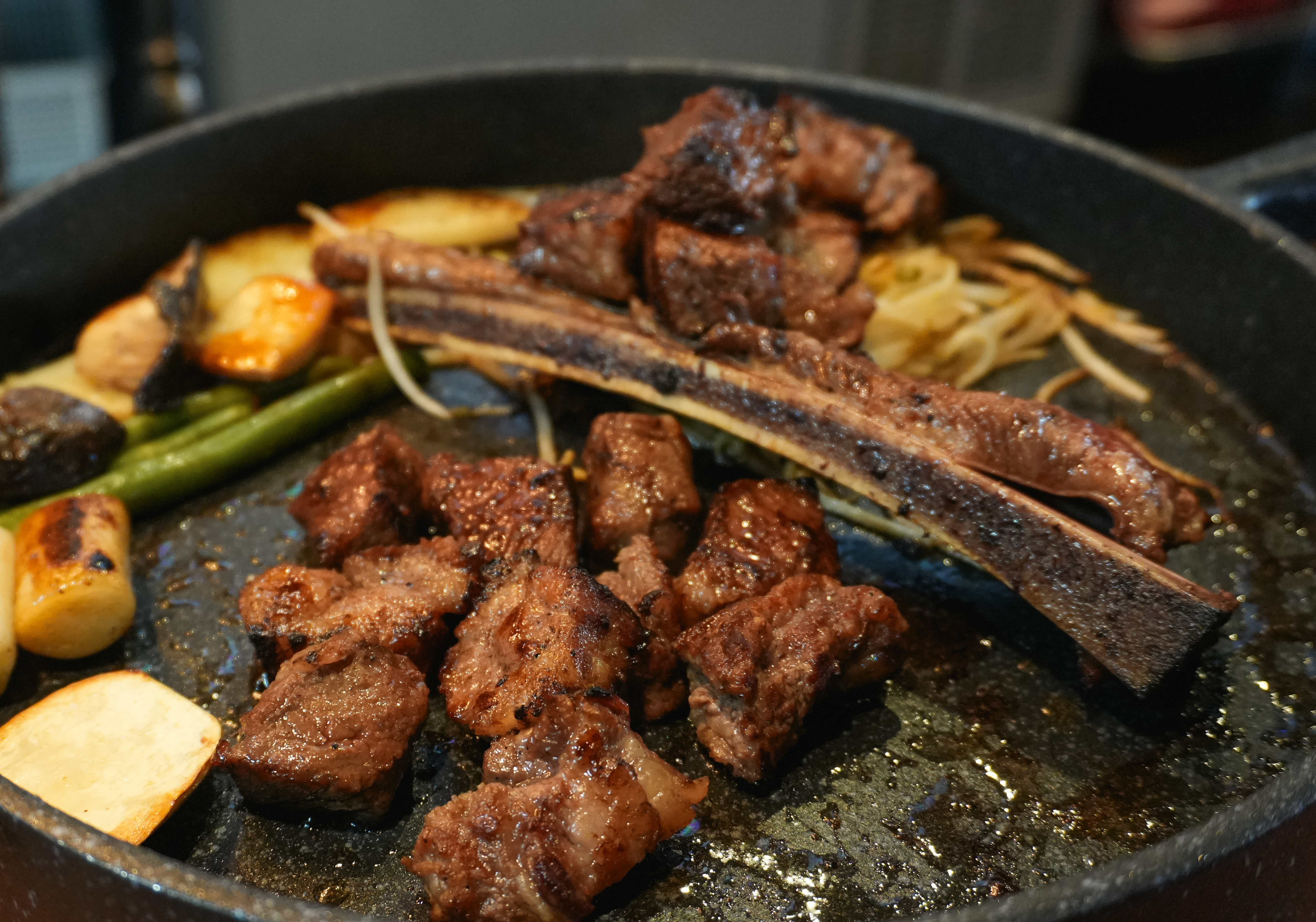 우대갈비는 먹기 좋게 한 입 크기로 잘라주고 있어서 편했고, 떡과 양파, 대파, 그린빈, 숙주, 감자 등을 함께 구워줘서 같이 곁들이기 좋았습니다. 솔탄갈비의 우대갈비는 양념이 살짝 배어있어 단짠단짠 한 맛이 있었고, 고기는 부드럽고 맛있었습니다.