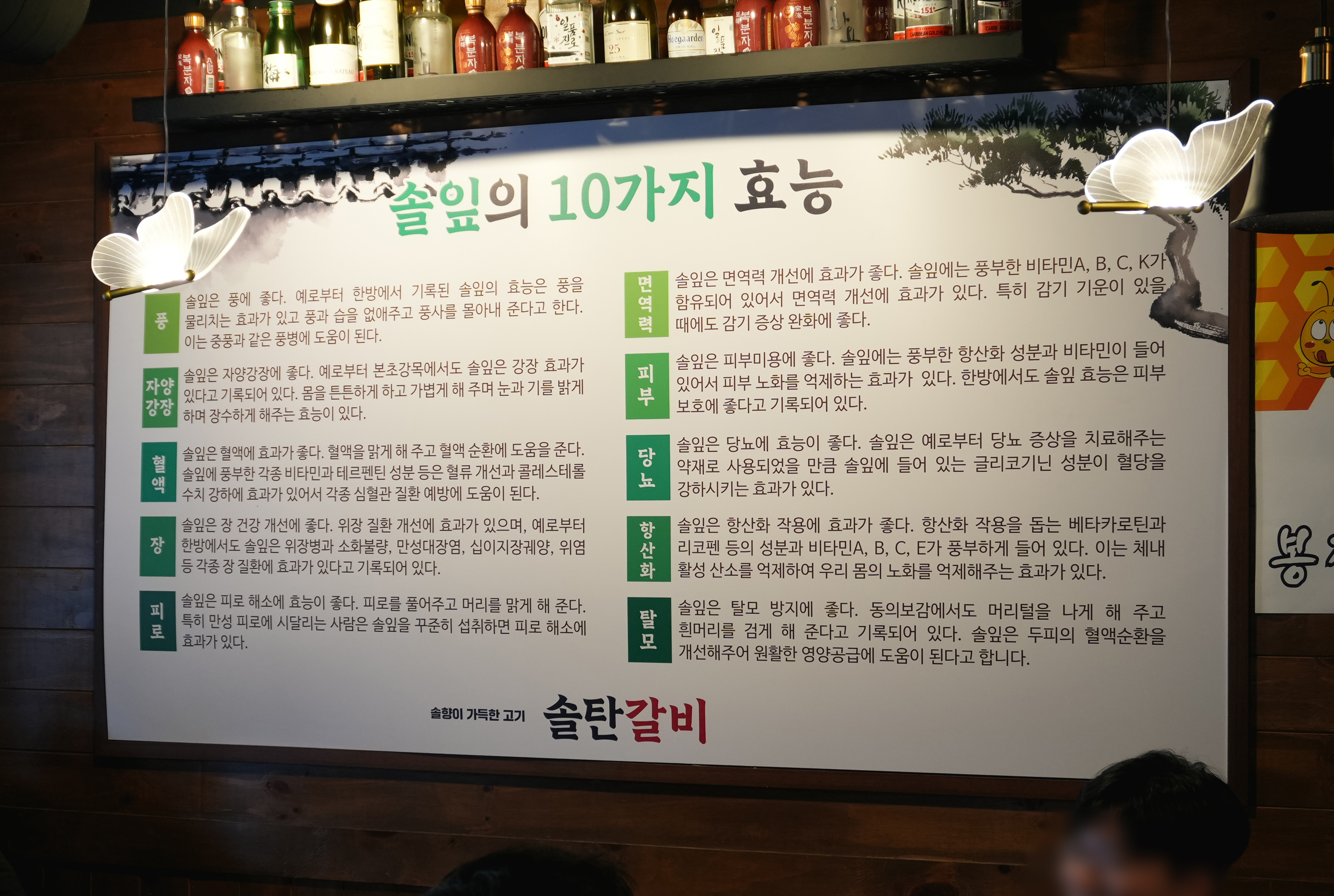 솔탄갈비는 솔잎을 사용한 우대갈비를 판매하여 솔잎의 효능 10가지에 대해 소개하는 글을 가게에 게시하고 있더라고요. 솔잎은 풍, 자양강장, 혈액, 장, 피로, 면역력, 피부, 당뇨, 항산화, 탈모에 좋은 효능이 있다고 합니다.