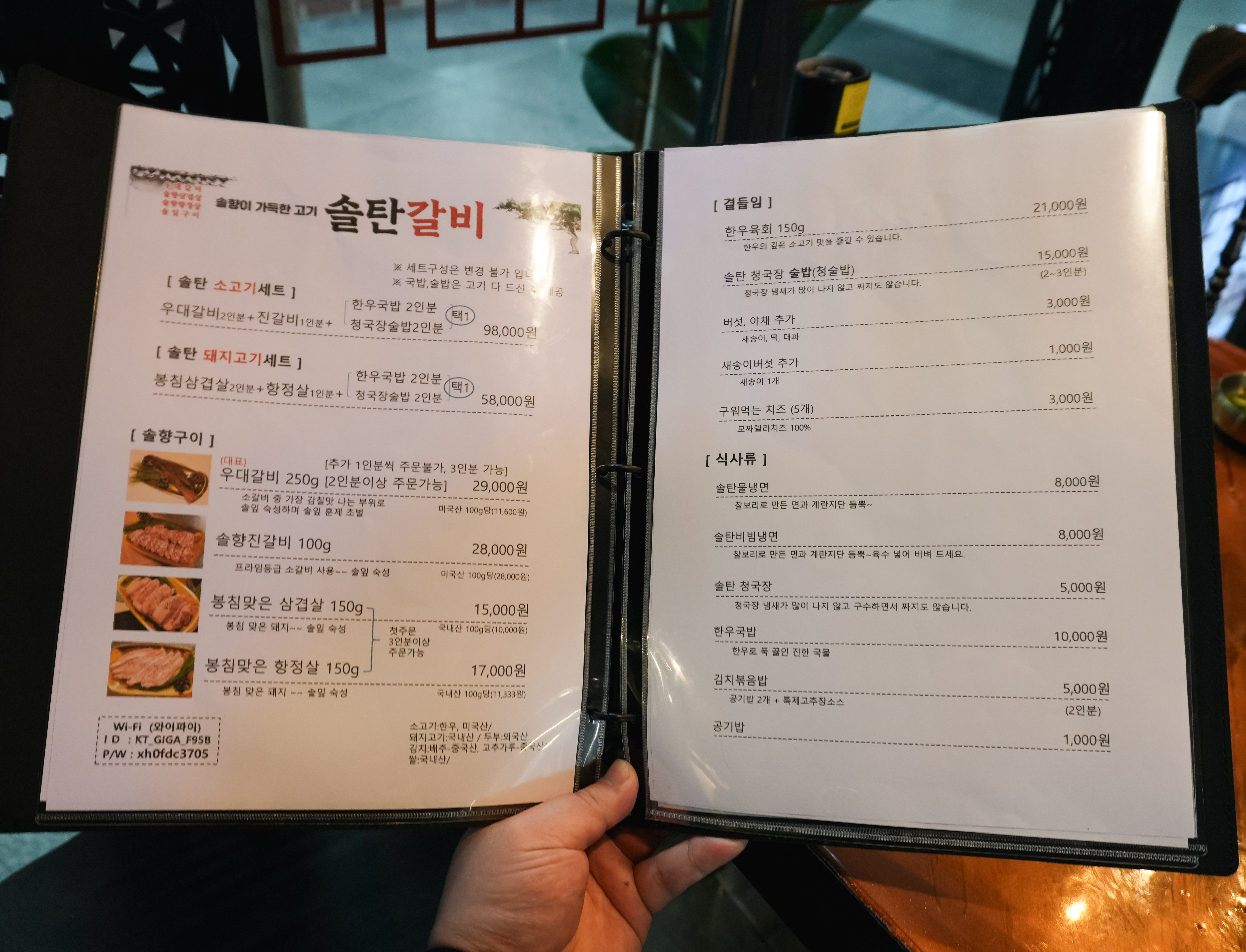 구디 솔탄갈비의 메뉴를 보시면, 솔탄소고기세트, 솔탄돼지고기세트, 우대갈비, 솔향진갈비, 봉침맞은삼겹살, 봉침맞은항정살, 한우육회, 솔탄청국장술밥, 솔탄물냉면, 솔탄비빔냉면, 솔탄청국장, 한우국밥, 김치볶음밥, 한우육회비빔밥, 한우소불고기 등이 있었습니다. 저는 우대갈비 2인분을 먹었습니다.