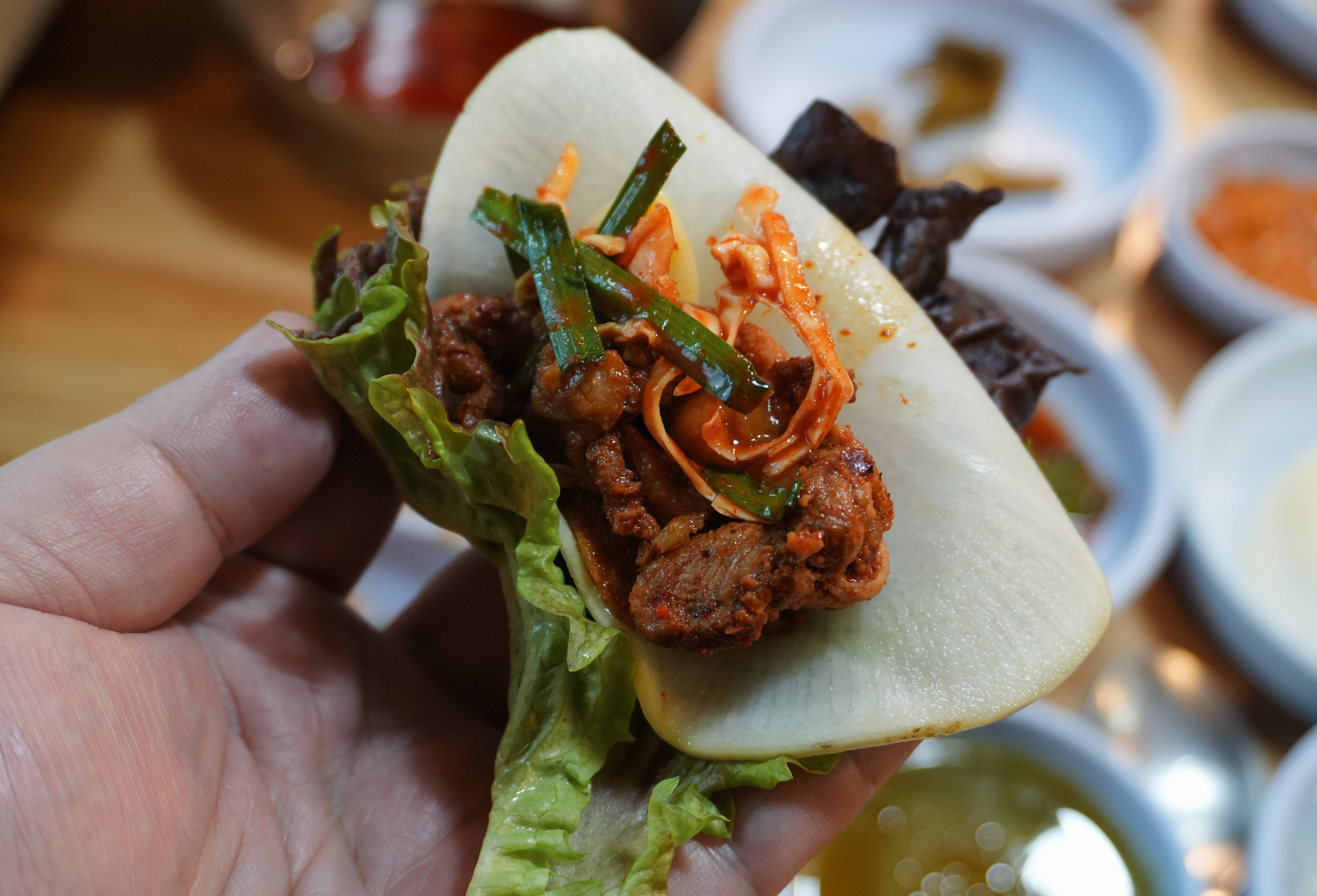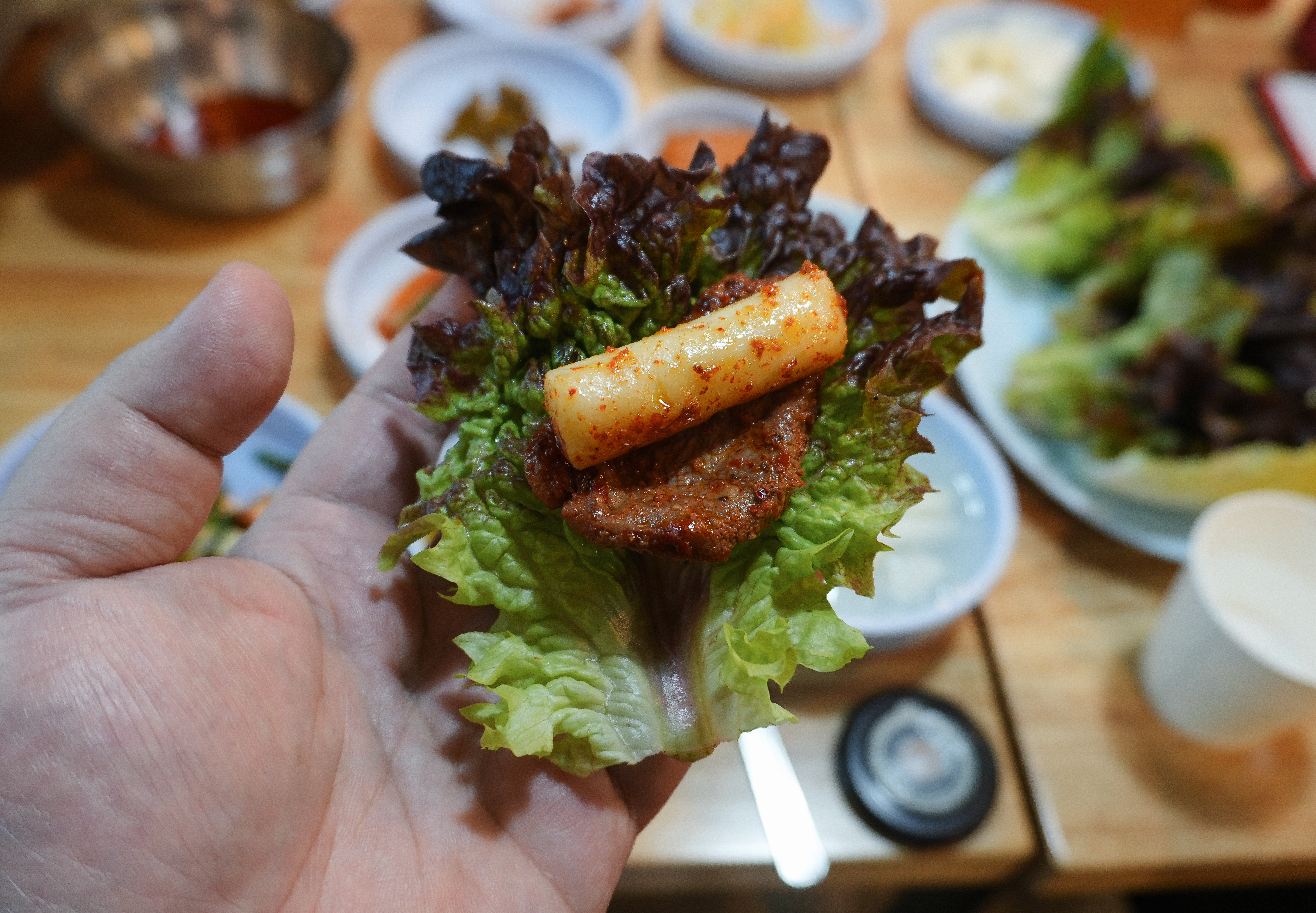 다 익은 양념오리의 모습은 위와 같습니다. 오리불고기 혹은 오리주물럭이라 불리는 이 메뉴는 제육볶음(?)과도 비슷한 느낌이 있었는데, 오리고기로 만들어서 더 담백하고 고소한 맛이 있었고, 매콤한 양념에 버무려 계속 당기는 맛이 있었습니다. 감자와 떡도 맛이 좋았고, 쌈채소에 곁들여서 먹으니 느끼하지 않고 더 맛있게 먹을 수 있었습니다.