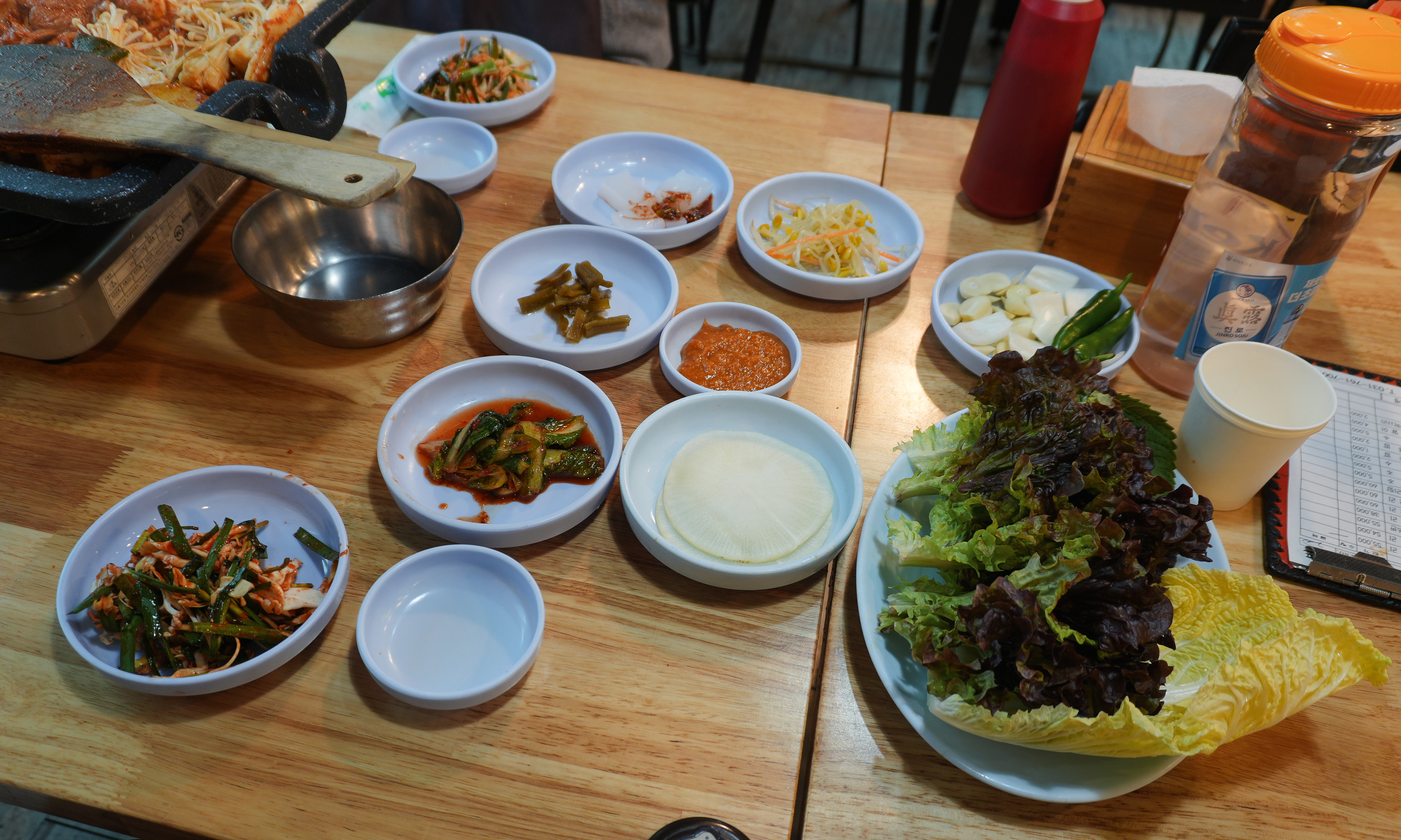반찬은 와사비간장소스, 초고추장으로 버무린 부추무침, 쌈채소, 쌈무, 콩나물, 마늘, 양파 등이 나왔습니다. 저는 양념오리랑 초고추장으로 버무린 부추무침을 주로 곁들여 먹었는데, 초고추장에 채 썬 부추와 양배추를 넣고 버무려 식감도 좋고, 기름진 오리고기의 느끼함을 잡아주어 좋더라고요.
