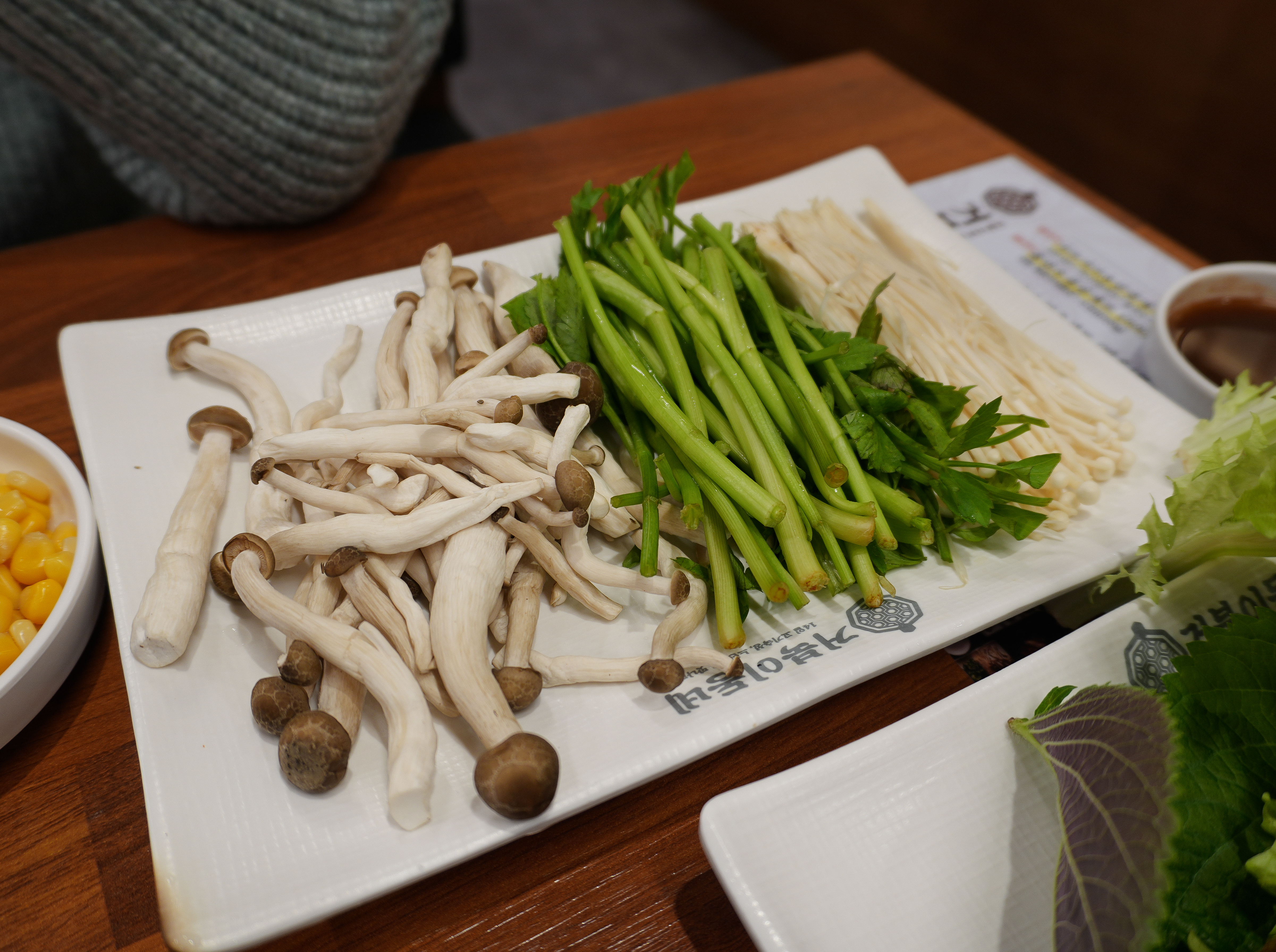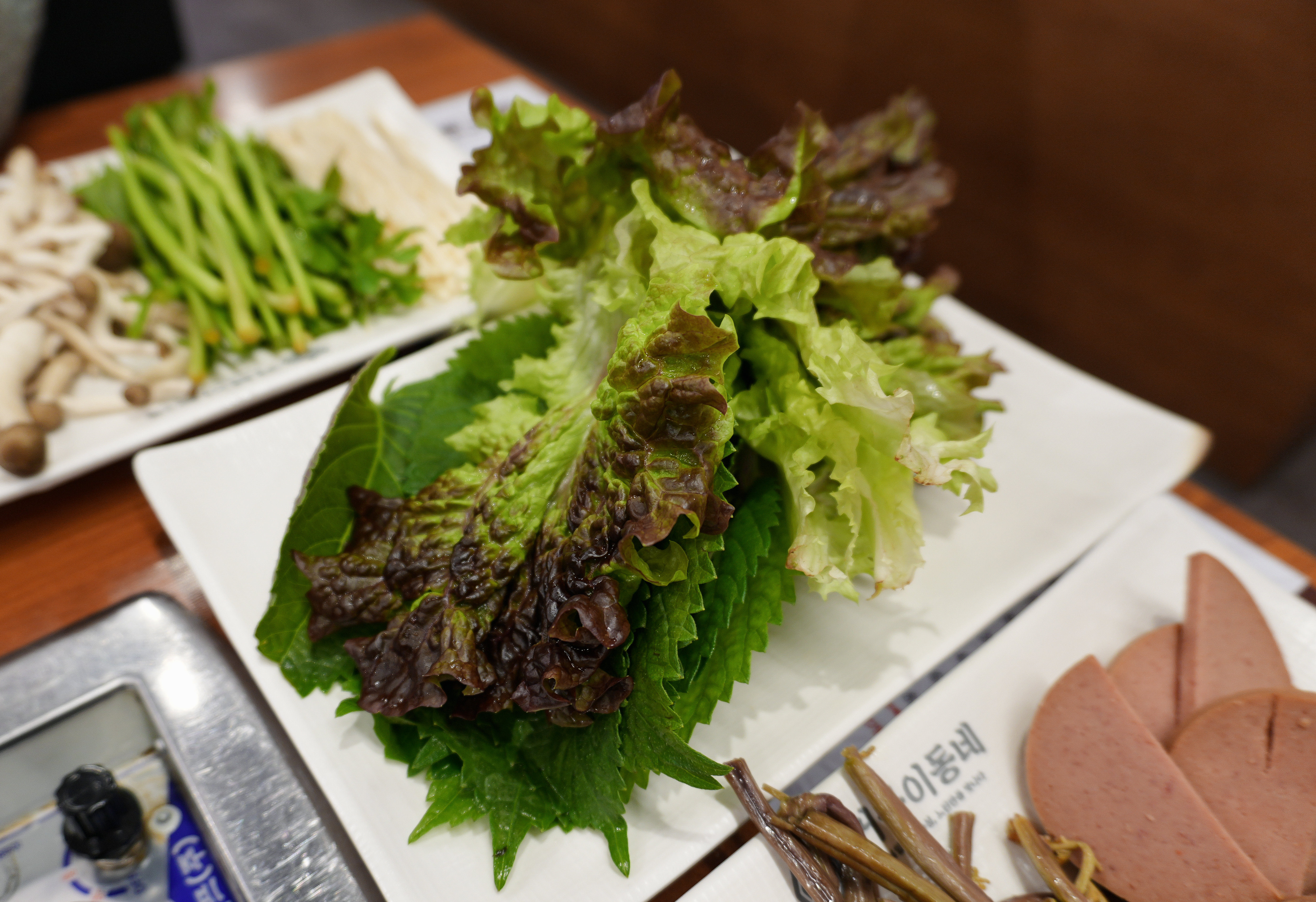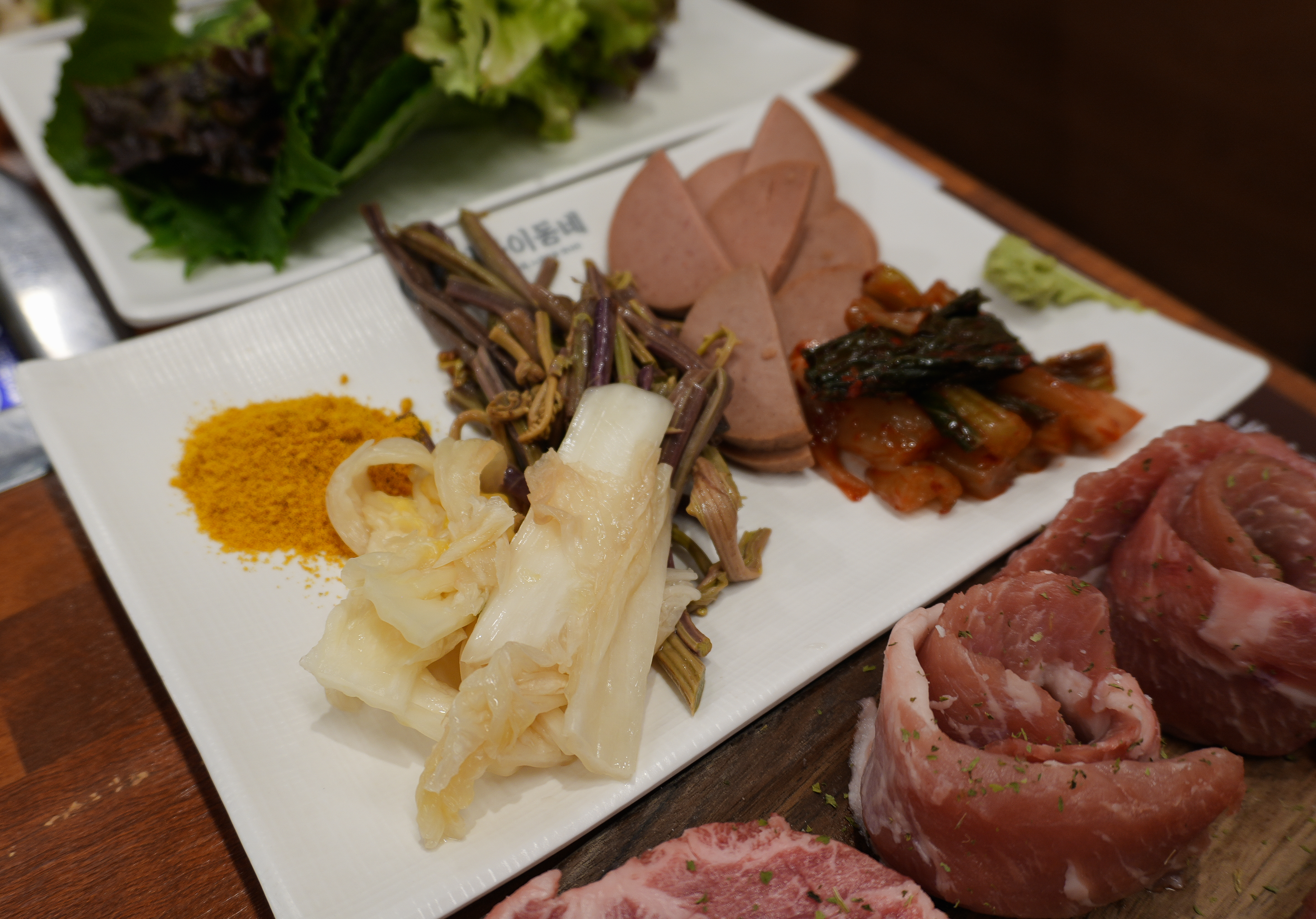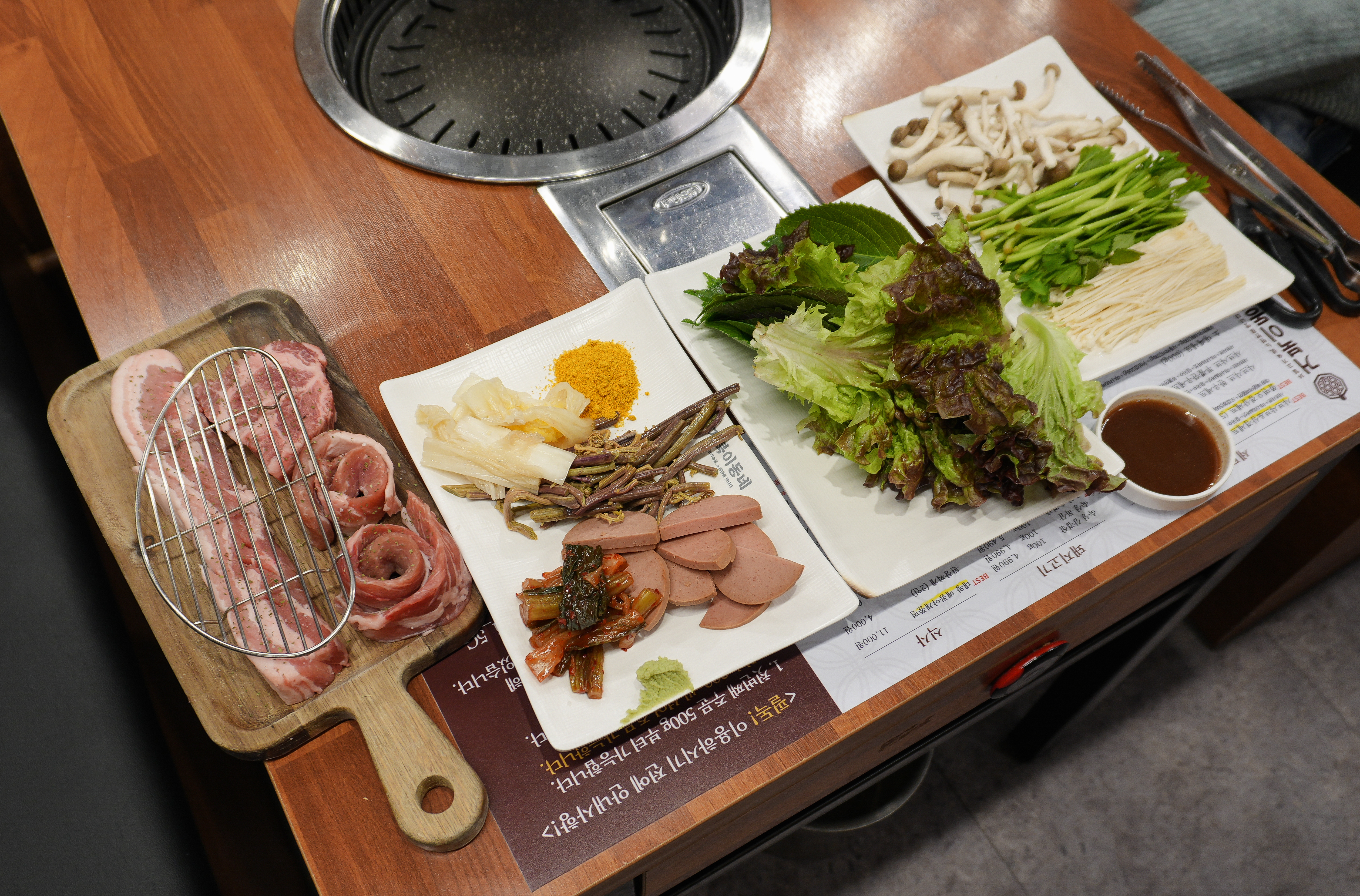 호계동 거북이동네의 메뉴소개에 들어가기에 앞서, 샐러드바는 위와 같이 구성되어 있었습니다. 각종 쌈채소와 장아찌, 무침류와 불판에 같이 구우면 괜찮은 반찬들이 진열되어 있었습니다.