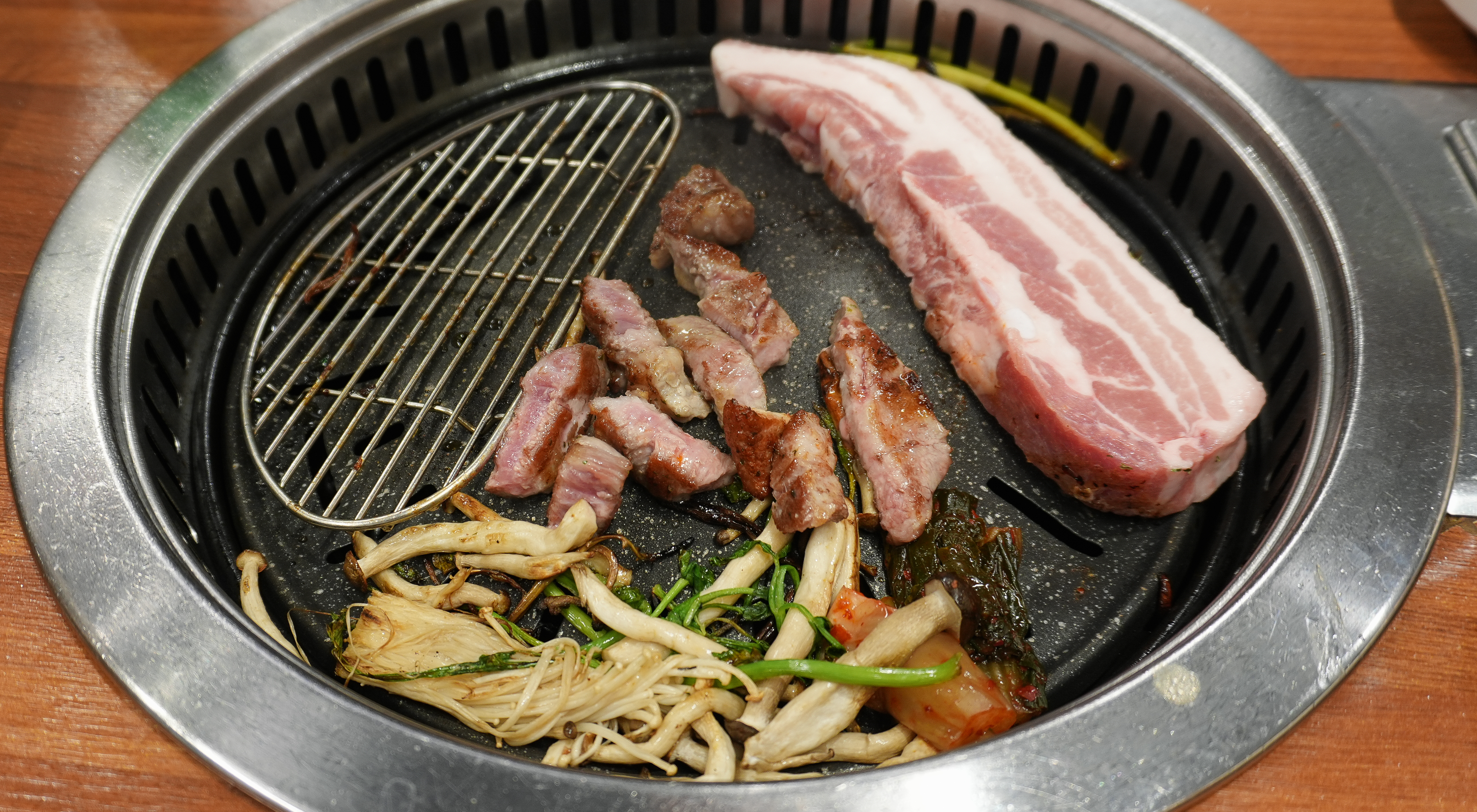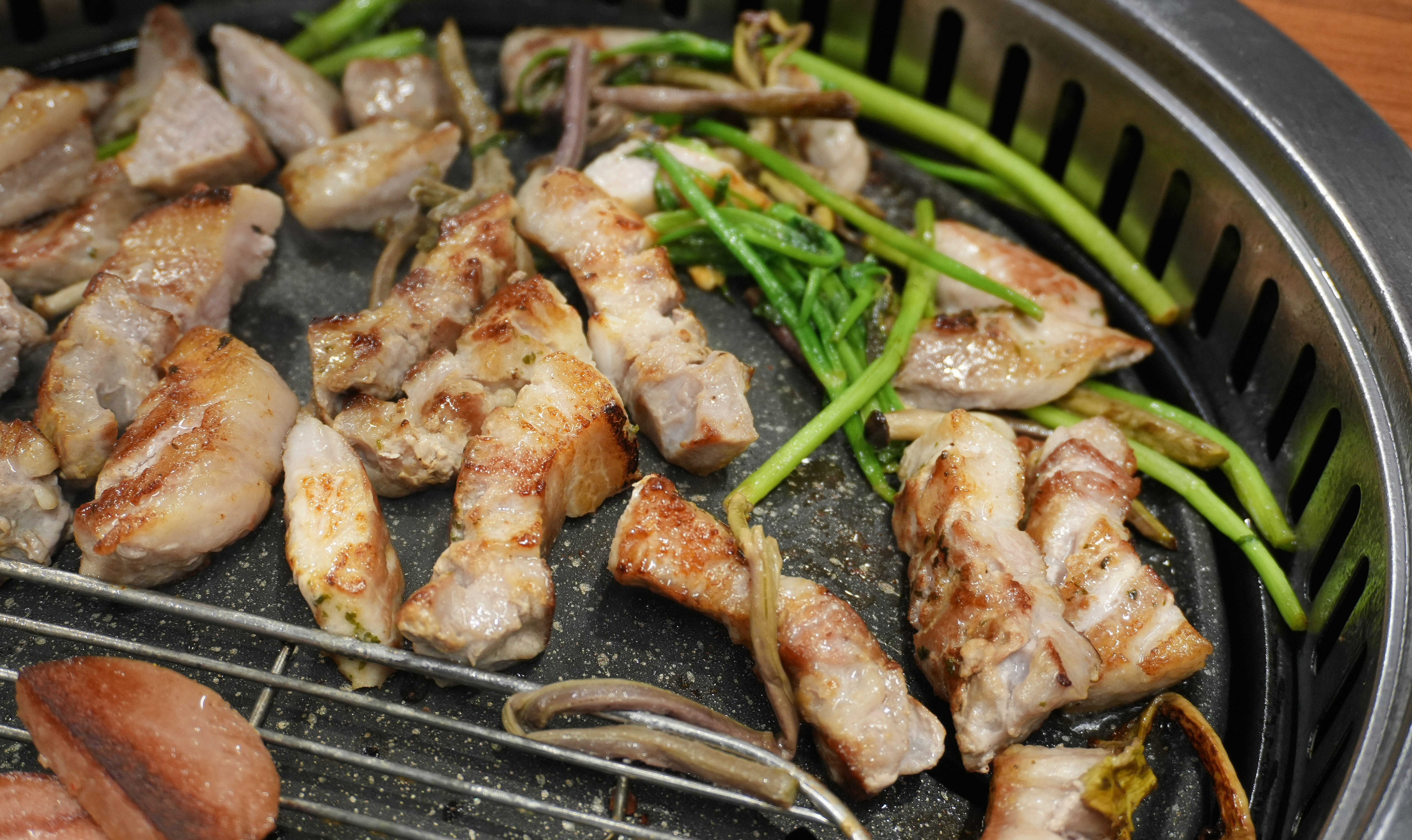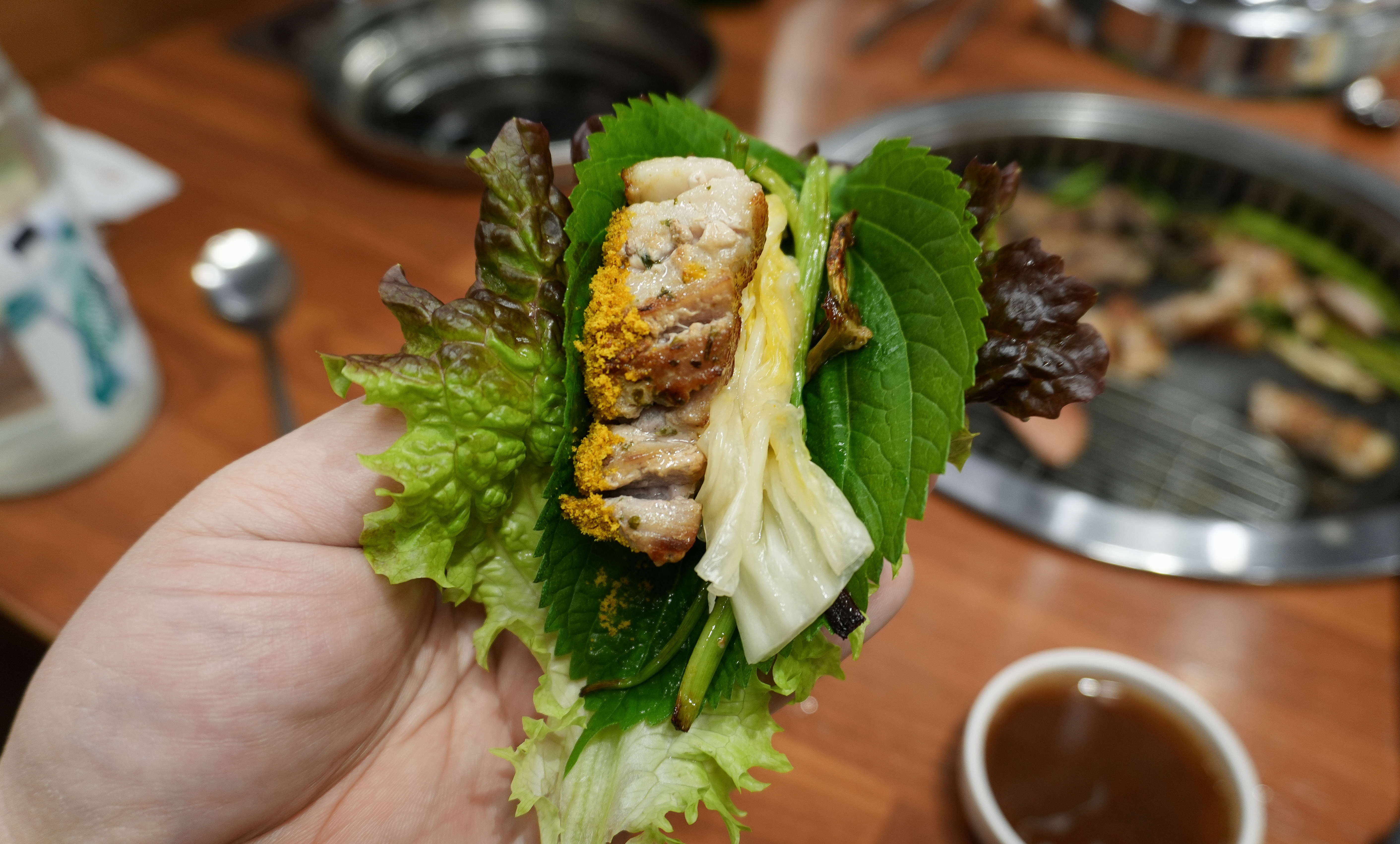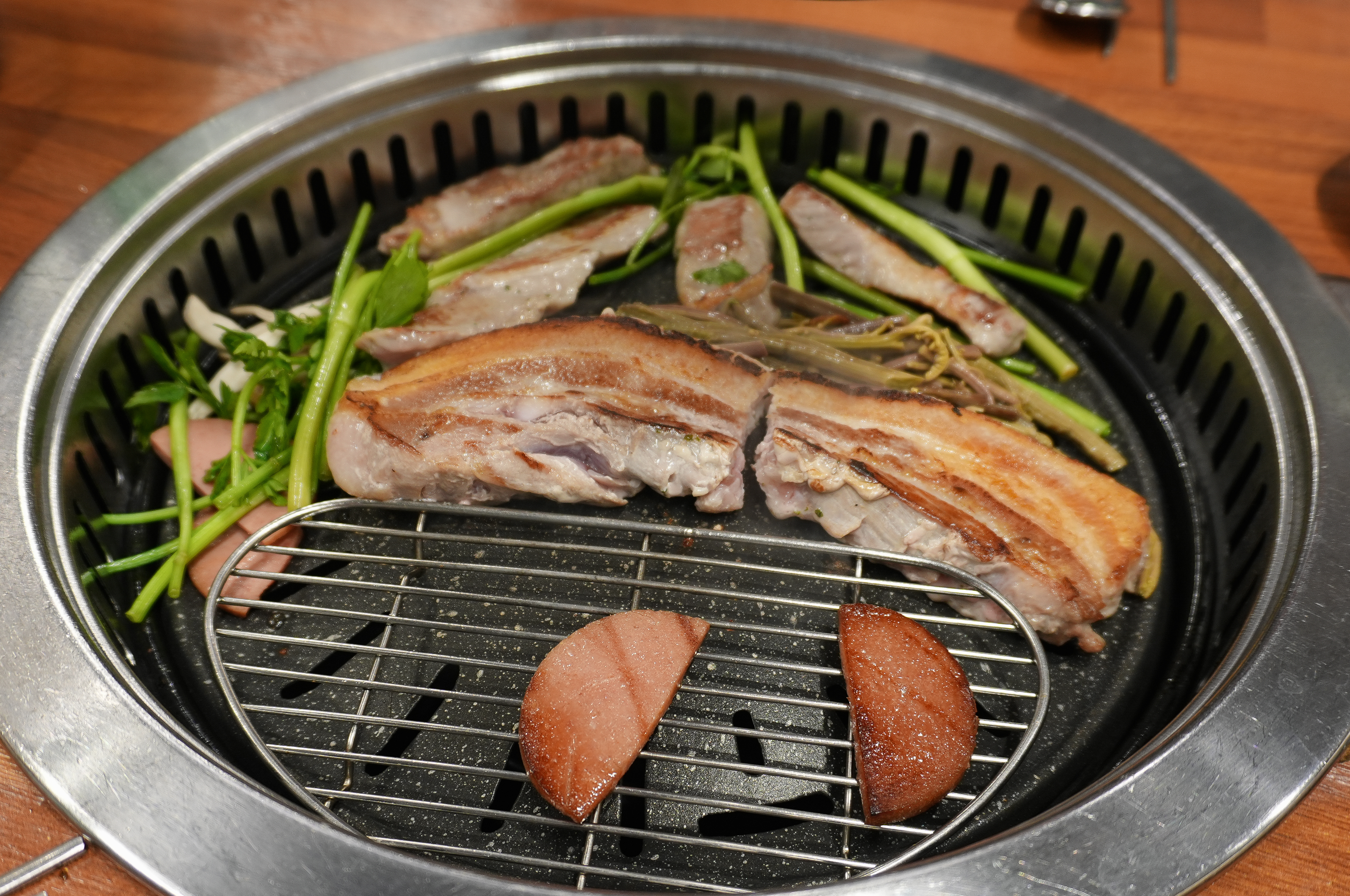 고기를 불판에 올려 구워주기 시작했습니다. 뭐, 고기는 국산이든 수입이든 신선하기만 하다면, 언제 어떻게 먹어도 다 맛있는 것 같습니다. 저는 각종 쌈채소와 같이 곁들여서도 먹고, 고기만 따로 먹기도 했는데 고기의 질감이 약간 퍽퍽한 느낌은 있었지만, 그래도 같이 곁들이는 반찬들이랑 잘 어울려 먹기 좋았고 먹을만했습니다.