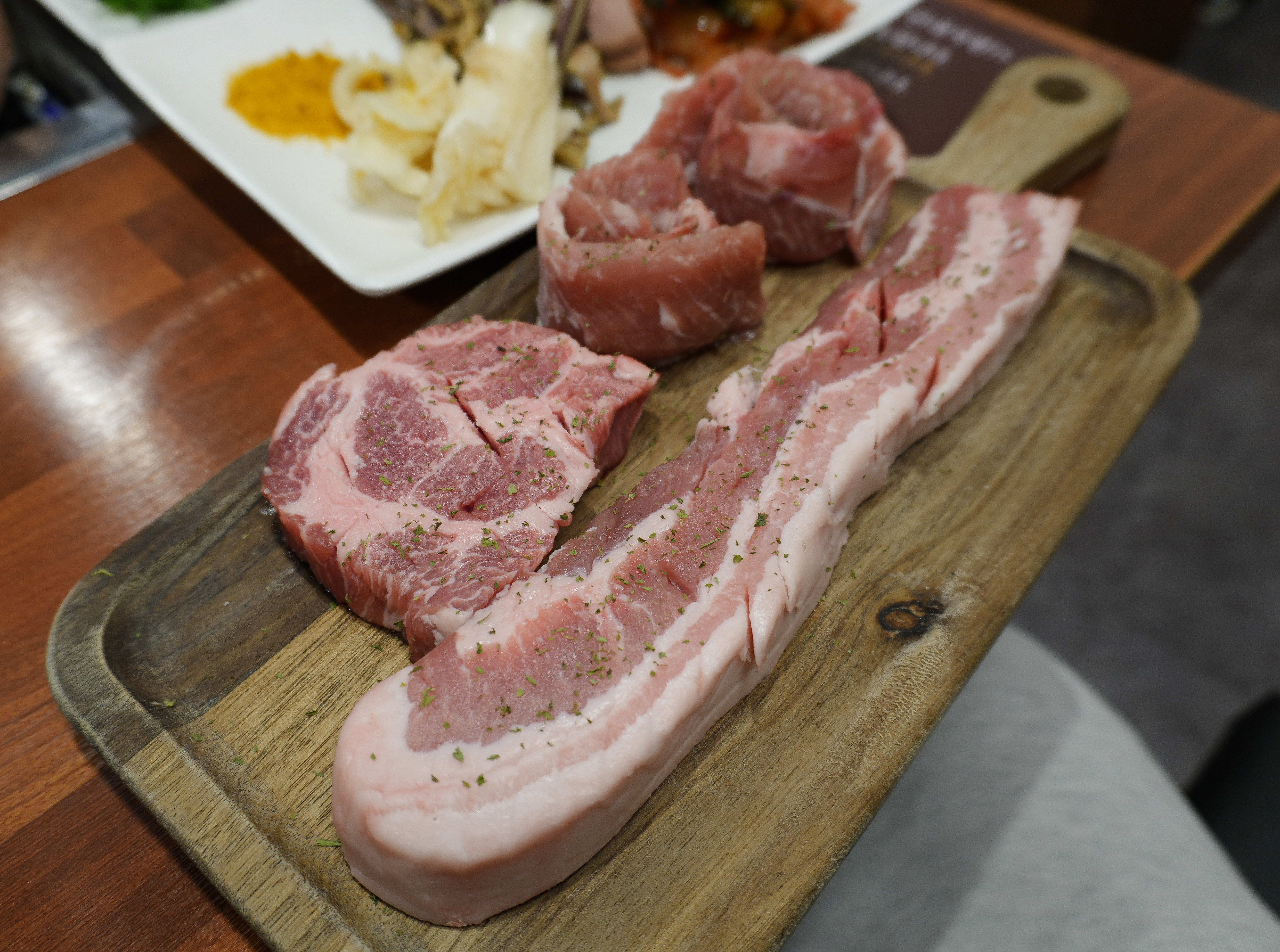 거북이동네 커플세트의 구성은 삼겹살, 목살, 항정살, 가브리살, 버섯, 미나리가 제공되고 있었습니다. 추가 반찬들은 앞서 소개해드린 셀프바에서 직접 가져왔습니다. 참고로 거북이동네 가게의 한우를 제외한 대부분의 고기는 전부 수입산(스페인, 칠레, 미국 등)을 사용하고 있었습니다.