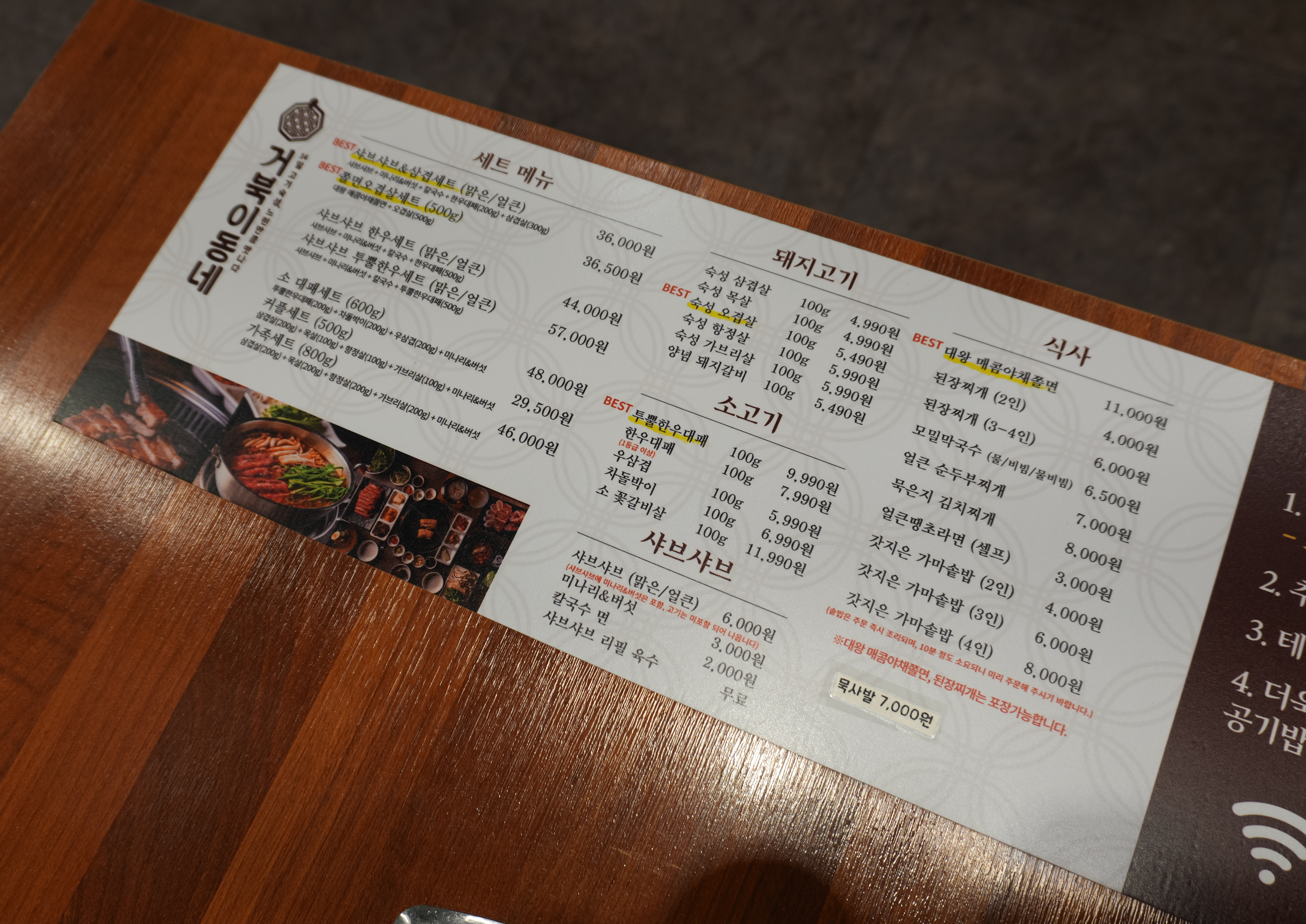 울산매곡점 거북이동네의 메뉴를 살펴보겠습니다. 크게 세트메뉴, 돼지고기, 소고기, 샤브샤브, 식사류가 있었고, 저희는 커플세트와 숙성삼겹살, 된장찌개, 가마솥밥을 주문해서 먹었습니다. 참고로, 거북이동네는 특이하게 테이블이용료 5,000원을 받고 있었습니다.