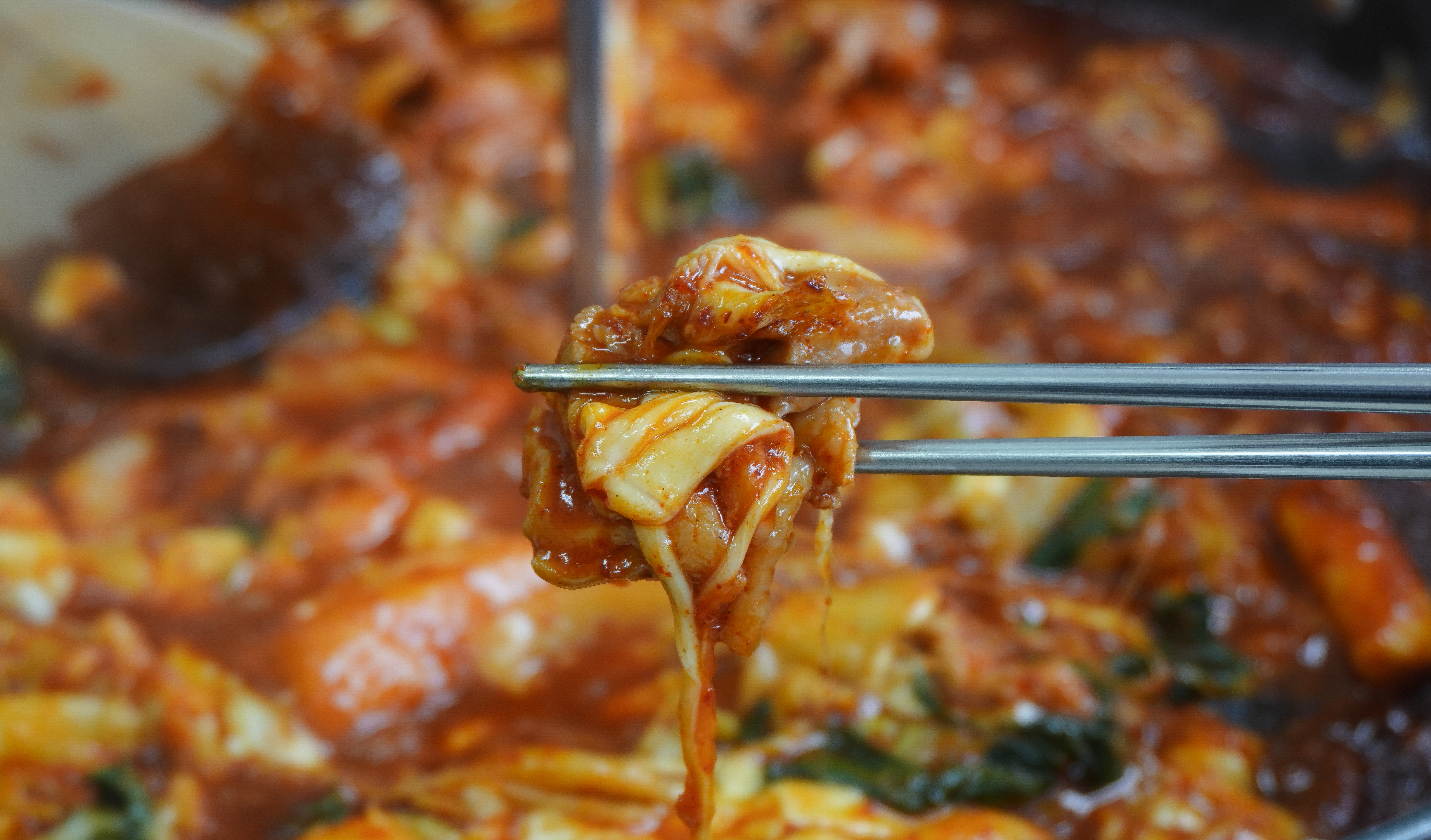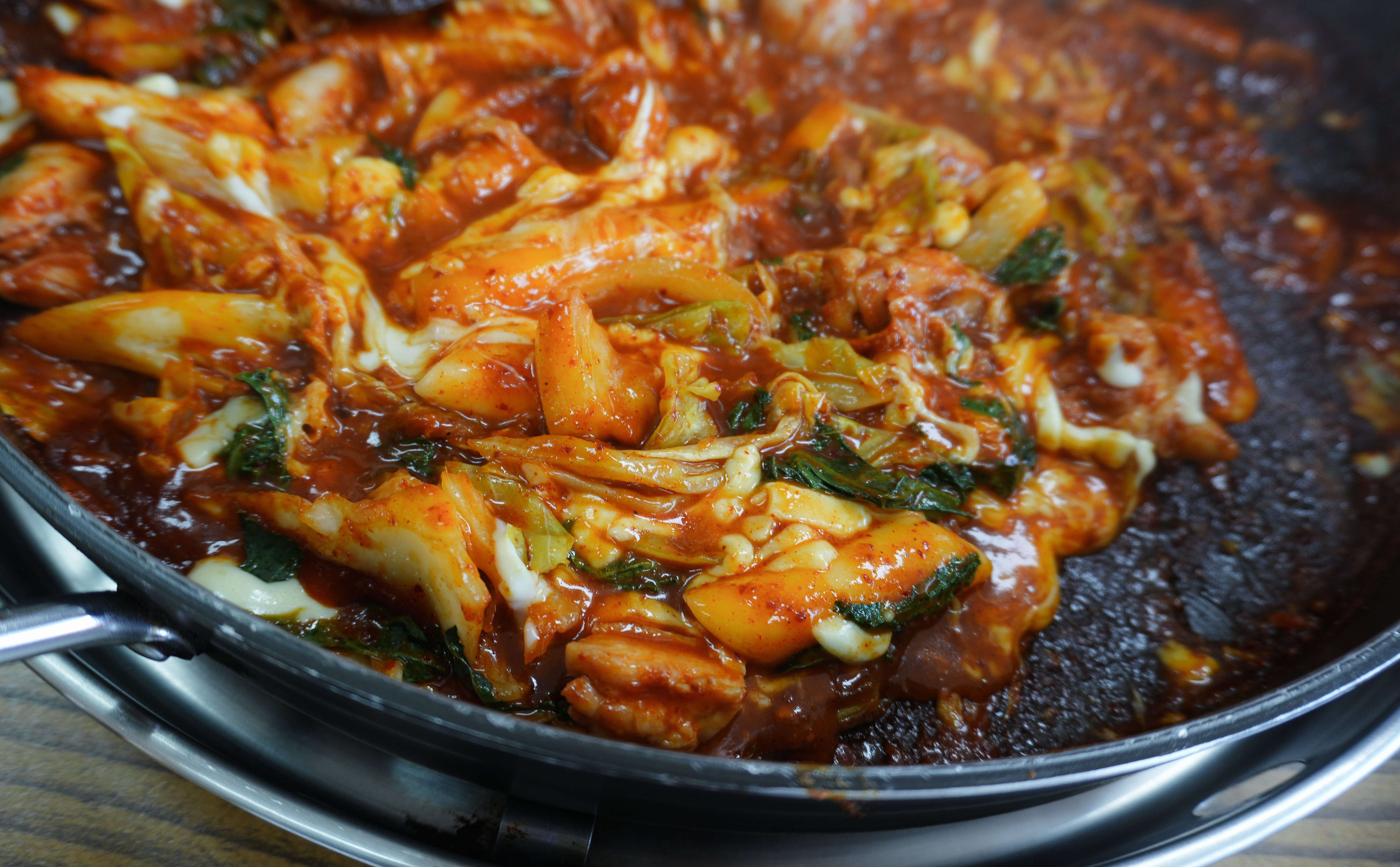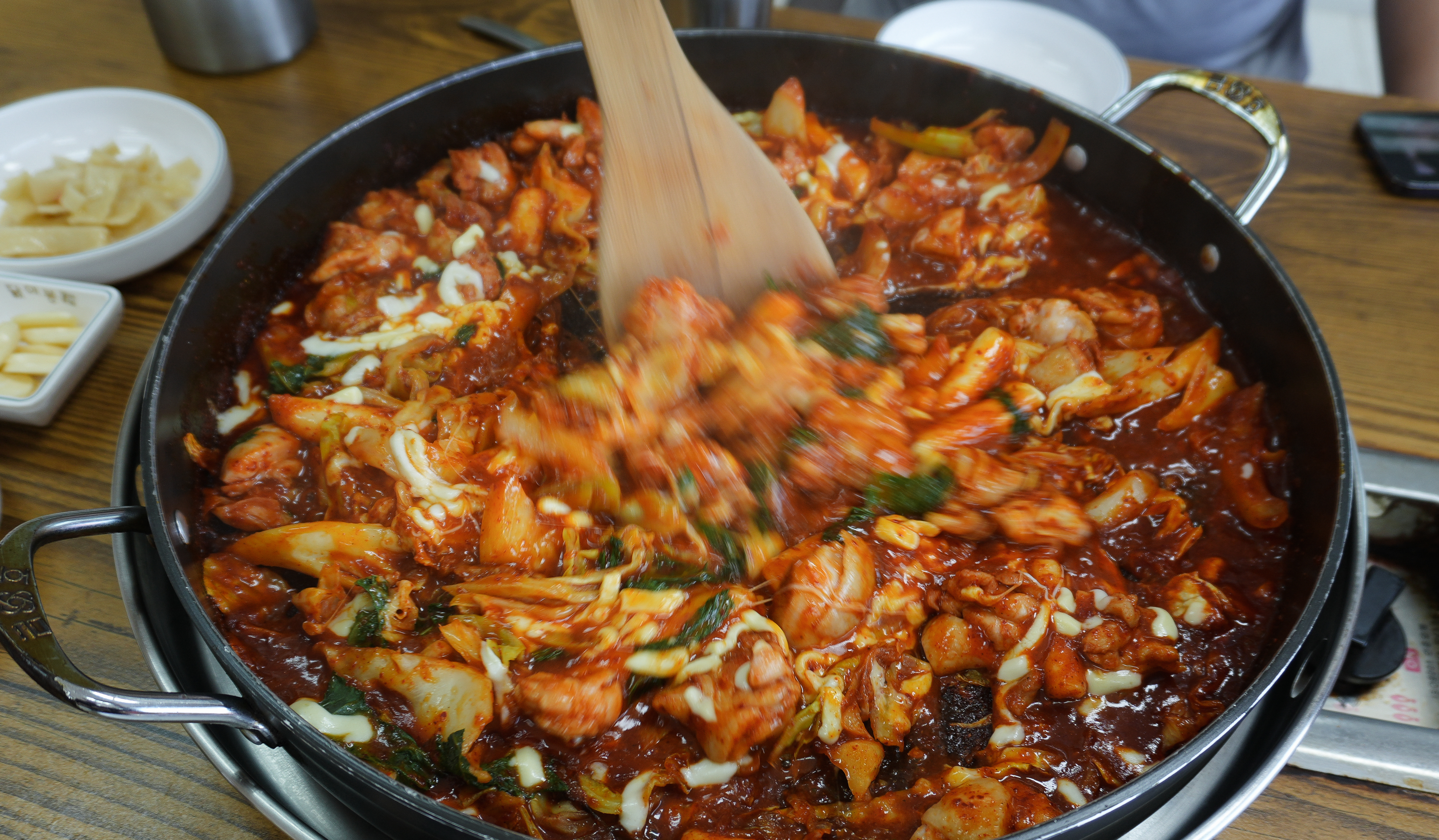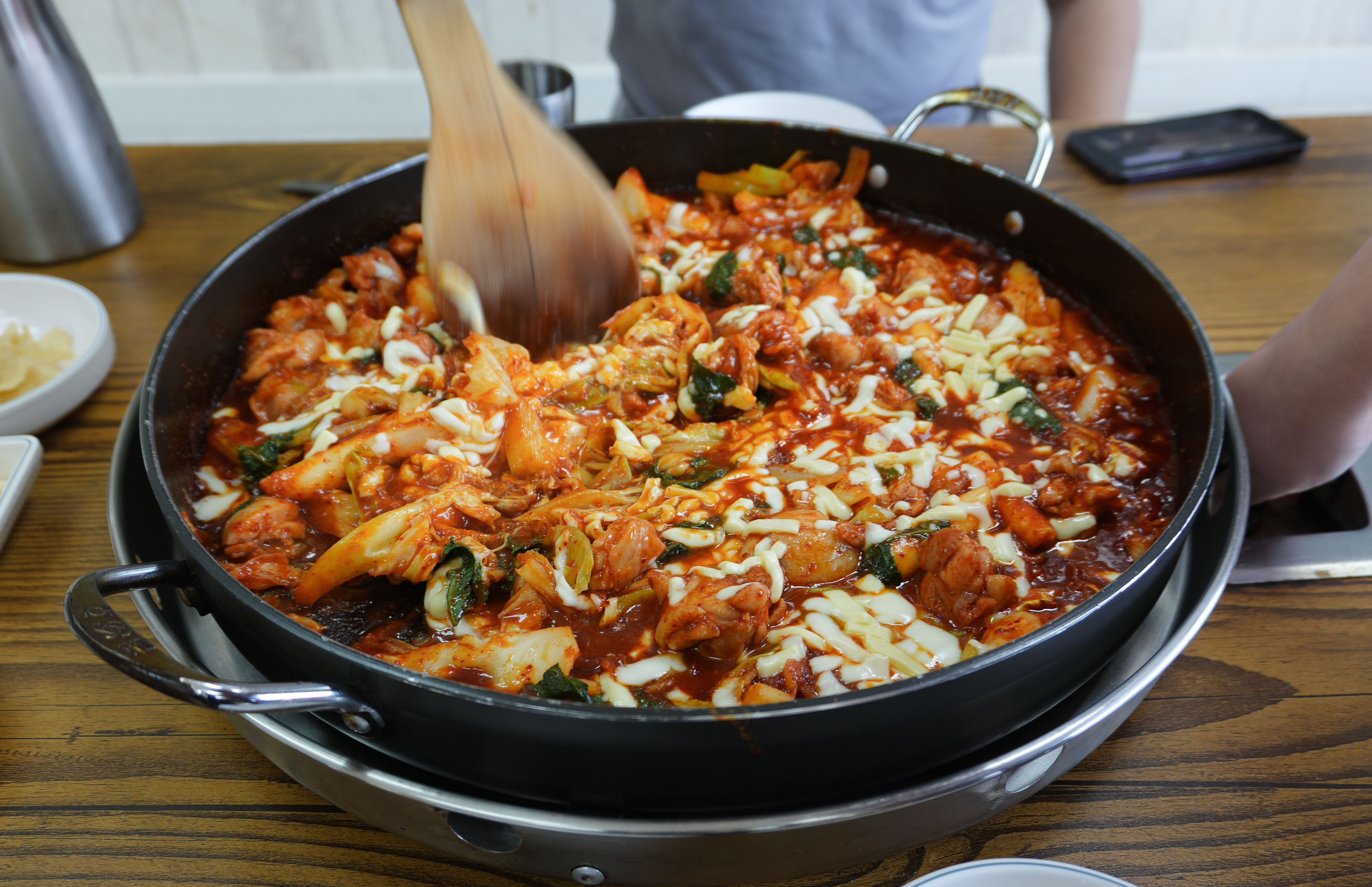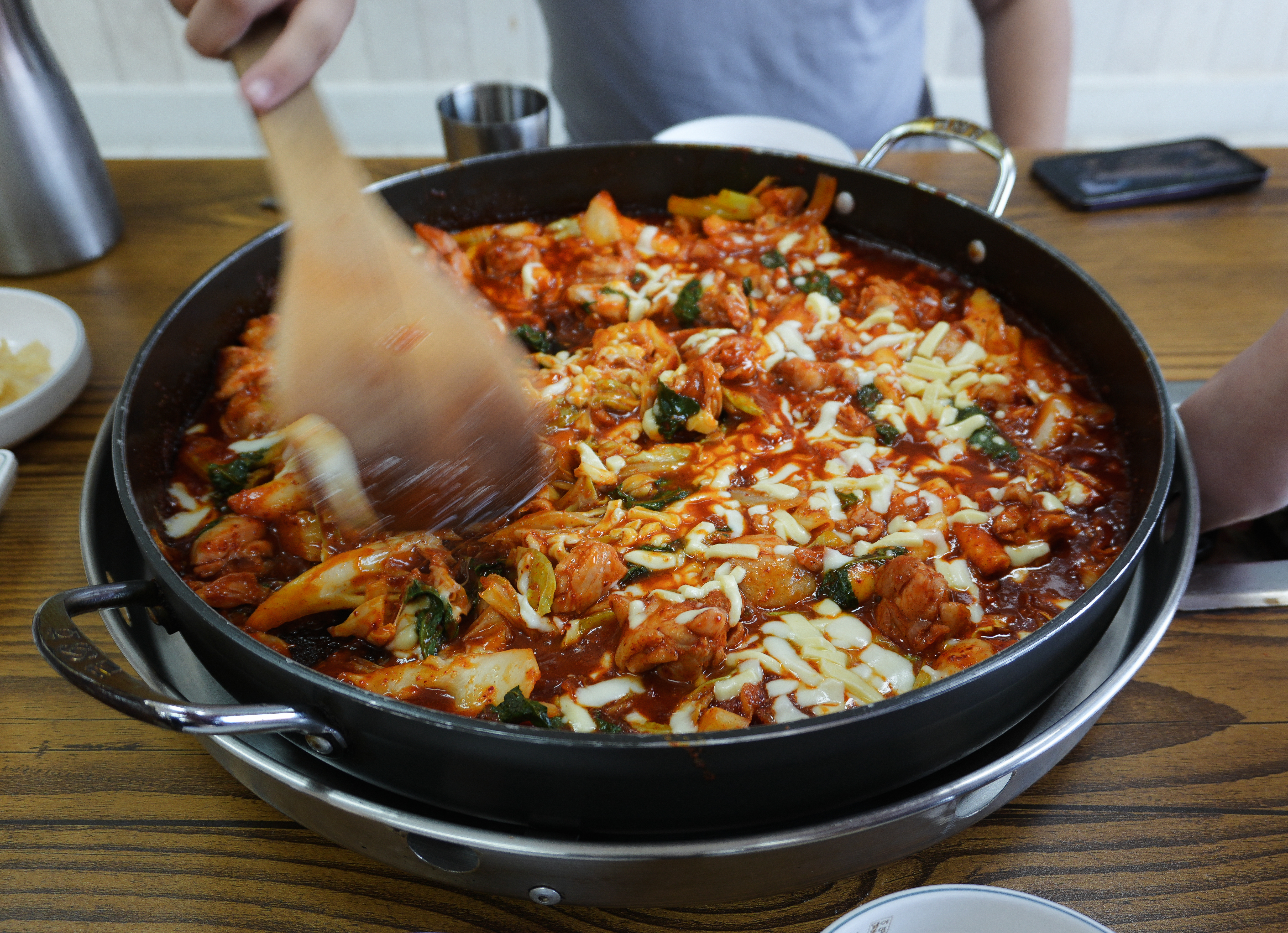 강화군 선원면에 위치한 닭이봉닭갈비 치즈닭갈비가 나왔습니다. 닭갈비가 이미 다 볶아 나왔지만 데워 먹을 수 있게 약불에 구워주고 있는데, 양념이 있기도 하고 치즈가 눌어붙어 탈 수 있으니 적당히 데워주다가 불을 끄는 게 낫더라고요.