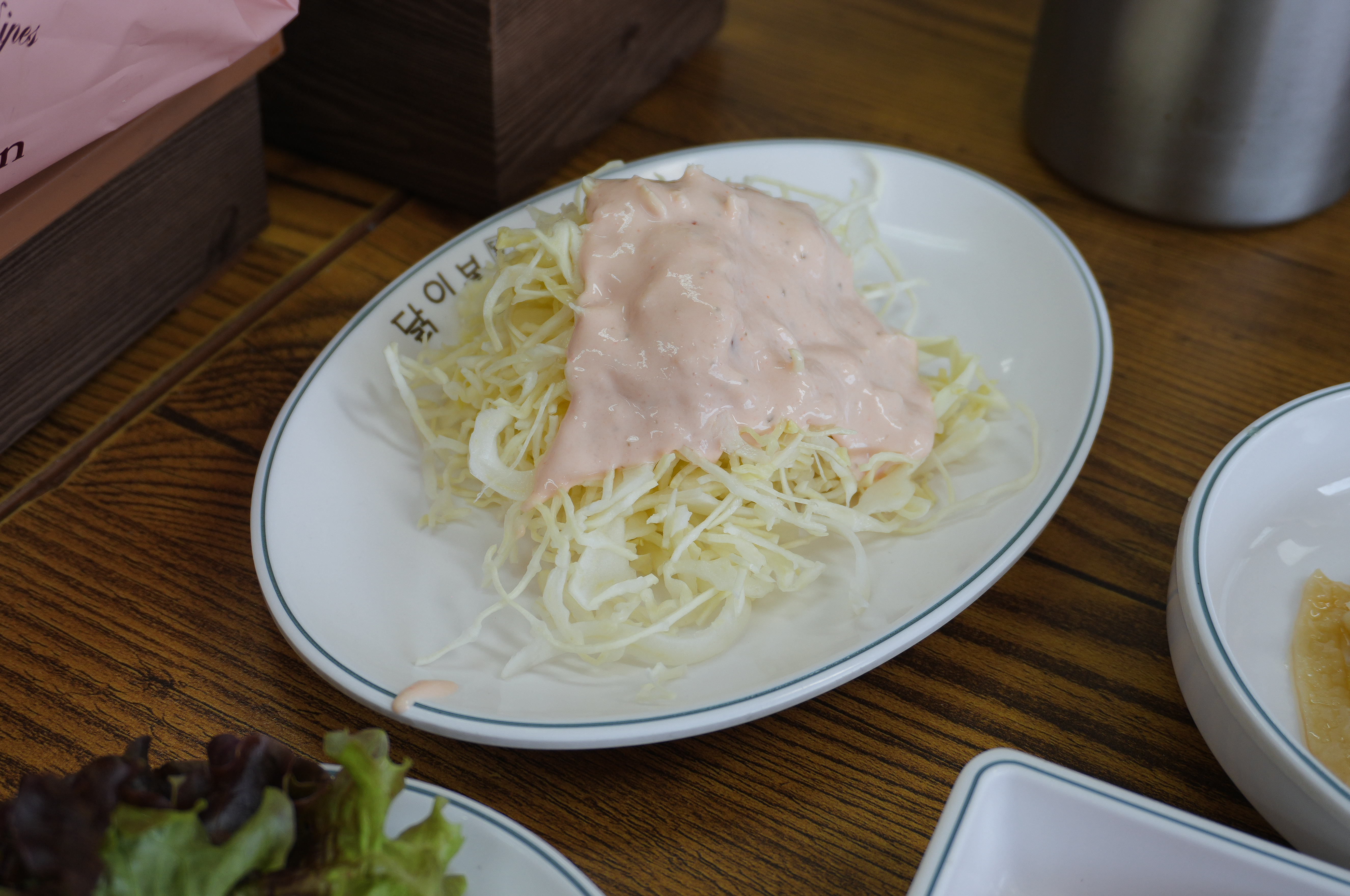 닭이봉 닭갈비의 반찬들은 무난한 수준으로, 쌈채소와 양배추샐러드, 동치미, 어묵볶음이 있었습니다. 저는 닭갈비에 동치미와 쌈채소는 같이 먹지만 나머지는 잘 먹지 않기 때문에 사진만 찍어두었습니다.