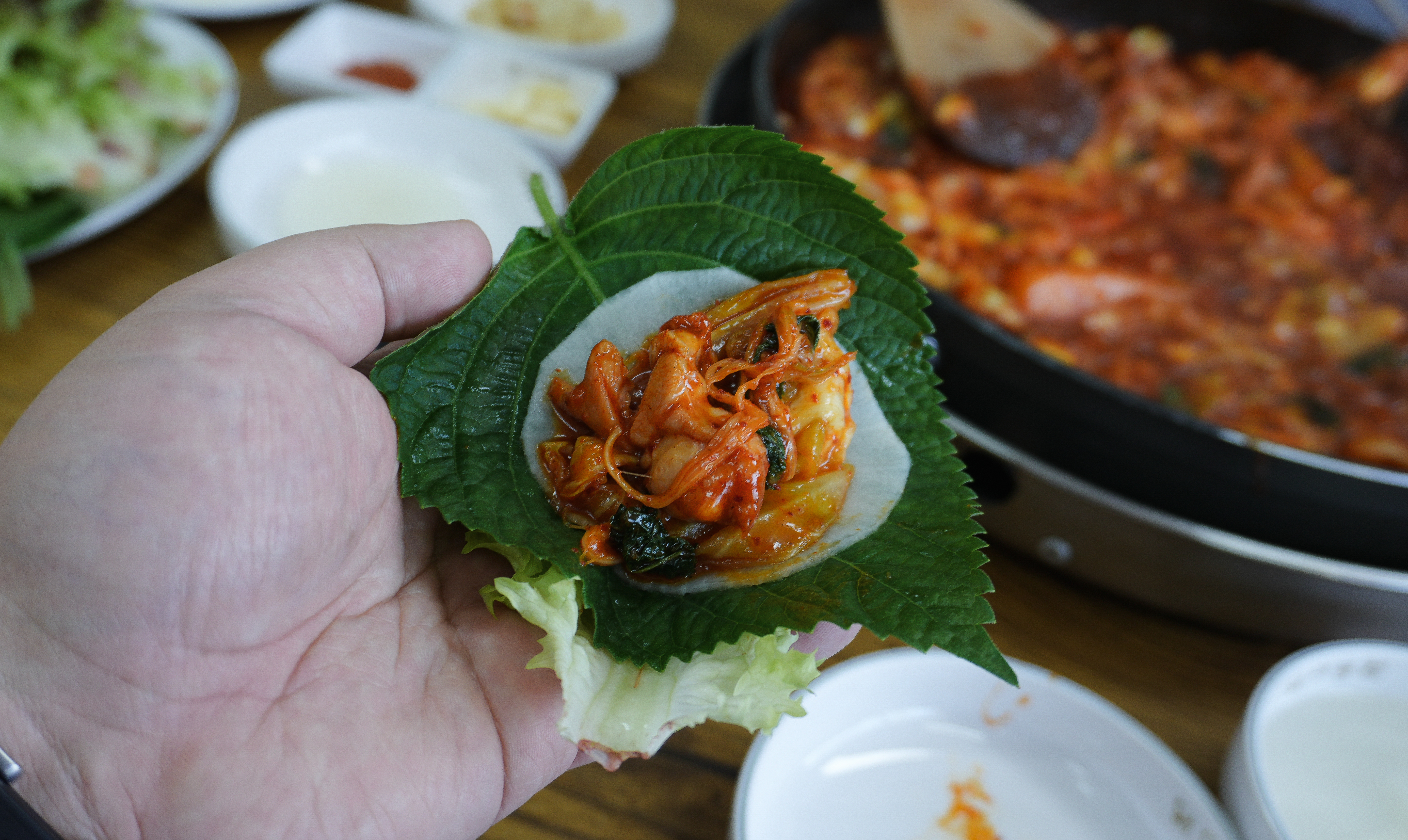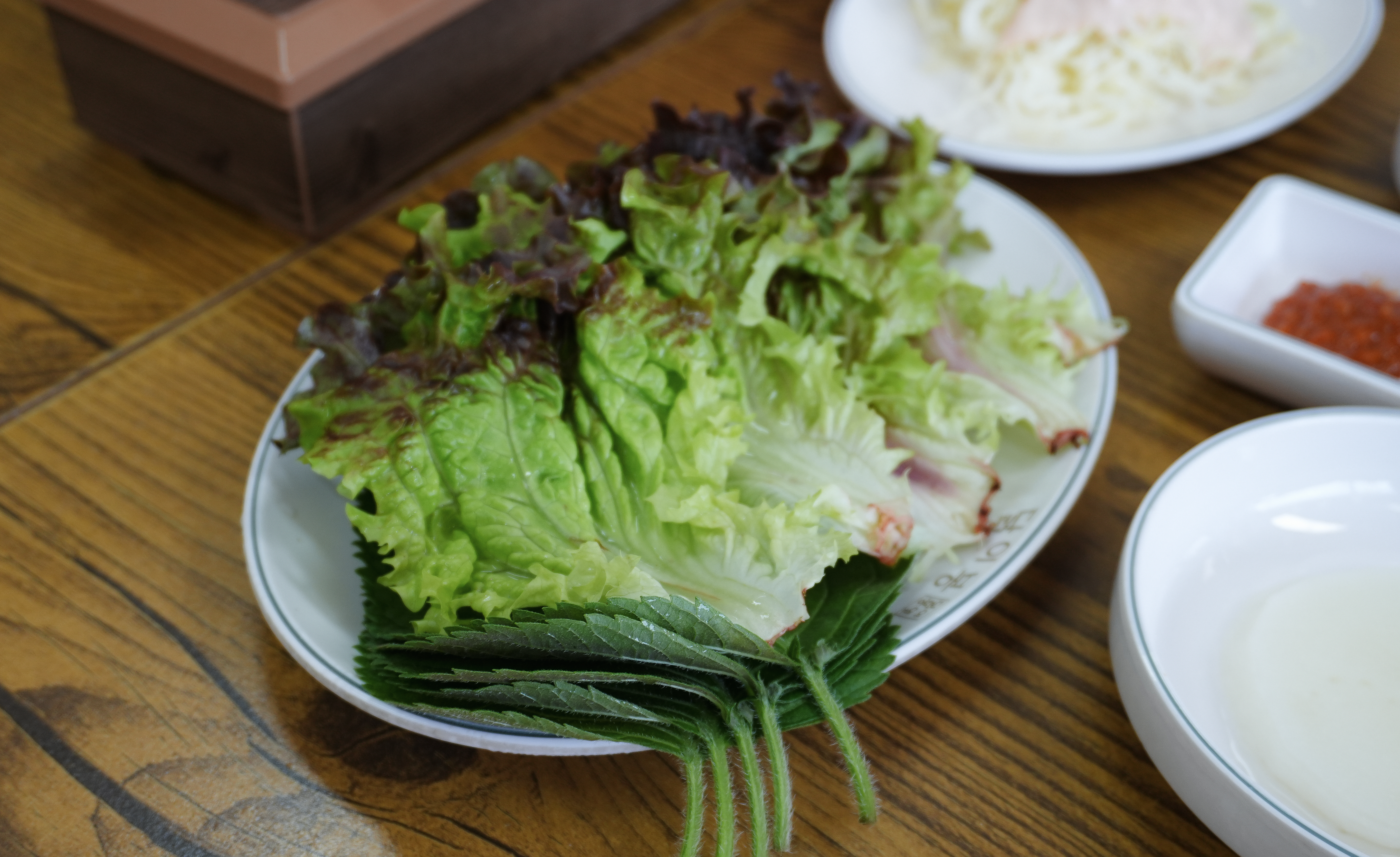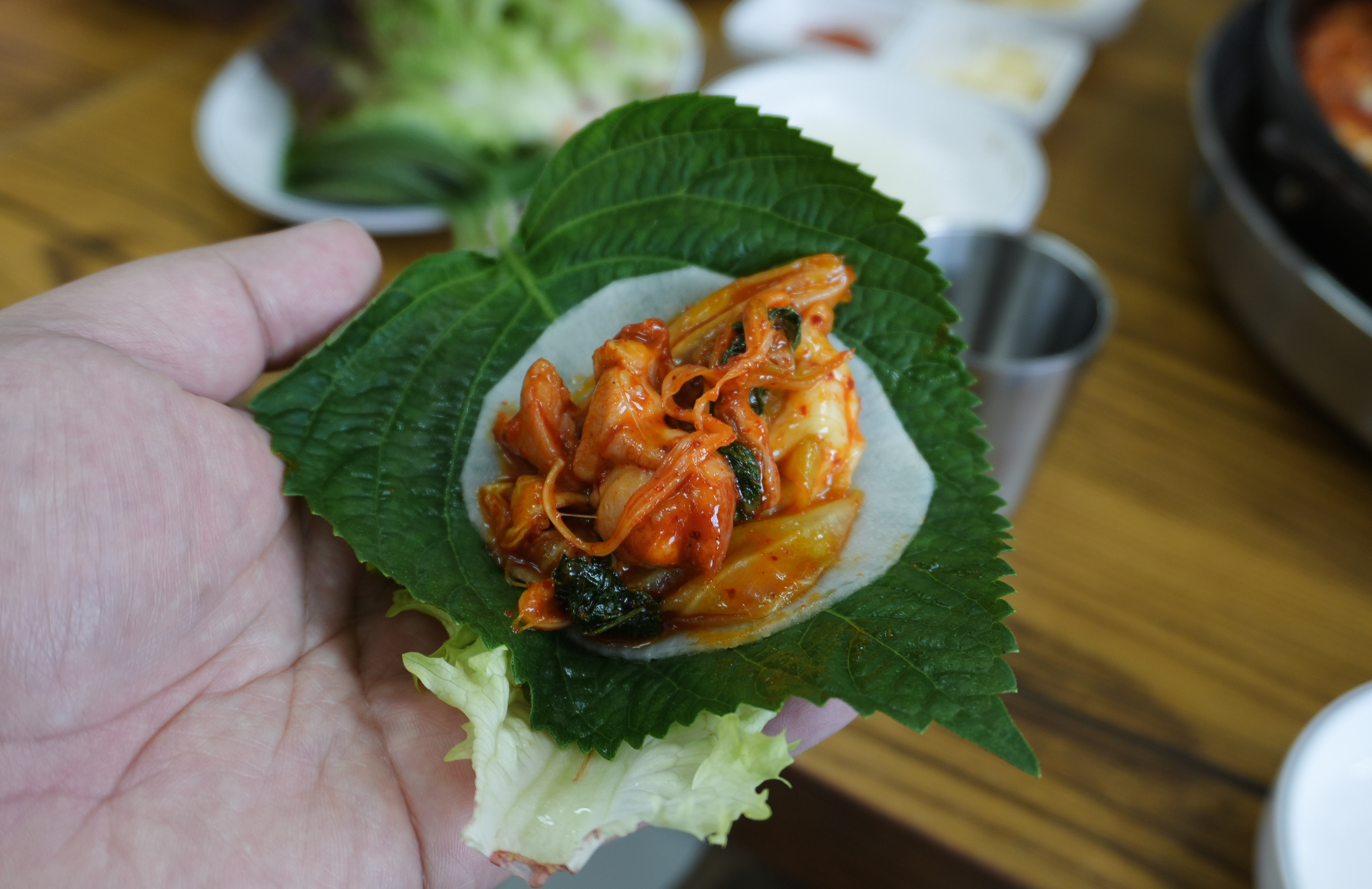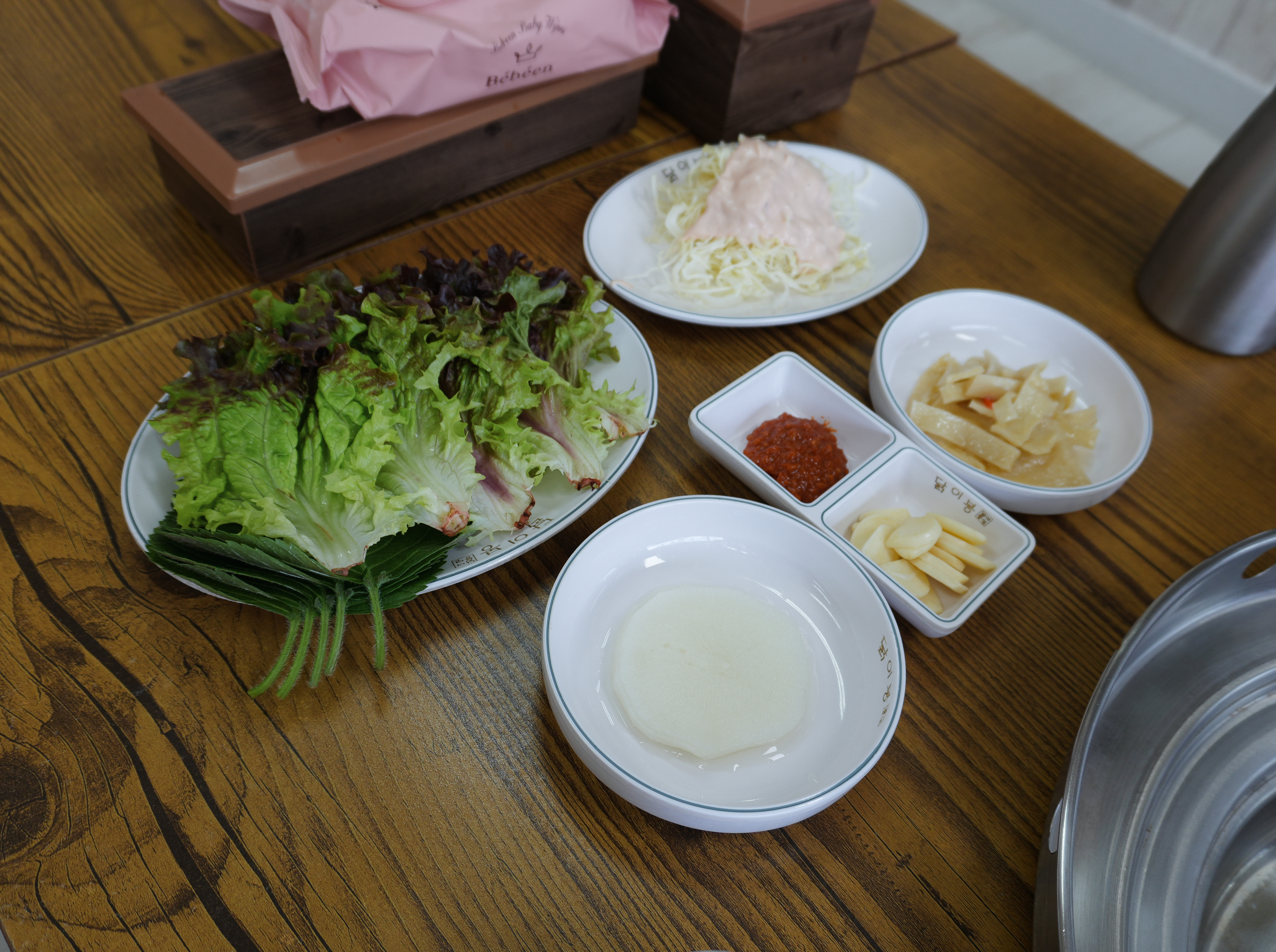 닭갈비에는 고구마와 떡 채소가 들어있었는데, 닭고기는 살짝 적은듯한 느낌이 있었습니다. 닭갈비는 그 자체로 먹어도 괜찮았고, 쌈채소에 곁들여 먹어도 괜찮았습니다. 제 기준에 이곳의 닭갈비는 약간 느끼한 경향이 있어서 쌈채소에 곁들이는 것을 더 추천드리고 싶습니다.