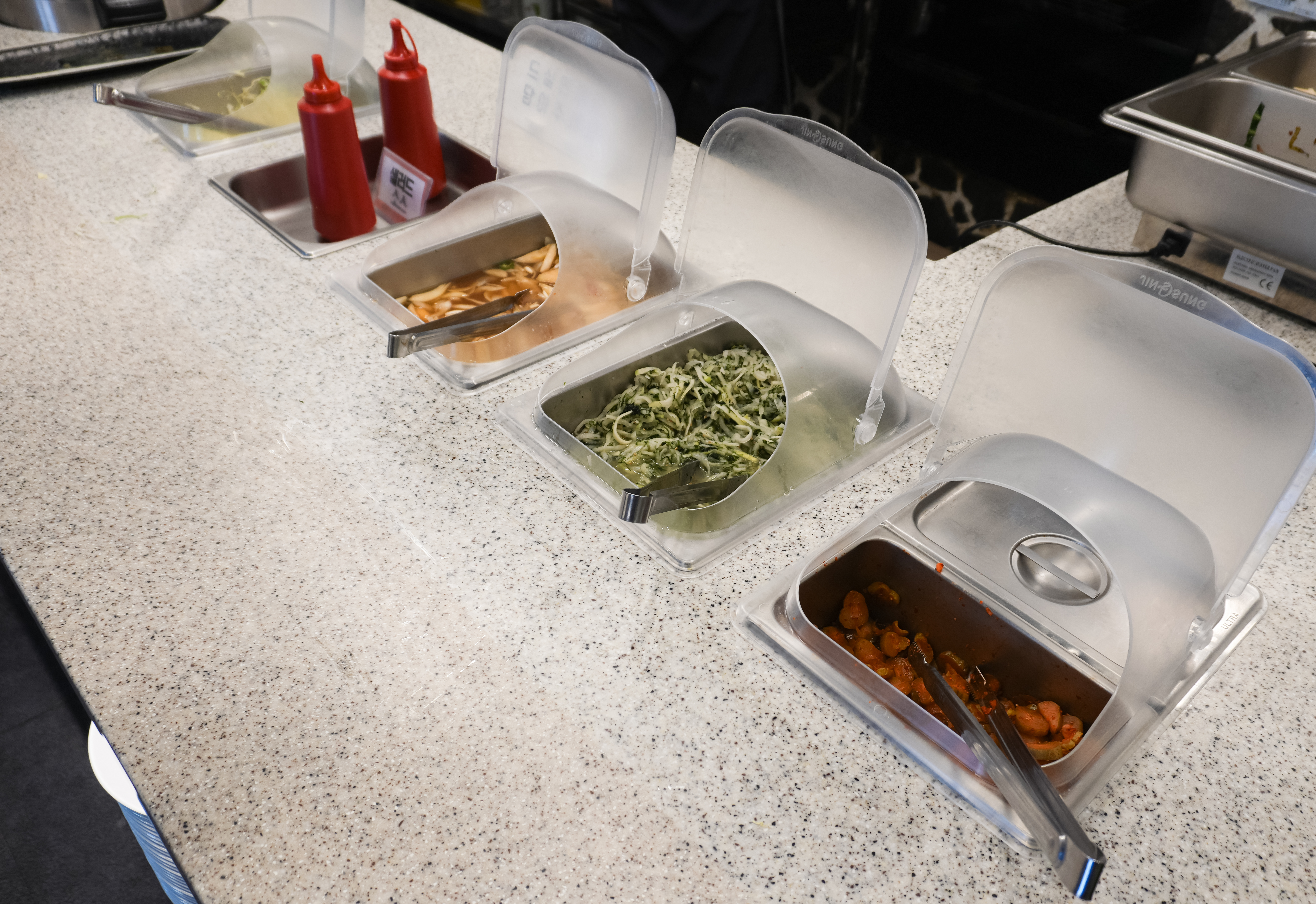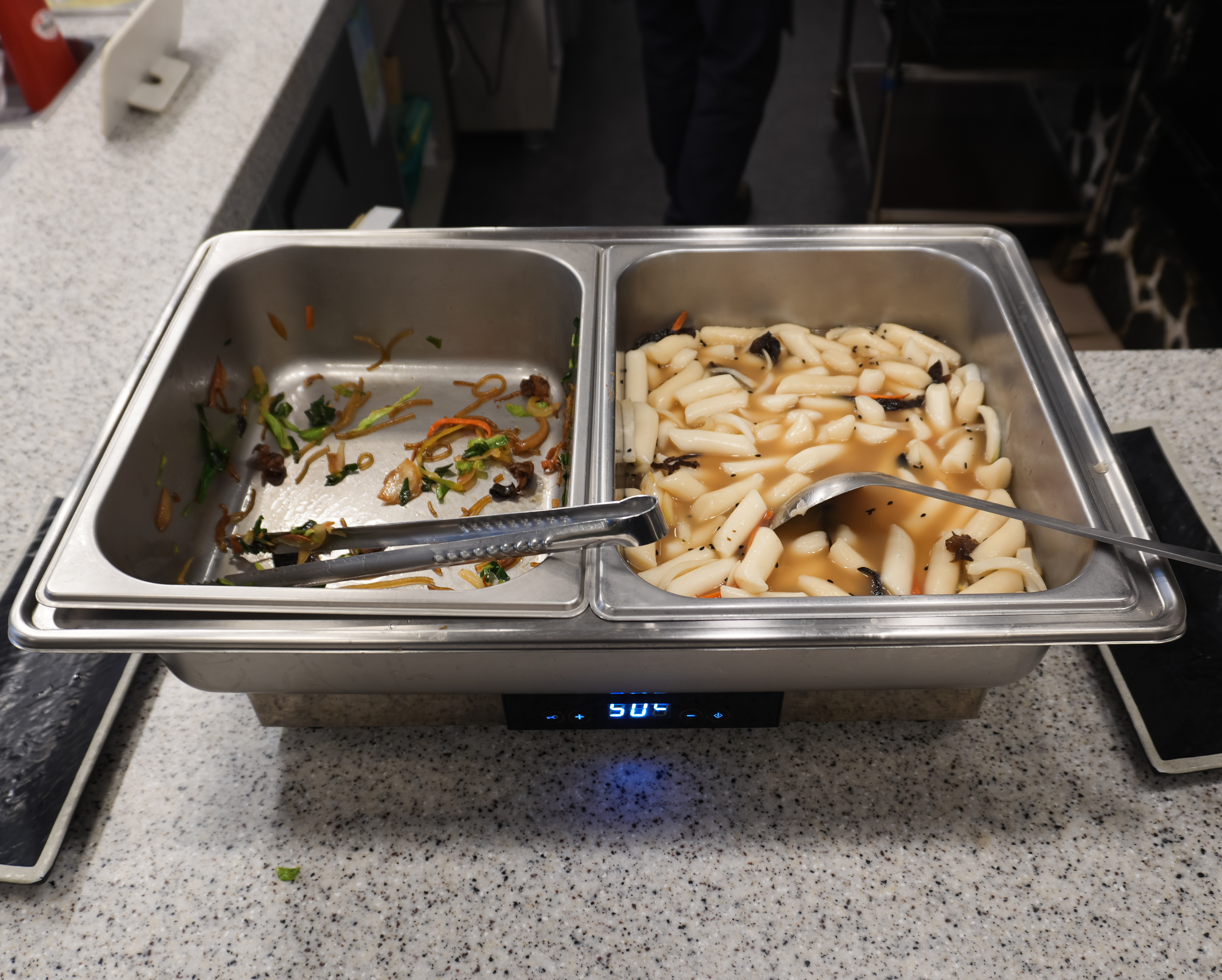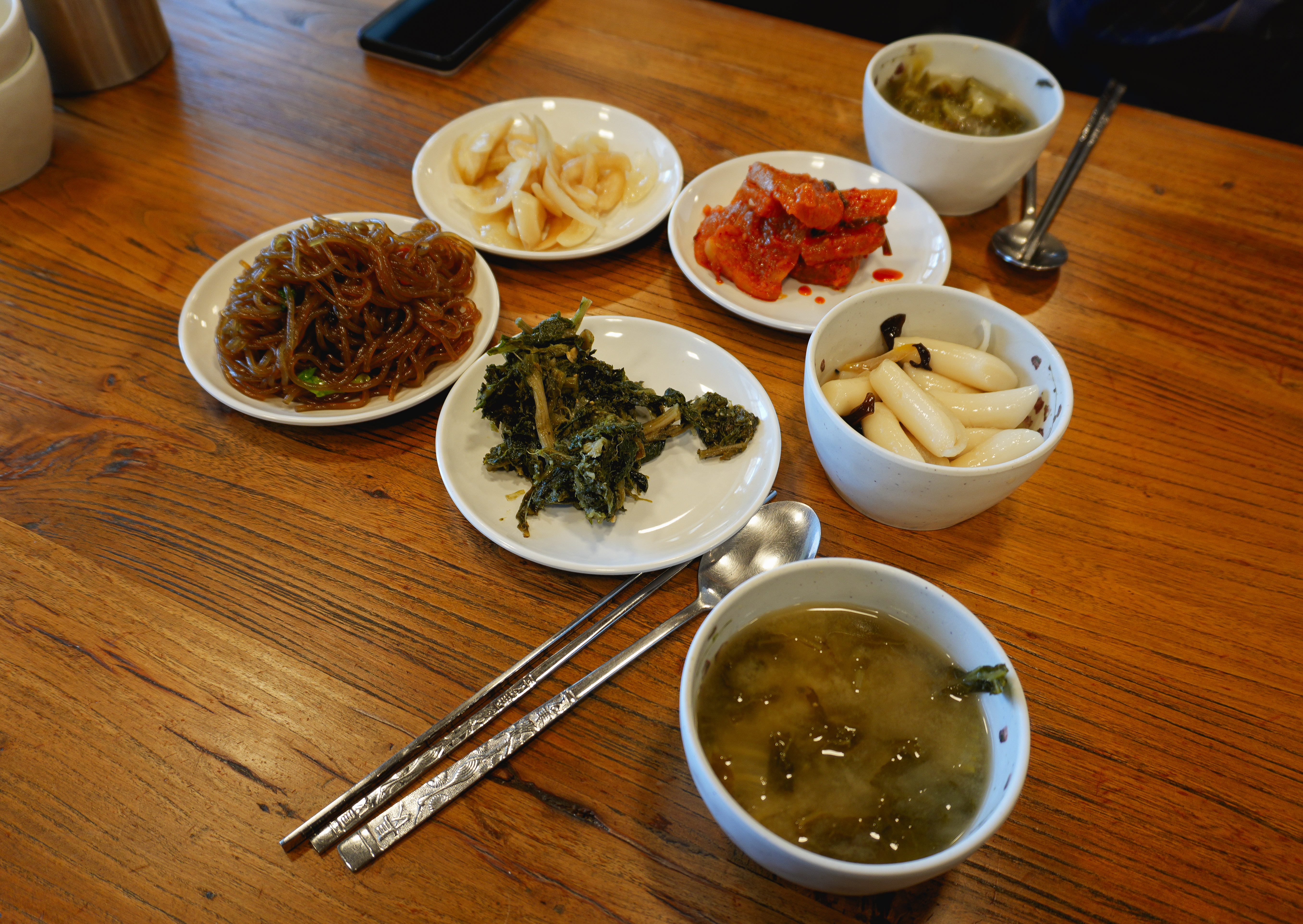 재넘어화덕고등어의 반찬은 잡채, 떡볶이, 나물, 김치 등이 있었습니다. 가게에는 화덕이 마련되어 있어 생선을 직접 굽는 모습을 볼 수 있었고, 이곳의 반찬은 원하는 만큼 얼마든 덜어먹을 수 있었습니다.