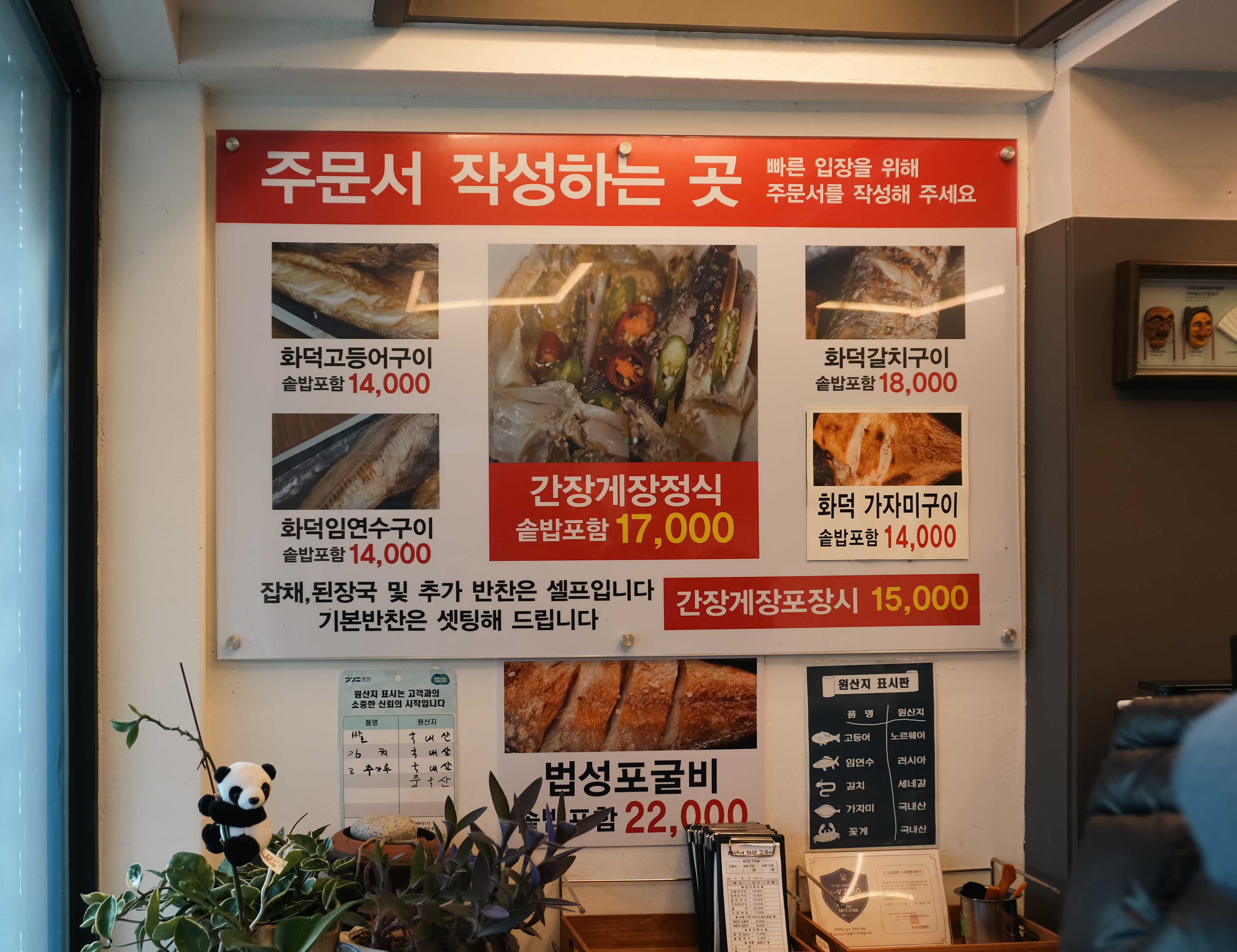 남한산성 재넘어화덕고등어의 메뉴는 화덕고등어구이, 화덕임연수구이, 화덕갈치구이, 화덕가자미구이, 간장게장정식 등이 있었습니다. 원래는 삼치구이가 있었던 것 같은데, 요즘은 가자미로 판매하는 것 같더라고요. 저희는 고등어구이와 갈치구이를 주문했습니다.