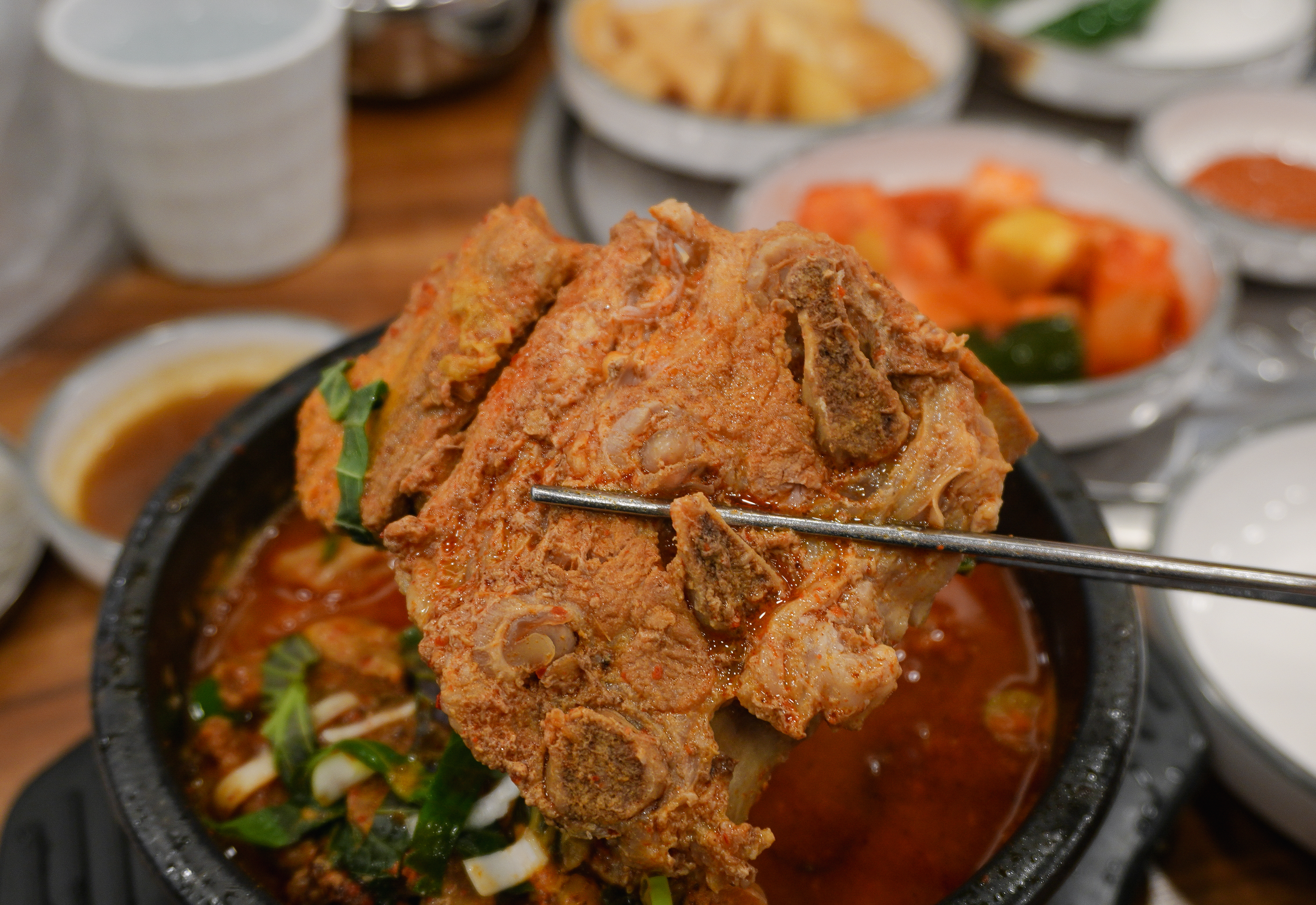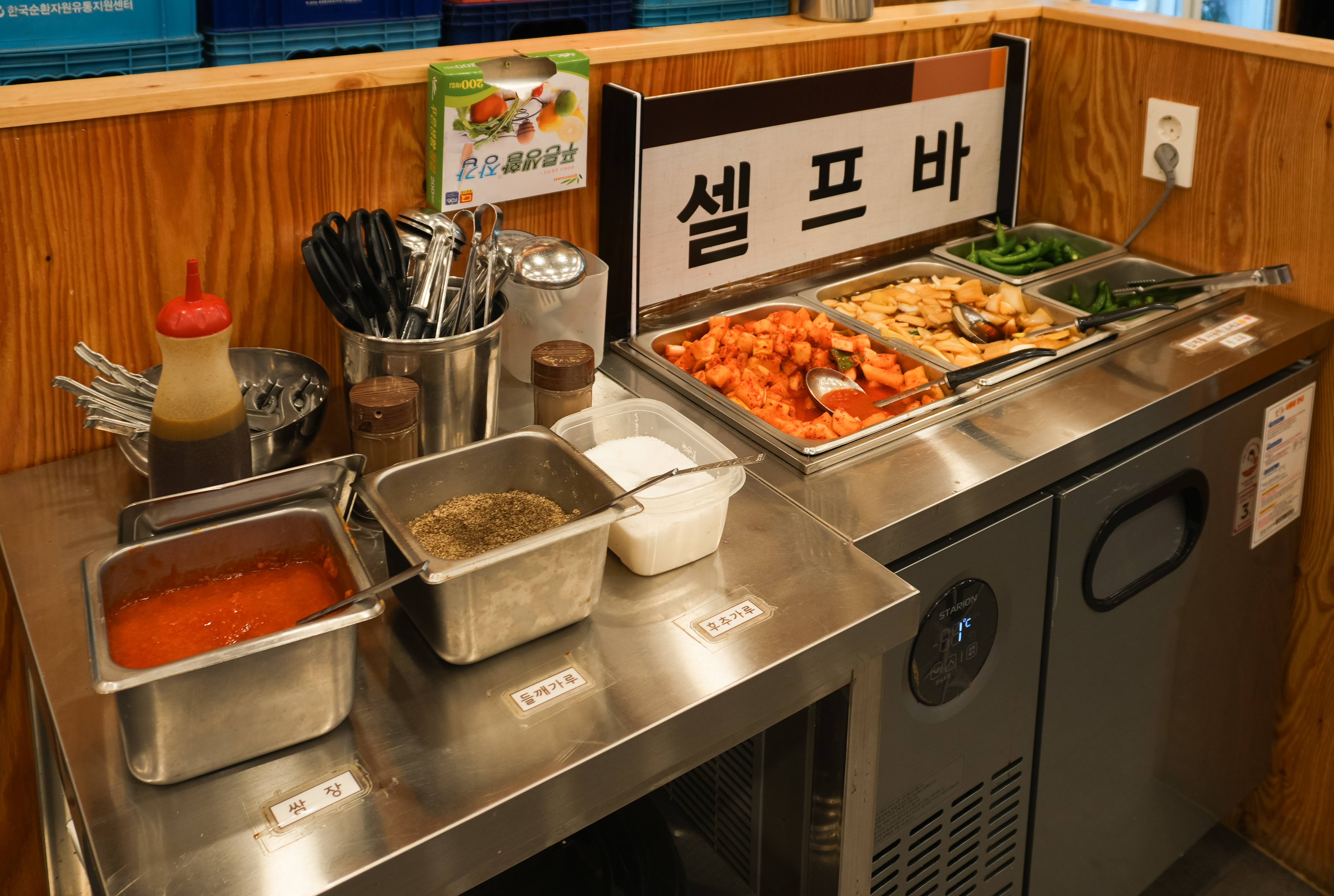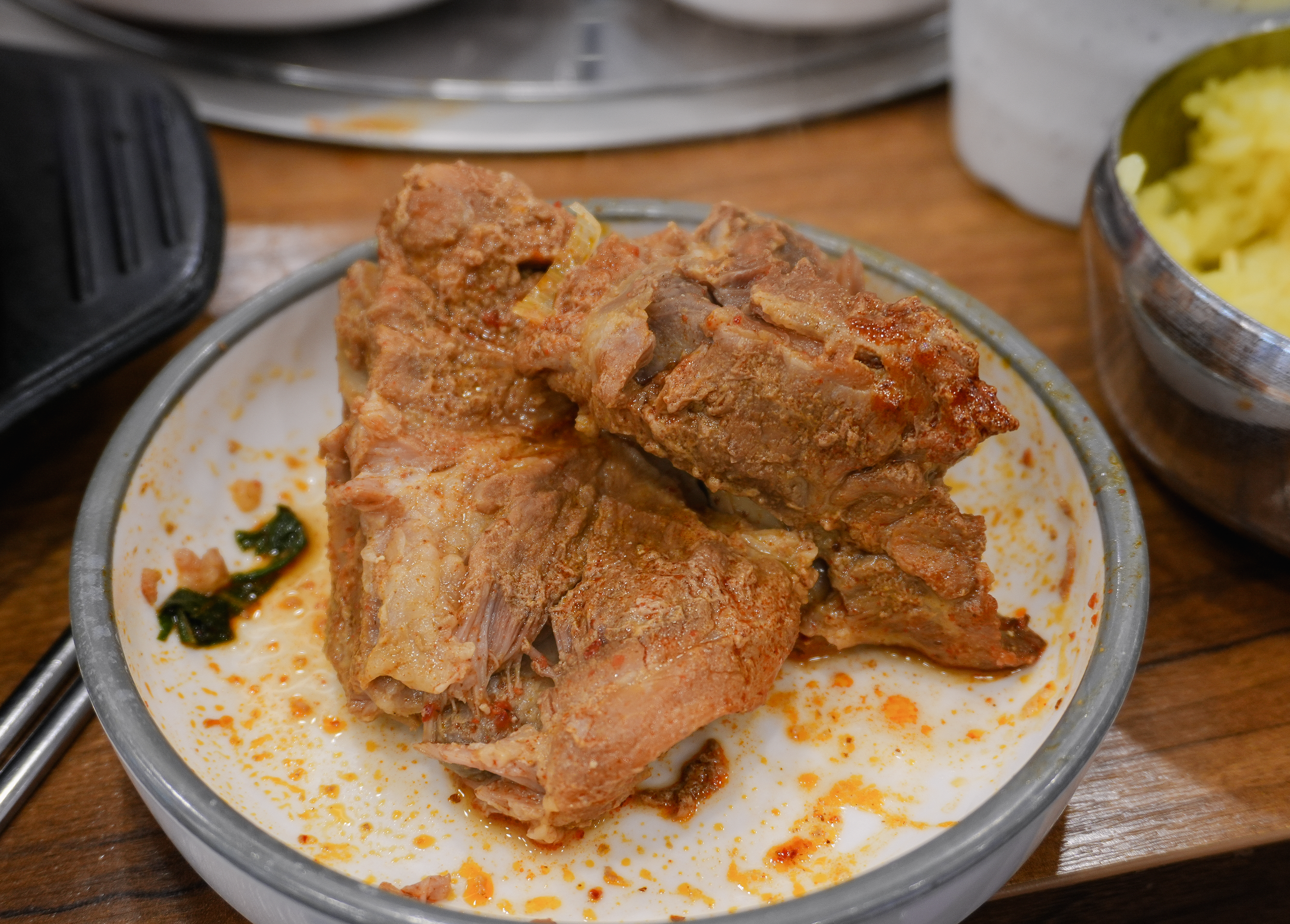 뼈해장국은 너무 맵지 않았고 깔끔한 매운맛이라 생각합니다. 굳이 비슷한 맵기를 찾아본다면 '육개장 사발면' 정도(?). 보통 국내산 생등뼈를 이용한 뼈해장국은 고기가 참치 통조림 마냥 퍽퍽한 경우가 많은데, 고기도 부드럽게 잘 삶아졌고 부족한 반찬 같은 경우에는 셀프바에서 직접 덜어다 먹으면 되었습니다.