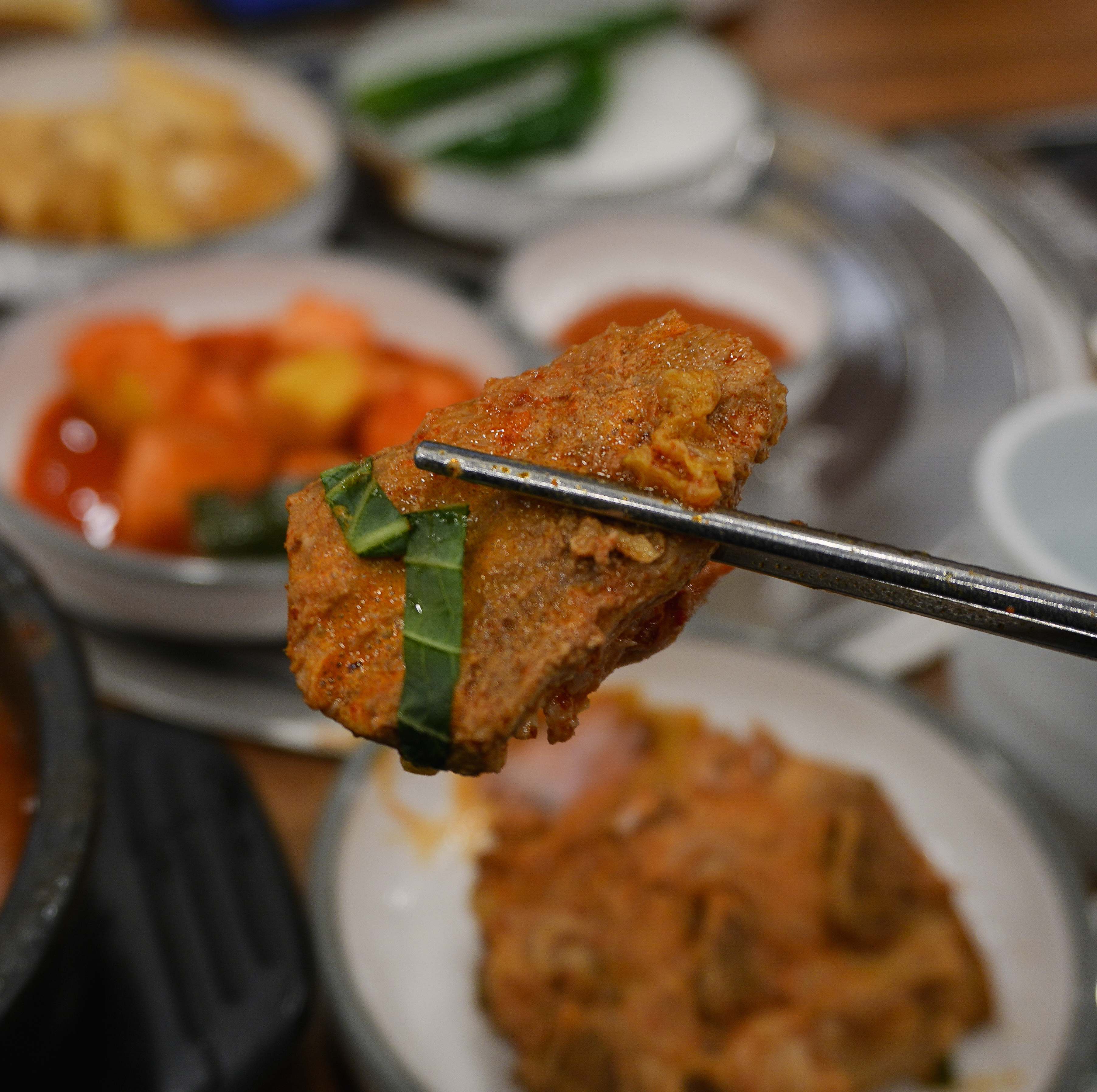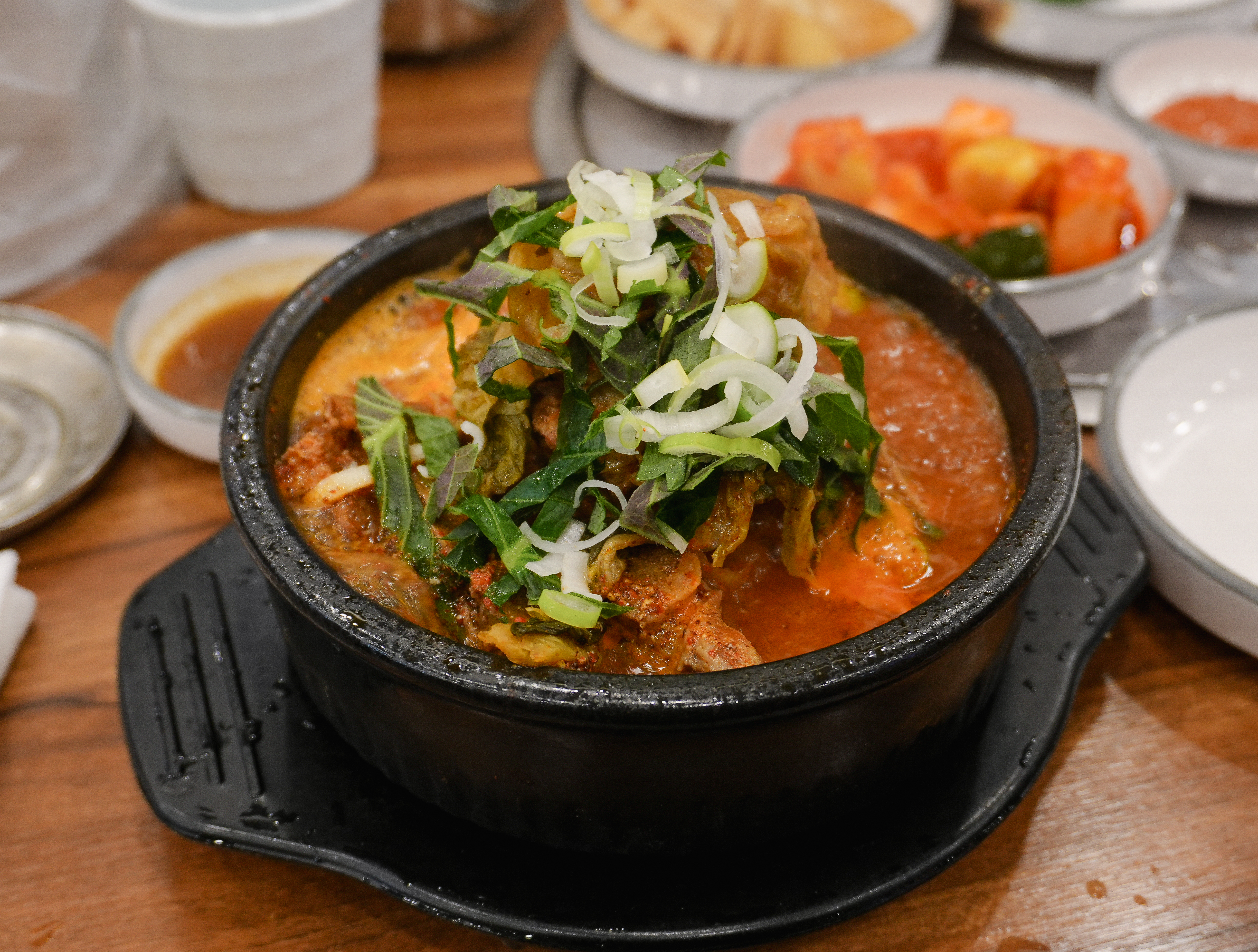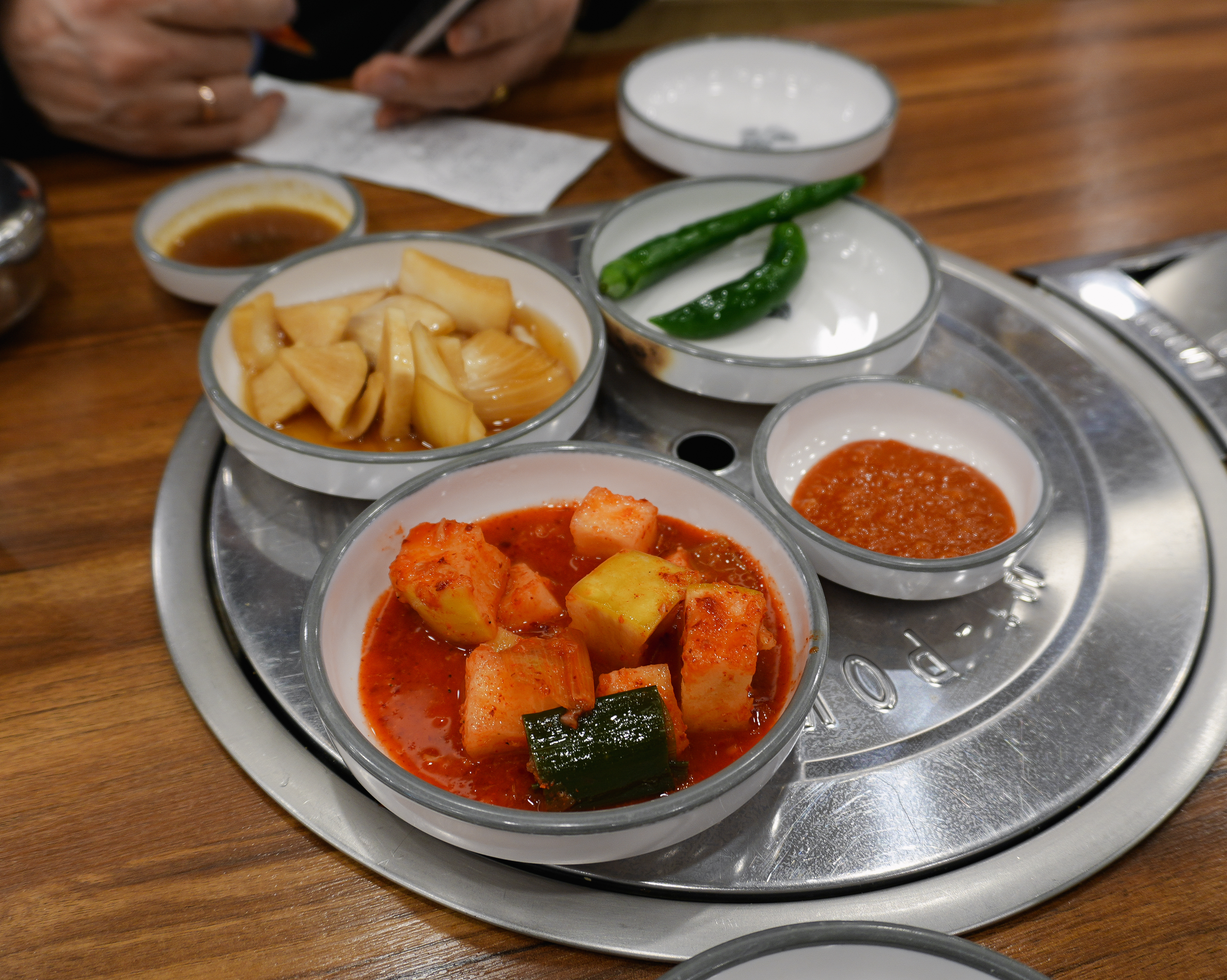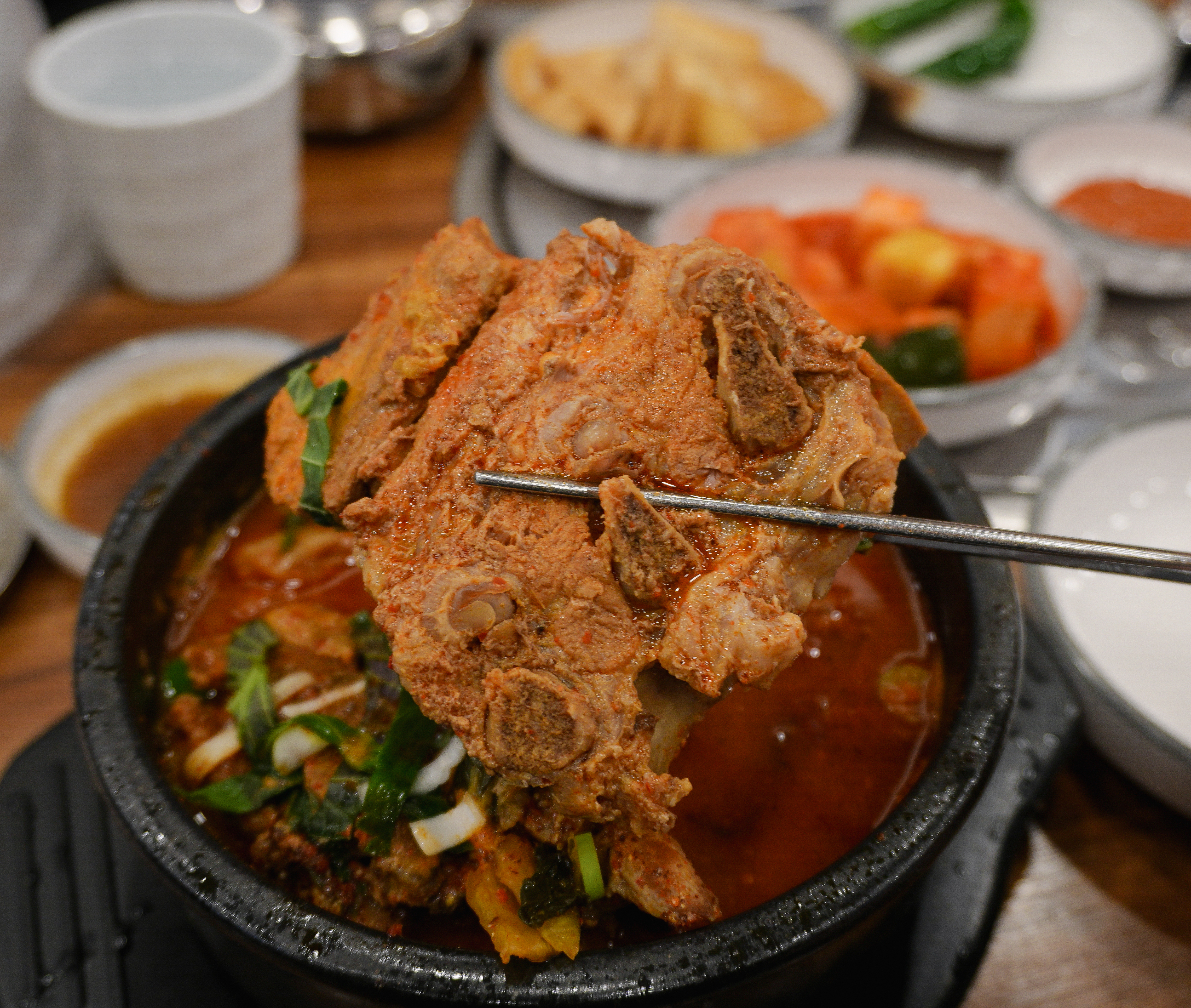 뼈해장국은 너무 맵지 않았고 깔끔한 매운맛이라 생각합니다. 굳이 비슷한 맵기를 찾아본다면 '육개장 사발면' 정도(?). 보통 국내산 생등뼈를 이용한 뼈해장국은 고기가 참치 통조림 마냥 퍽퍽한 경우가 많은데, 고기도 부드럽게 잘 삶아졌고 부족한 반찬 같은 경우에는 셀프바에서 직접 덜어다 먹으면 되었습니다.