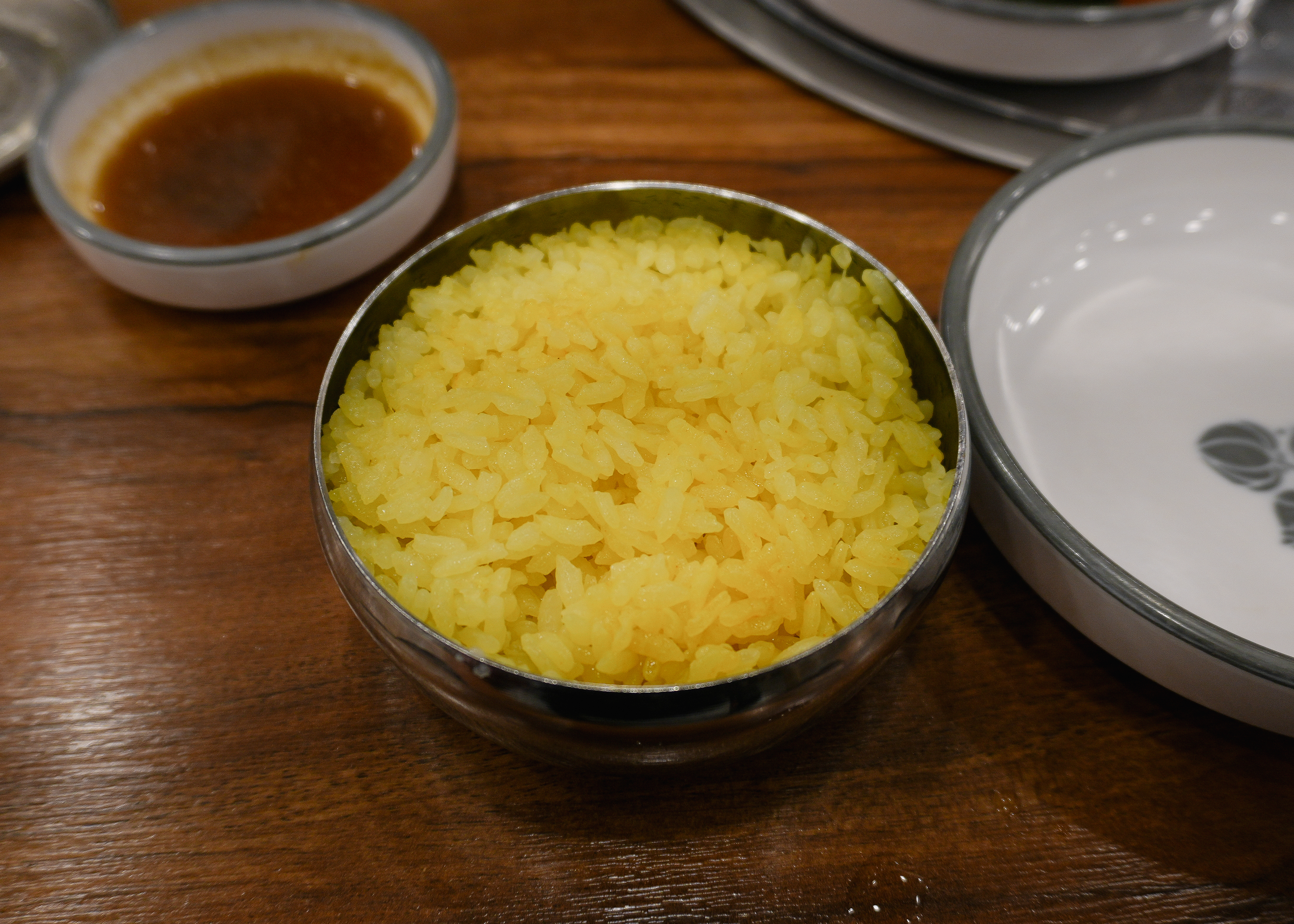 신사골감자탕에서 뼈해장국을 주문하면 메인 메뉴인 뼈해장국과 깍두기, 양파장아찌 그리고 고추와 쌈장을 함께 제공하고 있었습니다. 밥은 강황을 섞어 노란빛이 놀고 있었습니다. 색이 노란 거지 특별한 향이나 맛이 다르지는 않았습니다.
