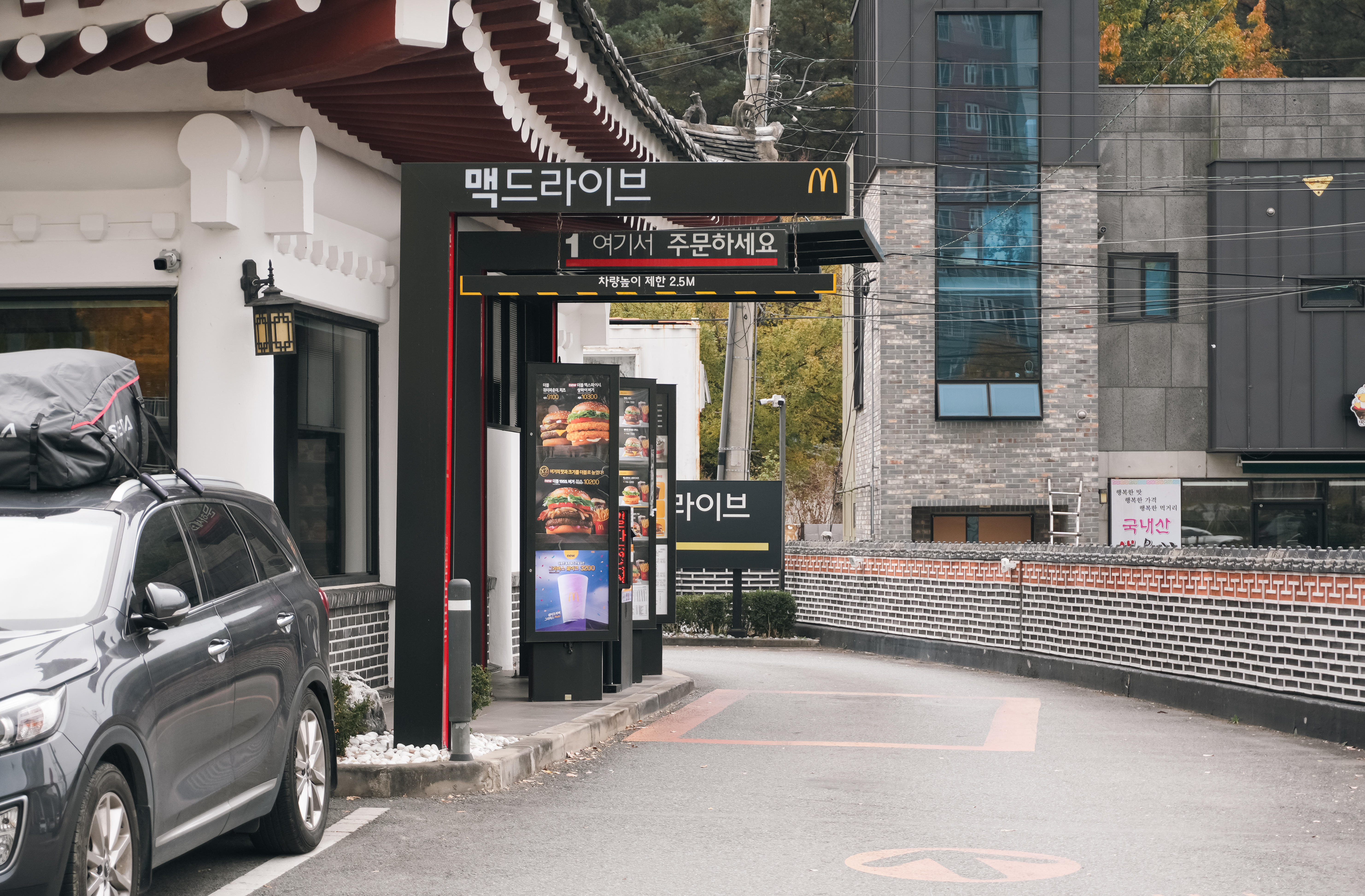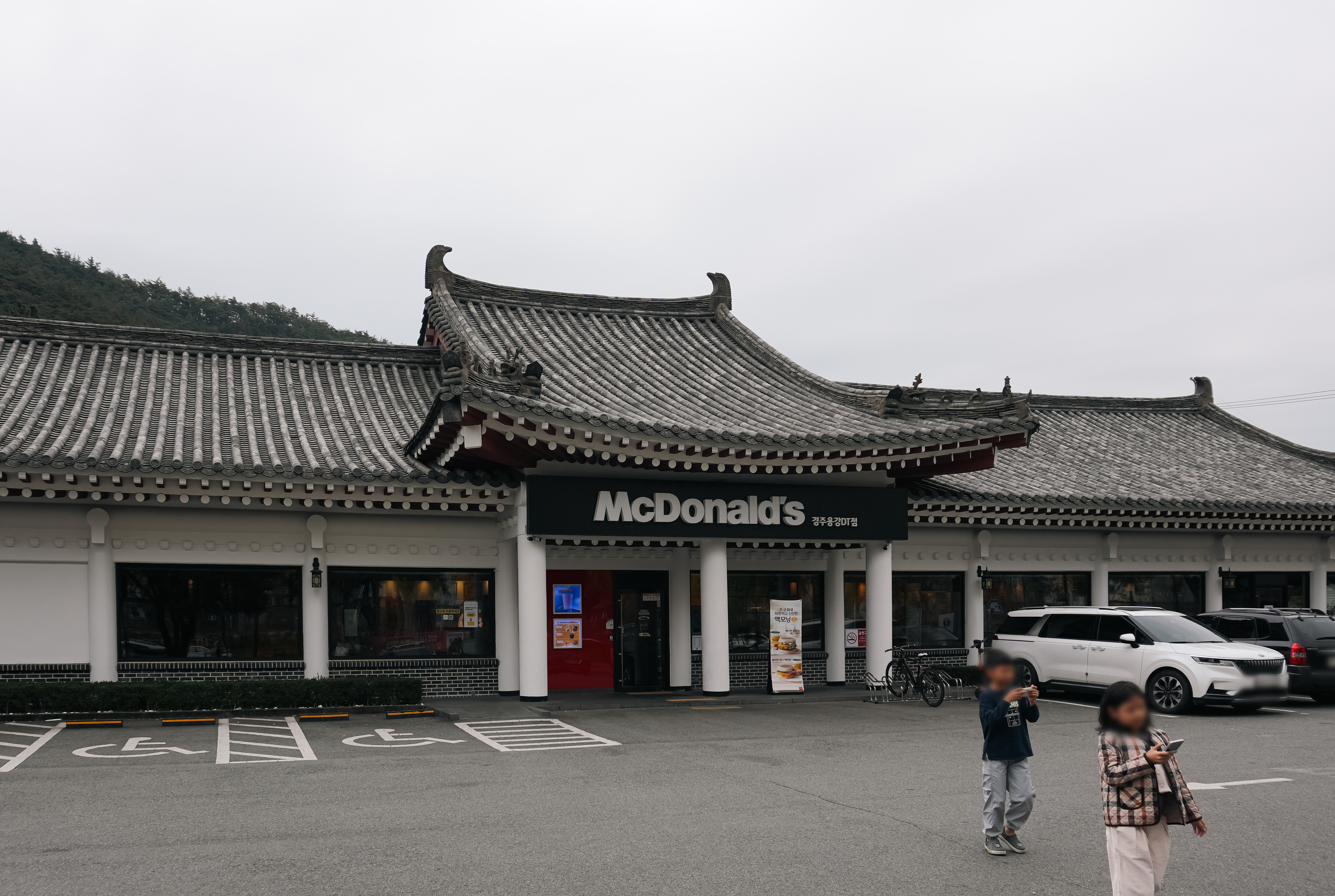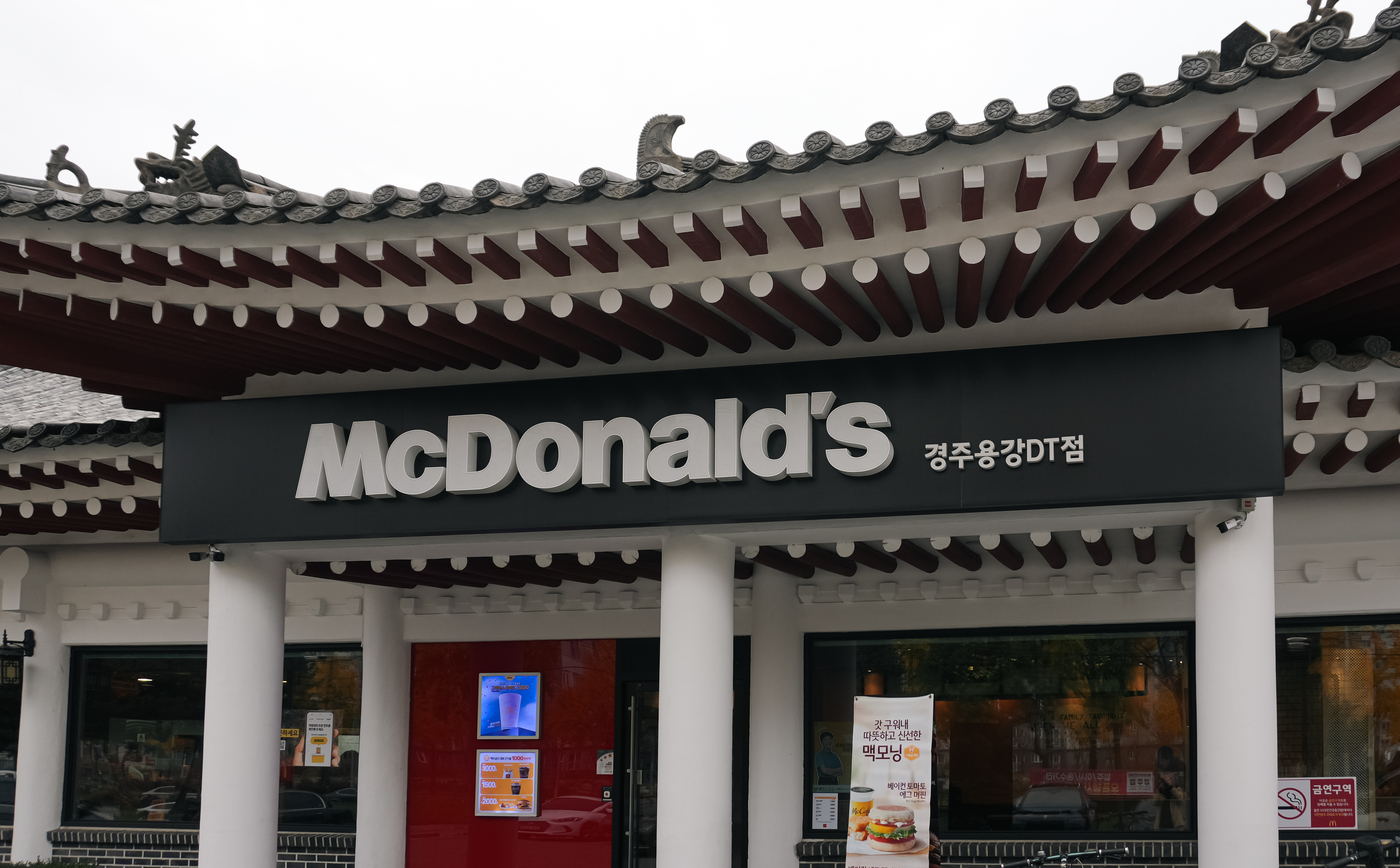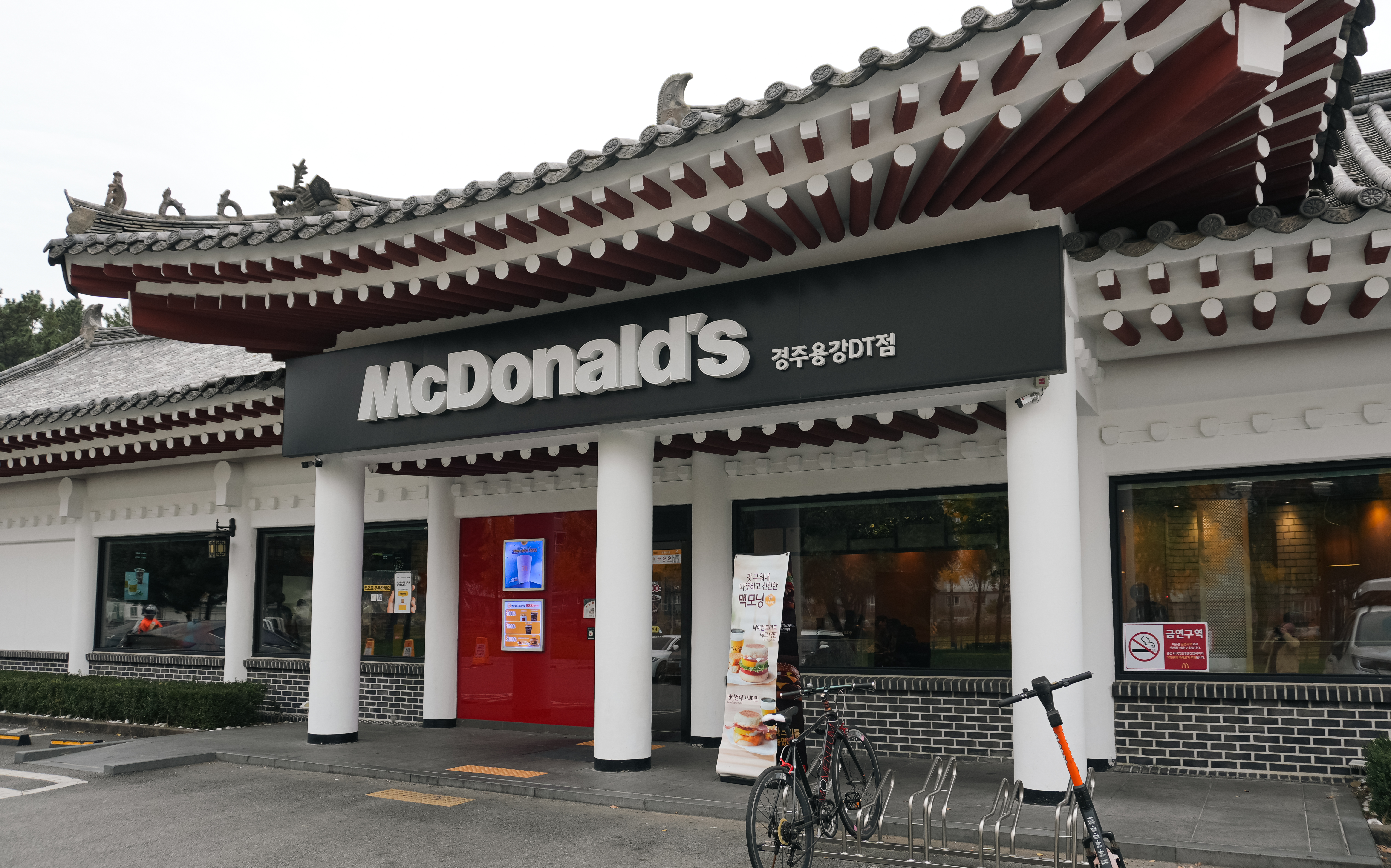 한옥 맥도날드외 외부에서 살펴보면 위와 같았습니다. 경주는 오랜 전통과 역사를 가지고 있는 도시로, 이곳은 역사와 전통의 도시 경주라는 특색에 맞게 흰 바탕에 지붕에 기와를 둘러서 전통 한옥구조의 기와집 형태로 지어졌다고 합니다.