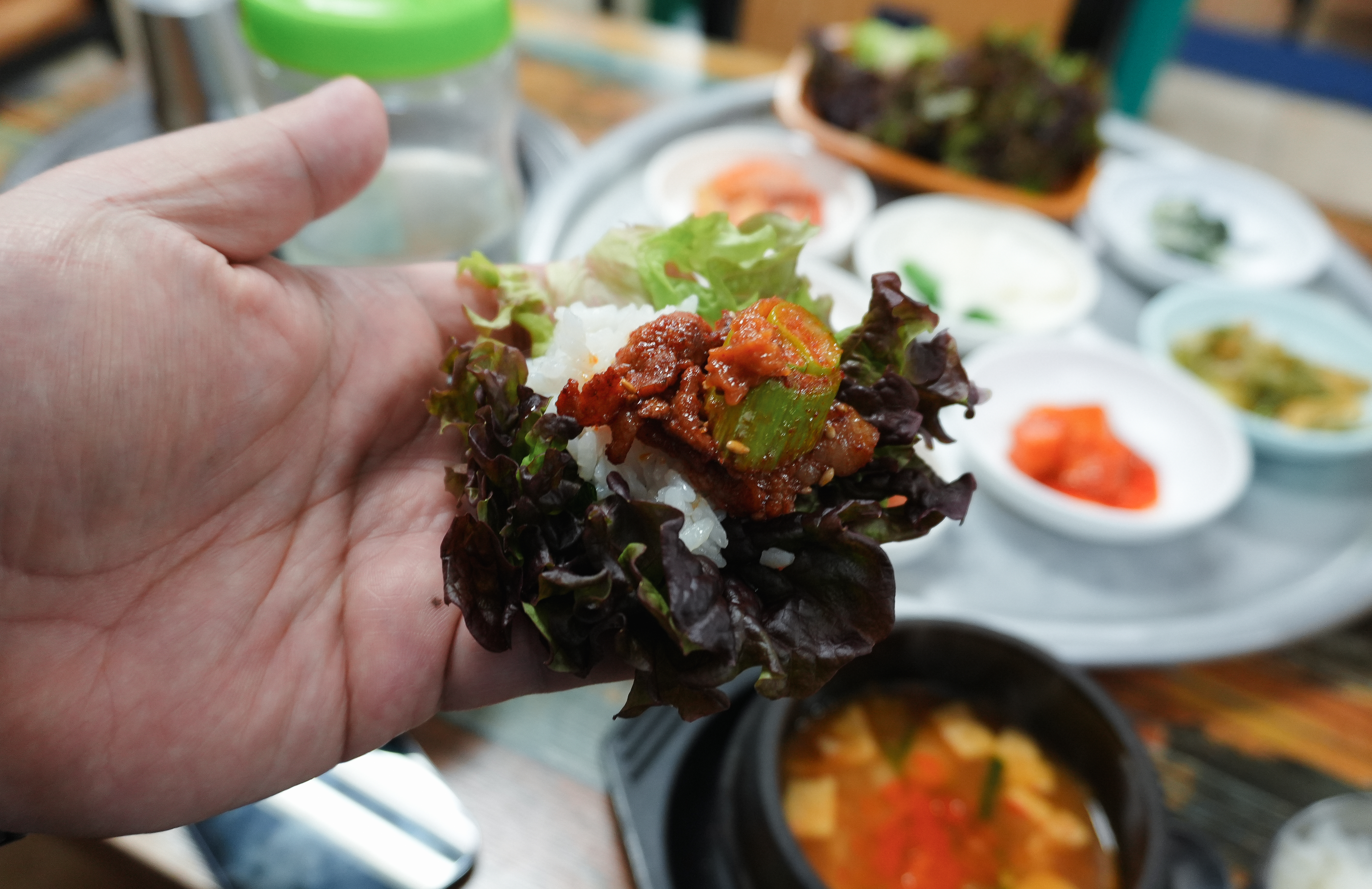 돈우리의 두루치기 메뉴는 위와 같이 나왔습니다. 혼자서 먹어도 쌈채소와 된장찌개가 제공되는 것은 꽤 매력적인 것 같은데요. 반찬도 나름 맛이 괜찮았습니다.