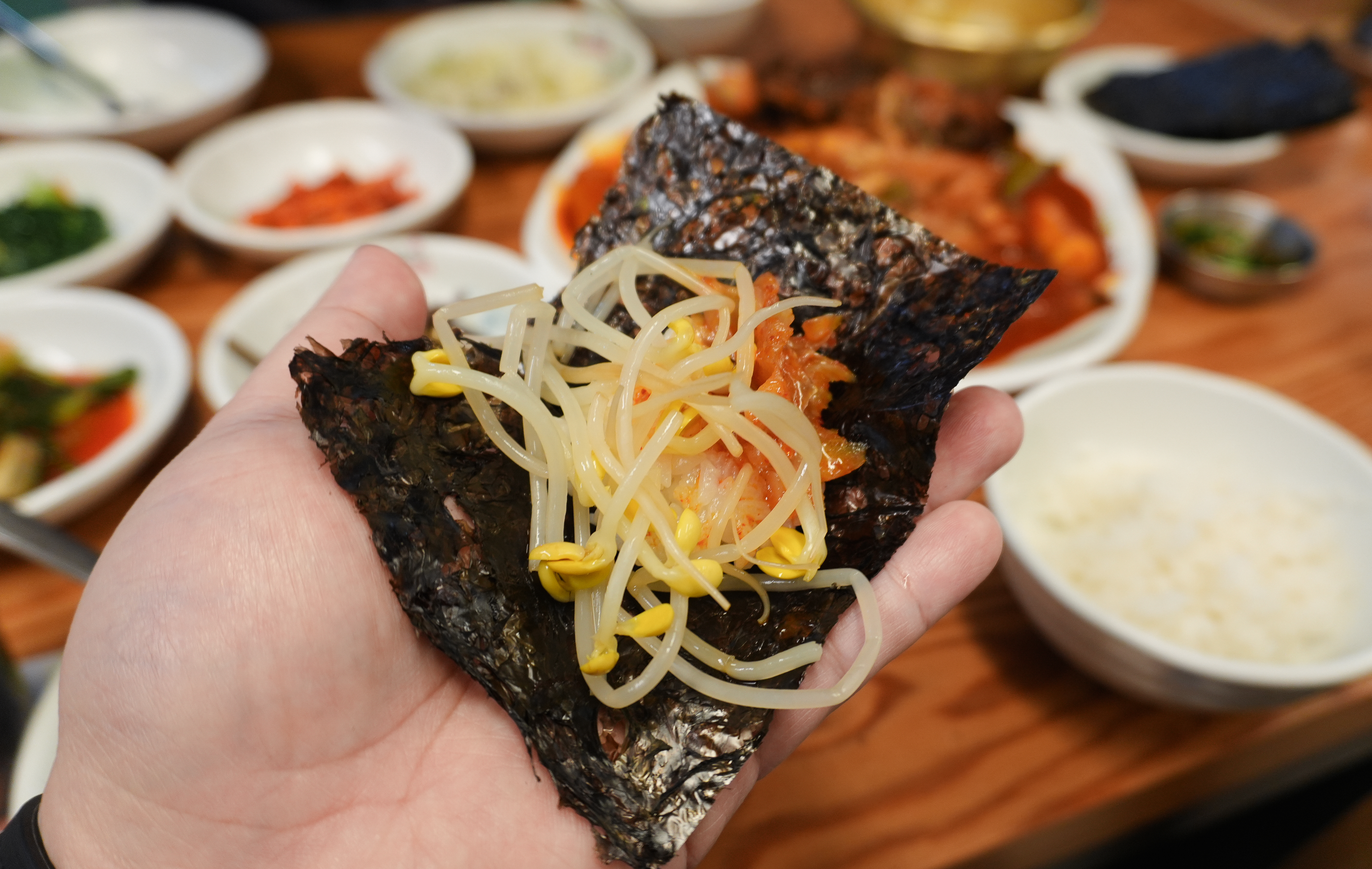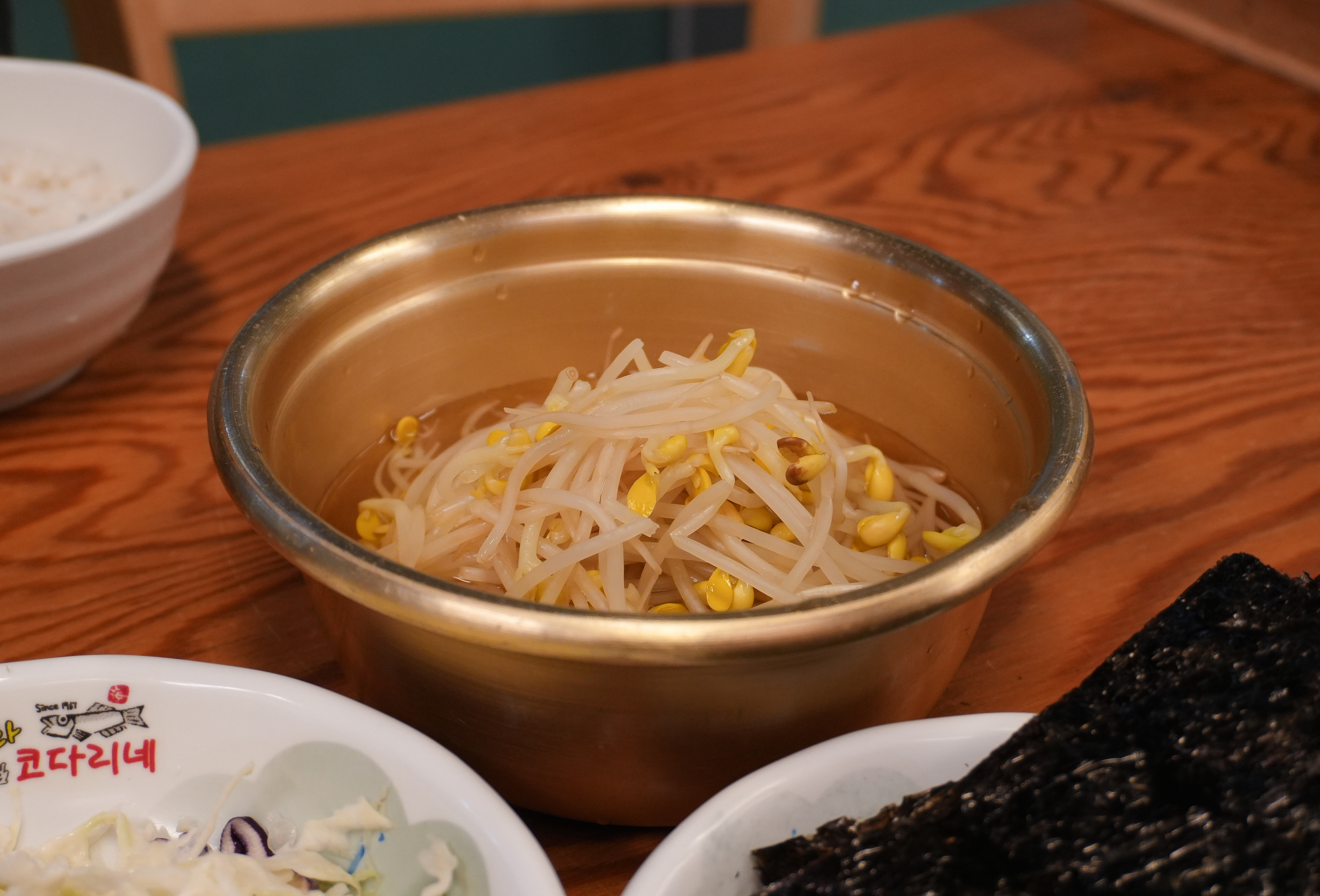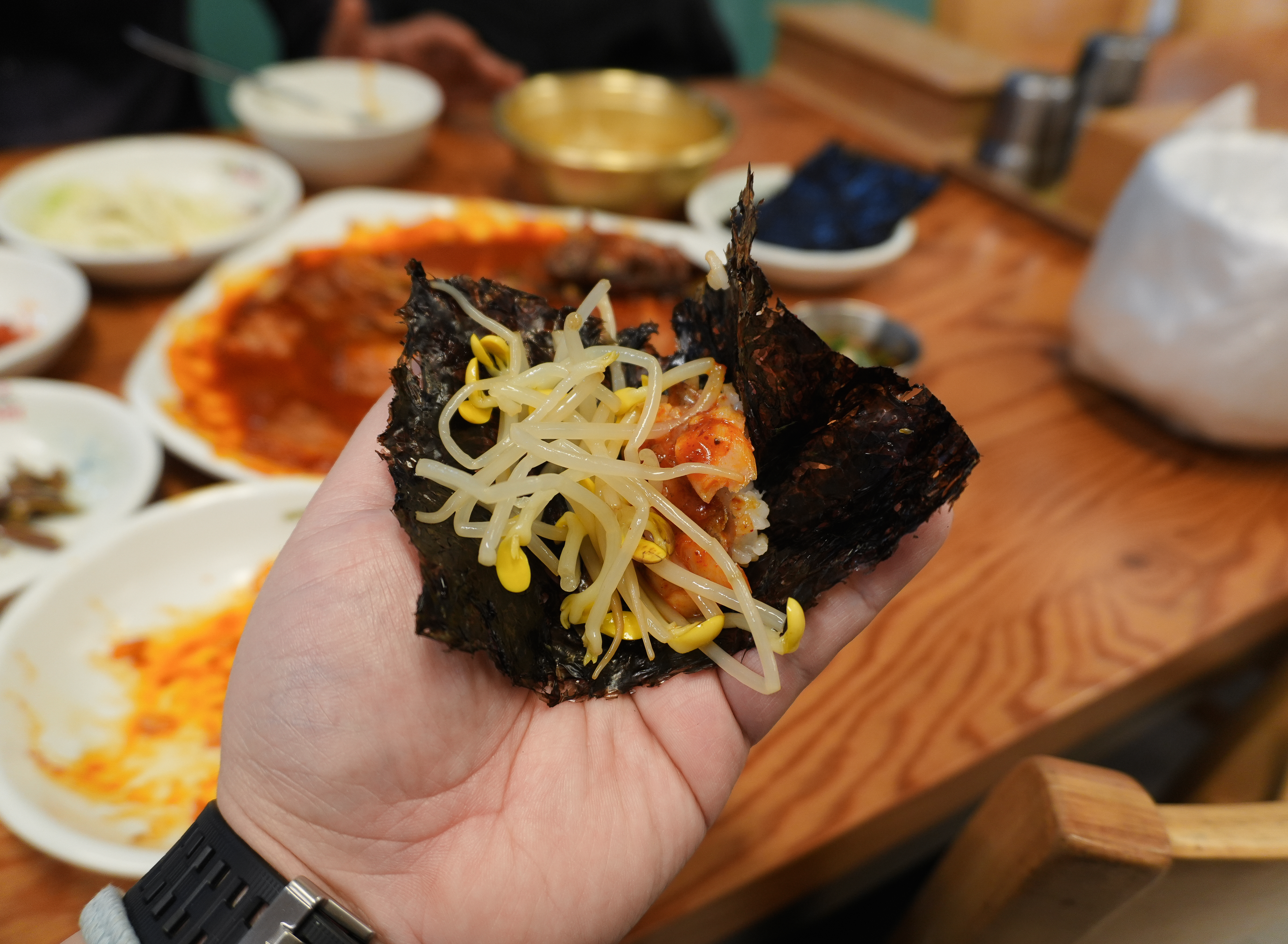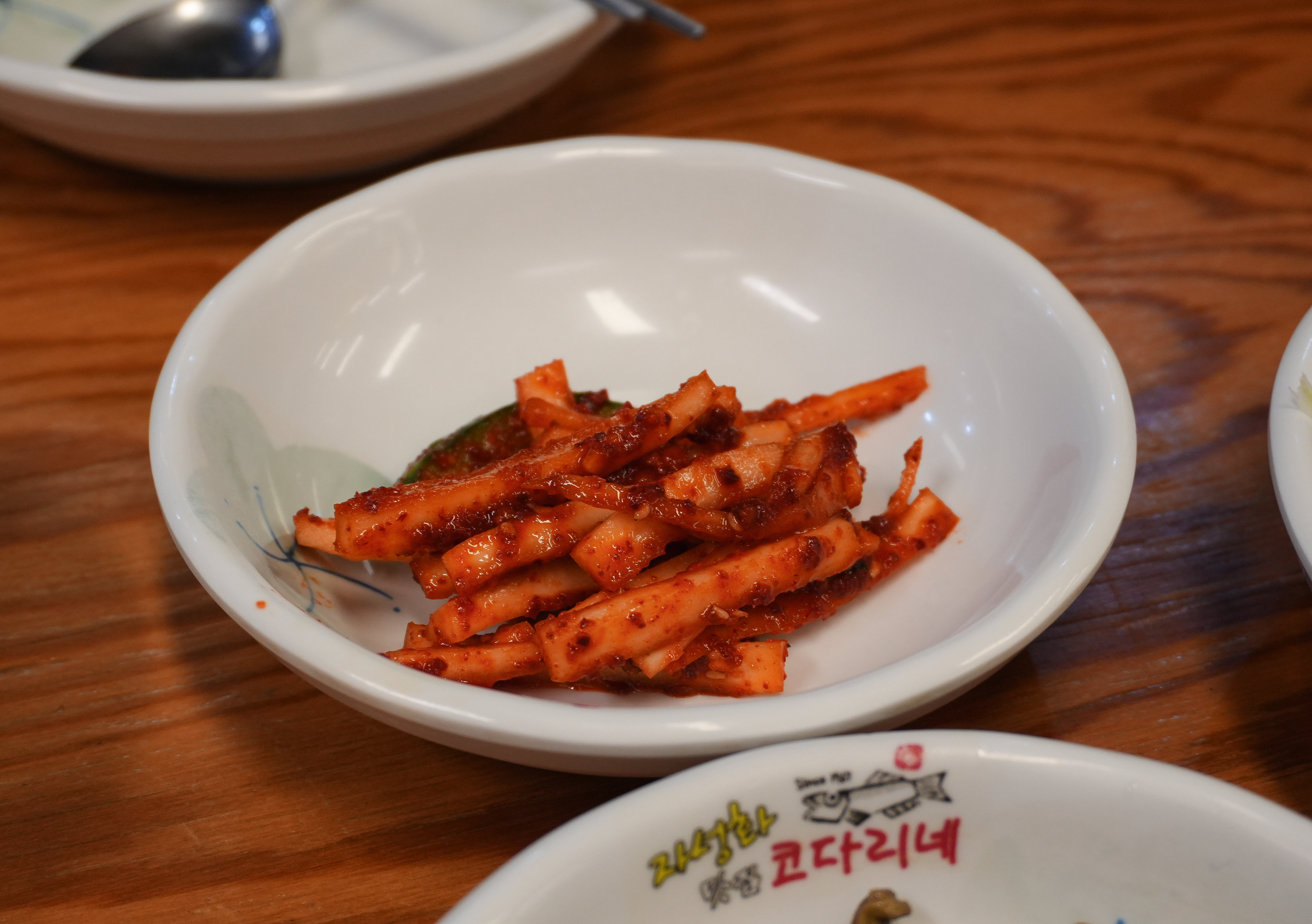 코다리조림은 위와같이 쫄깃한 상태의 반건조 명태에 매콤 달콤한 양념과 떡, 무 등을 넣어 조림으로 만든 메뉴였습니다. 메뉴가 나올 때 사장님이 먹는 방법을 추천해 주셨는데, 코다리조림을 김, 콩나물과 함께 싸서 먹으라고 알려주시더라고요.