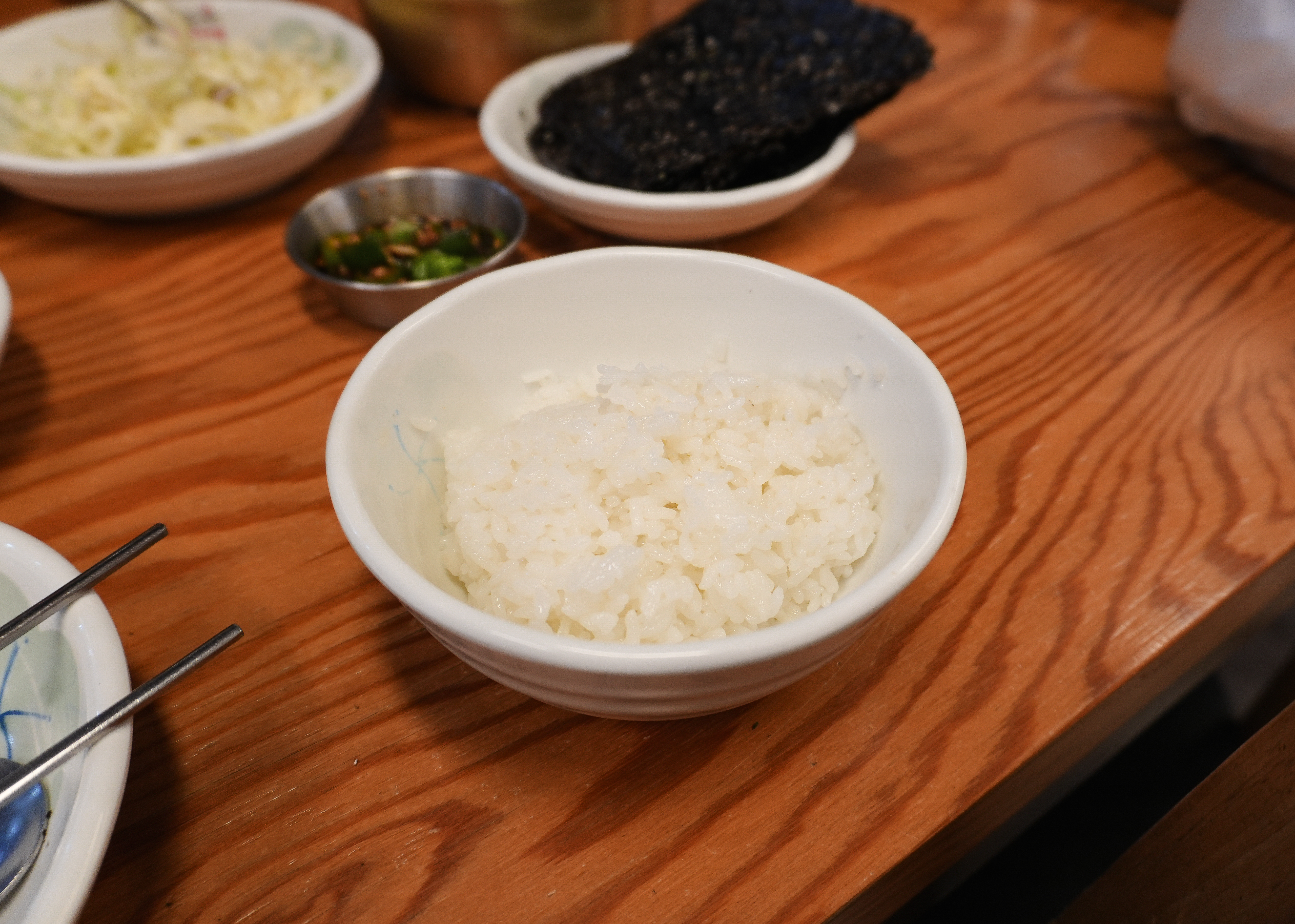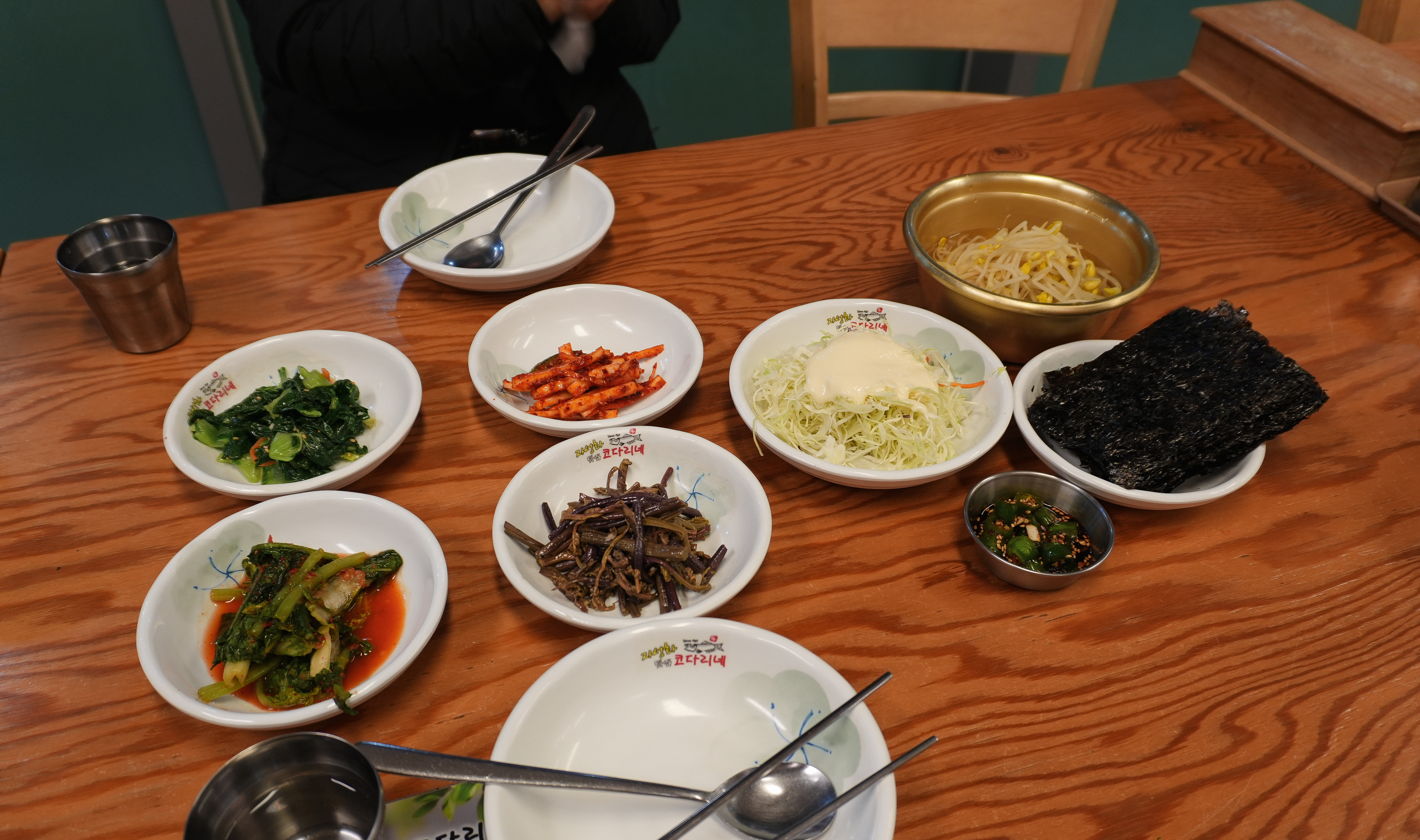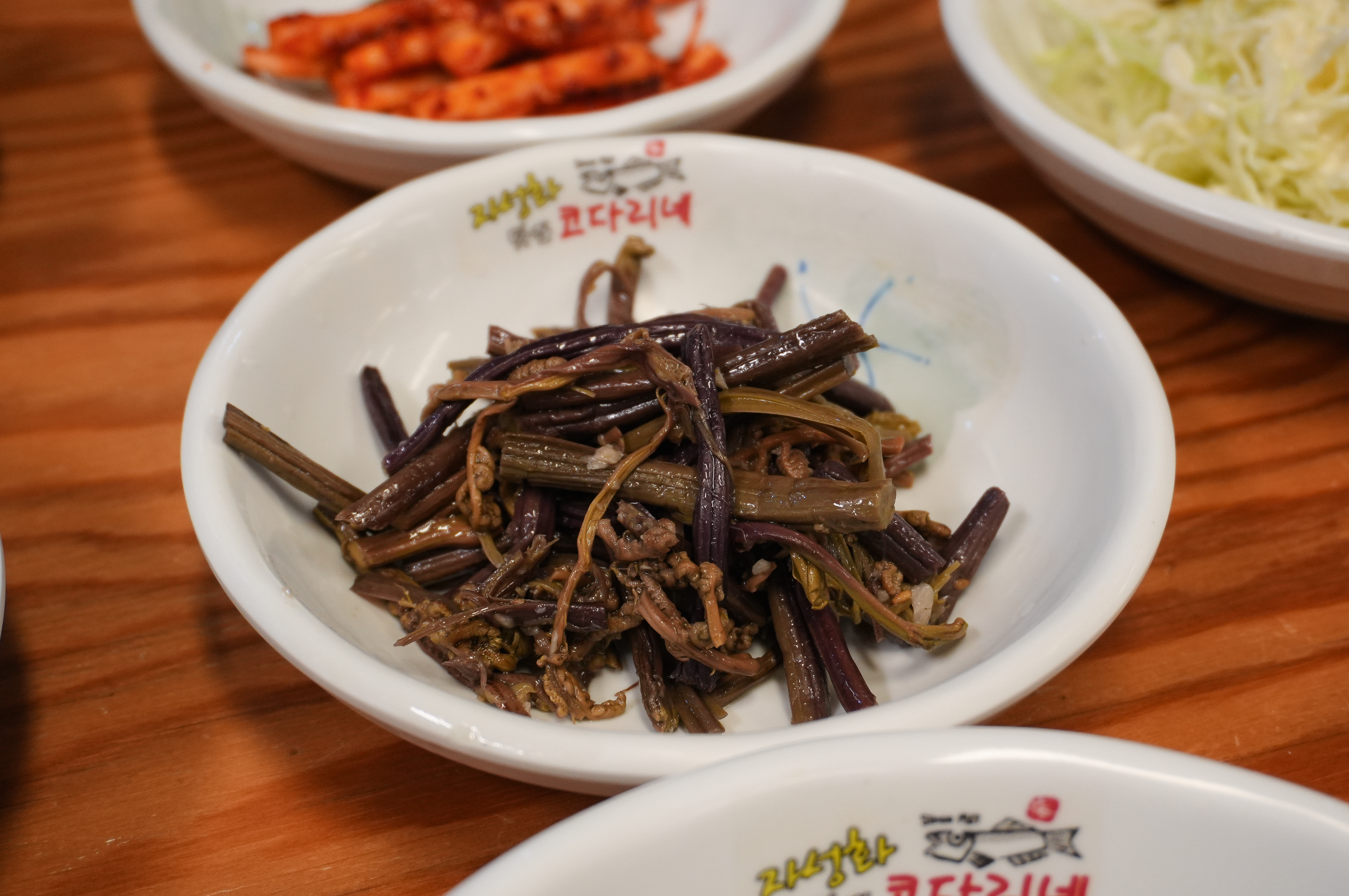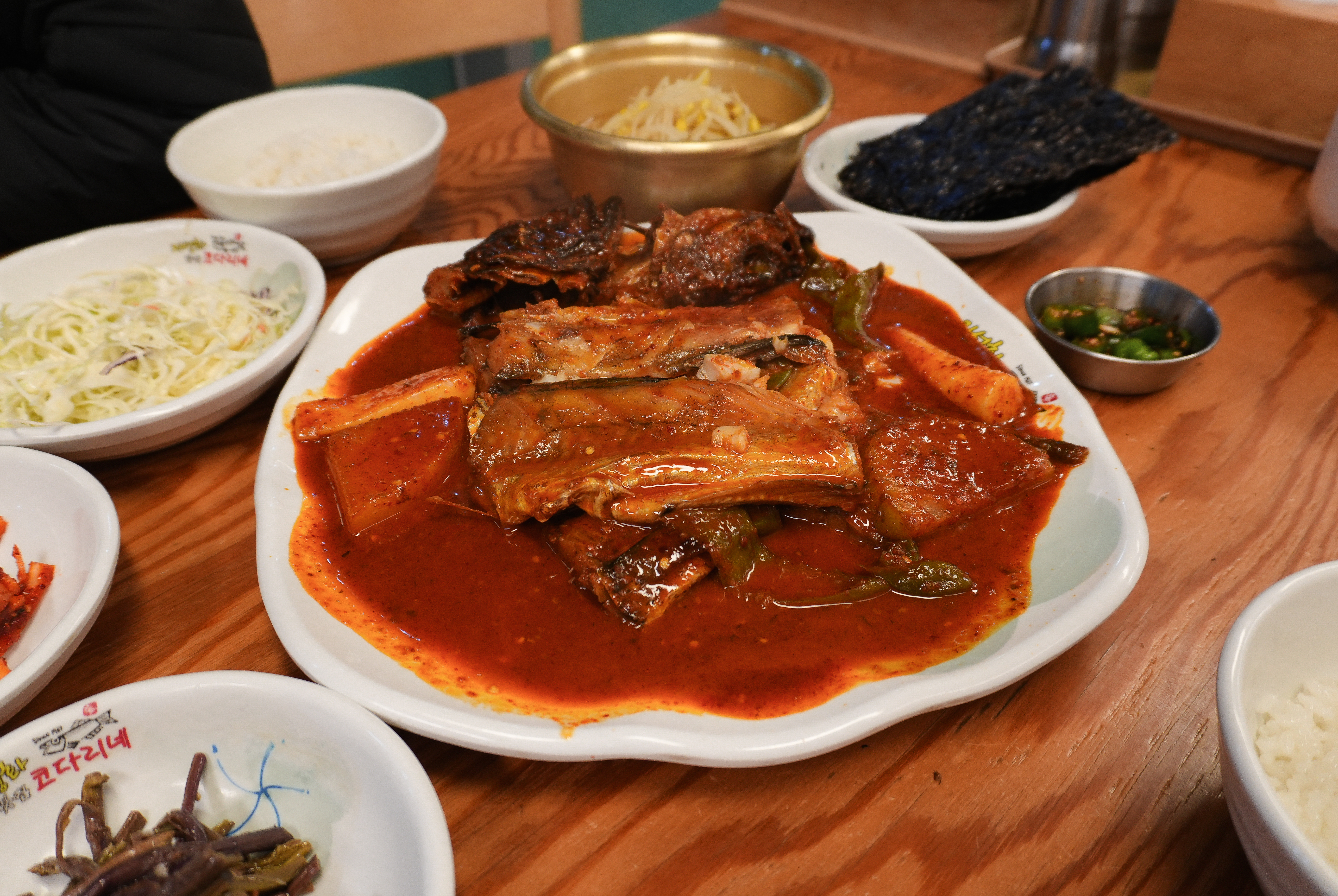 저희는 코다리조림을 먹어보았는데요, 어부네코다리조림의 코다리조림은 위와 같이 빨간 양념에 갖가지 반찬들이 함께 나왔습니다. 기본적으로 양배추샐러드와 시금치, 고사리, 도라지, 열무김치, 콩나물, 김이 나왔습니다.