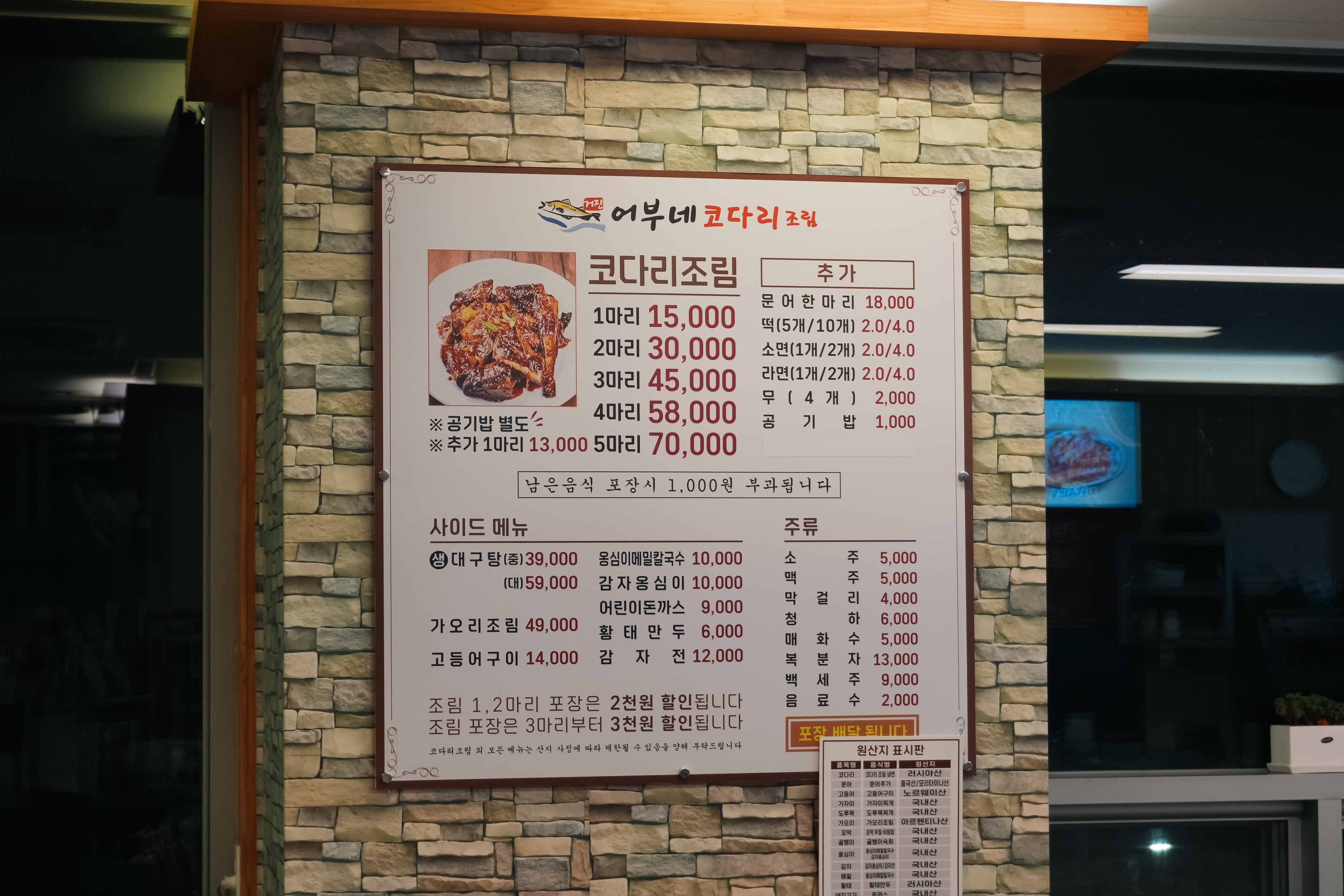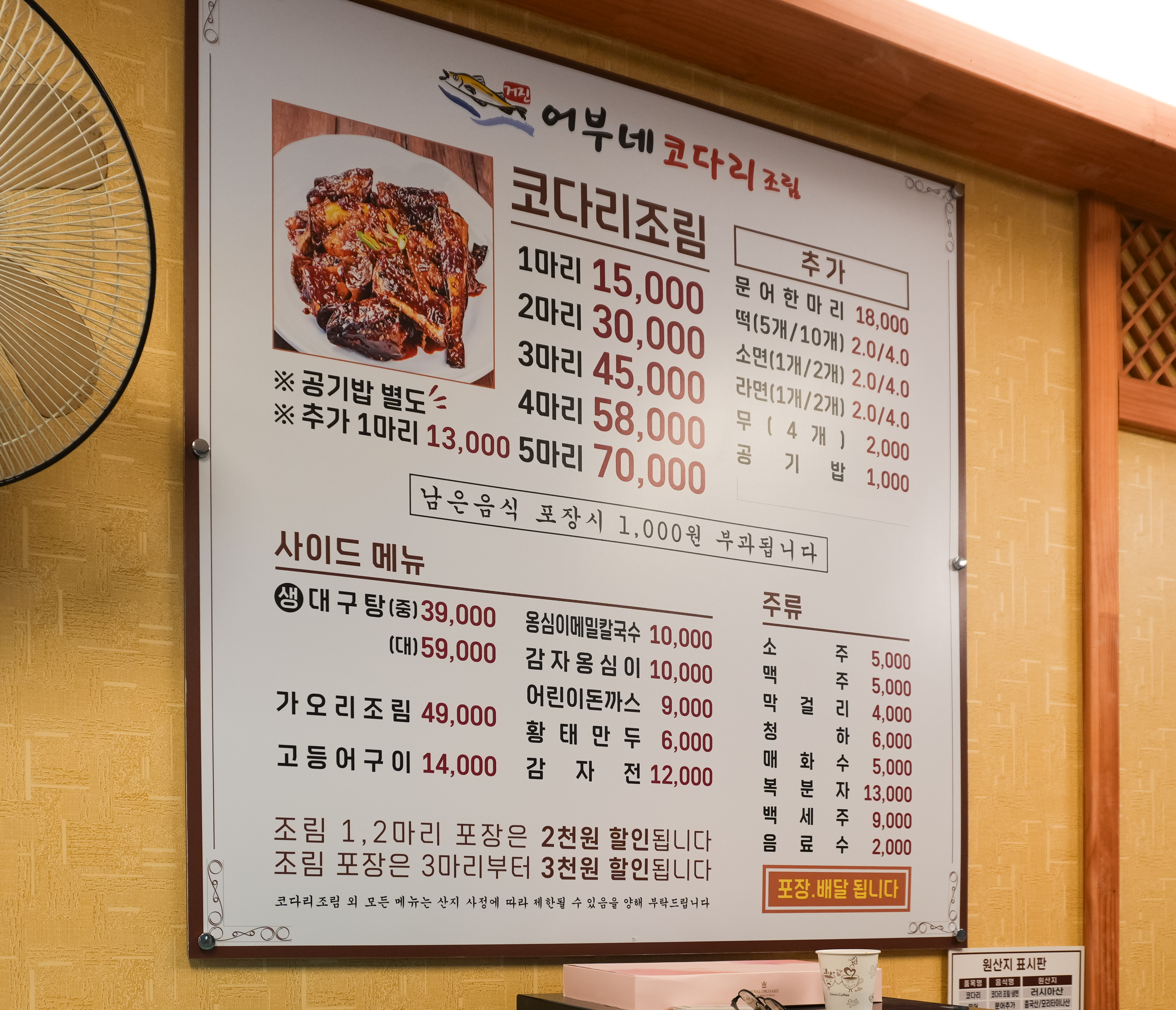 어부네코다리조림의 메뉴는 위와 같습니다. 코다리조림(문어한마리, 떡, 소면, 라면, 무), 생대구탕, 가오리조림, 고등어구이, 옹심이메밀칼국수, 감자옹심이, 어린이돈까스, 황태만두, 감자전 등이 있었습니다. (※ () 안에 있는 메뉴는 추가메뉴입니다.)