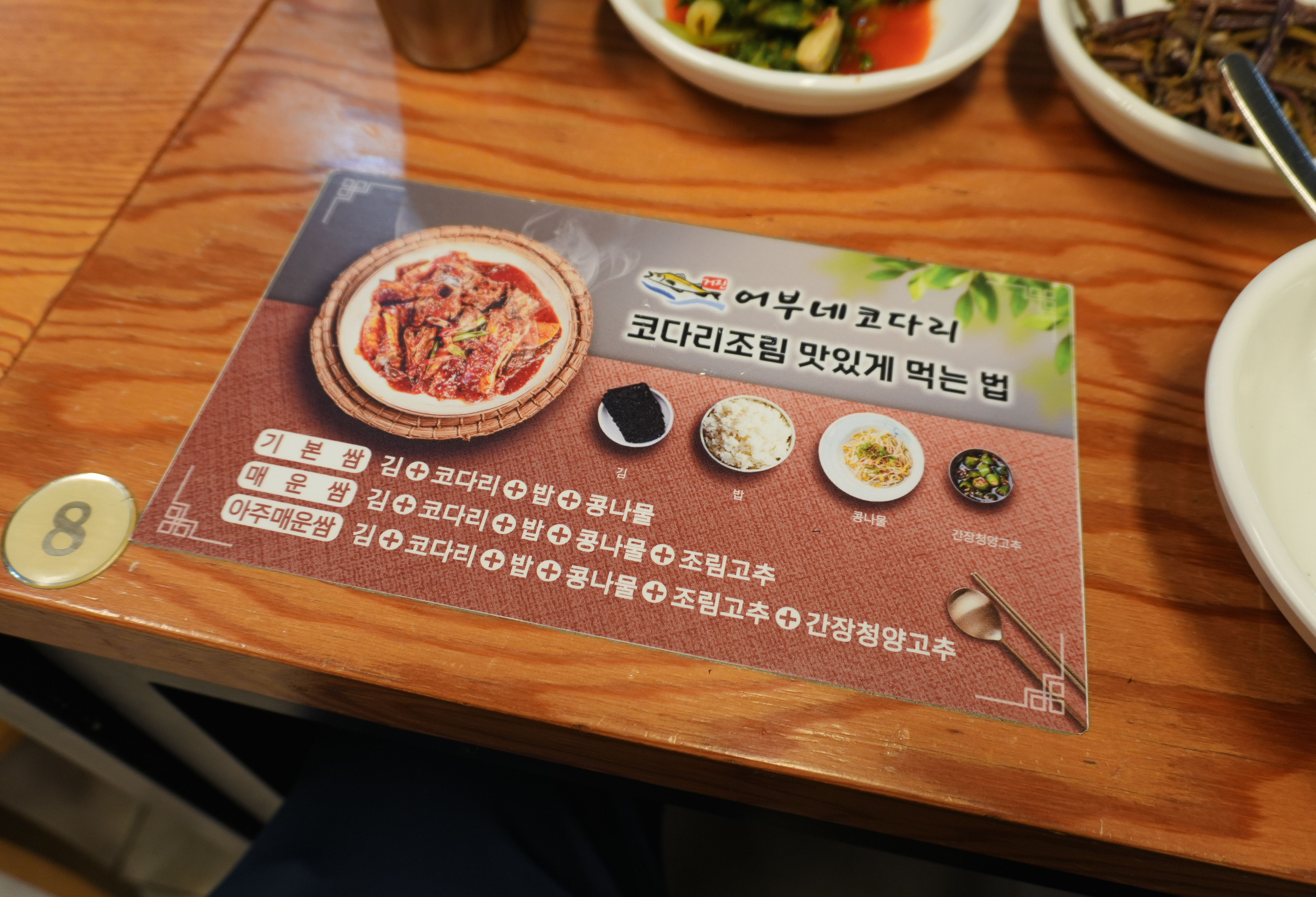 코다리조림을 더 맛있게 먹는 방법에 대해 알아보시죠. 가장 기본쌈은 김, 코다리, 밥, 콩나물이었고, 매운쌈, 아주매운쌈은 기호에 따라 코다리조림에 있는 고추를 첨가하거나, 김과 함께 제공된 간장청양고추까지 곁들여 먹으면 된다고 합니다. 어부네 코다리조림의 코다리조림은 처음엔 양념이 생각보다 묽은 느낌이라 실망했는데, 먹다 보니 은근히 매콤 쫄깃하면서 맛있더라고요.