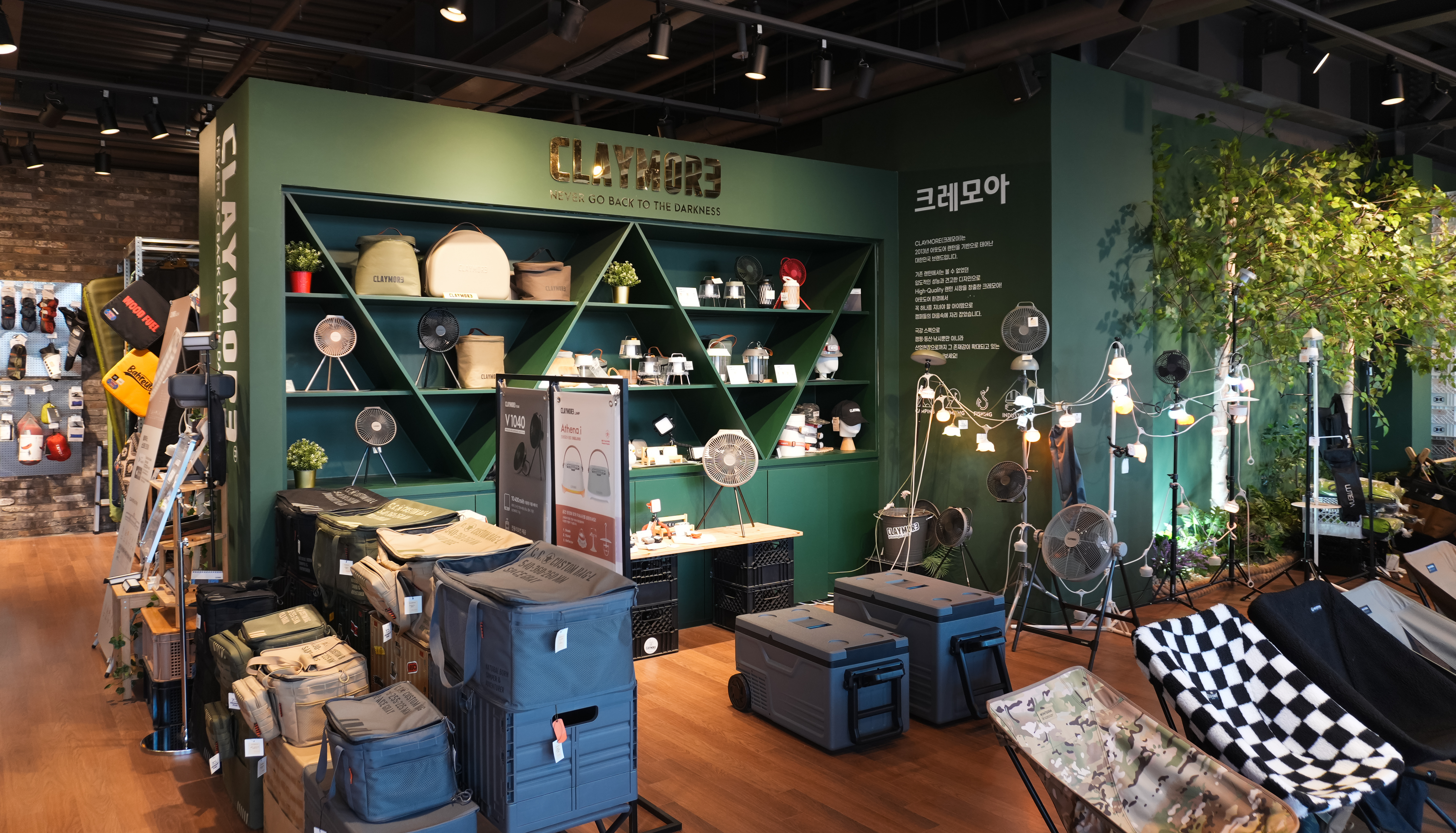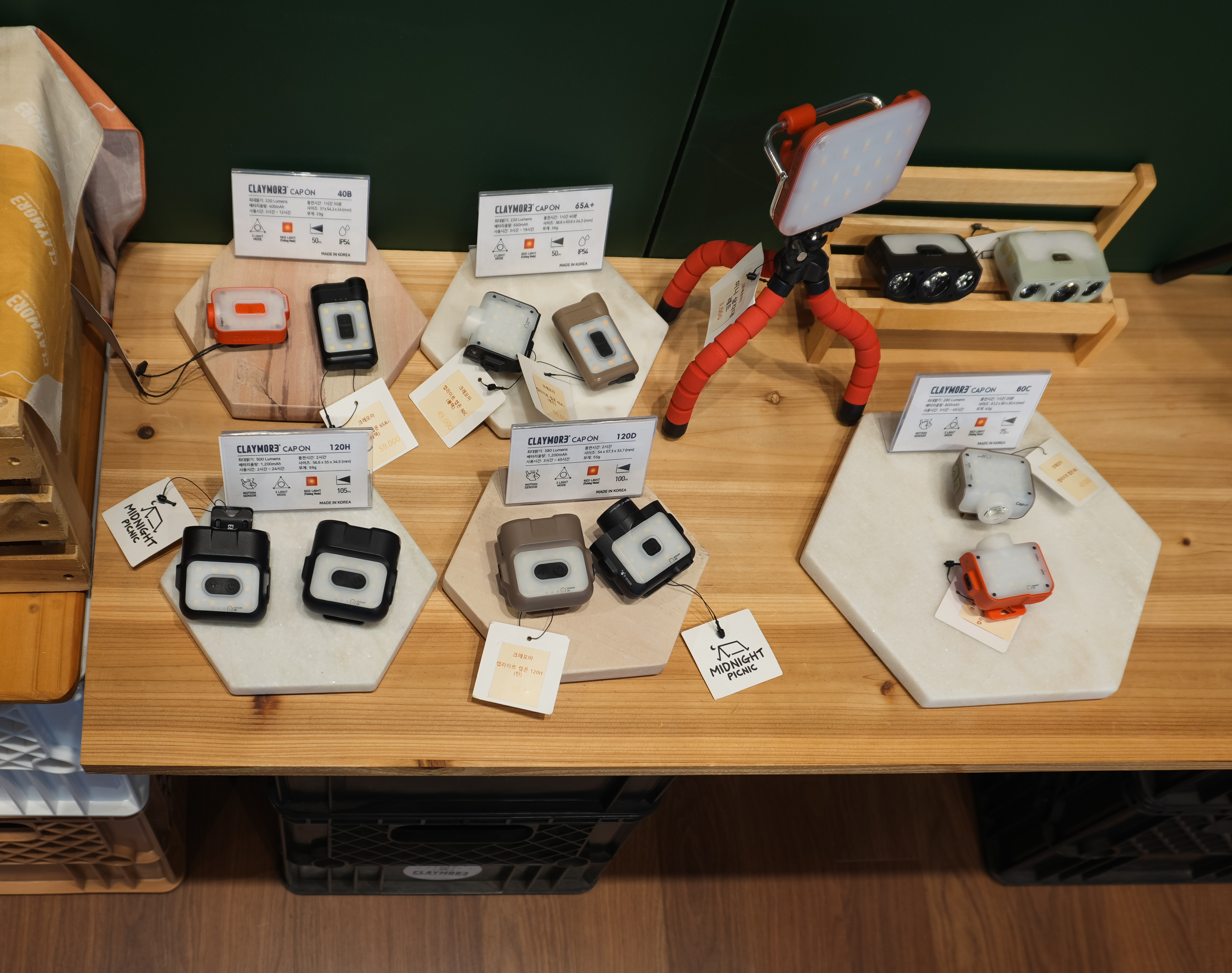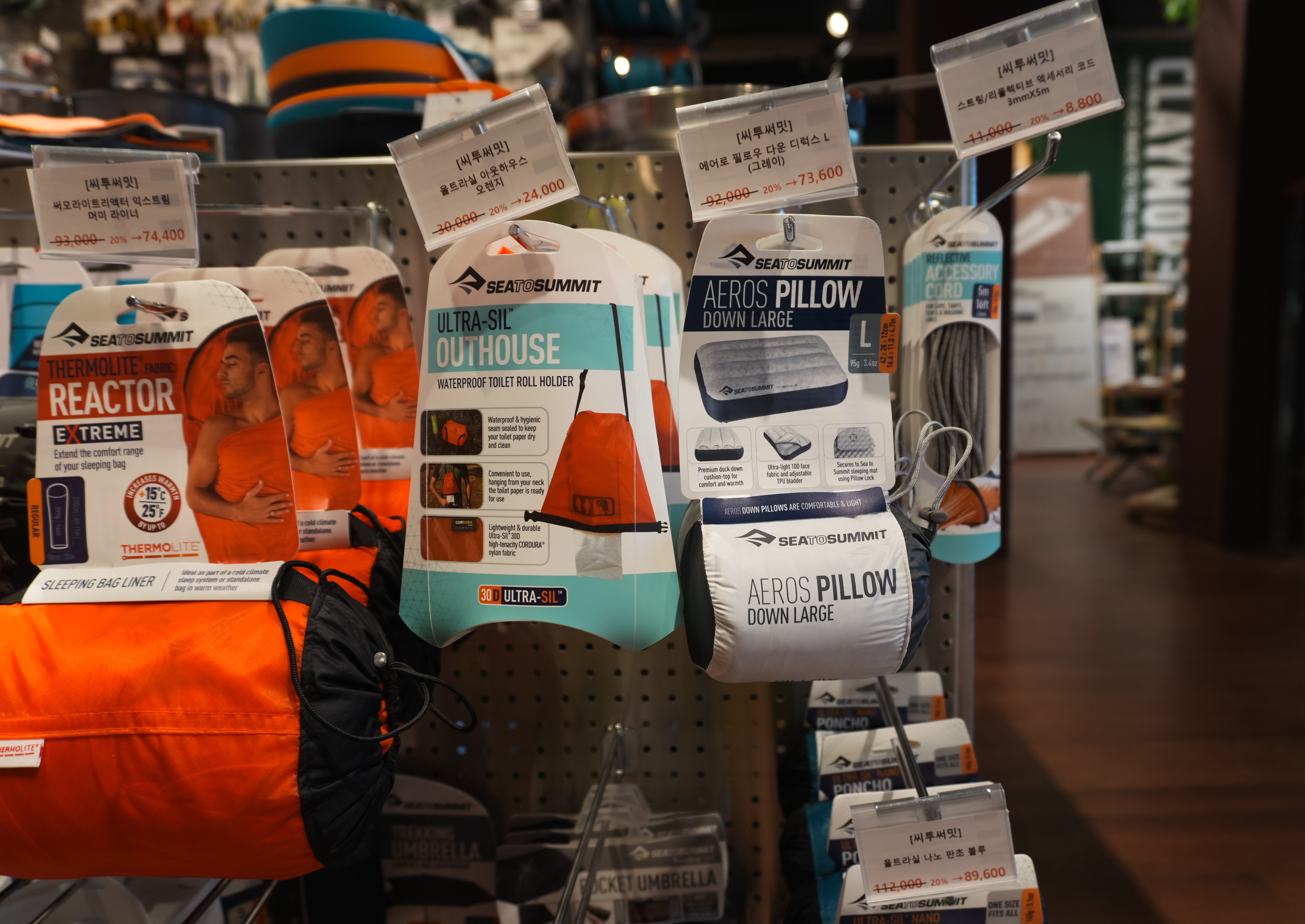 2층으로 올라가면 조금 더 캠핑에 가까운(?) 침낭 같은 중대형 사이즈의 캠핑용품과 브랜드샵을 만날 수 있었습니다. 제게 익숙한 브랜드인 랜턴으로 유명한 크레모아(CLAYMORE), 접이식 아웃도어 용품이 유명한 브루클린웍스(BROOKLYN WORKS), 휴대용 타월과 베개, 침낭 같이 휴대성 좋은 제품들을 판매하는 씨투써밋(SEA TO SUMMIT) 같은 제품들도 눈에 들어왔습니다.