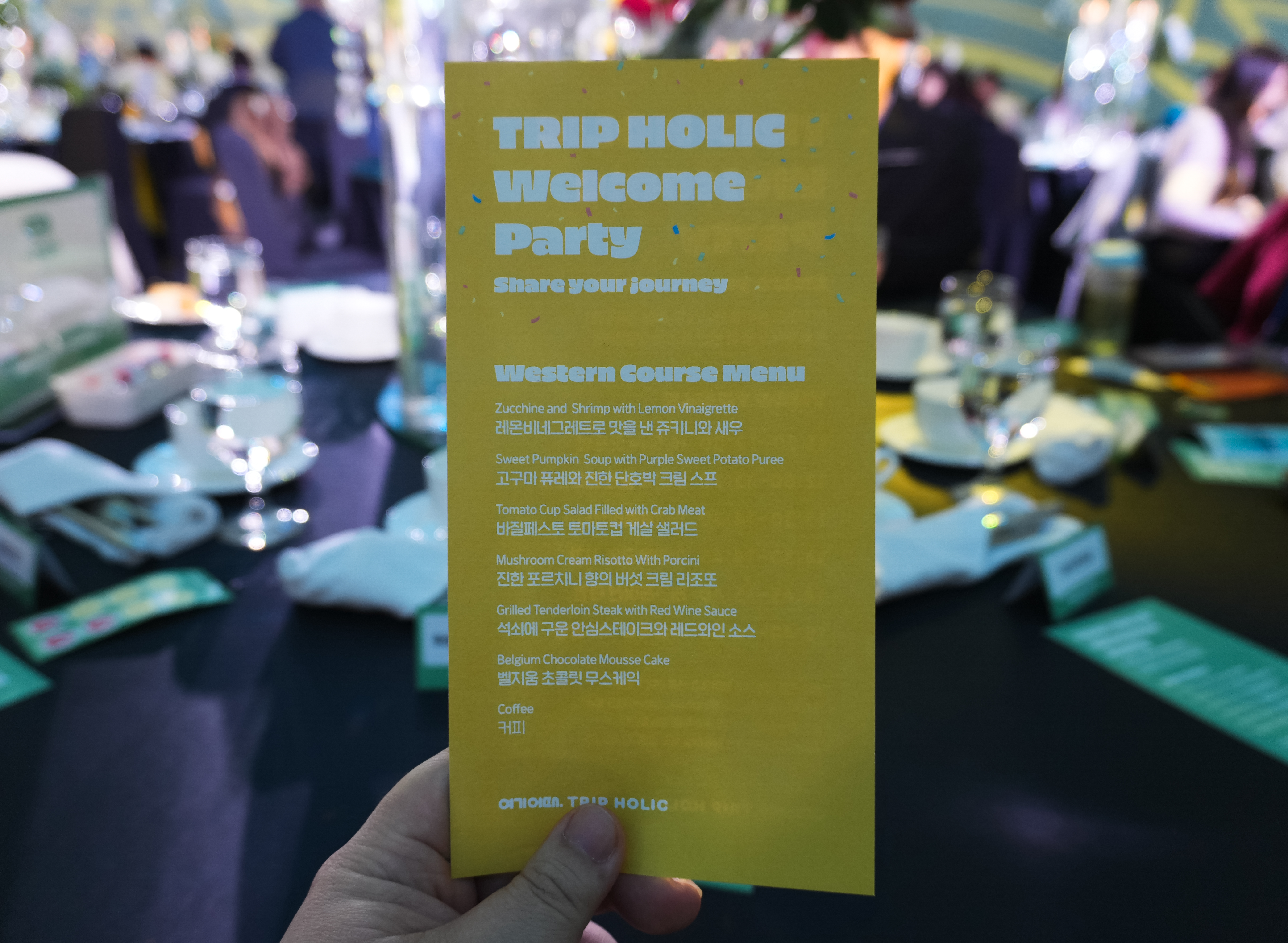 트립홀릭 5기 웰컴파티에서 식사는 12:00-13:30까지 진행되었습니다. 식사는 레몬비네그레트로 맛을 낸 쥬키니와 새우, 고구마 퓨레와 진한 단호박 크림 스프, 바질페스토 토마토컵 게살 샐러드, 진한 포르치니 향의 버섯 크림 리조또, 석쇠에 구운 안심스테이크와 레드와인 소스, 벨지움 초콜릿 무스케익, 커피 순으로 나왔습니다.