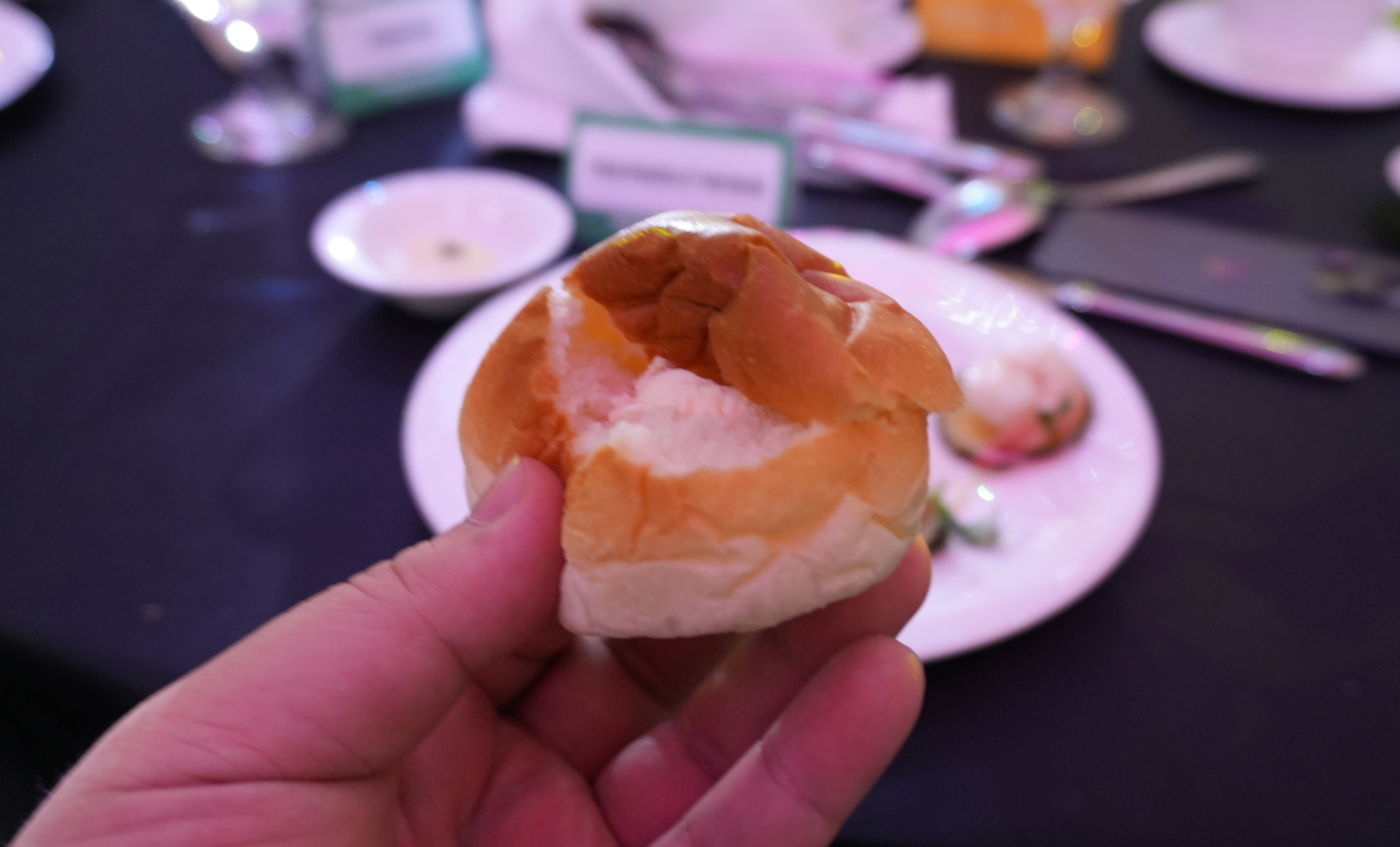 웰컴파티에서는 식사가 양식 코스요리 형태로 나왔습니다. 우선 레몬비네그레트로 만든 새우와 쥬키니, 식전빵 그리고 고구마 퓨레와 진한 단호박 크림 스프를 소개해드리겠습니다. 애피타이저로 나온 새우요리는 새콤한 레몬비네그레트로 입맛을 돋웠고, 따뜻한 식전빵에 고소하면서 달콤한 버터를 발라 먹으니 풍미가 참 좋았습니다. 특히 이런 행사장에서 먹으면 단호박 수프도 더 특별한 맛이 나는 느낌이 듭니다.