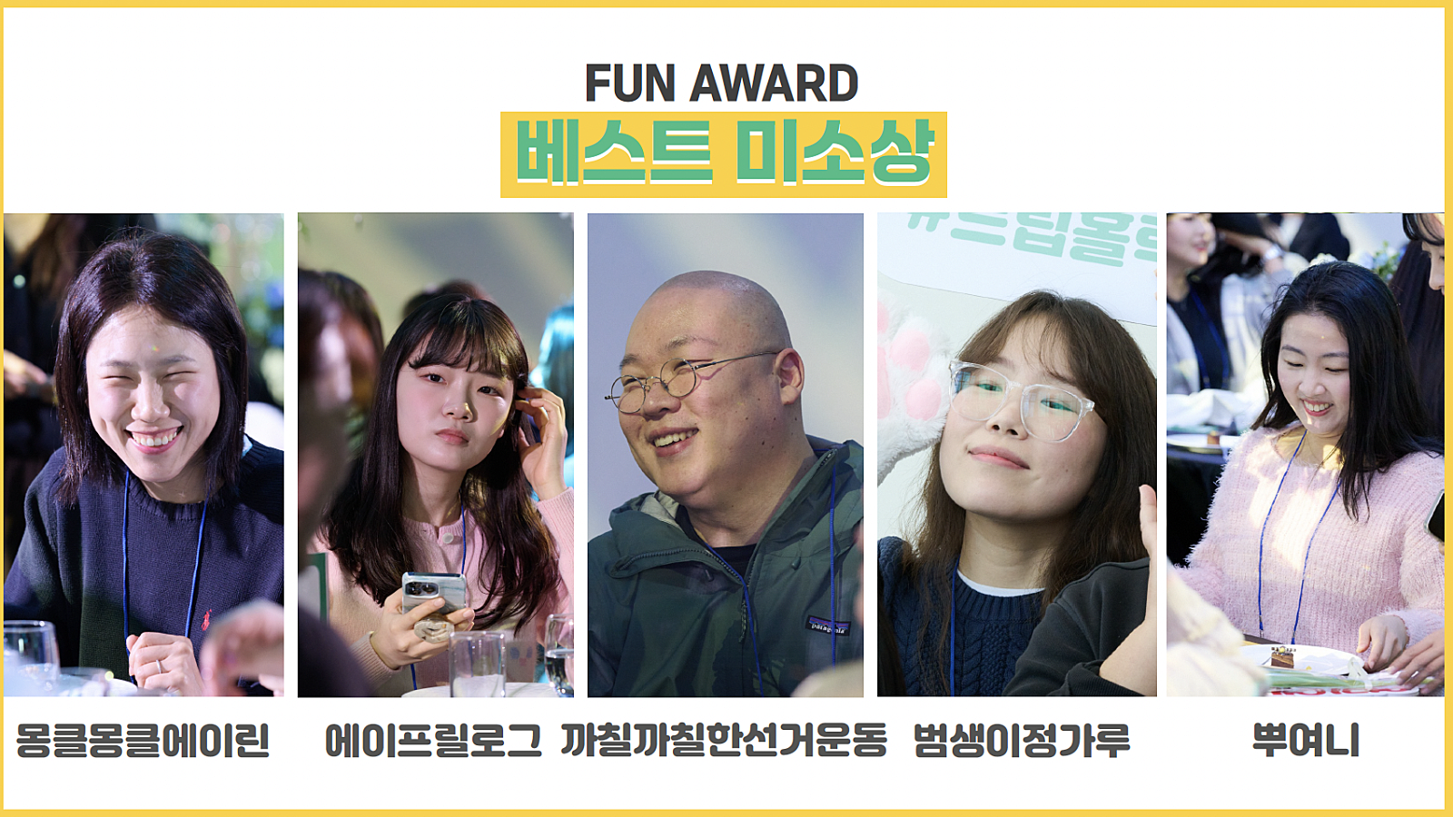 아무 생각 없이 앉아있었는데 베스트미소상에는 까칠까칠한선거운동원 닉네임을 사용하는 제가 되었습니다. 별 기대 없이 앉아있다가 갑자기 선물을 받으려니 너무 흥분되어 제가 받는 선물 사진도 못 찍었네요. 제가 받은 선물이 뭘까 궁금하시다면 다음 포스팅 여기어때 트립홀릭 5기 웰컴파티 - 4편을 기대해주세요.