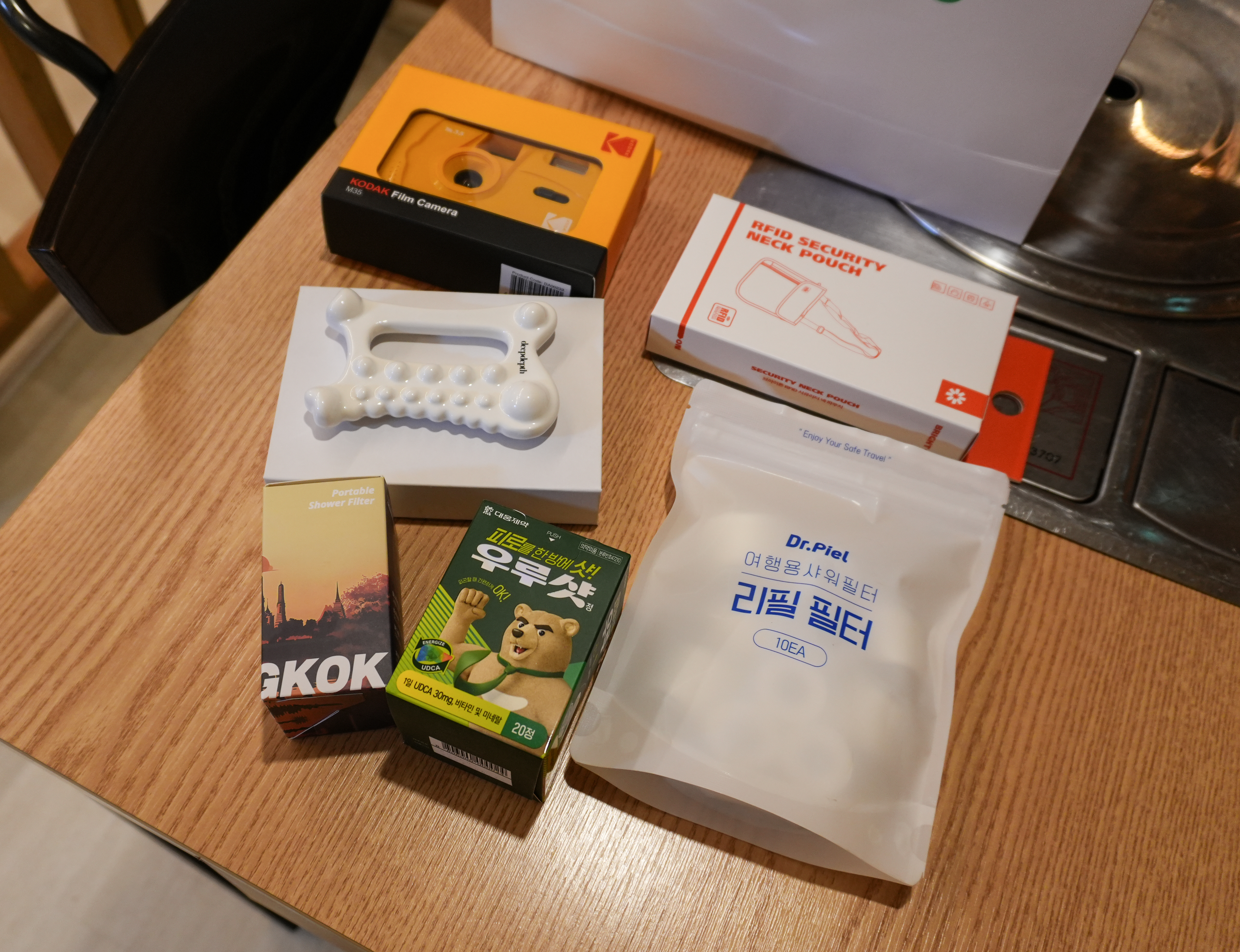 여기어때 트립홀릭 웰컴파티에서 저와 저희 팀 3조 ⎡3색체험단⎦이 받은 증정품은 위와 같습니다. 여기어때 트립홀릭 5기 웰컴파티 3편에서 소개해드렸던 내용처럼 1팀만 뽑았던 베스트팀워크상에 선정되어 코닥 다회용 필름카메라를 받았고, 베스트 미소상을 받은 제게 딥뎁스(DeepDepth)의 괄사 그리고 앞서 모두에게 주는 증정품인 닥터피엘의 여행용 샤워기 필터와 동국제약의 트레블 키트, 대웅제약의 우루샷, 브라이튼의 시큐리티 넥파우치까지 여행에 필요한 구성품으로 잘 받았습니다.