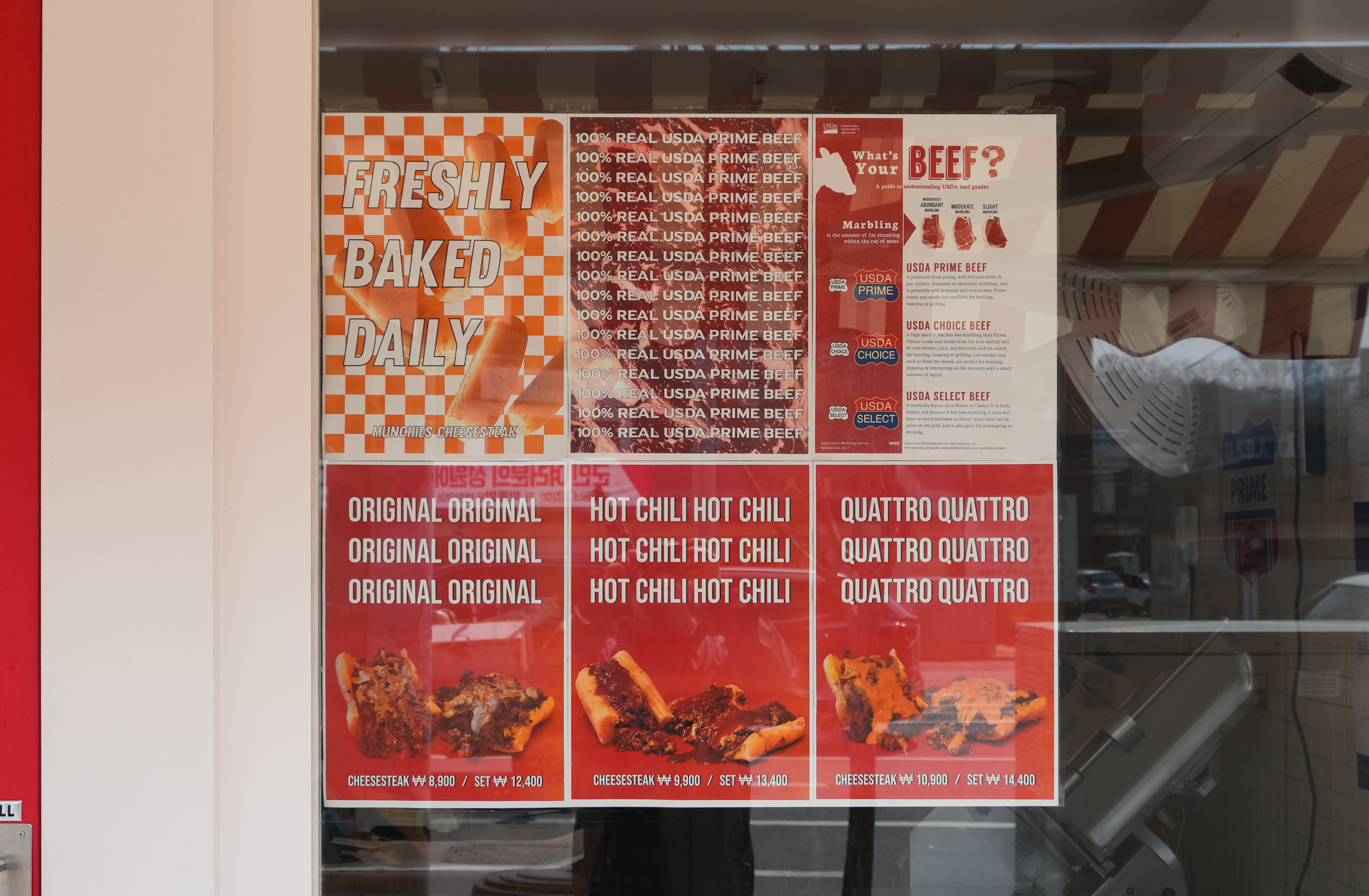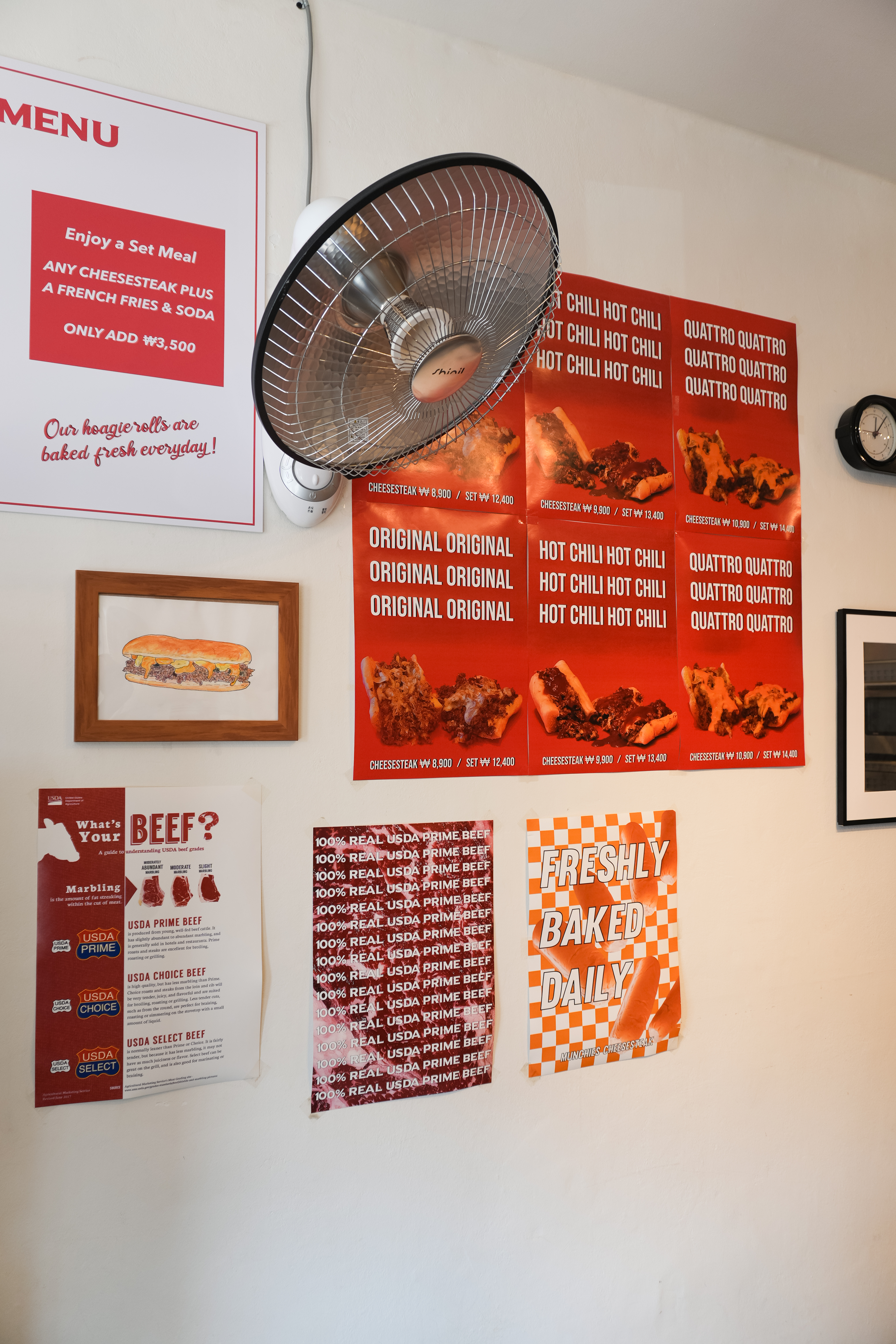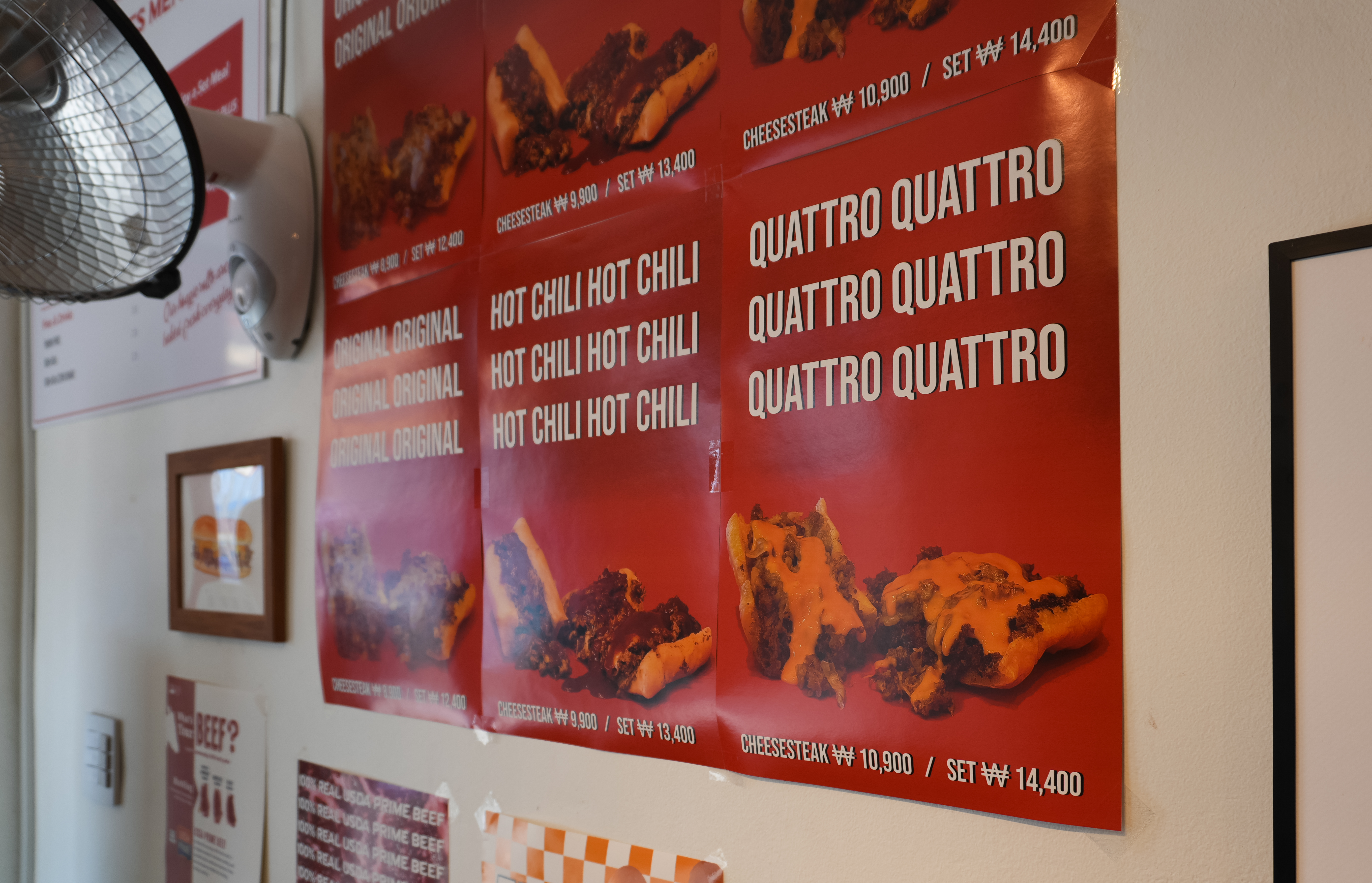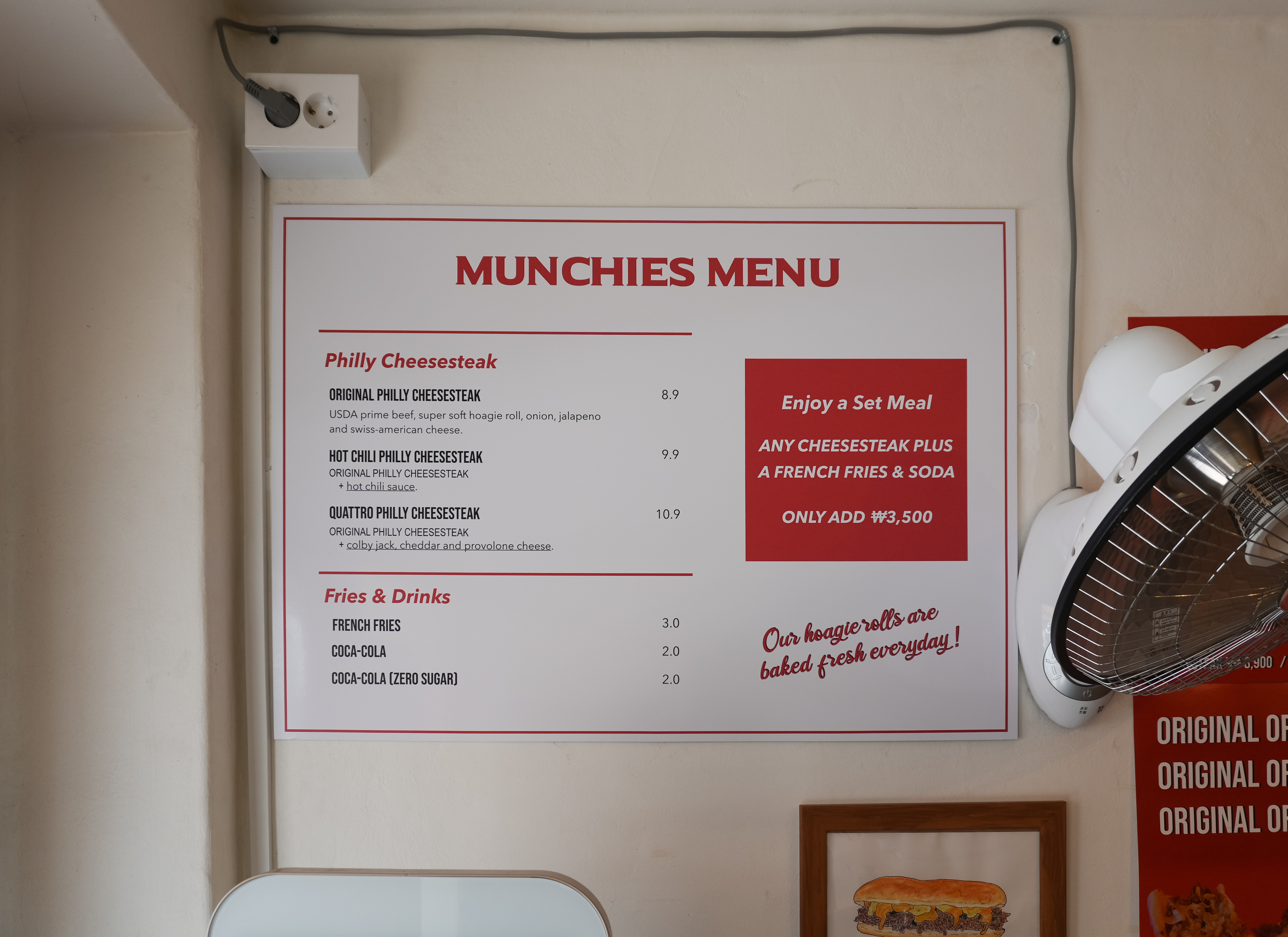 이곳의 메뉴는 필리치즈스테이크와 프라이즈로 구성되어 있었는데, 오리지널필리치즈스테이크, 핫칠리필리치즈스테이크, 콰트로필리치즈스테이크가 있었고, 프렌치프라이즈와 음료가 있었습니다. 저는 오리지널필리치즈스테이크 3개와 프라이즈 1개를 주문했습니다.