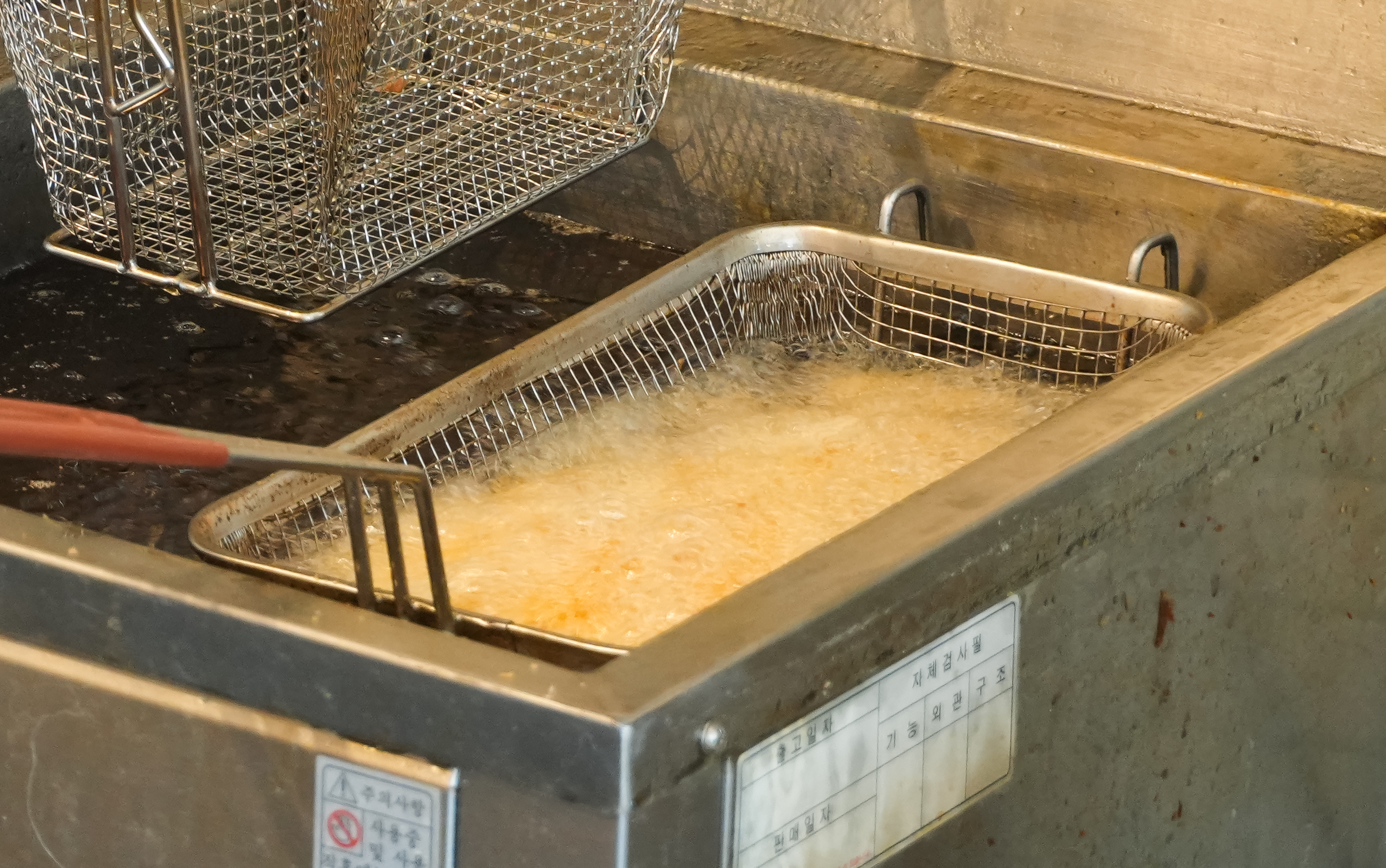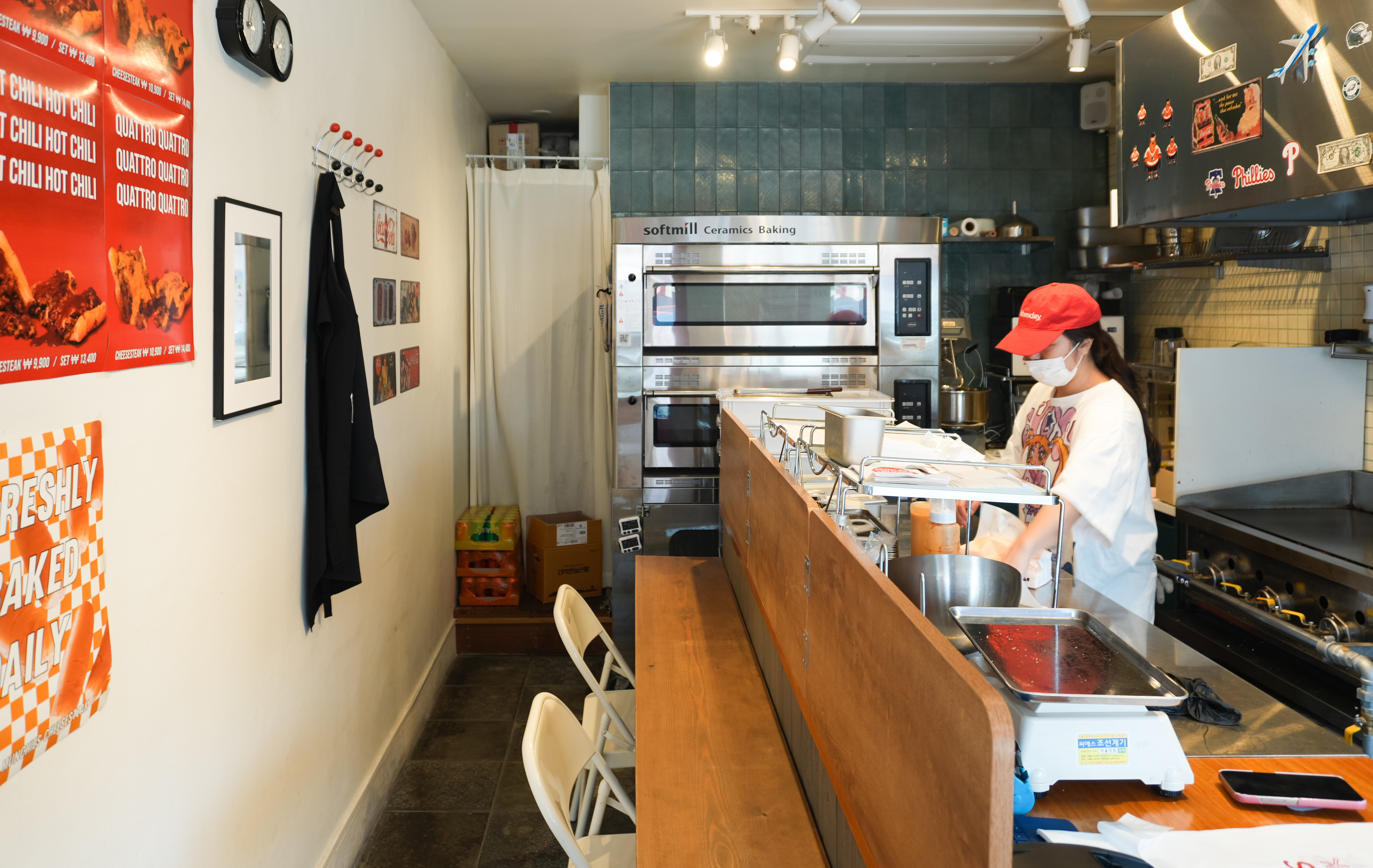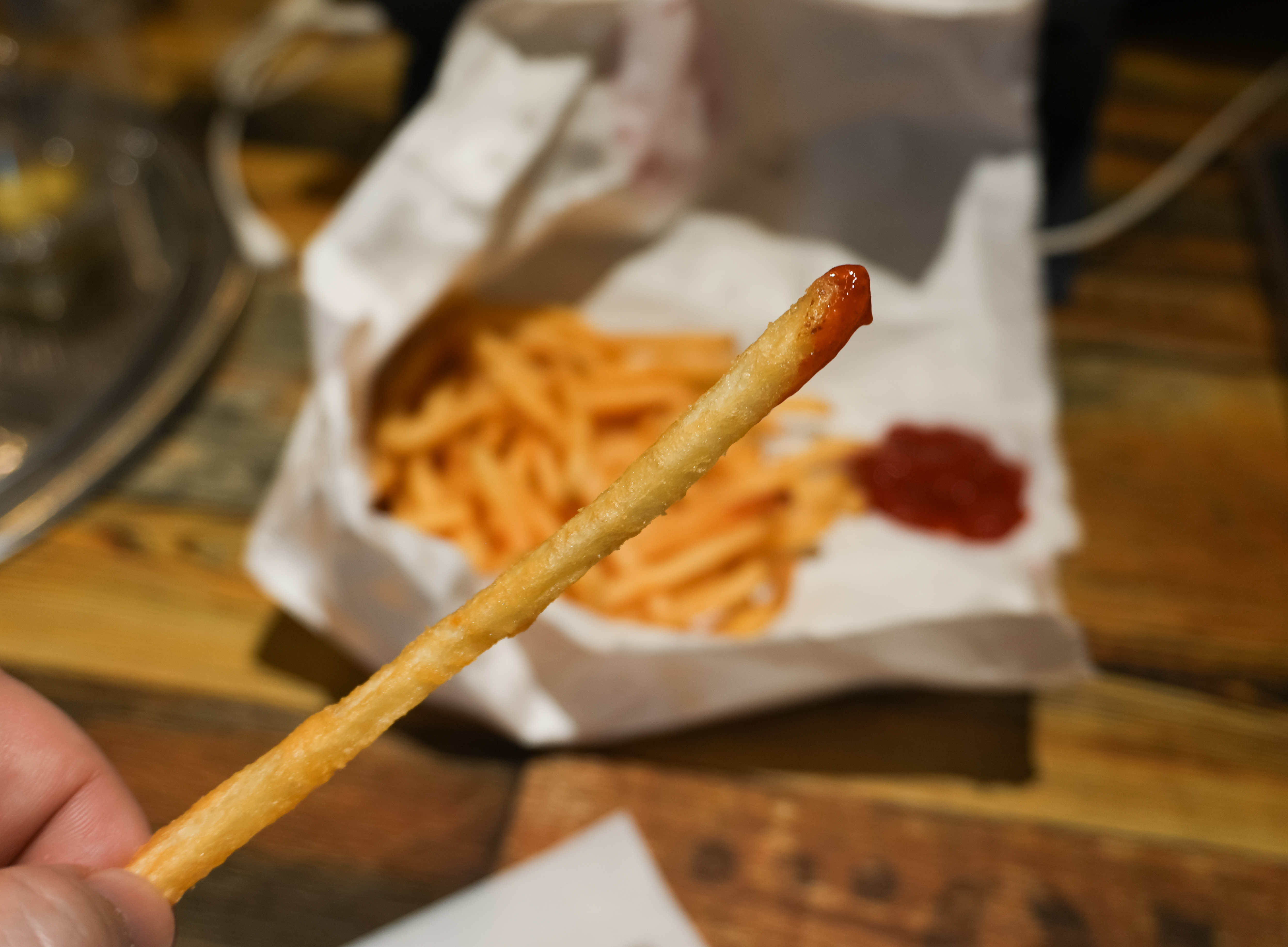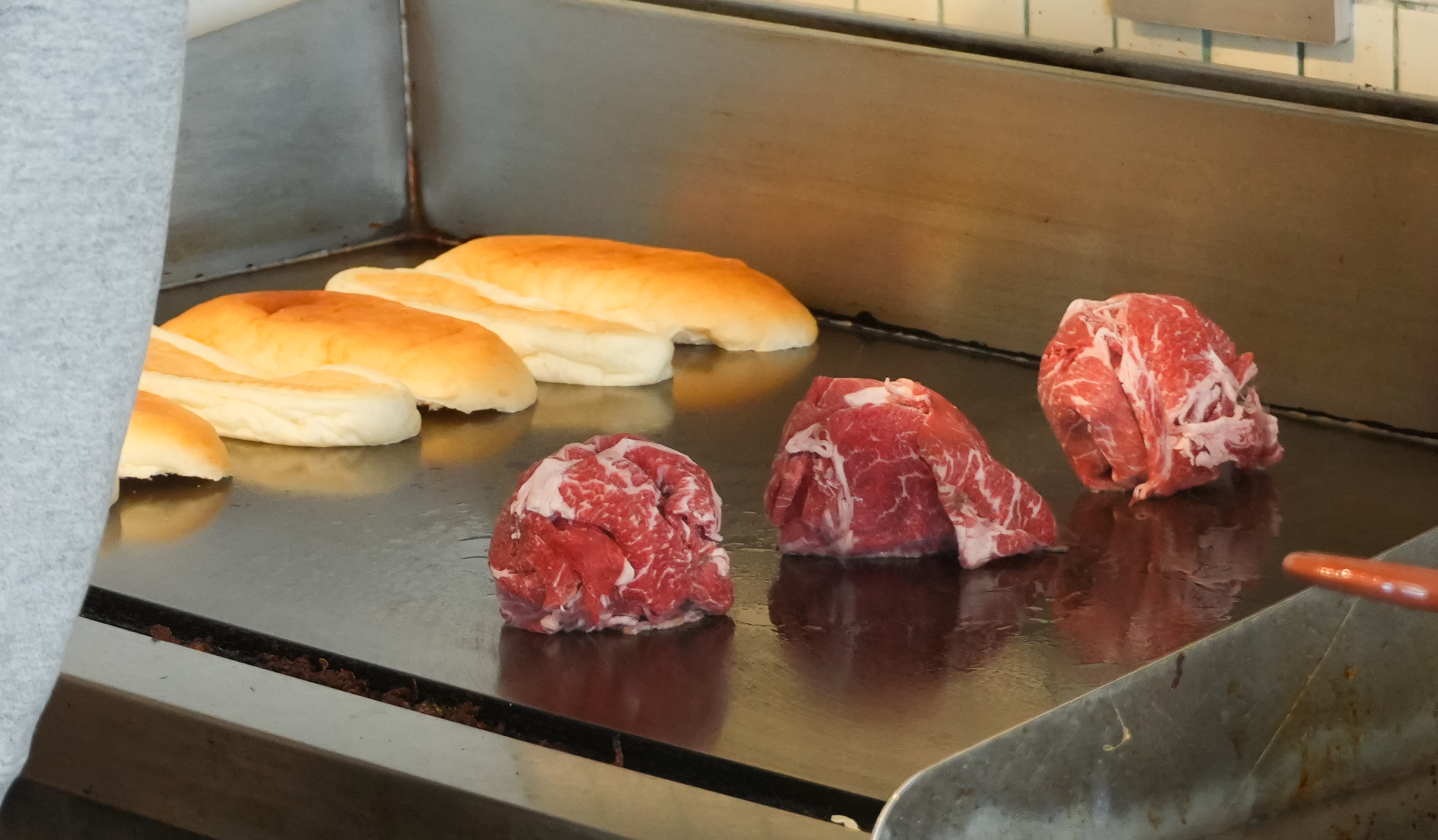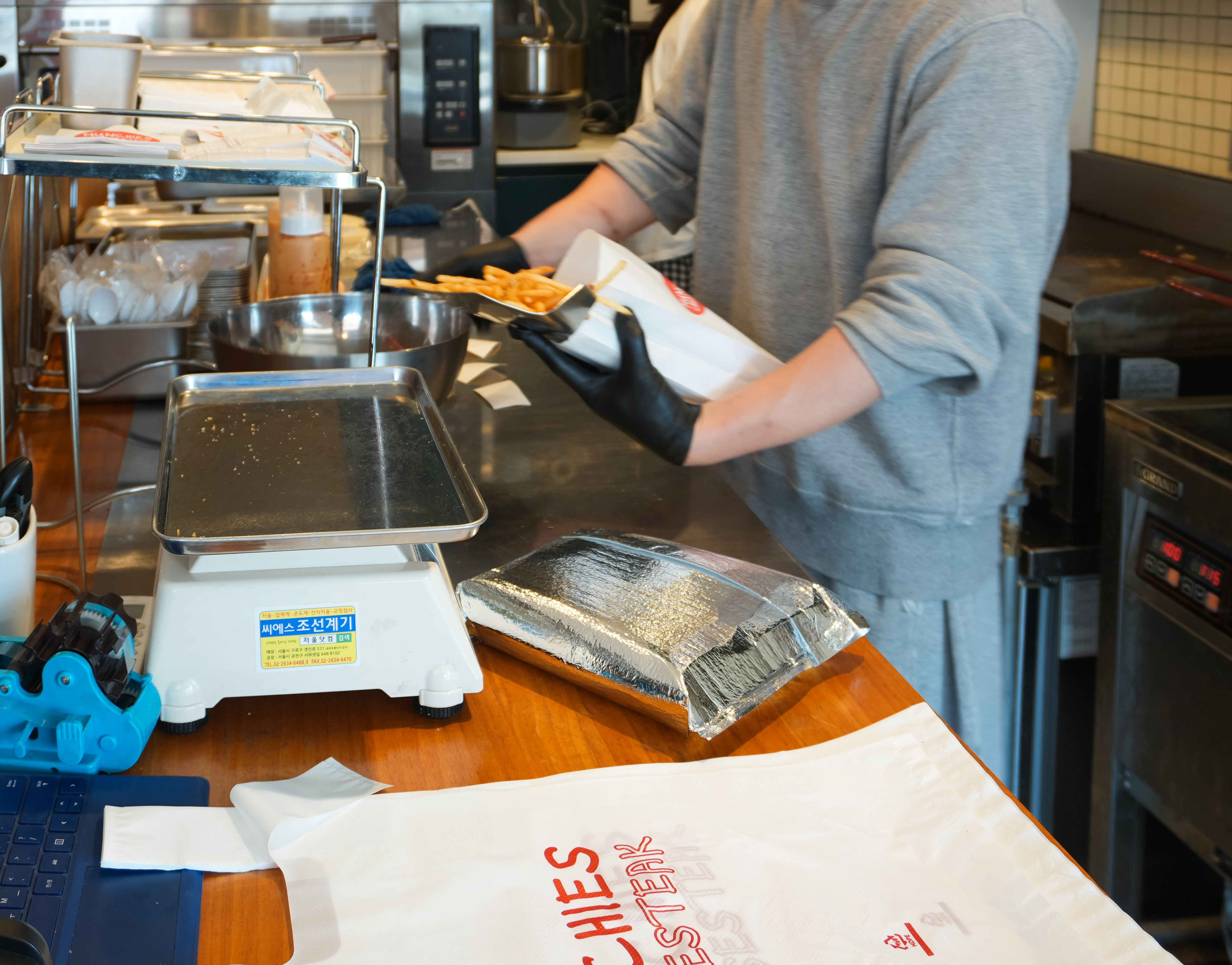 오픈키친이라 주문한 필리치즈스테이크의 조리과정을 눈으로 볼 수 있었는데, 조리대도 깔끔하게 잘 관리되어 있고 재료들도 신선하게 잘 보관되어 있어서 더 신뢰가 가더라고요. 감자튀김 조리과정도 한눈에 볼 수 있었습니다.