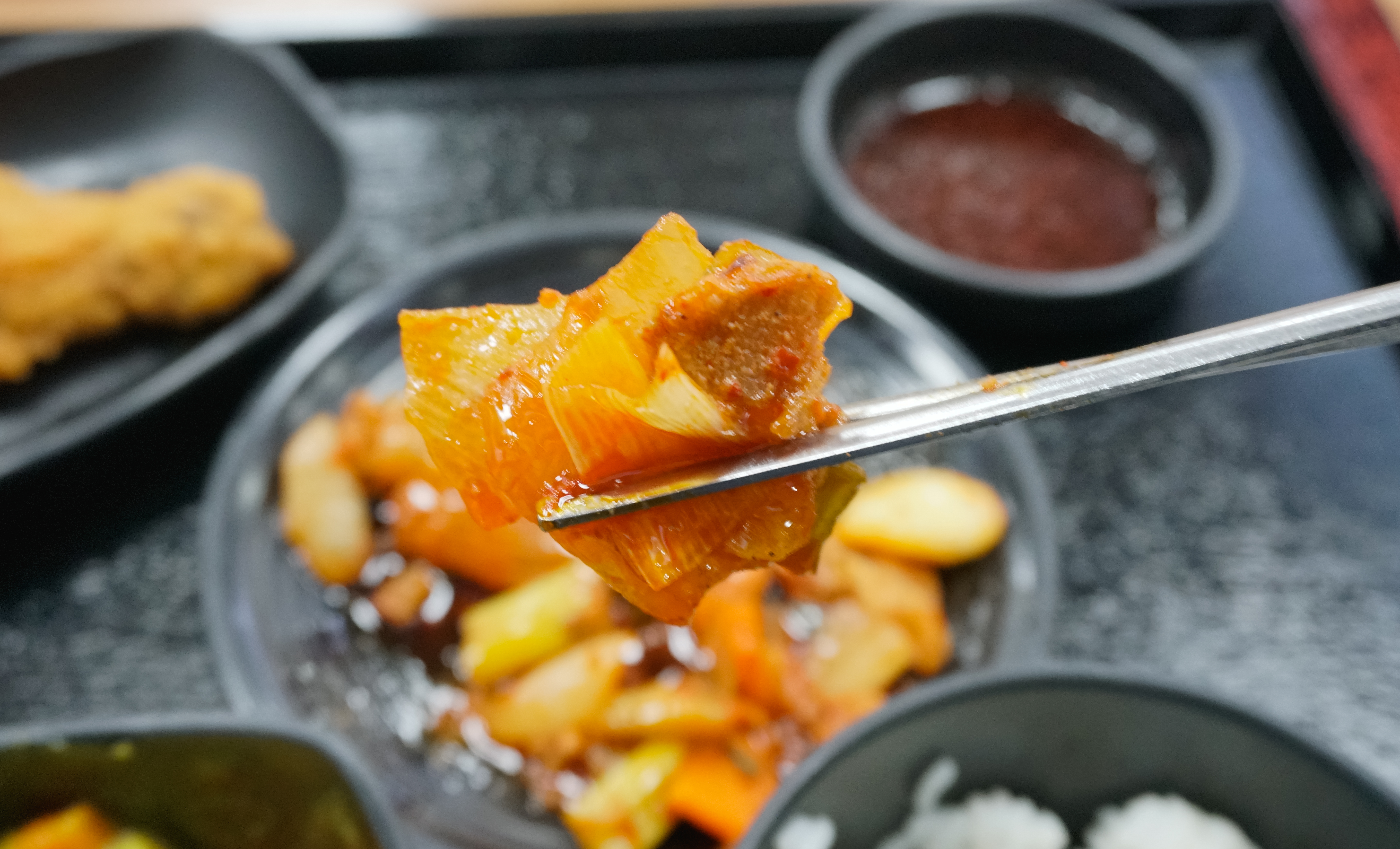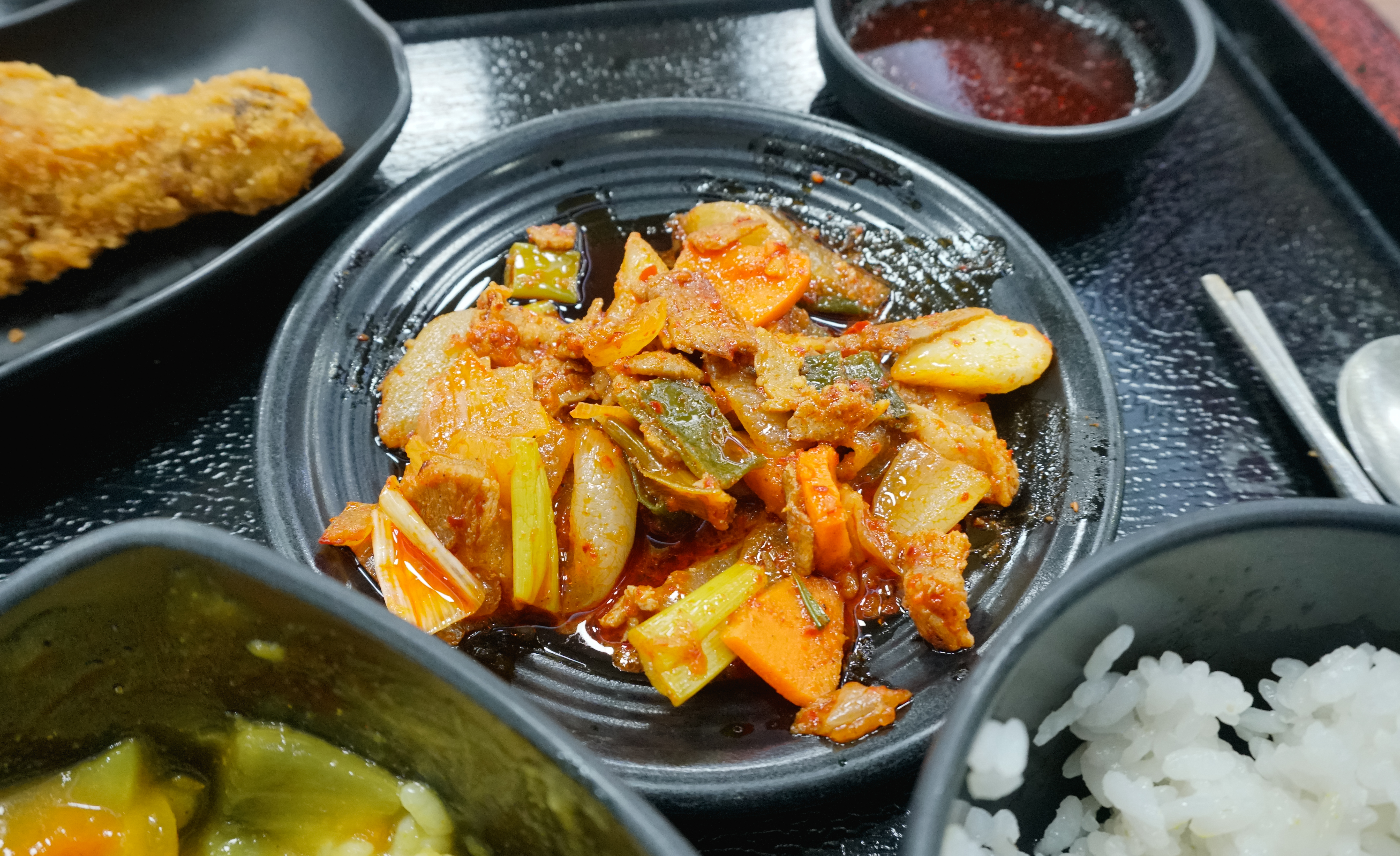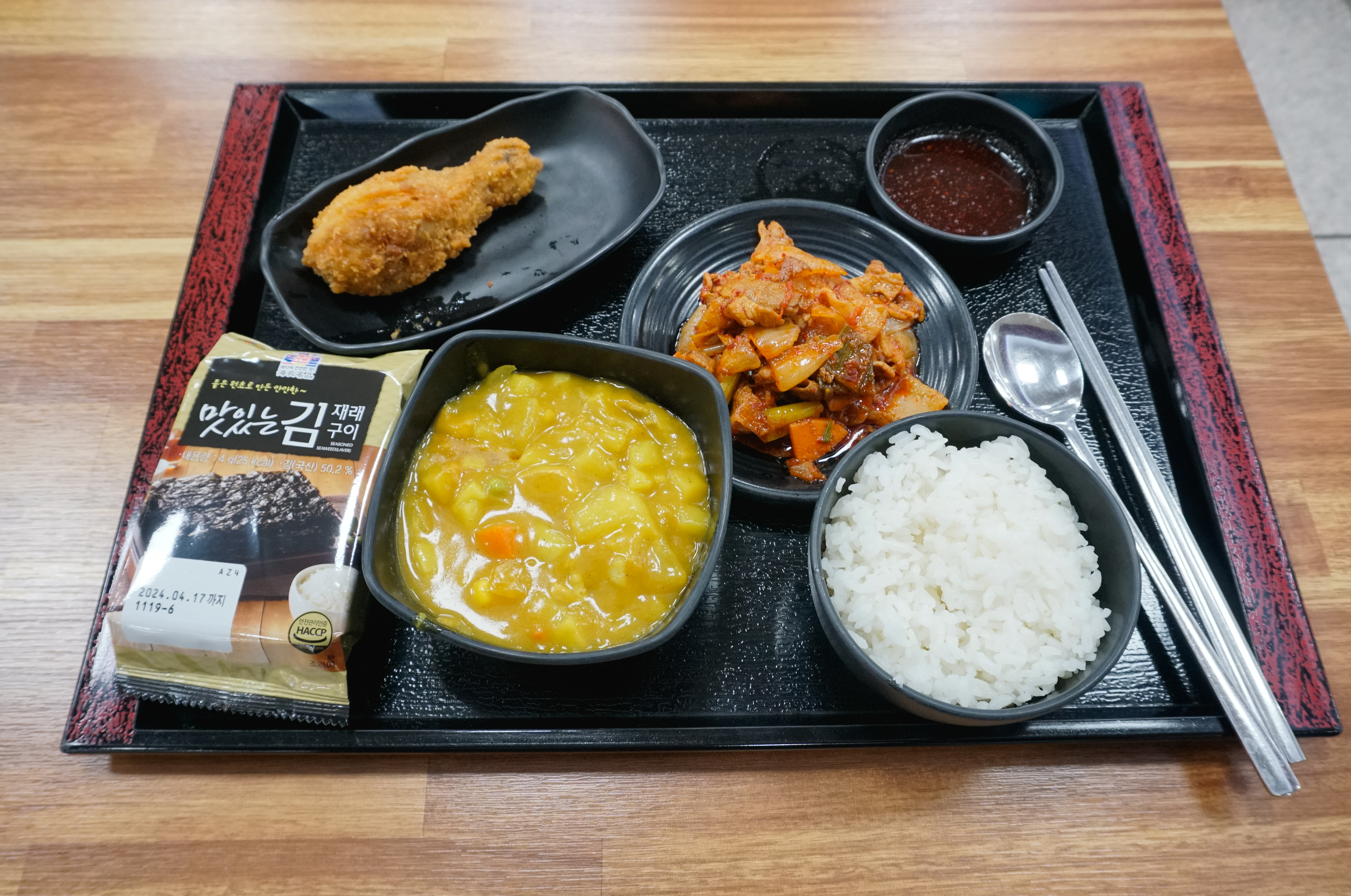 점심은 이렇게 골라봤습니다. 카레와 밥, 닭다리튀김, 돼지고기두루치기, 김. 가격대는 고르는 것에 따라 다르지만 닭다리튀김 3,000원, 돼지고기두루치기 4,000원으로 살짝 비싼 감은 있었습니다.