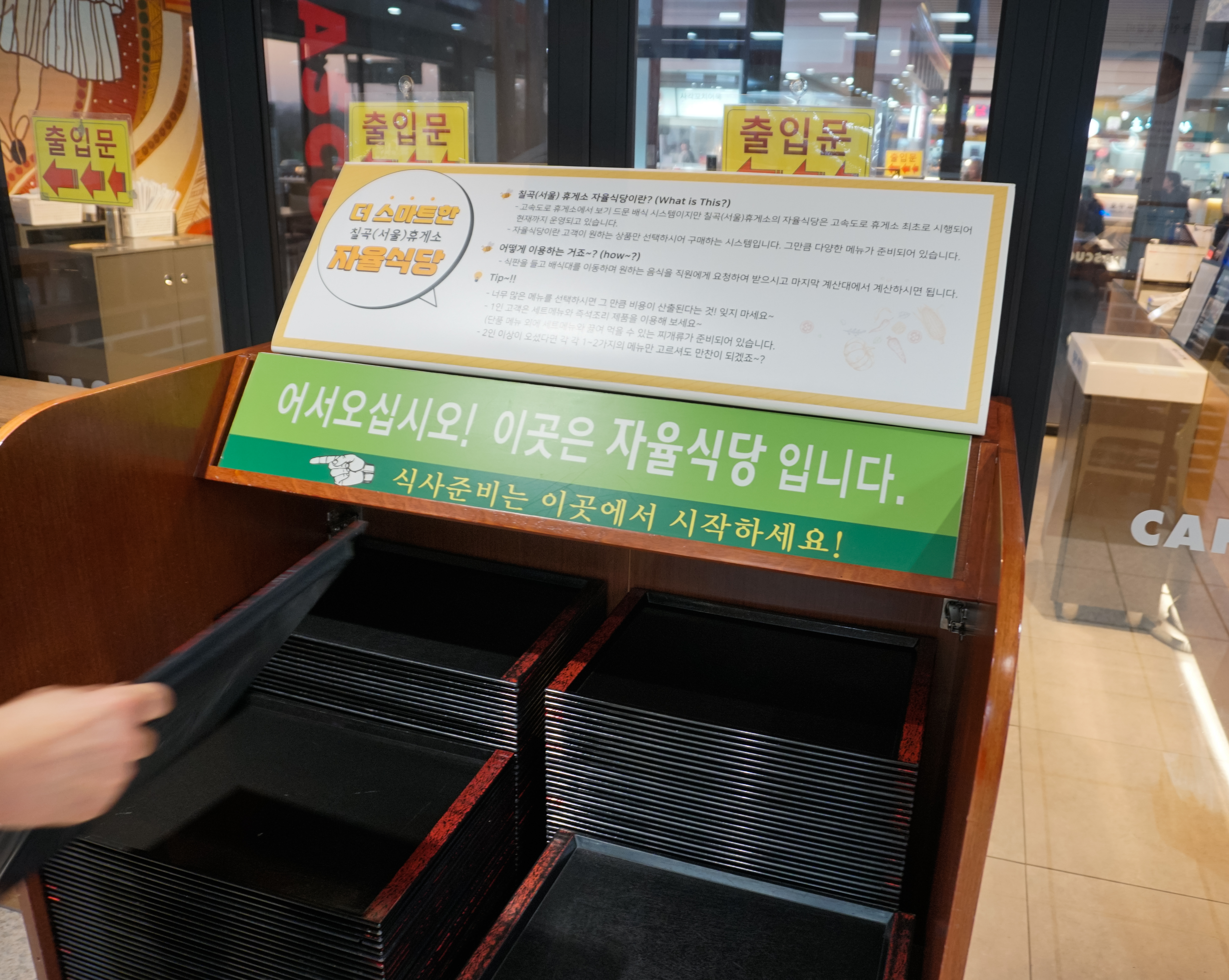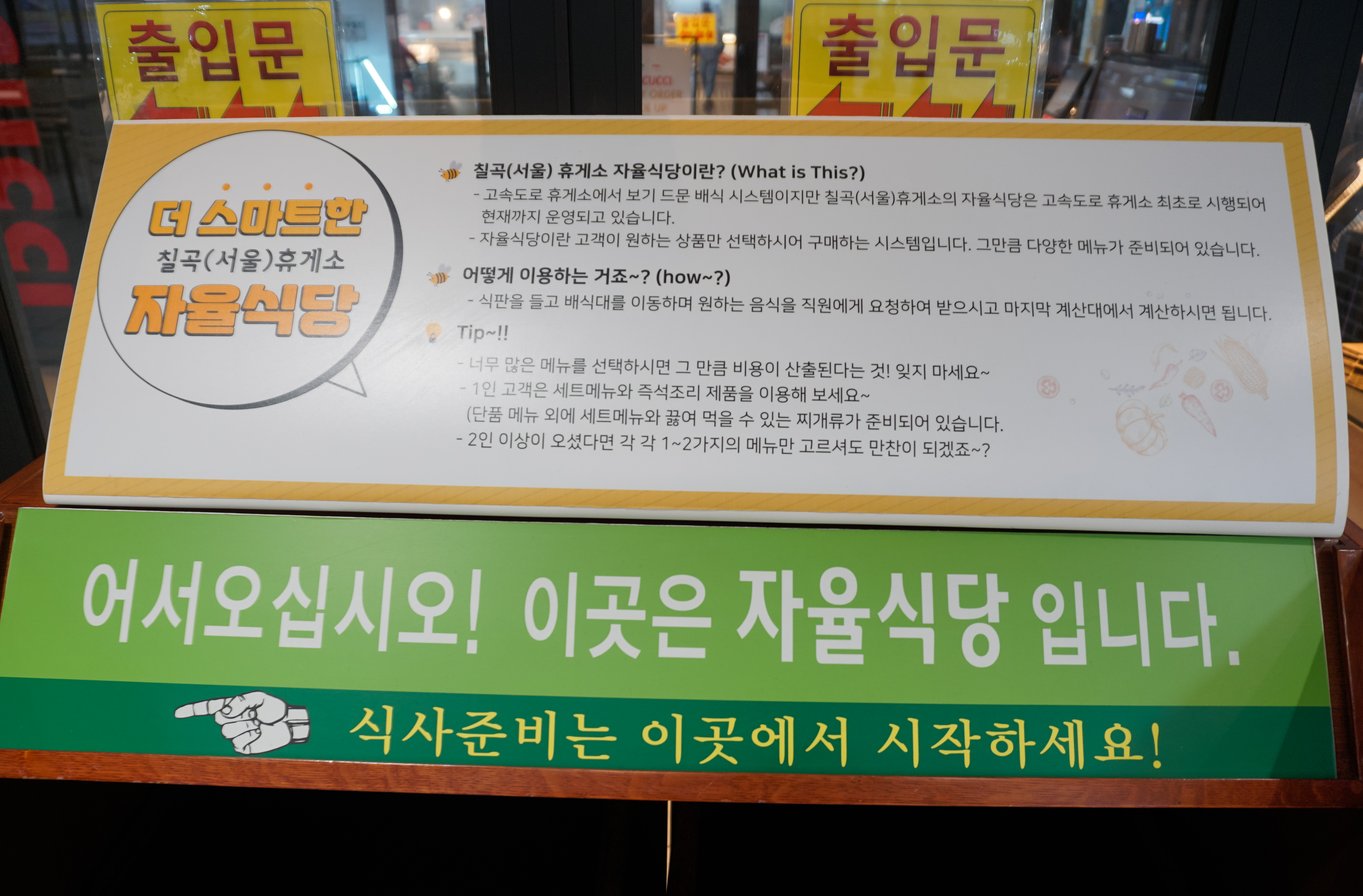 칠곡휴게소 자율식당의 입구는 이렇게 생겼습니다. 다른 휴게소는 특정 메뉴들을 미리 주문하고 번호표를 교환하는 형태로 메뉴를 받는데, 여기는 특이하게 식판을 미리 준비하고 메뉴를 담는 형태로 되어있었습니다.