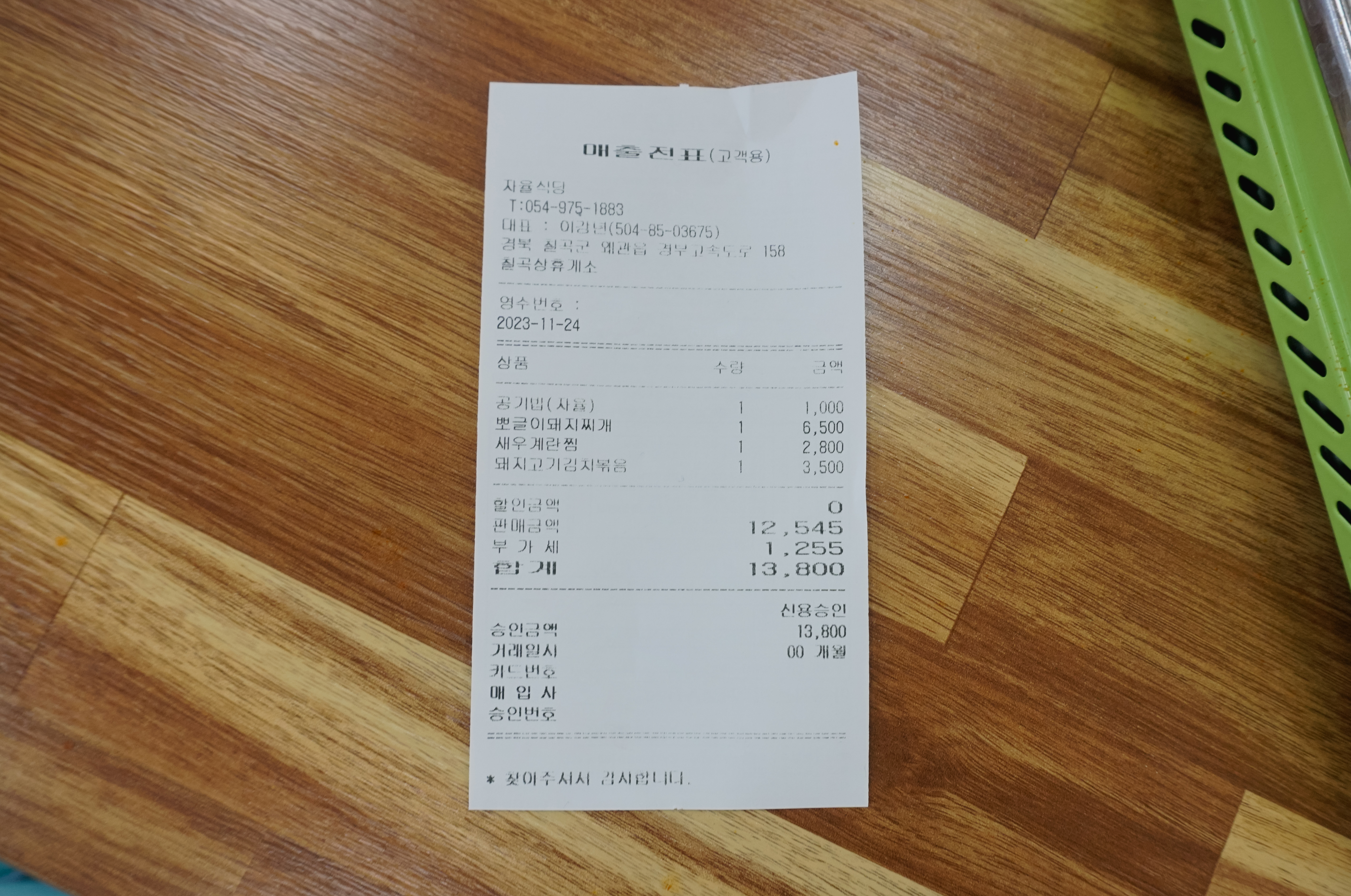 제가 이용한 식당이 있는 칠곡휴게소는 경북 칠곡군 왜관읍 경부고속도로 158, 1층이며, 자율식당은 칠곡휴게소 서울방향, 부산방향 모두 있는 것 같습니다. 제가 이용한 날은 2023.11.23. 입니다.