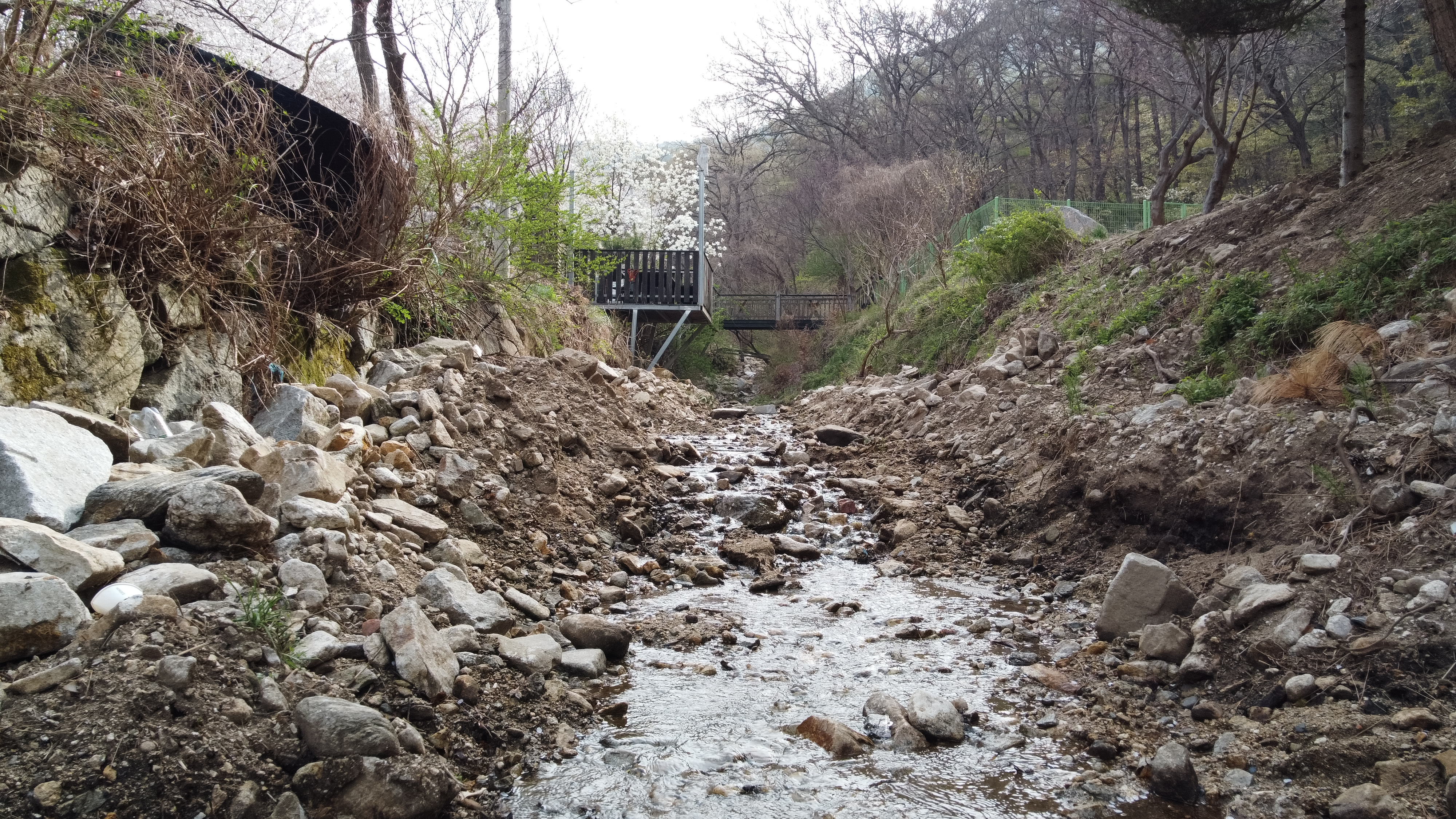 며칠새 비가 많이 왔는지 찜질방 주차장 옆으로 난 계곡에 유량이 많지는 않지만, 맑은 물이 내려오는 소리가 들리더라고요. 나무로 이어진 다리는 폐쇄되었는데, 주차장 아래쪽으로 가보니 흙으로 된 다리가 있어서 그쪽에서 보니깐 계곡물 흐르는 게 잘 보이더라고요.