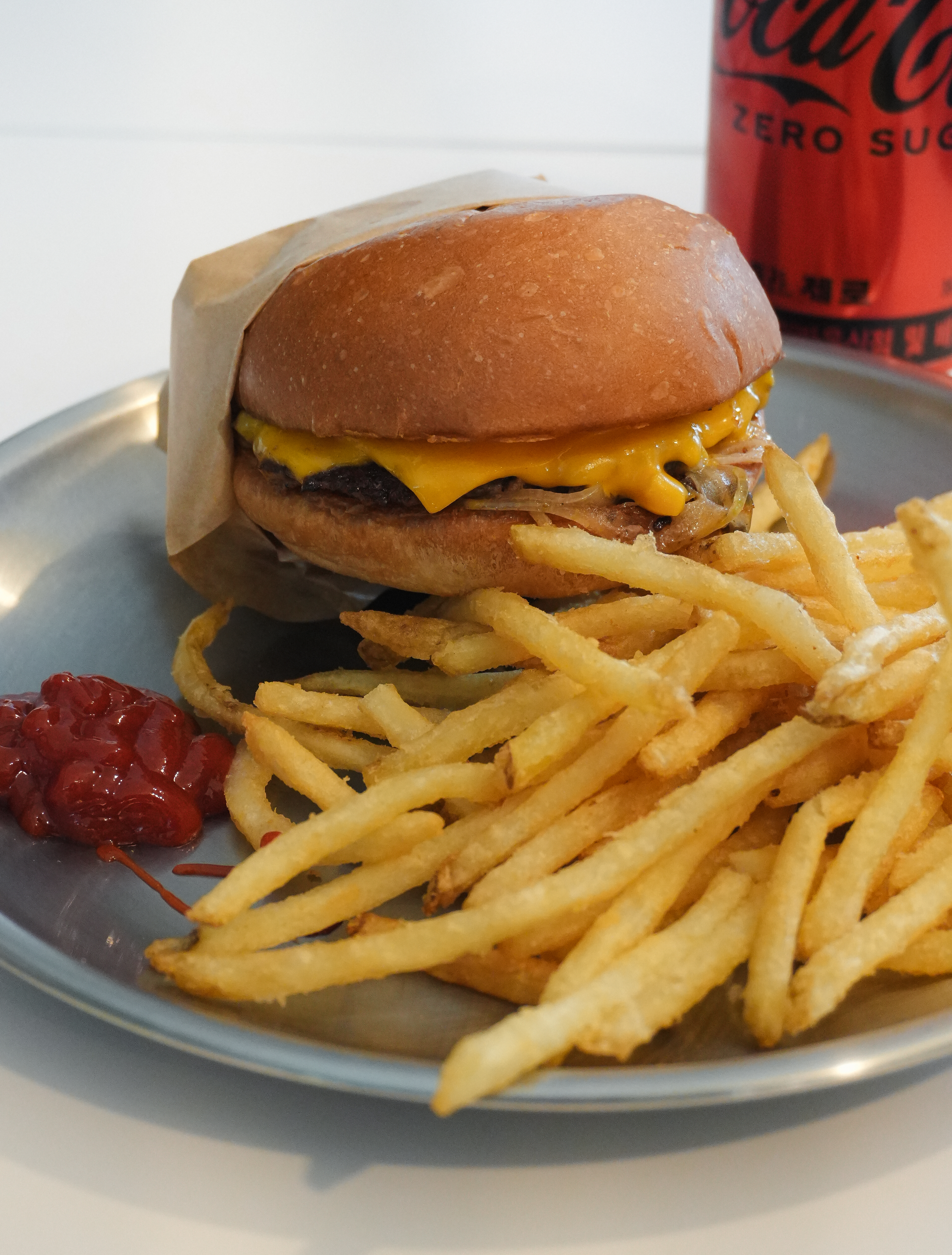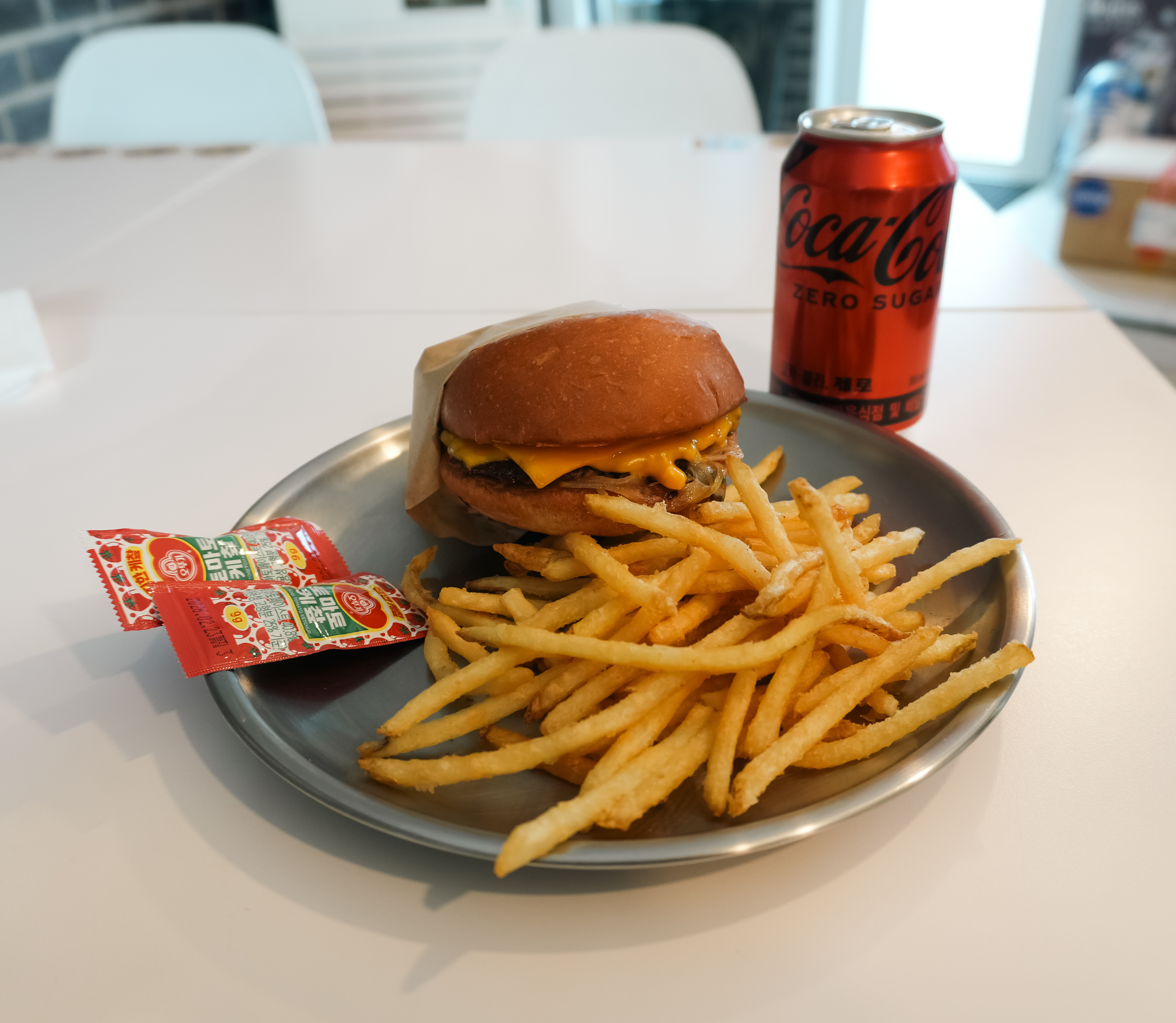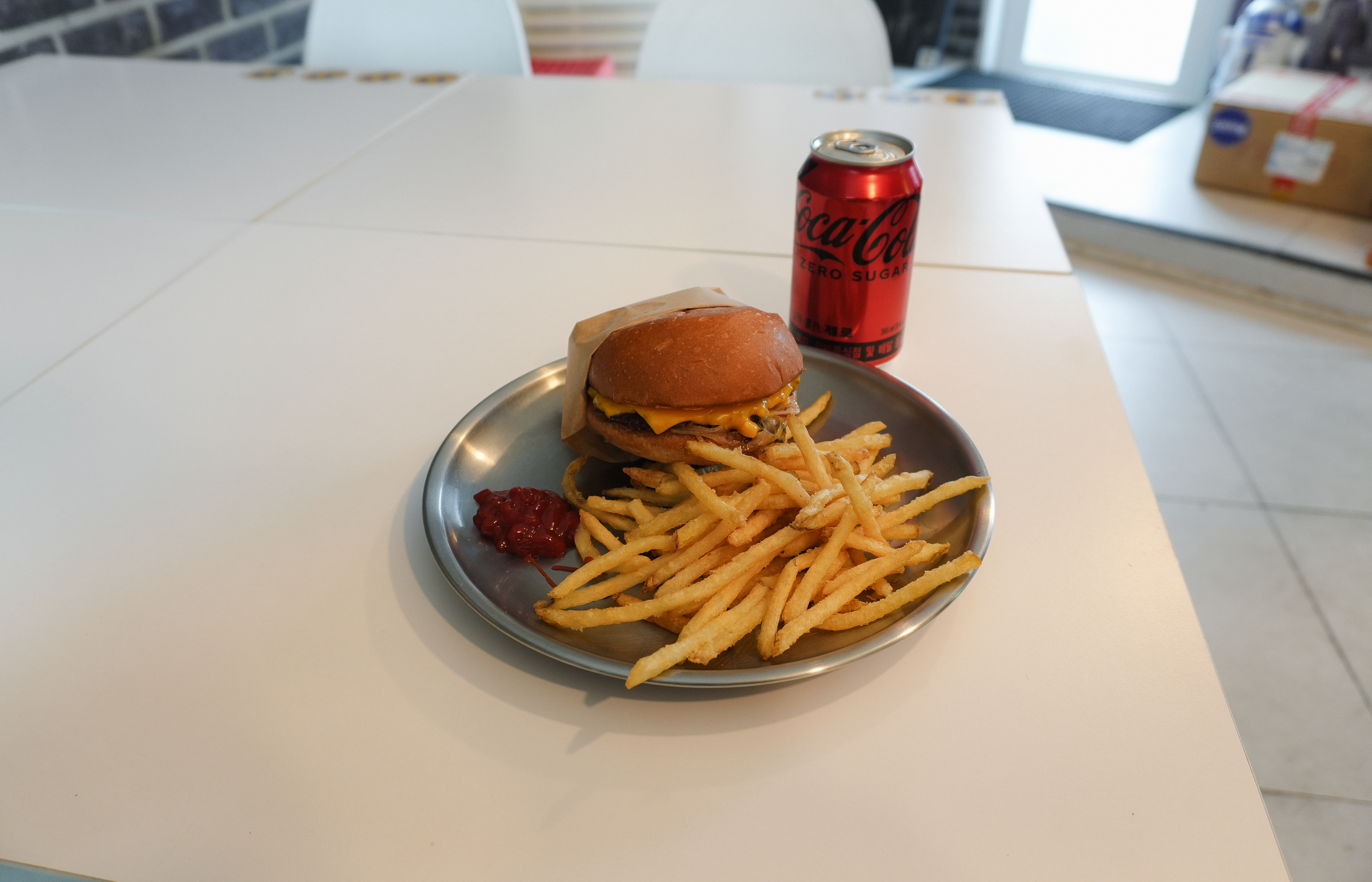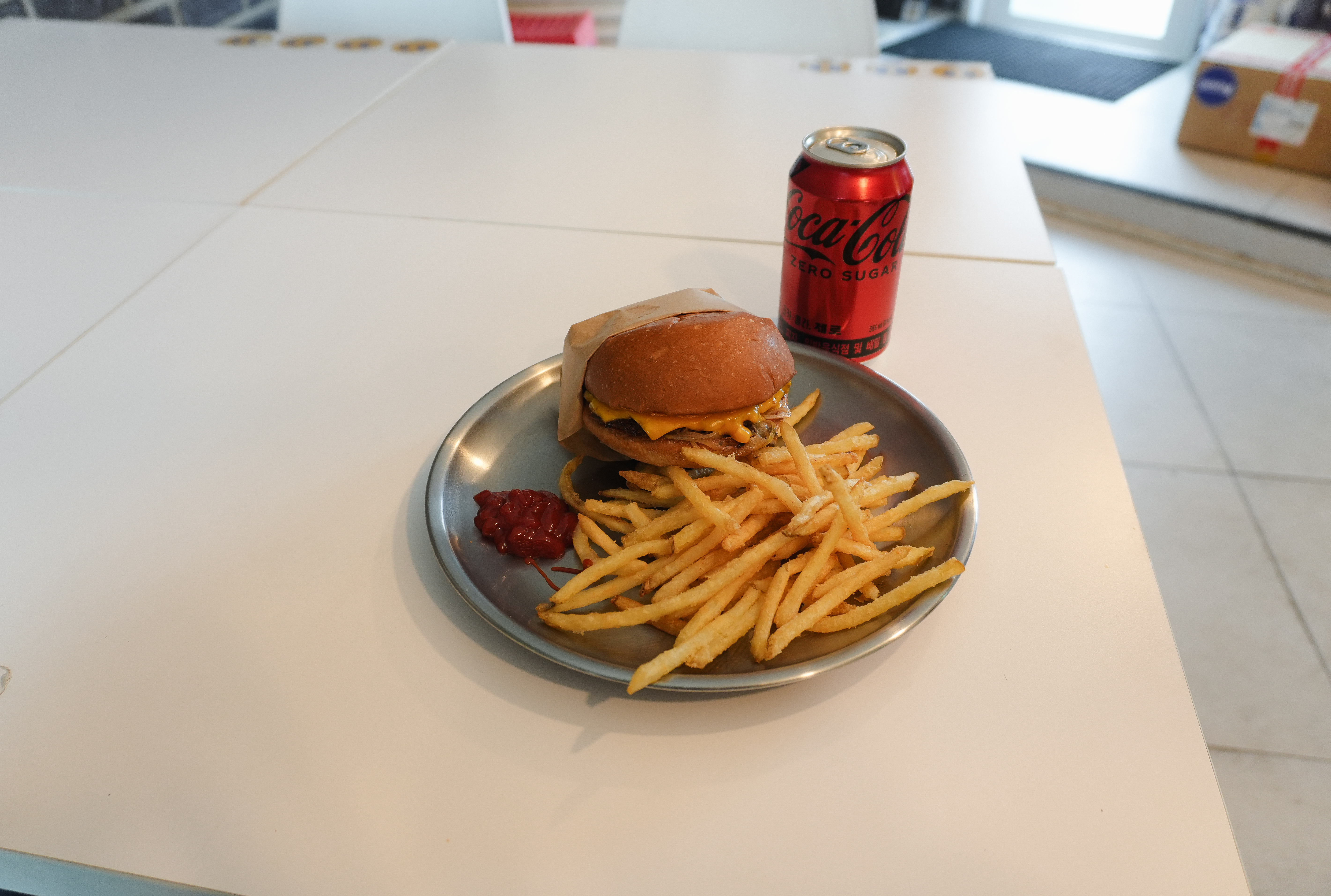 곧이어 강화 블루스버거스의 클래식 치즈버거 세트가 나왔습니다. 클래식 치즈버거 세트에는 감자튀김과 음료가 세트로 구성되어 있었는데, 저는 제로콜라와 함께 주문해서 먹었습니다.