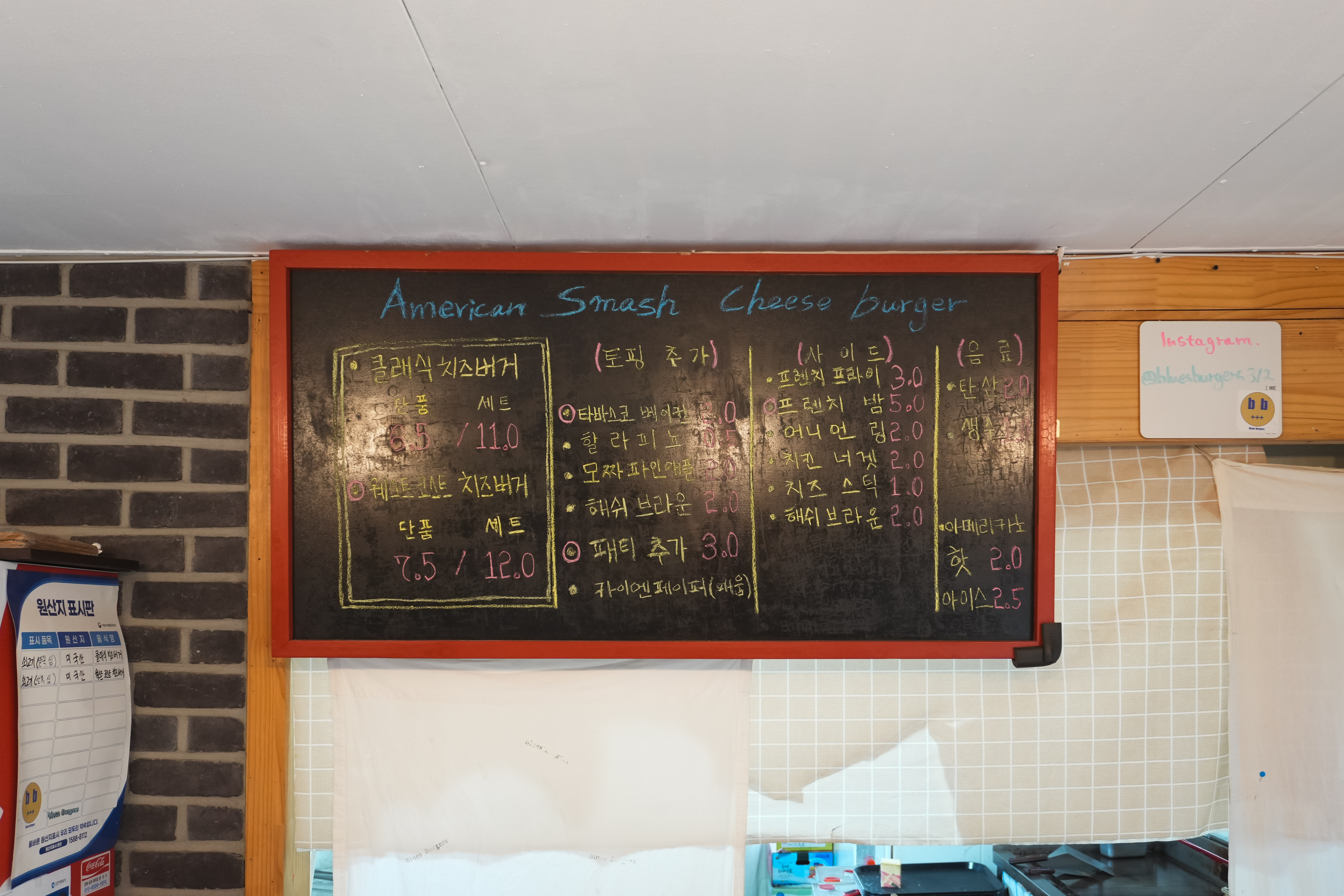 강화 블루스 버거스 가게 안으로 들어가면, 가게에서 판매하는 햄버거에 대한 특징을 게시하고 있었는데, 와인숙성과 7가지 특제 시즈닝으로 맛을 낸 100% 소목심 치즈 패티를 사용하고. 또, 스메쉬 버거는 '패티를 얇게 눌러 육즙을 다소 포기하고, 고기 맛을 극대화 한 버거' 라고 합니다.