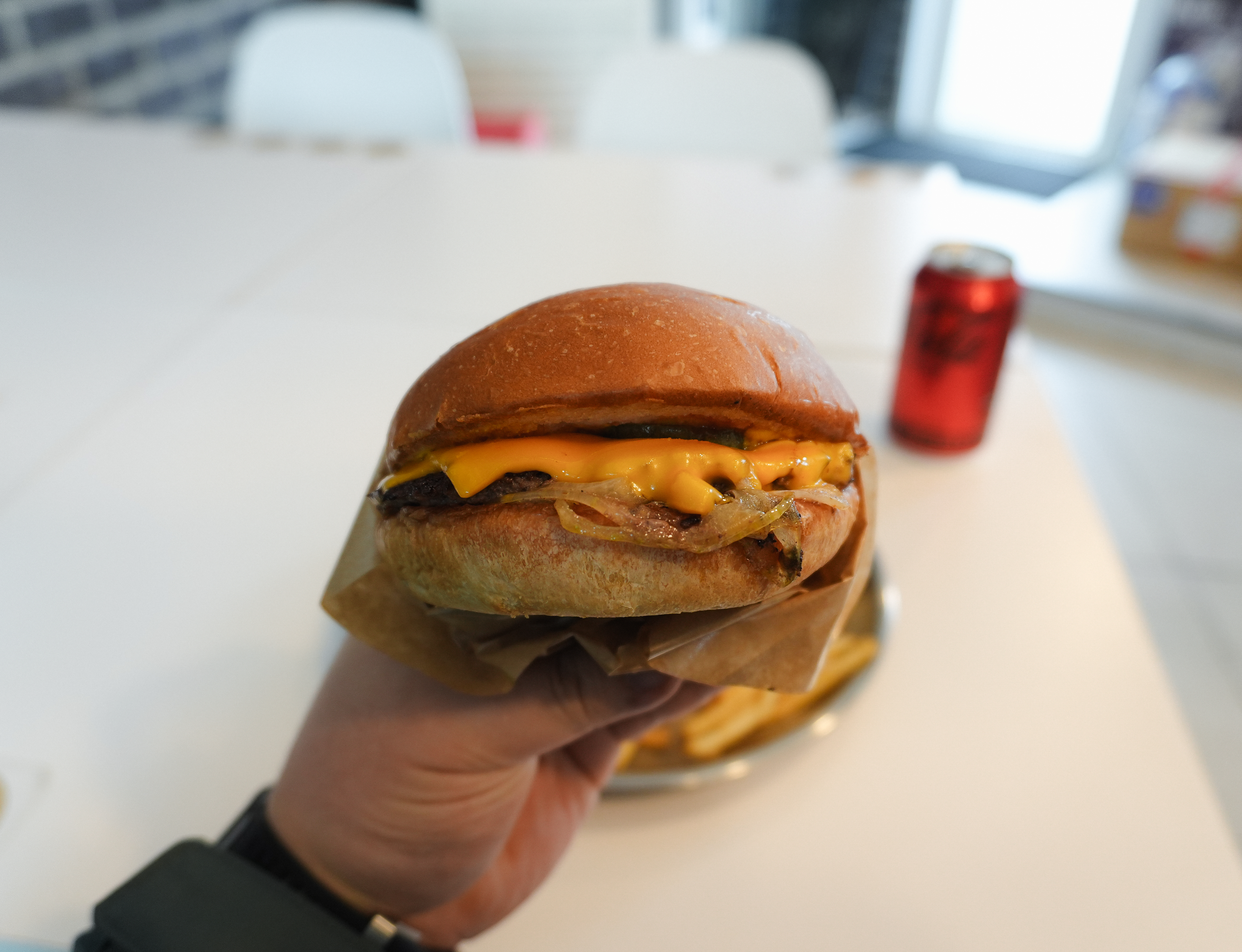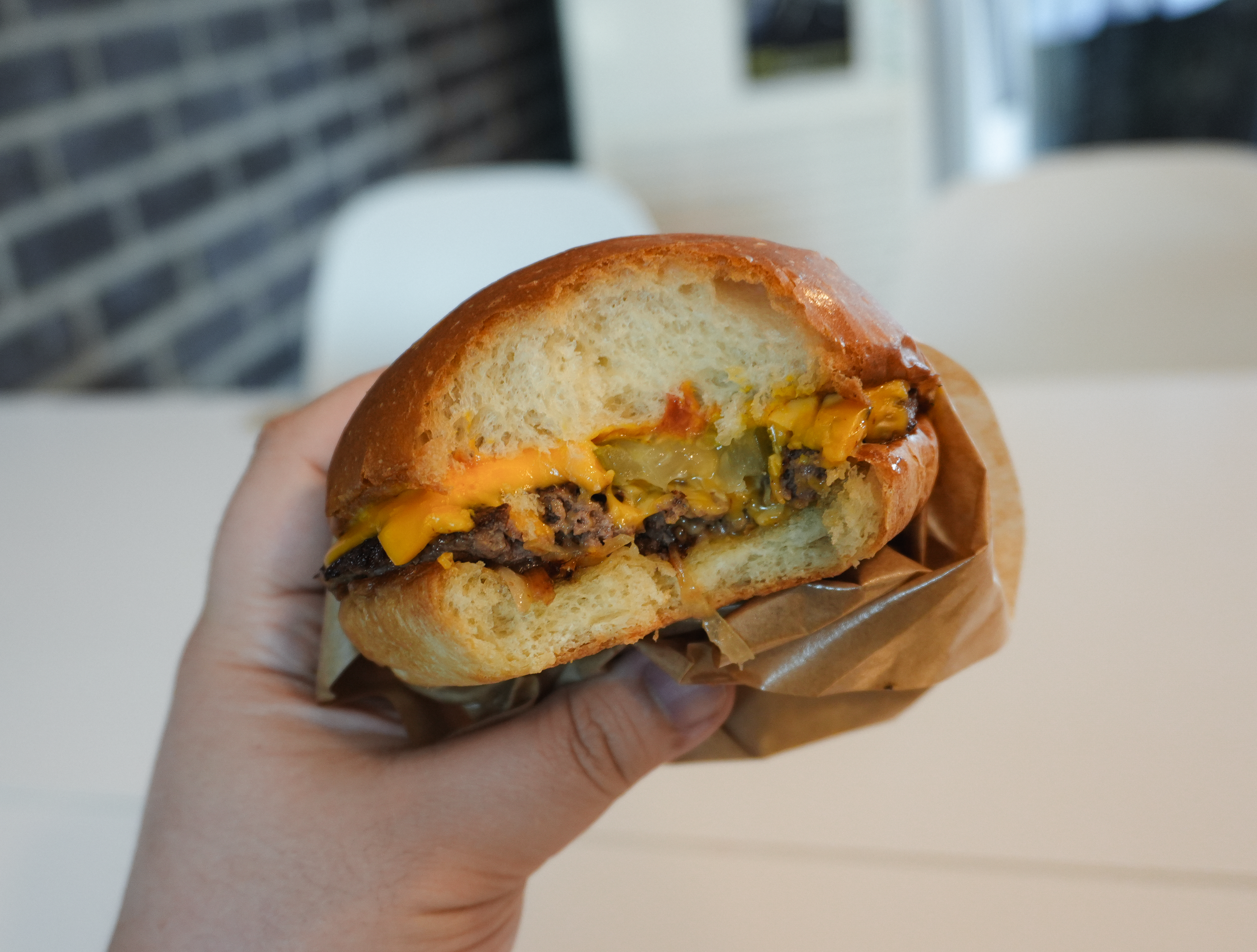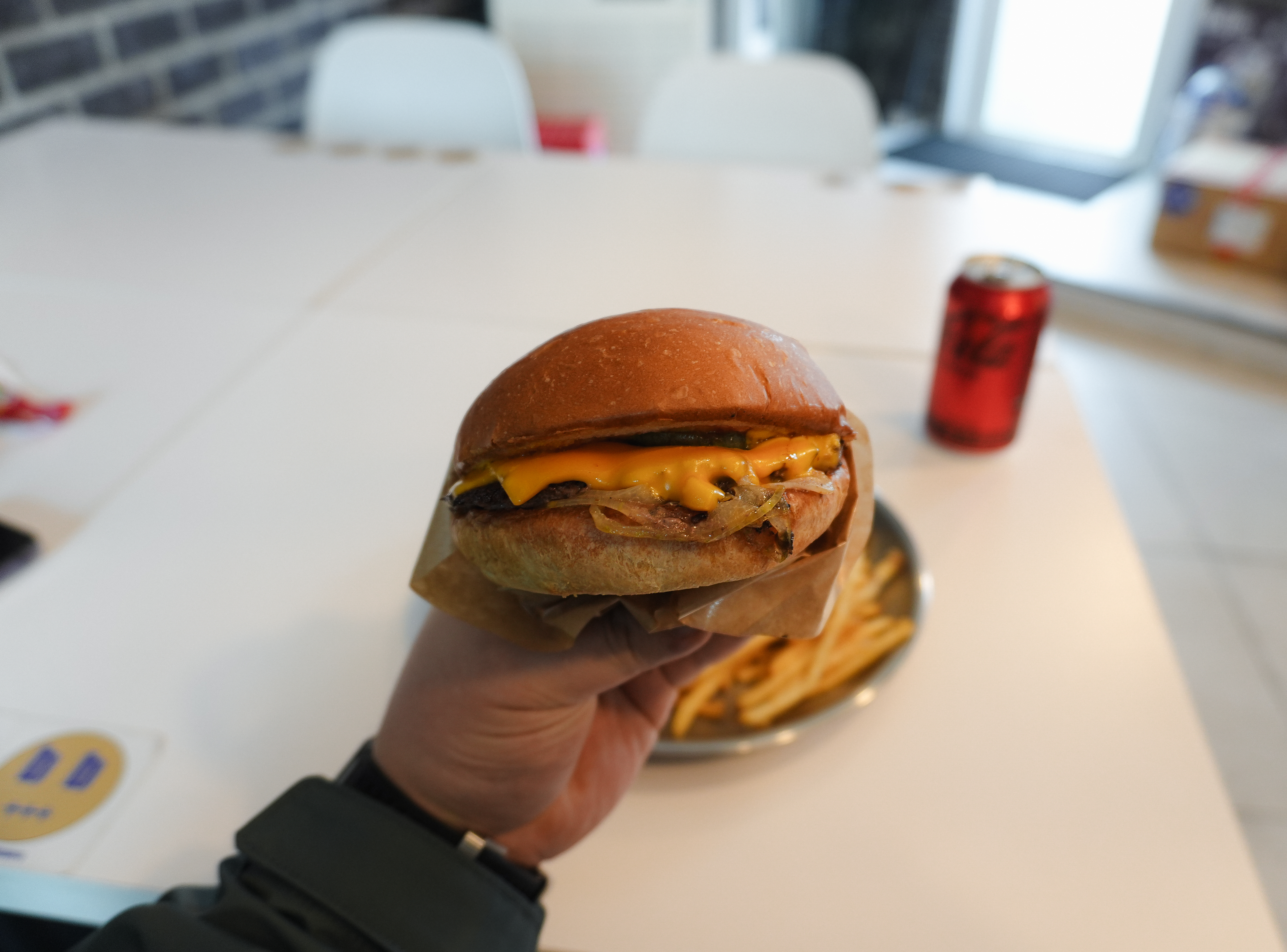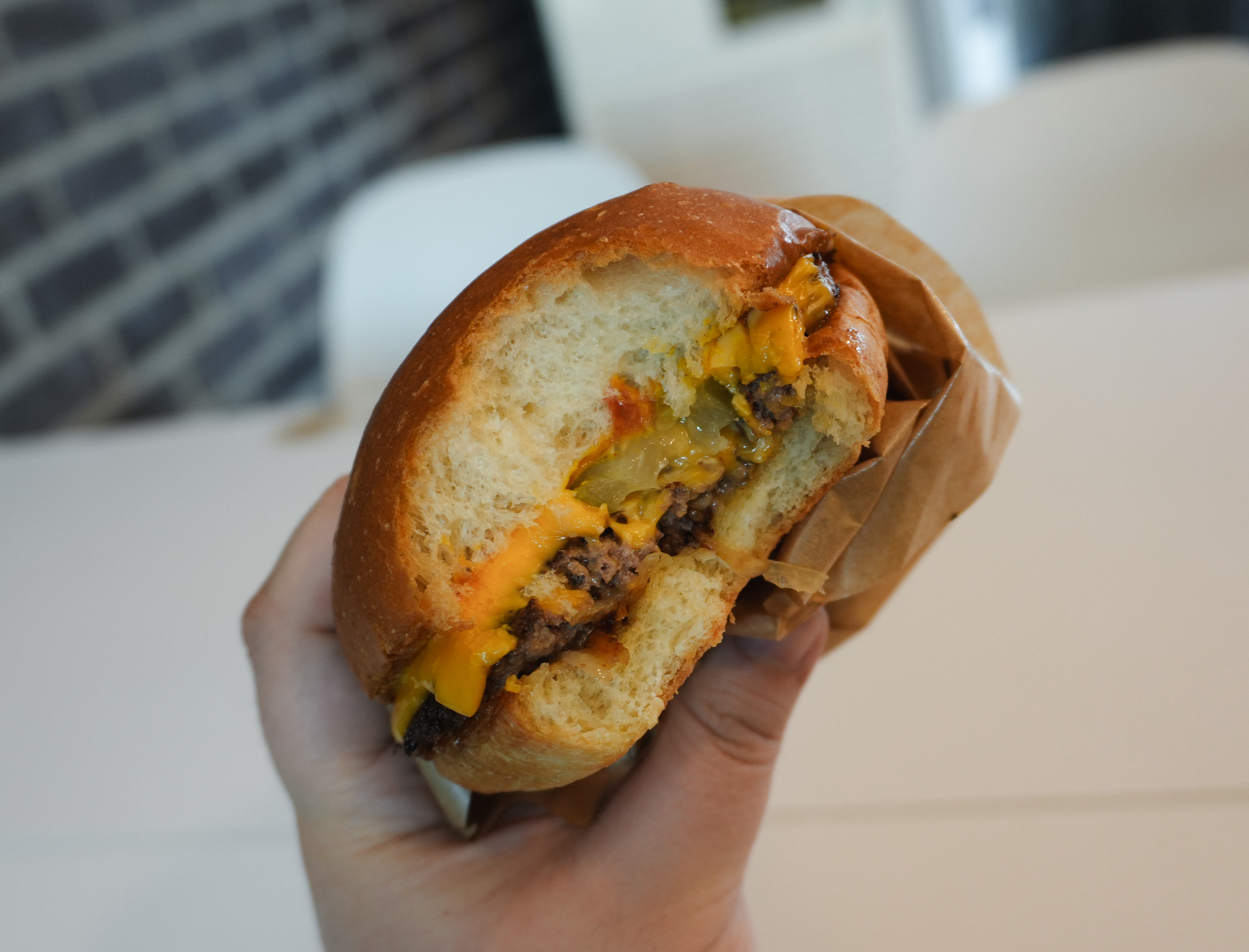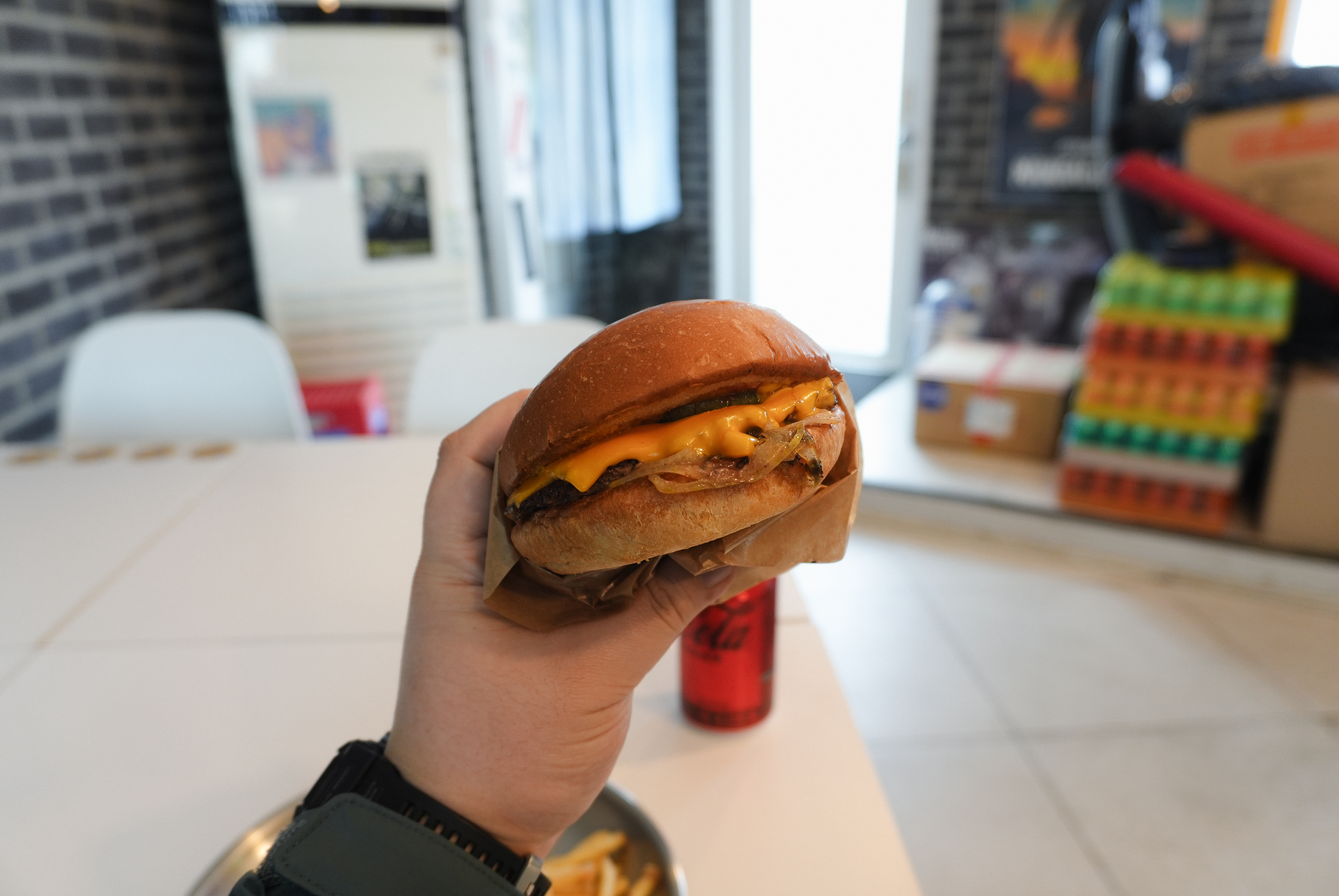 클래식치즈버거에는 말 그대로 치즈와 수제패티, 그리고 케첩, 머스터드 같은 소스와 피클, 구운 양파가 들어있었습니다. 맛은 괜찮았는데, 저는 육즙 가득한 쥬시한 패티를 원했는데, 버거 번도 그렇고 살짝 퍽퍽한 느낌이 들더라고요. 버거번도 조금 더 촉촉했으면 좋겠는데, 개인적으로 느끼기엔 그냥 푸석푸석한 느낌.