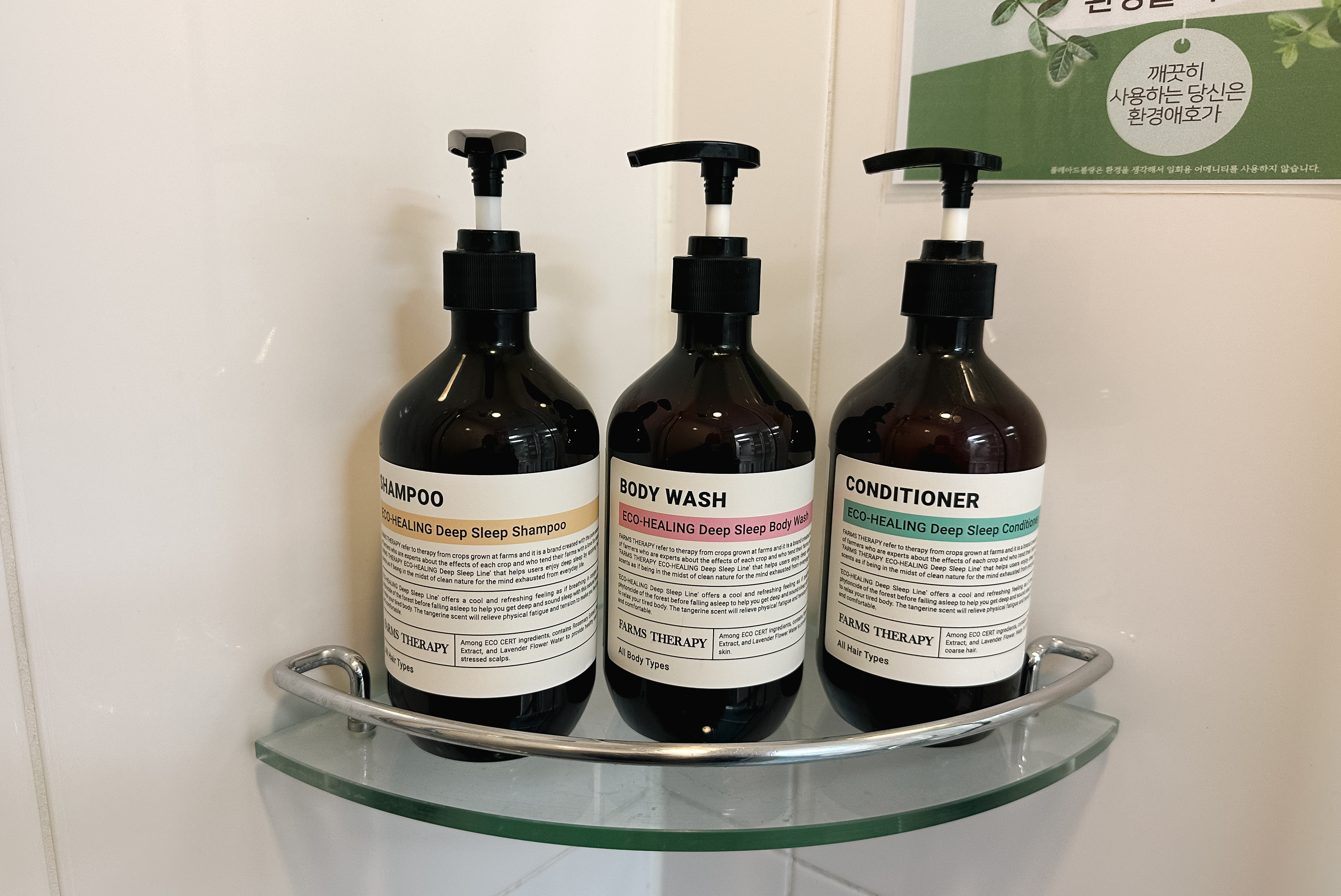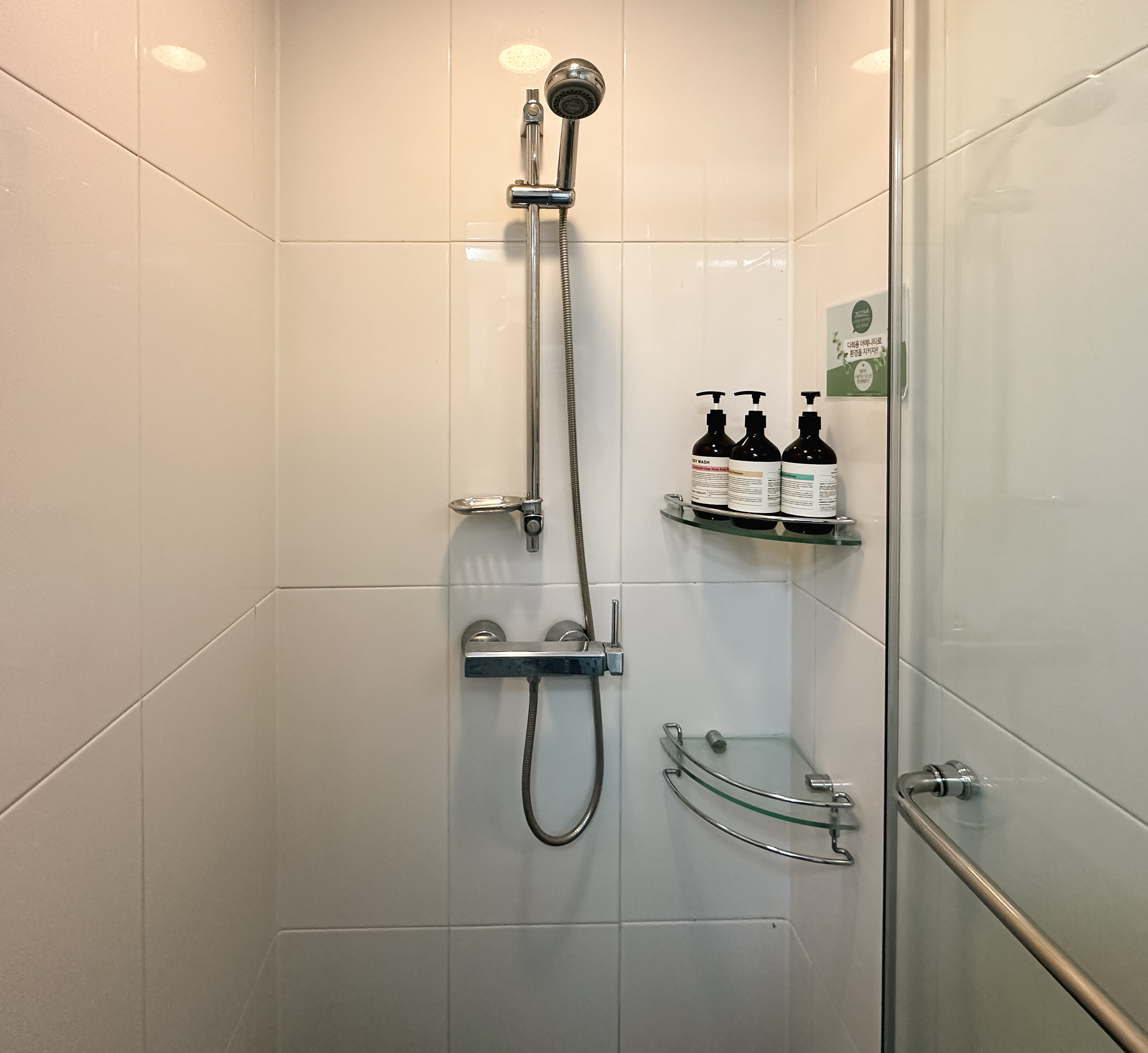 플레아드블랑 욕실은 위와 같았습니다. 변기에는 비데가 설치되어 있었고, 샤워부스로 공간을 분리하고 있었습니다. 기본적으로 샴푸와 바디워시, 컨디셔너를 구비하고 있어서 따로 챙겨갈 필요는 없었습니다.