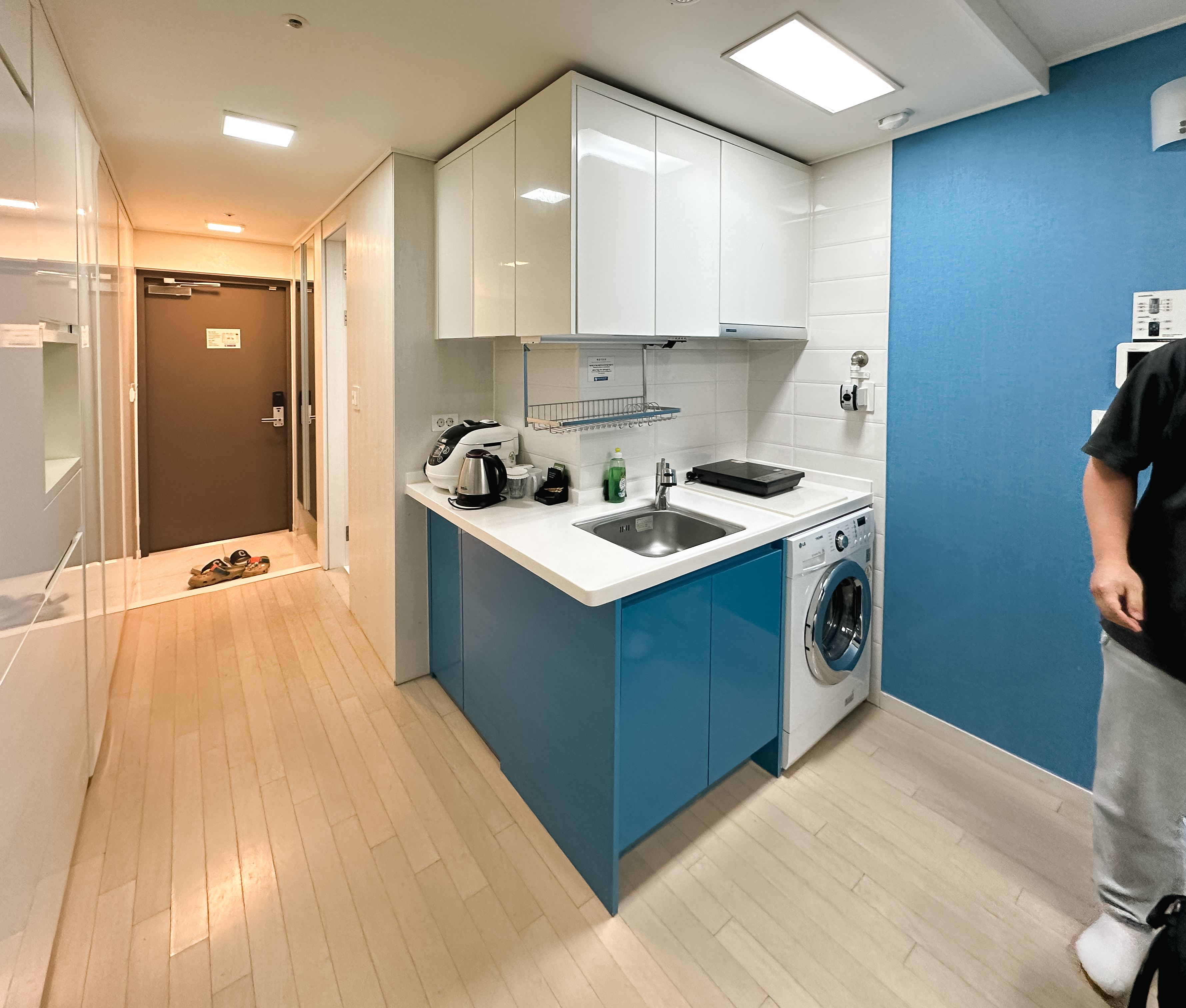 침실의 모습은 위와 같습니다. 대략적으로 오피스텔(?)이랑 비슷한 느낌이었고, 세탁기나 인덕션, 밥솥 등이 준비된 레지던스였고, 꽤 편리하고 아늑했습니다.
