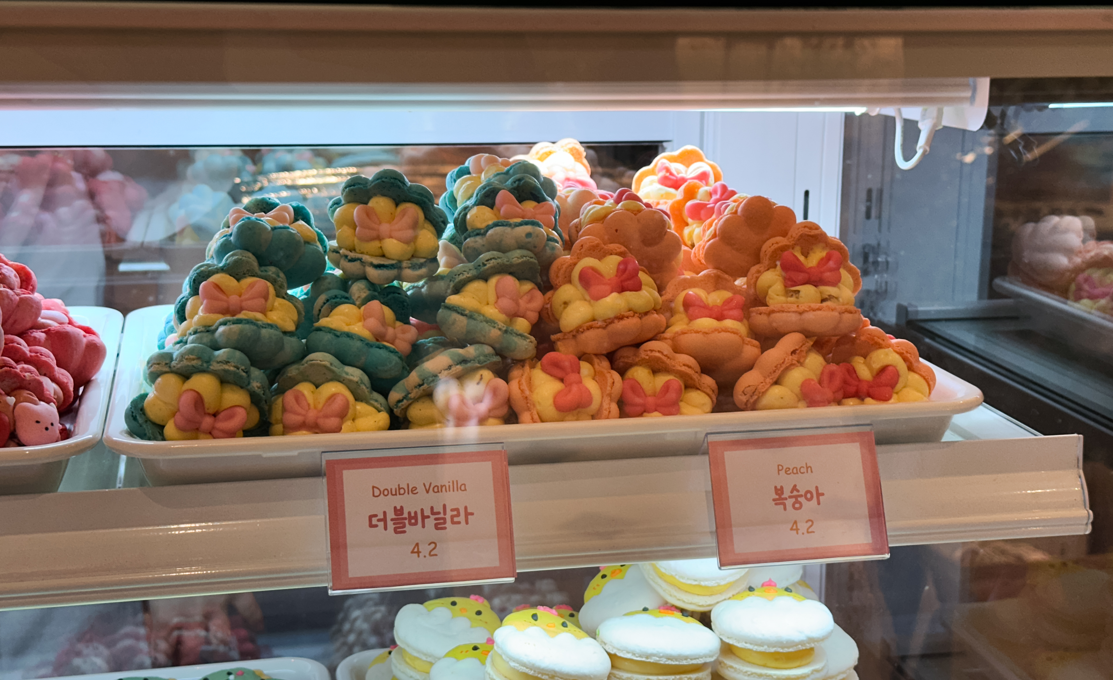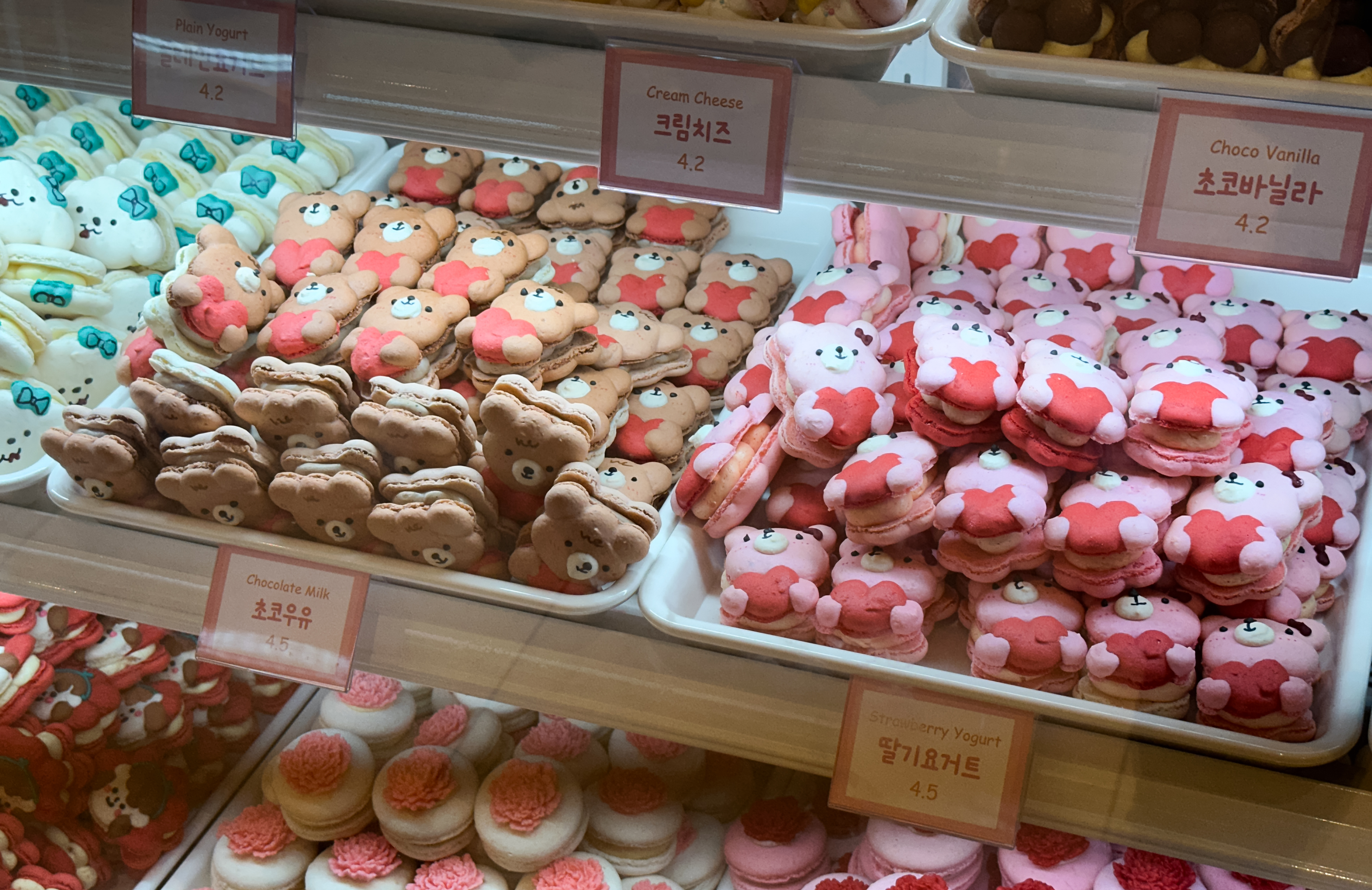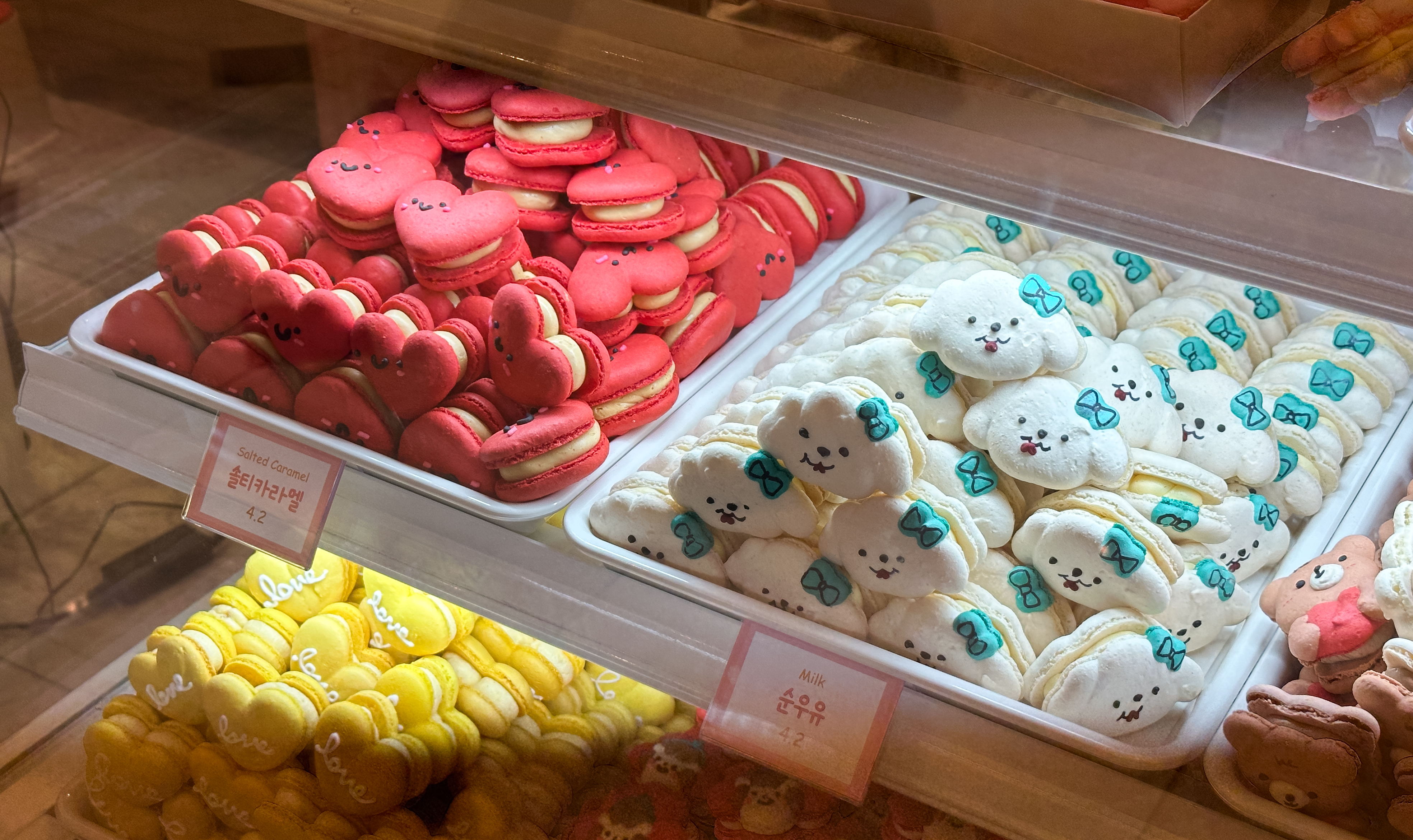 스윗티클스 마카롱의 종류는 솔티카라멜, 순우유, 초코우유, 딸기요거트, 누텔라, 망고, 더블바닐라, 복숭아, 초코바닐라, 딸기, 플레인요거트, 크림치즈, 오레오, 블루베리, 피넛버터, 라즈베리, 애플시나몬, 바나나 등이 있었습니다. 종류가 워낙 다양해서 디테일을 보여드리려고, 한 화면에 담기 보다는 여러장 찍어보았습니다.