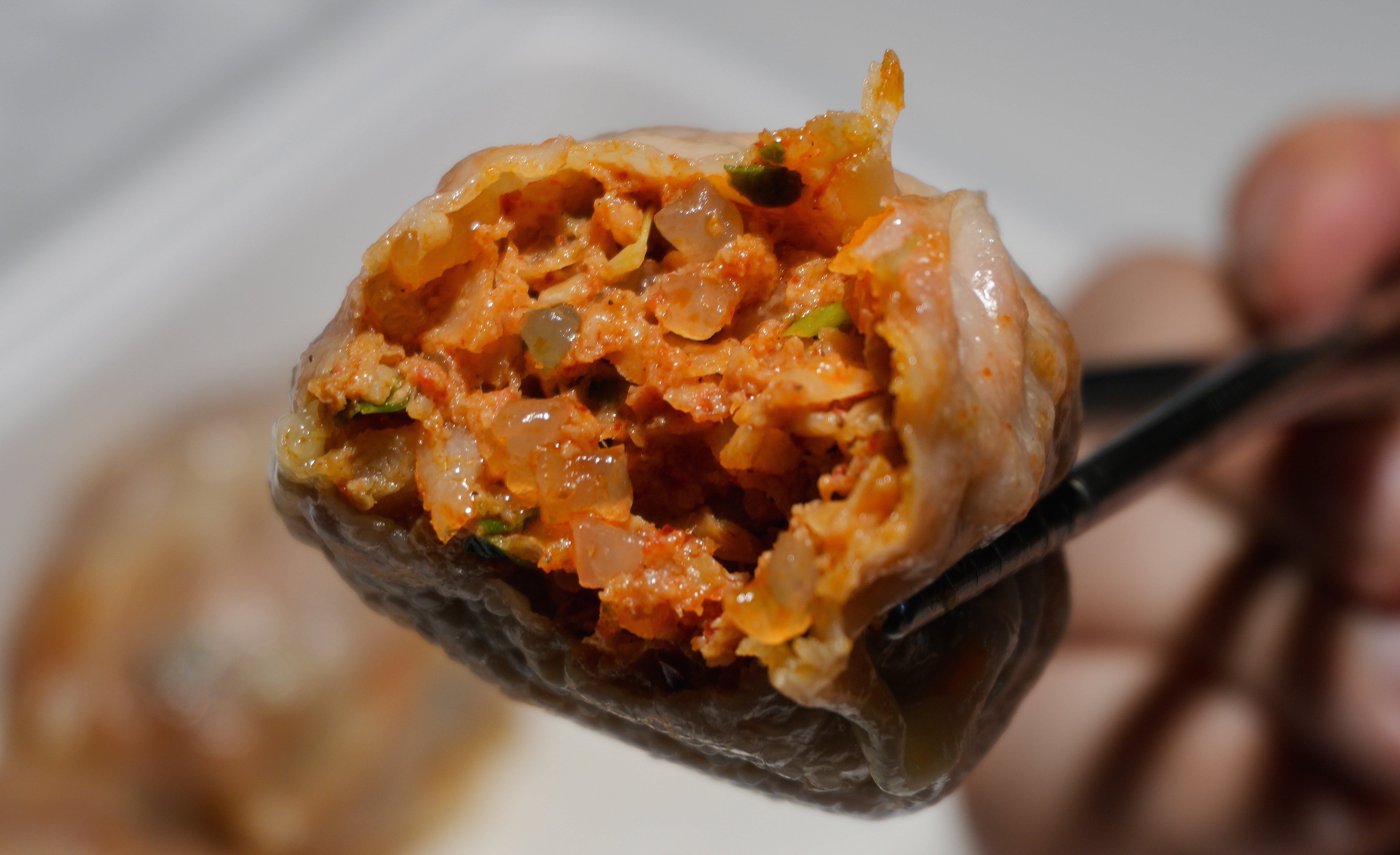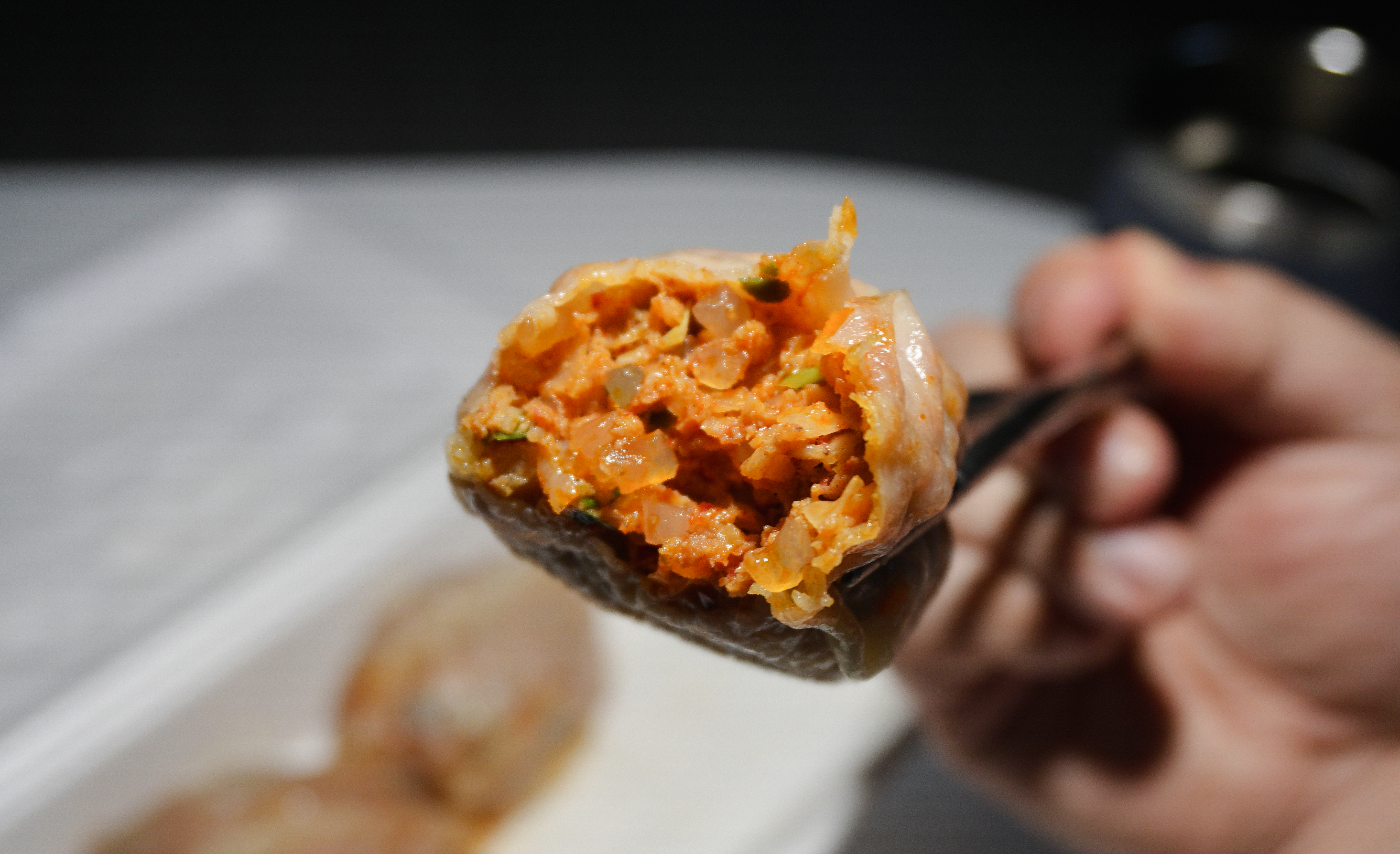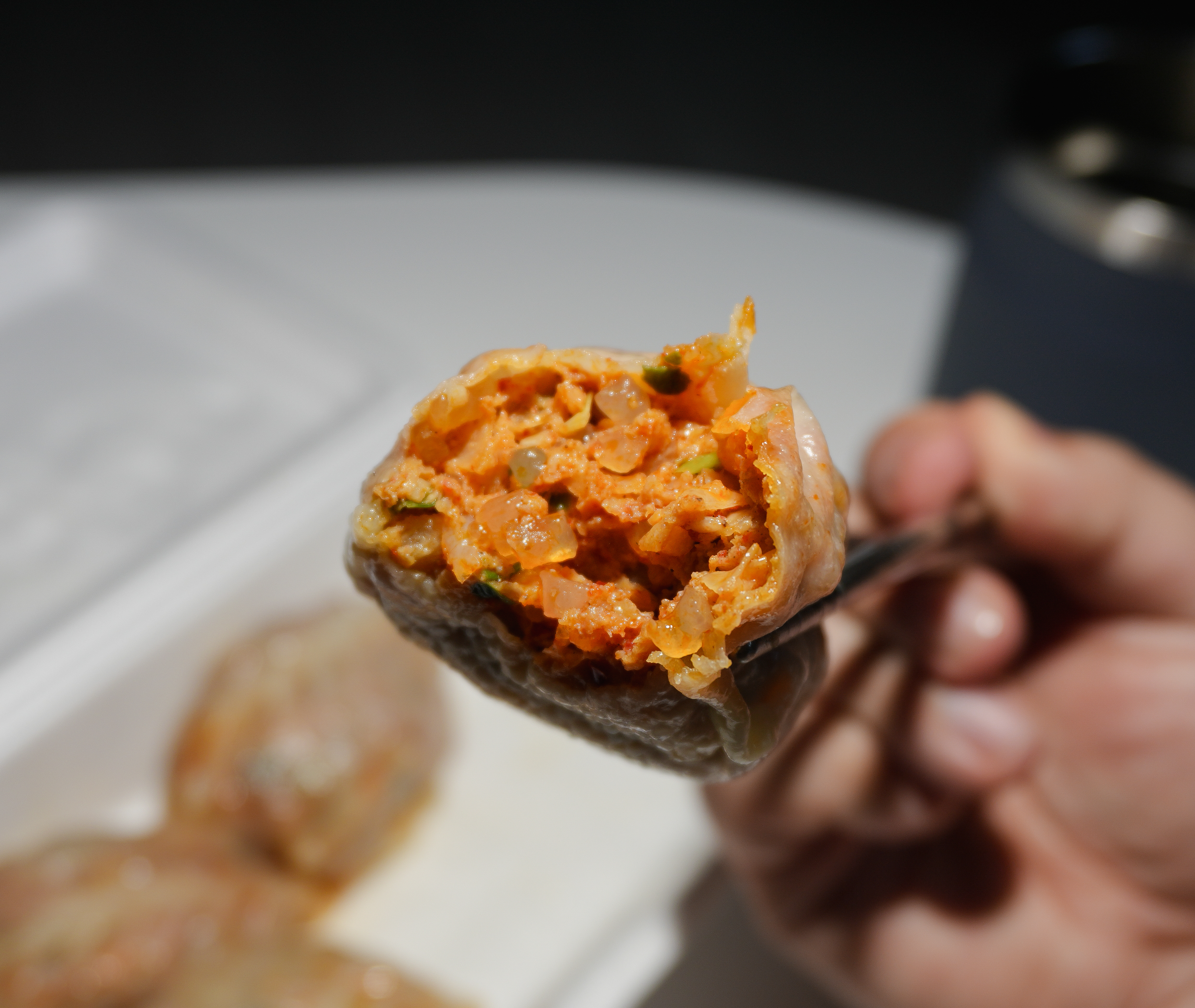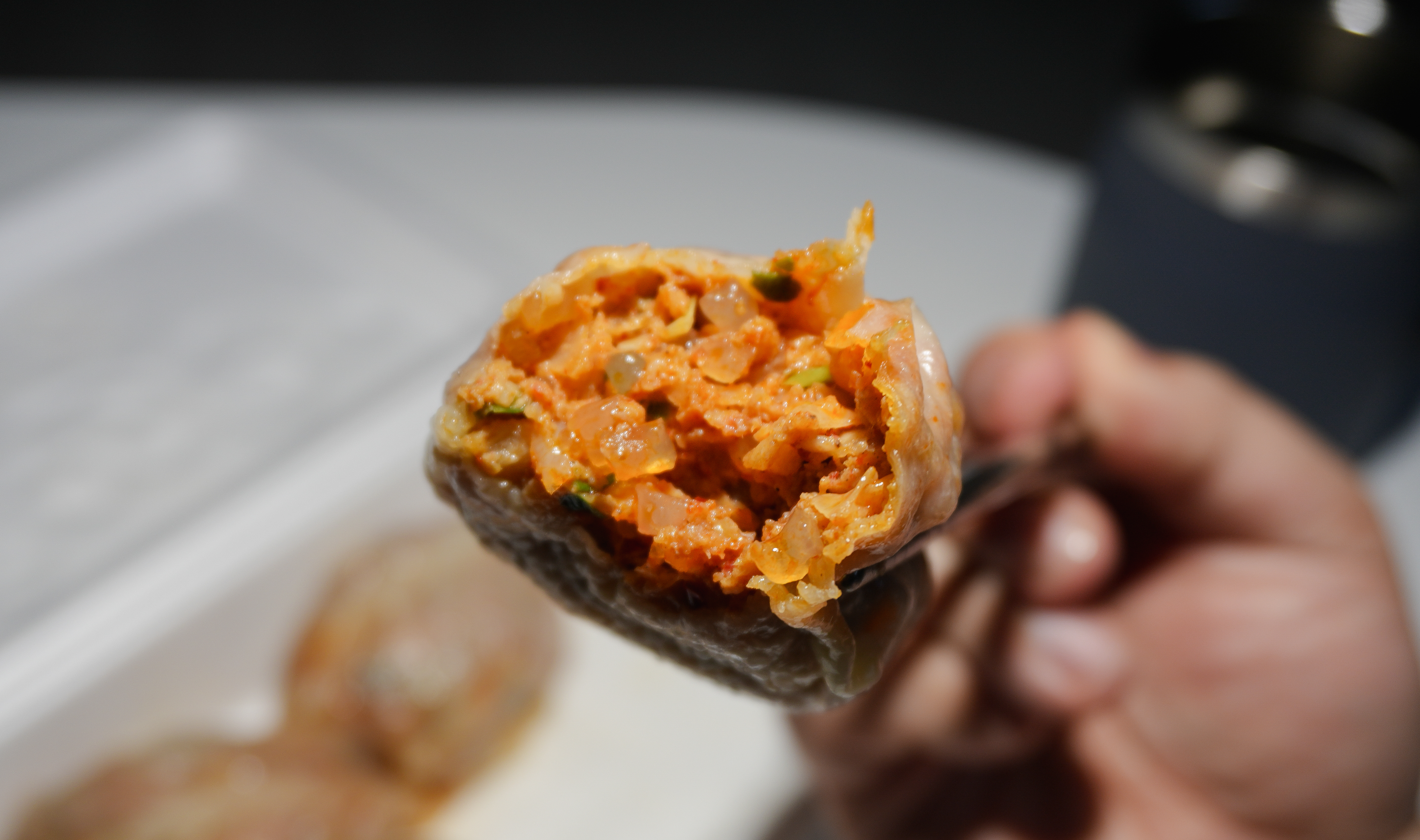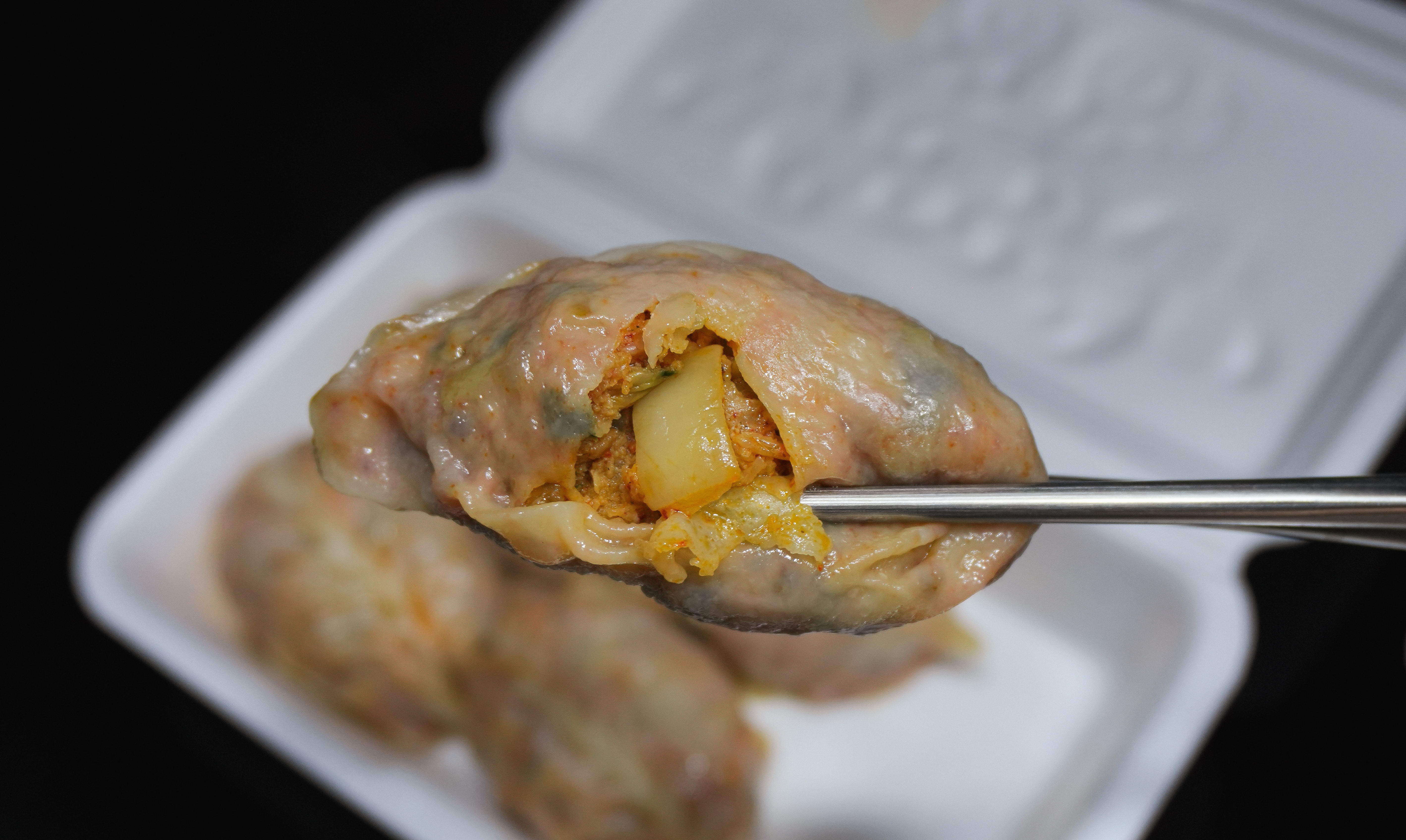 만두의 피는 얇으면서도 찰기가 있었고, 만두의 크기는 손가락 두세 개 정도 합친 크기정도 되었습니다. 한 입에 넣기에 살짝 부담스럽고, 한입에 먹으면 꽉 차는 정도의 만두 크기였습니다. 그리고 만두소는 꽉 차 있는데, 살짝 매운맛의 김치만두였습니다.