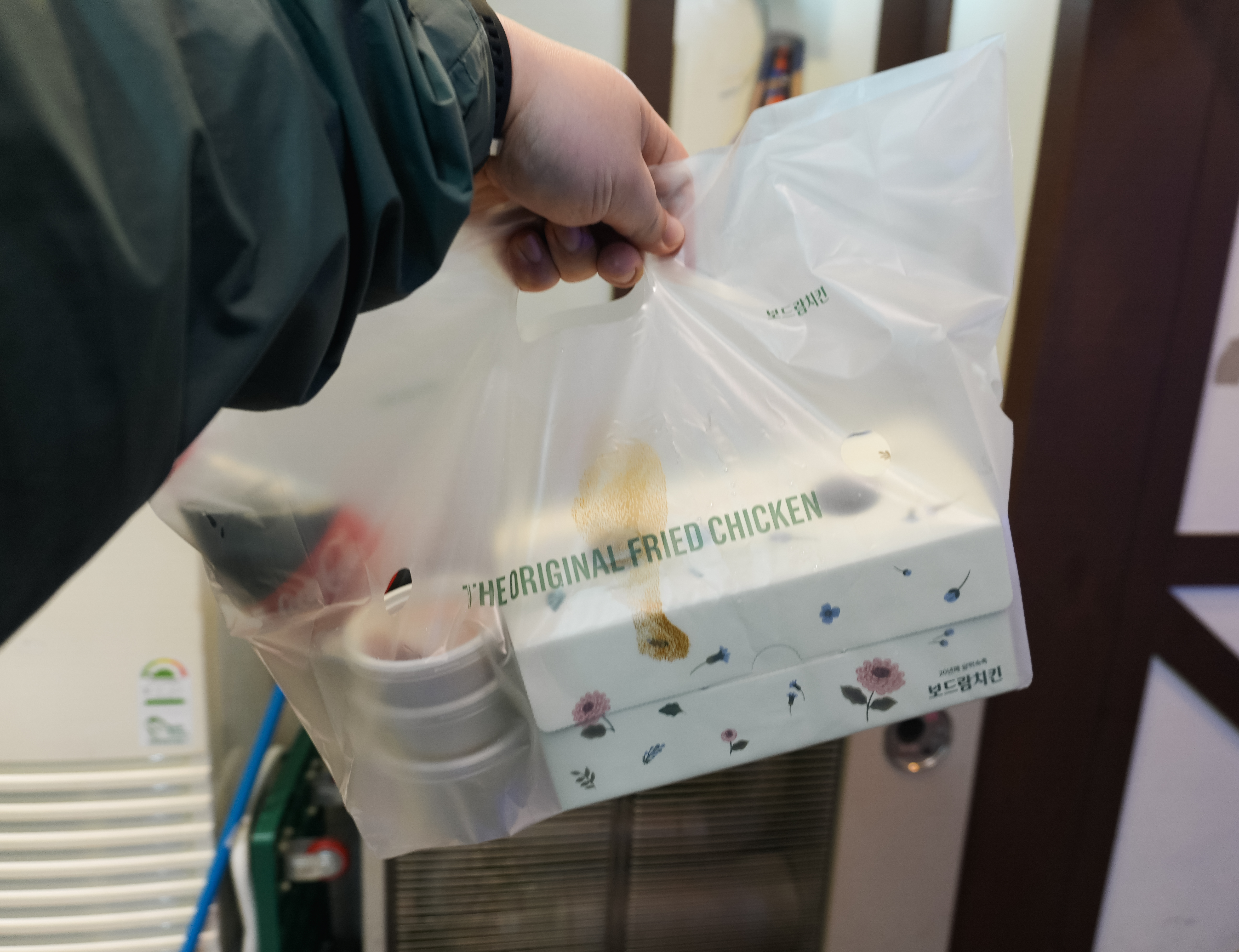 보드람치킨 강화점에서 오리지날치킨 1마리 19,000원 포장을 했습니다. 구성은 치킨 본품과 중간 크기의 콜라 페트 하나와 2가지 소스 그리고 치킨무가 함께 들어있었습니다.