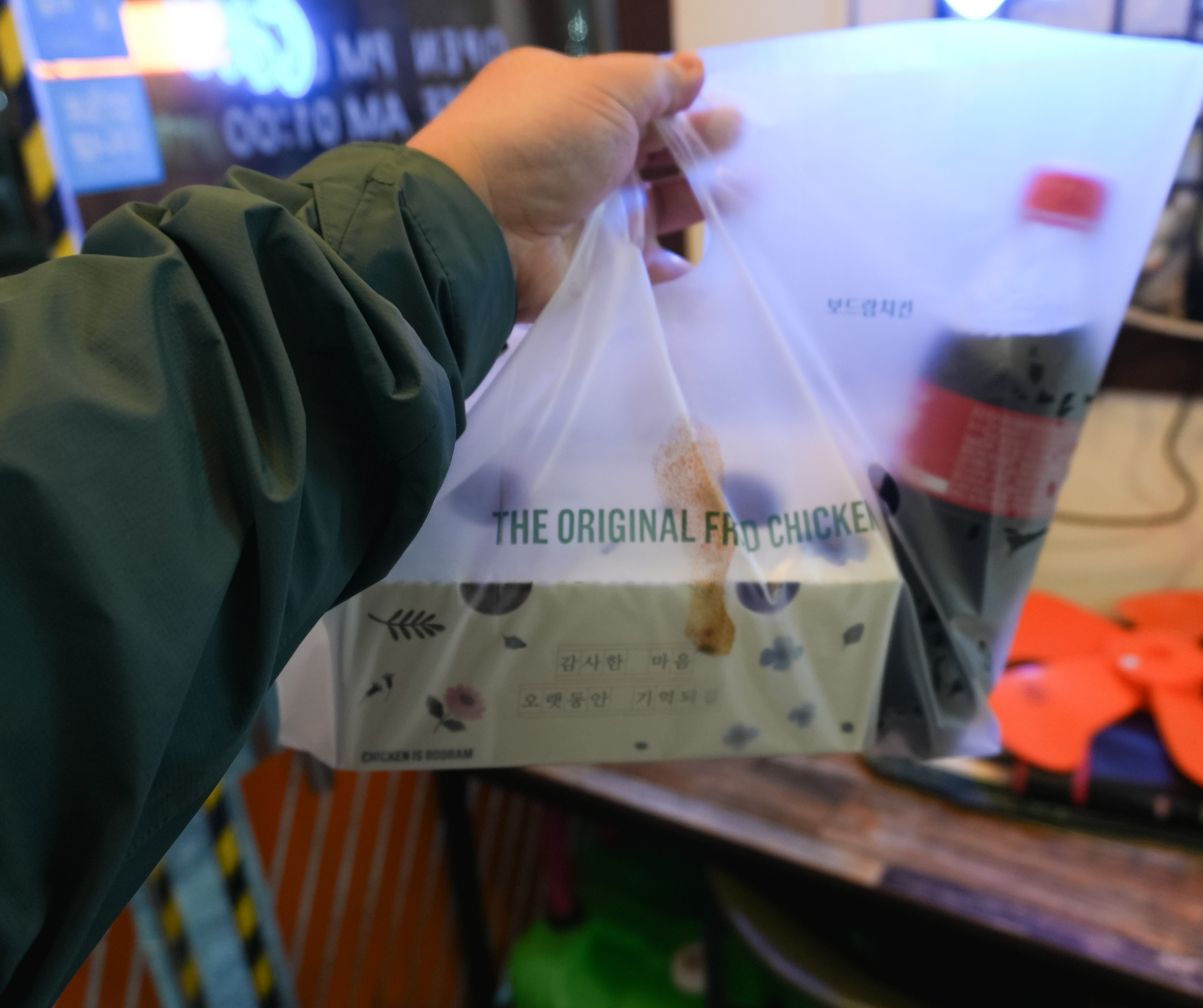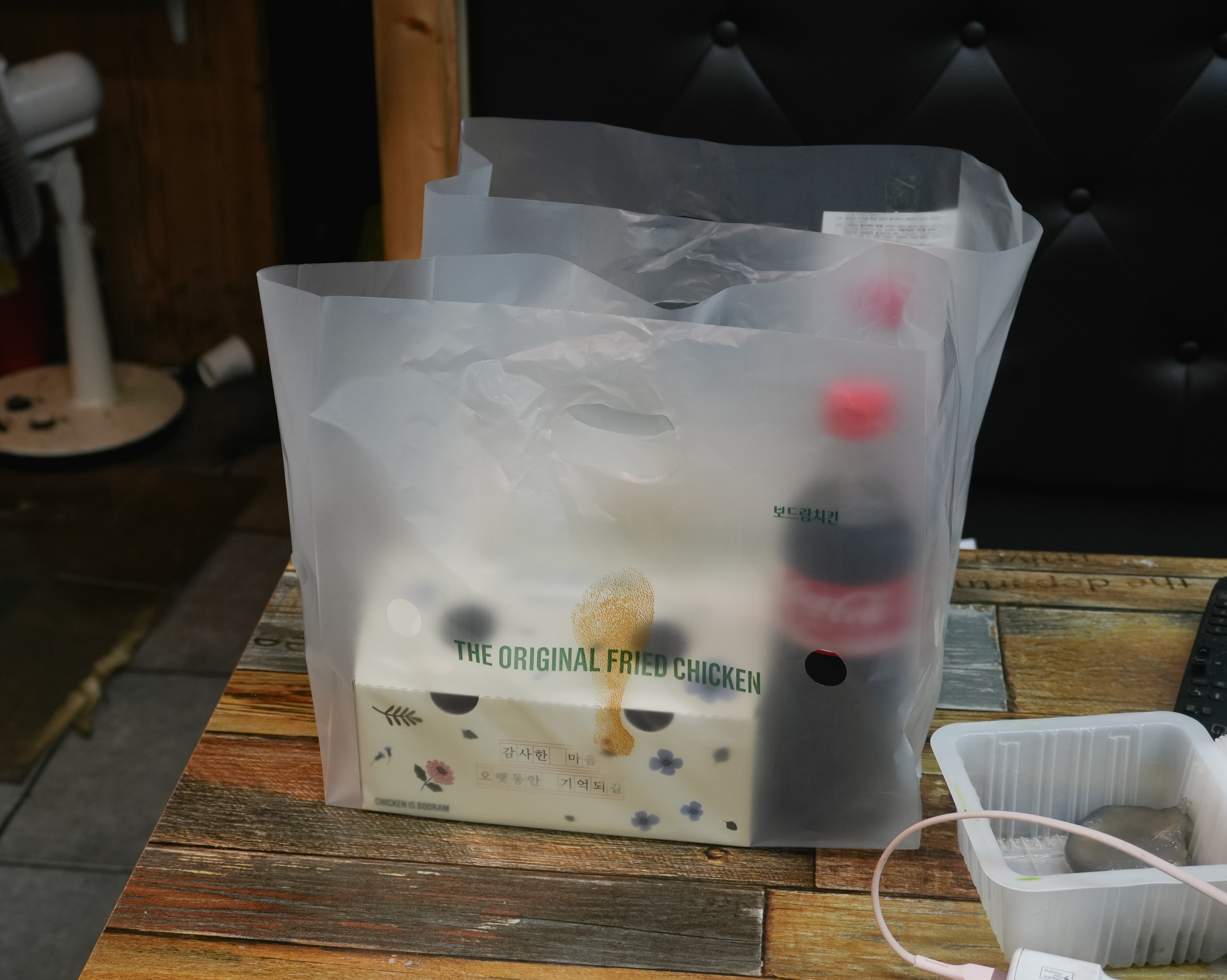 보드람치킨 강화점에서 오리지날치킨 1마리 19,000원 포장을 했습니다. 구성은 치킨 본품과 중간 크기의 콜라 페트 하나와 2가지 소스 그리고 치킨무가 함께 들어있었습니다.