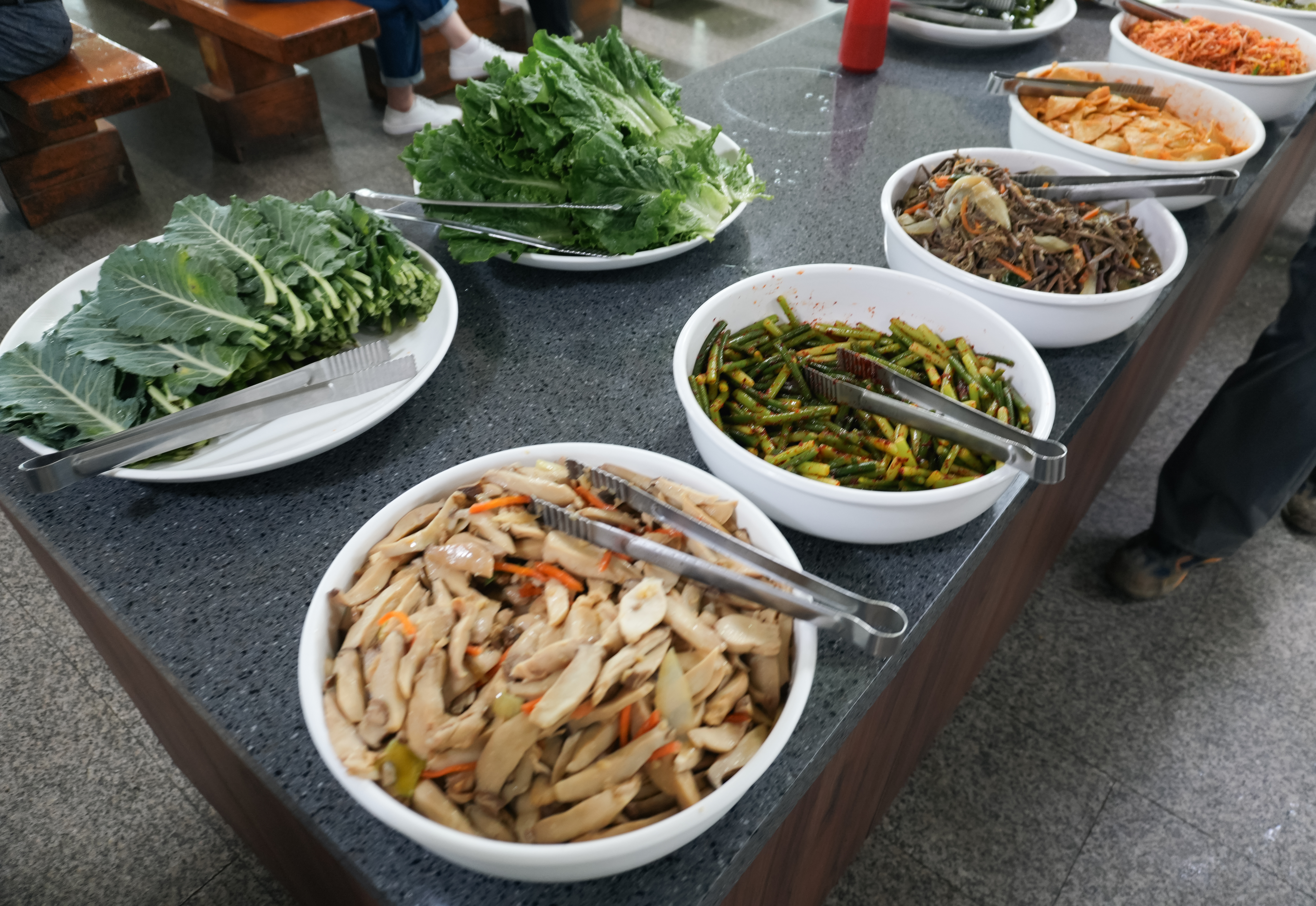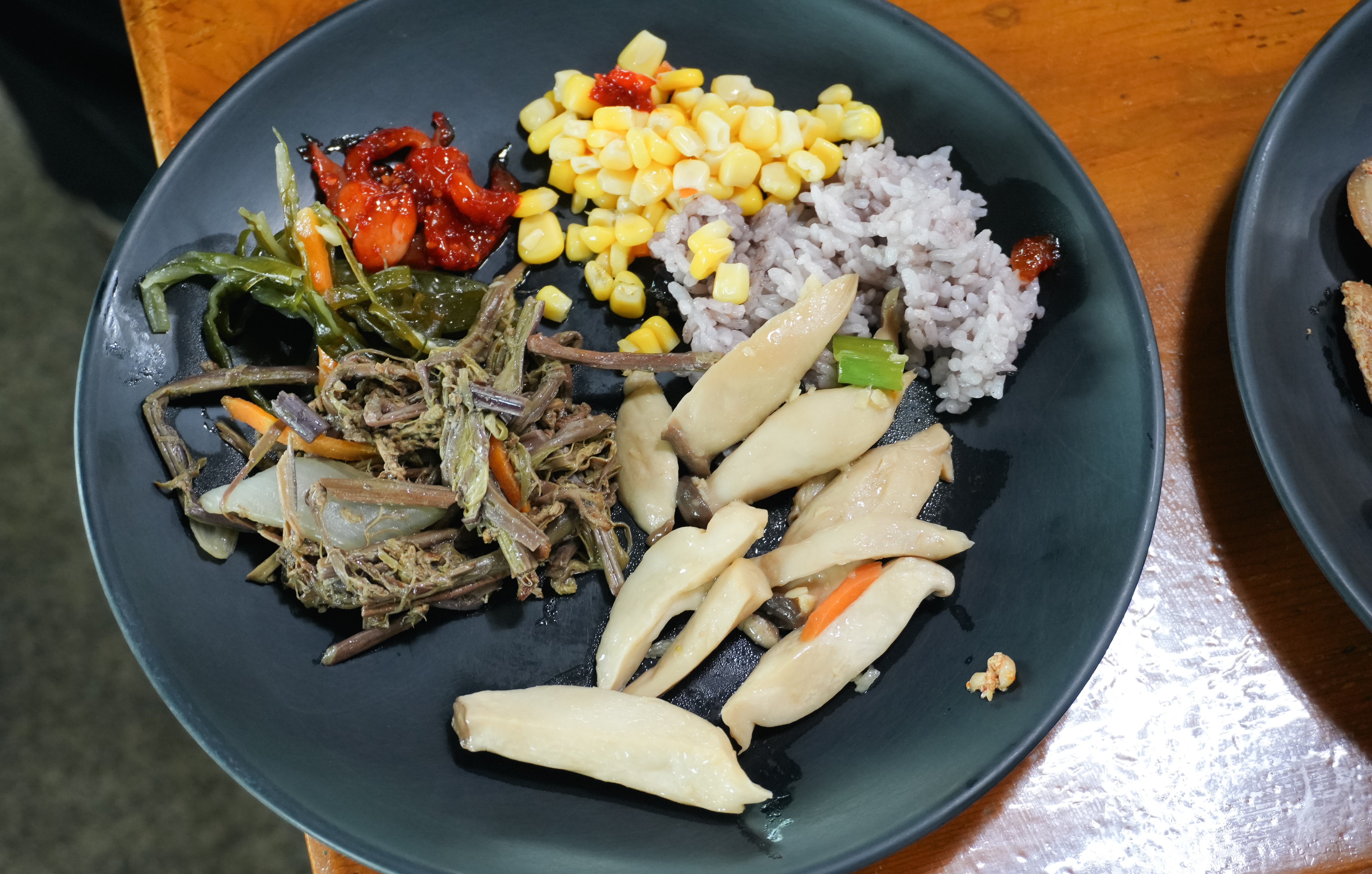 태안 백화산가든에서 콘샐러드, 버섯볶음, 고사리나물, 미역줄기볶음, 오징어젓갈, 카레, 족발, 껍데기를 먹었습니다. 반찬들의 간은 전체적으로 심심한 편인데, 그래도 나름 8천원이라는 가격에 나쁘지 않은 구성인 것 같습니다. 저번에 반찬이 한 번 쉬어있던 적이 있어서 한동안 방문하지 않았는데, 이번에는 전체적으로 괜찮게 유지되고 있었습니다.