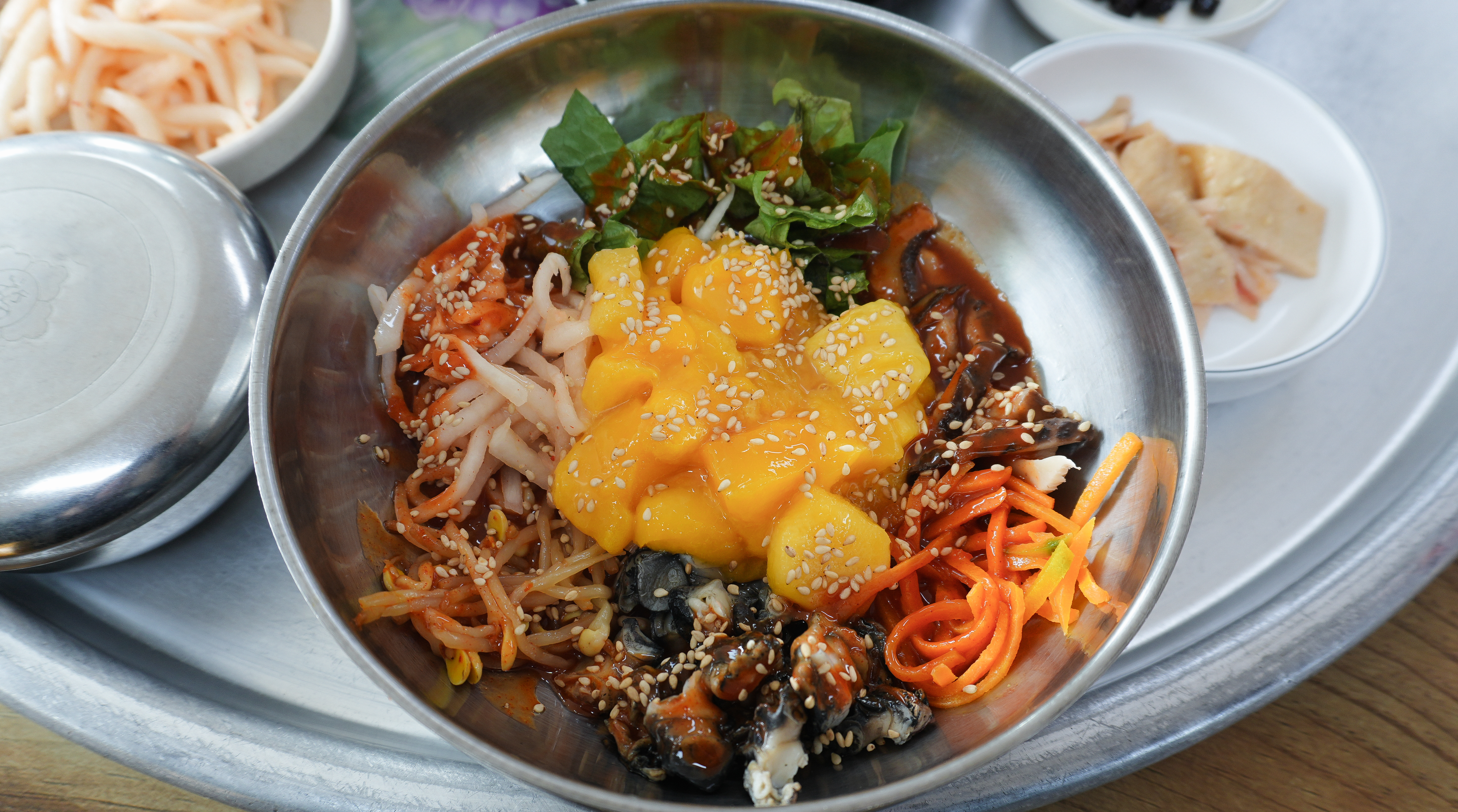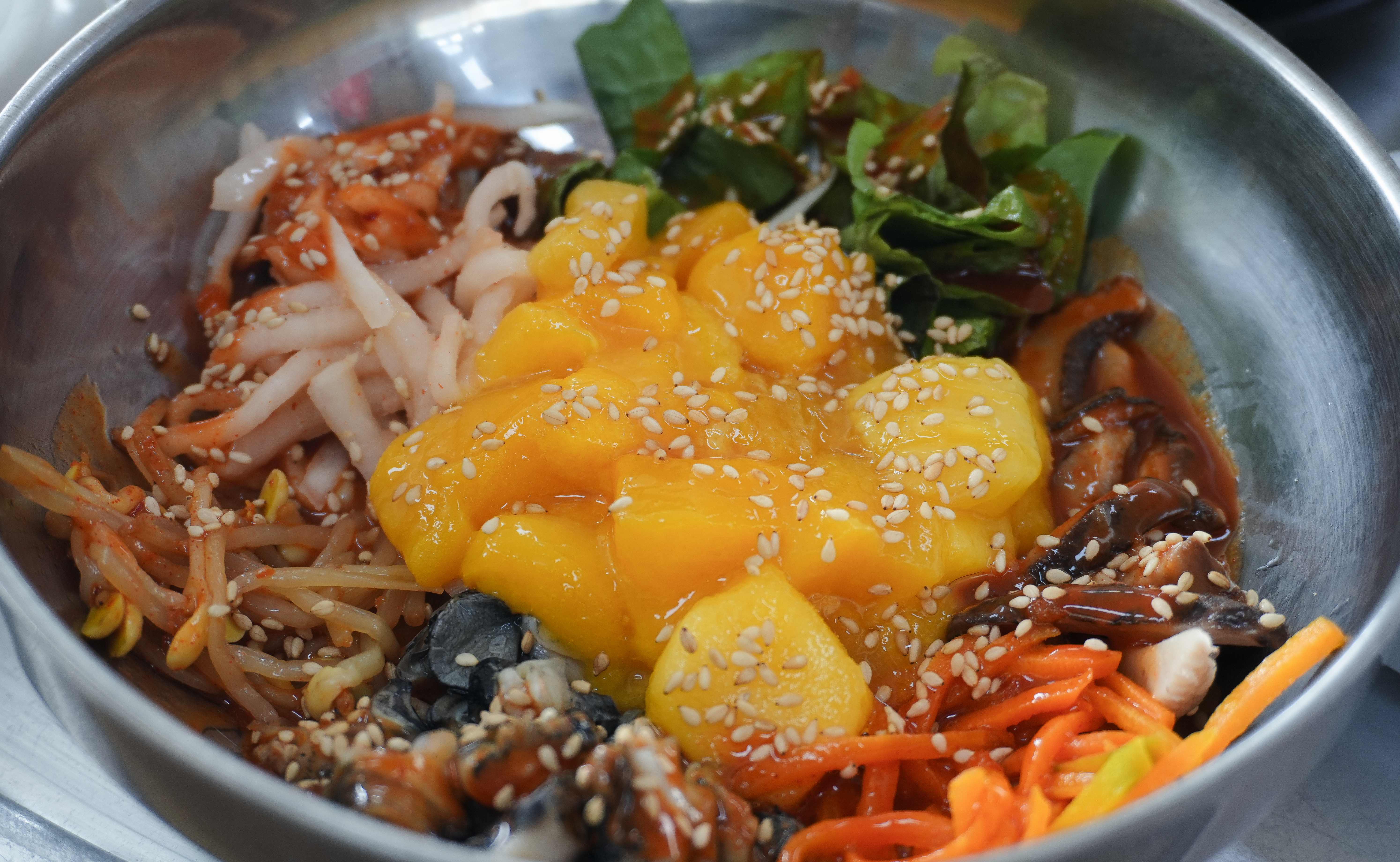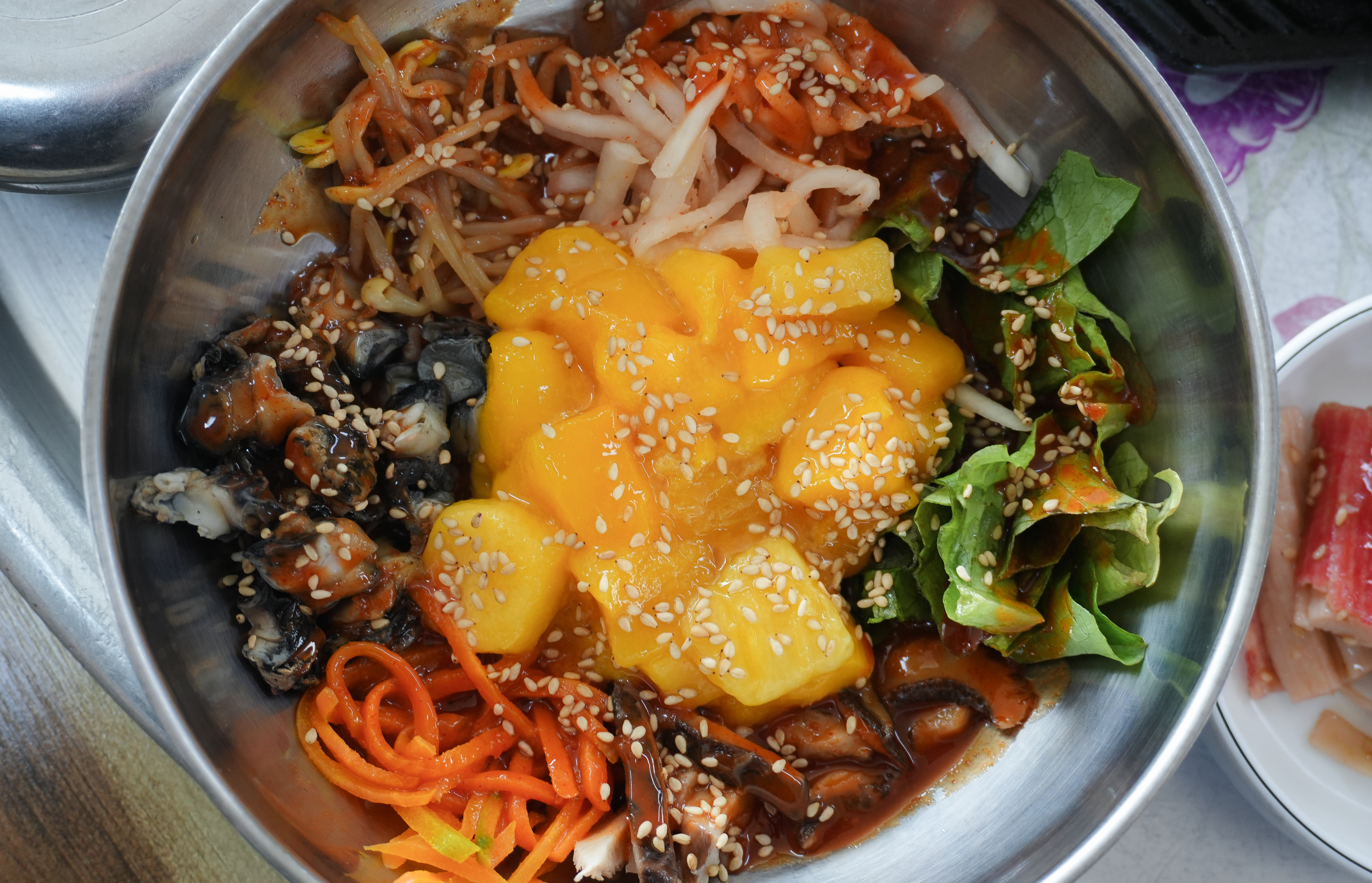 우렁이망고비빔밥의 맛도 새콤달콤한 맛이 물회나 회덮밥과 비슷한 느낌이 들었습니다. 망고의 맛은 아무래도 새콤달콤한 맛이 있어서 비빔밥에 큰 비중을 차지하지만, 우렁이의 맛은 생각보다 강하지 않아서 꼬들한 식감을 담당하고 있었습니다.