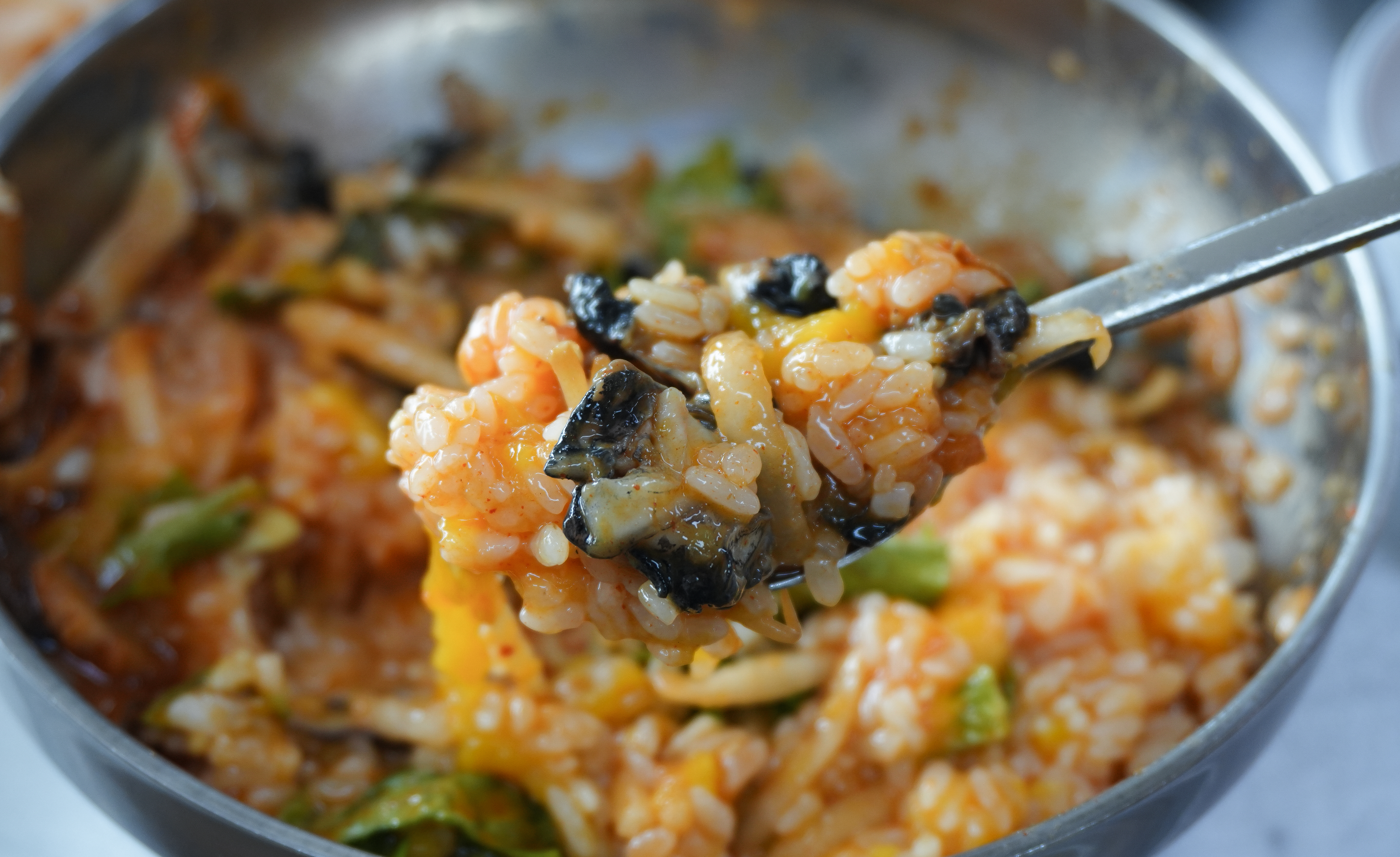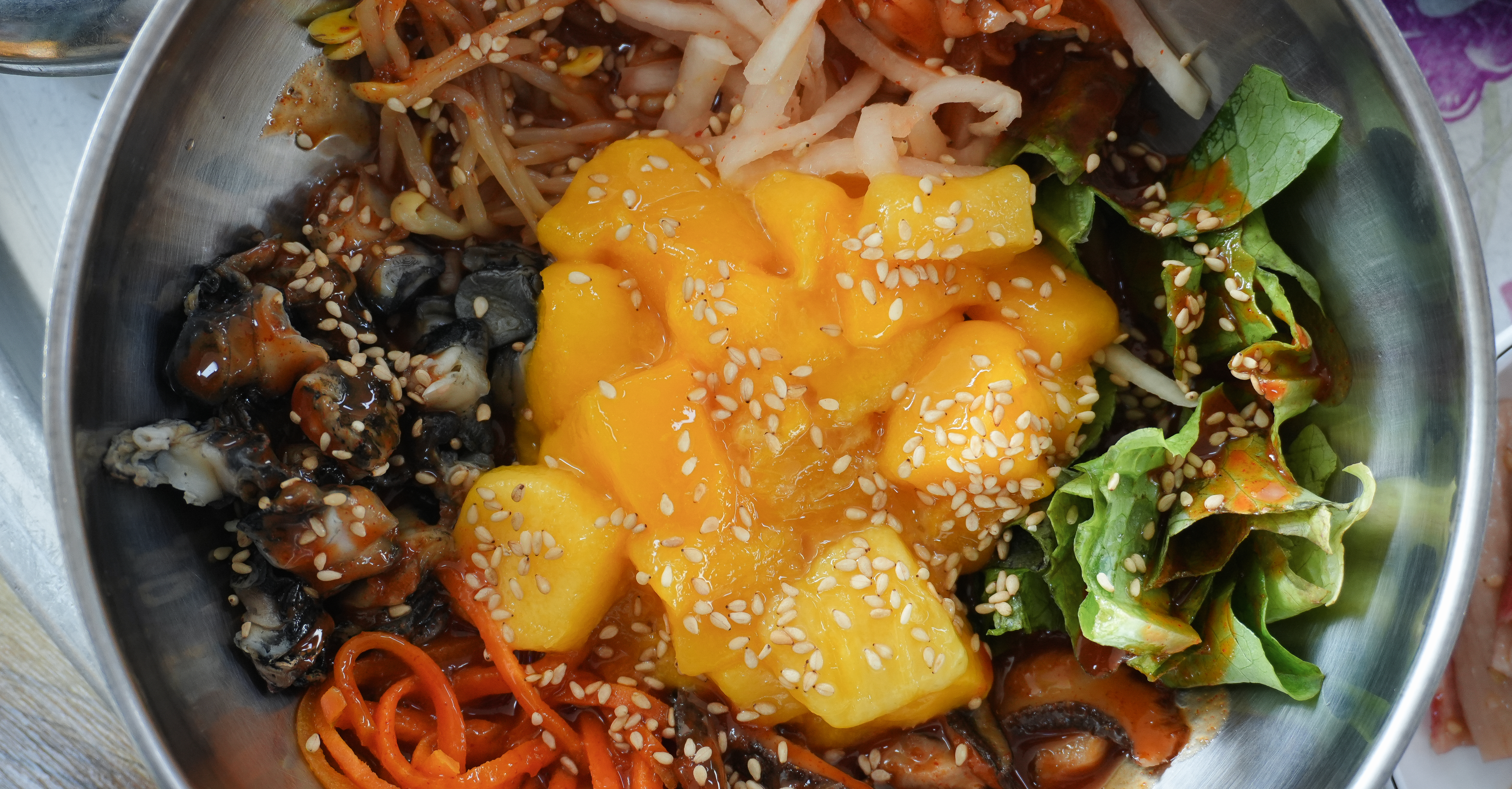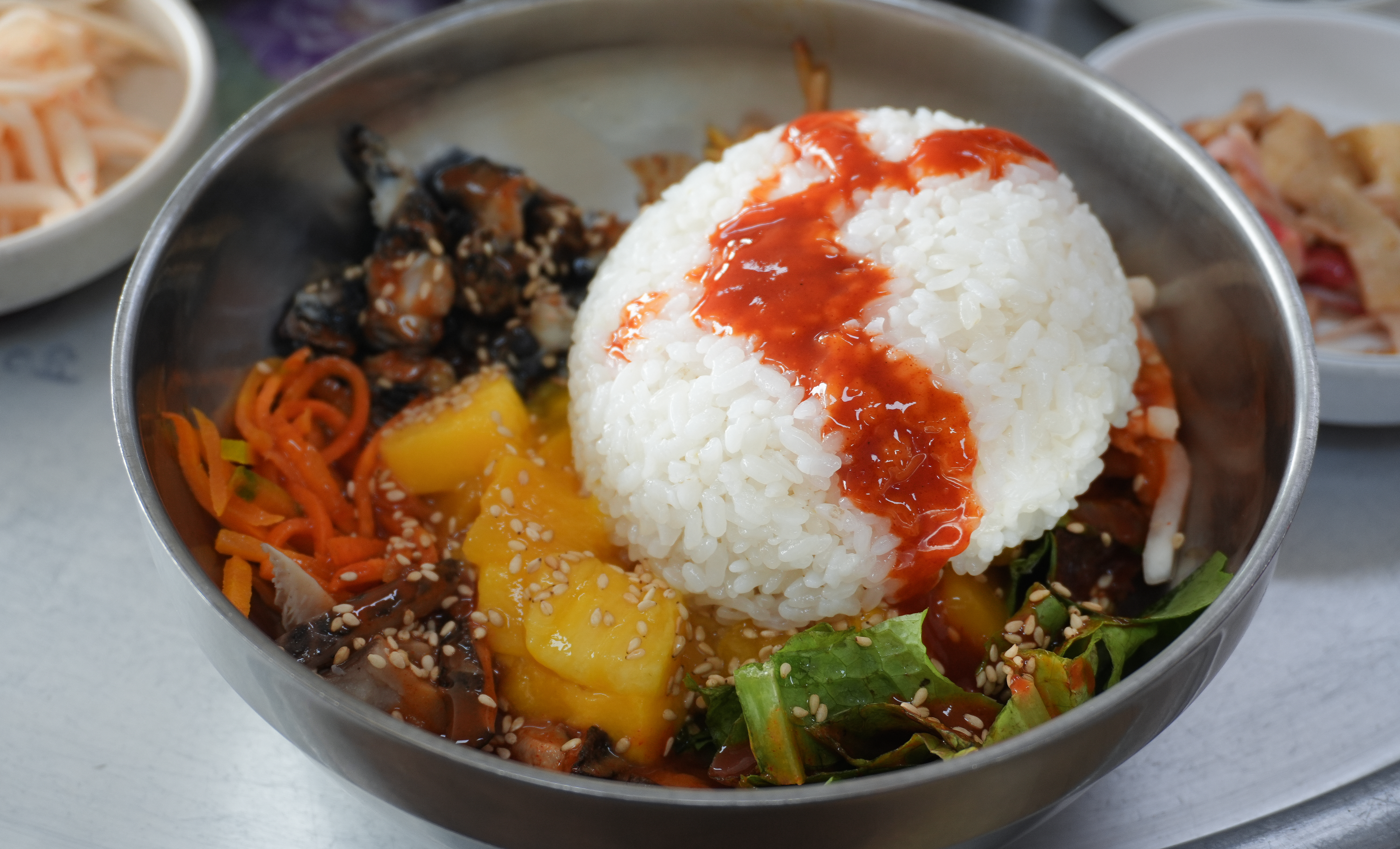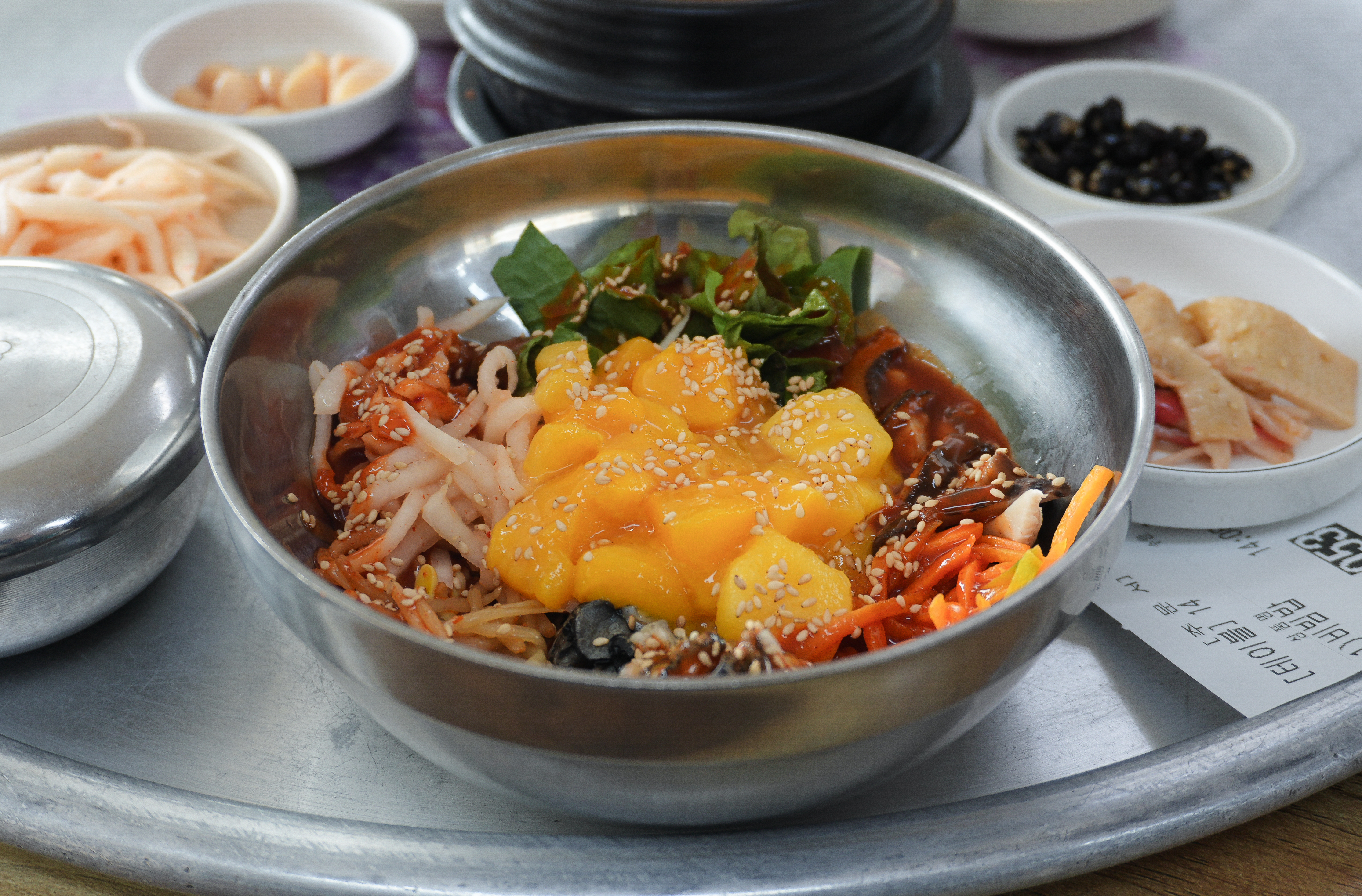 우렁이망고비빔밥의 맛도 새콤달콤한 맛이 물회나 회덮밥과 비슷한 느낌이 들었습니다. 망고의 맛은 아무래도 새콤달콤한 맛이 있어서 비빔밥에 큰 비중을 차지하지만, 우렁이의 맛은 생각보다 강하지 않아서 꼬들한 식감을 담당하고 있었습니다.