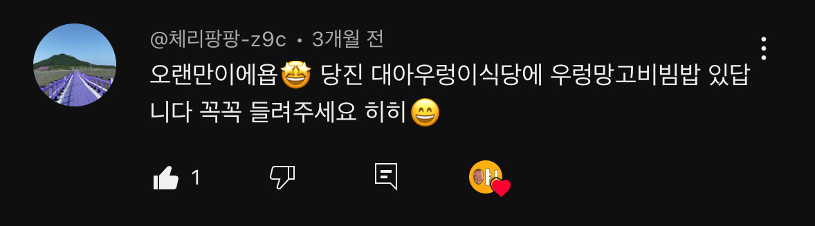 대아우렁이식당의 우렁망고비빔밥은 감사하게도, 제가 운영하는 유튜브 채널인 '야먹자(링크)'의 구독자 '체리팡팡'님이 댓글로 추천해 주신 가게로, 전국의 이색적인 식당을 찾아다니는 저에게 너무 도움이 되는 댓글이었습니다. 댓글 보자마자 저도 여기 한 번 꼭 가봐야지 하고 저장해 두었다가 드디어 기회가 되어 방문하게 되었습니다.
