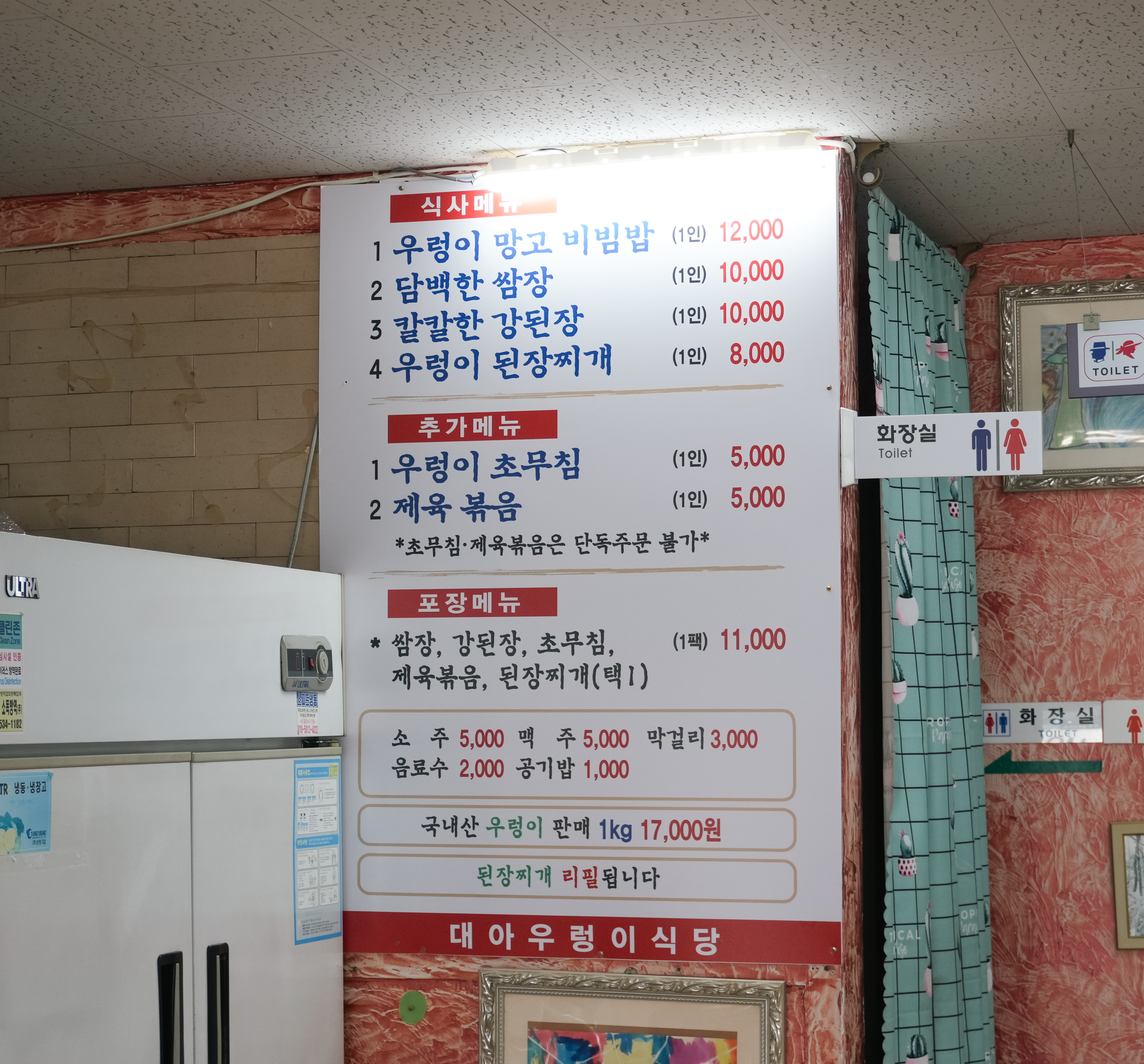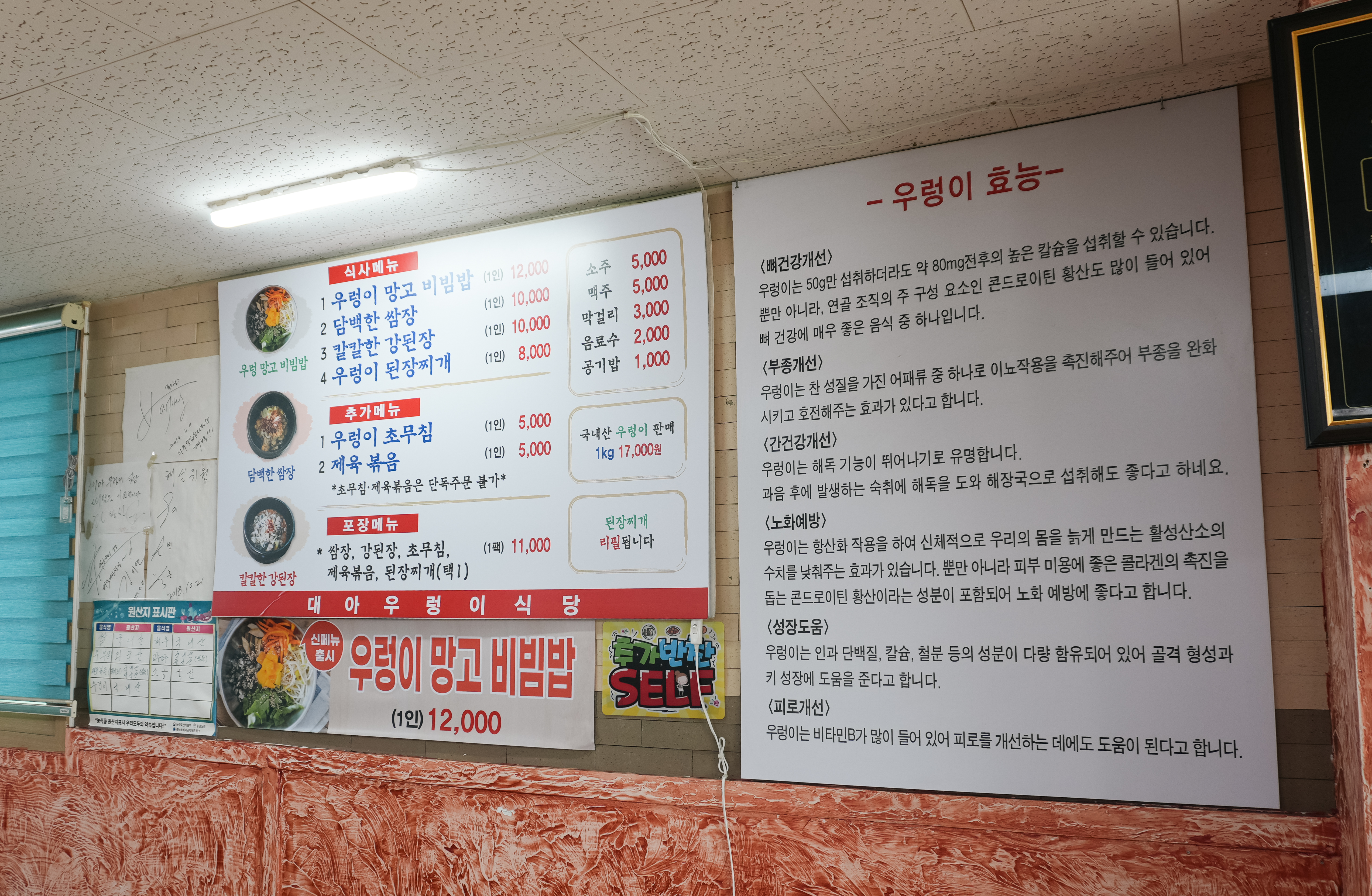 대아우렁이식당에는 여느 가게들과 마찬가지로 '우렁이 효능'이라고 붙여두었더라고요. 우렁이의 효능으로 뼈건강개선, 부종개선, 간건강개선, 노화예방, 성장도움, 피로개선이 적혀있는데요. 가는 식당마다 다 저렇게 붙어있어서, 효능들만 보면 만수무강해야 할 것 같습니다. 이제 진짜로 메뉴판을 살펴보겠습니다.
