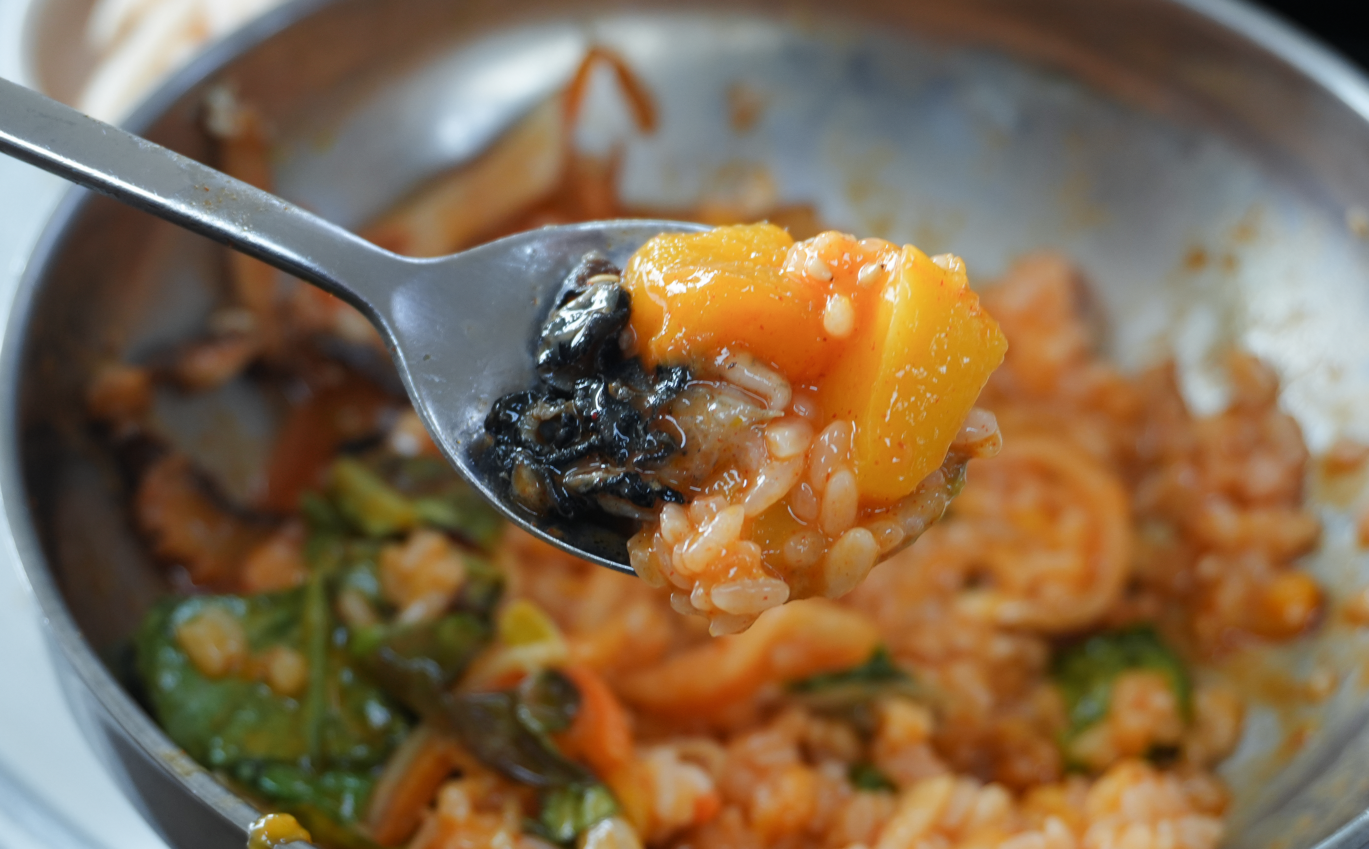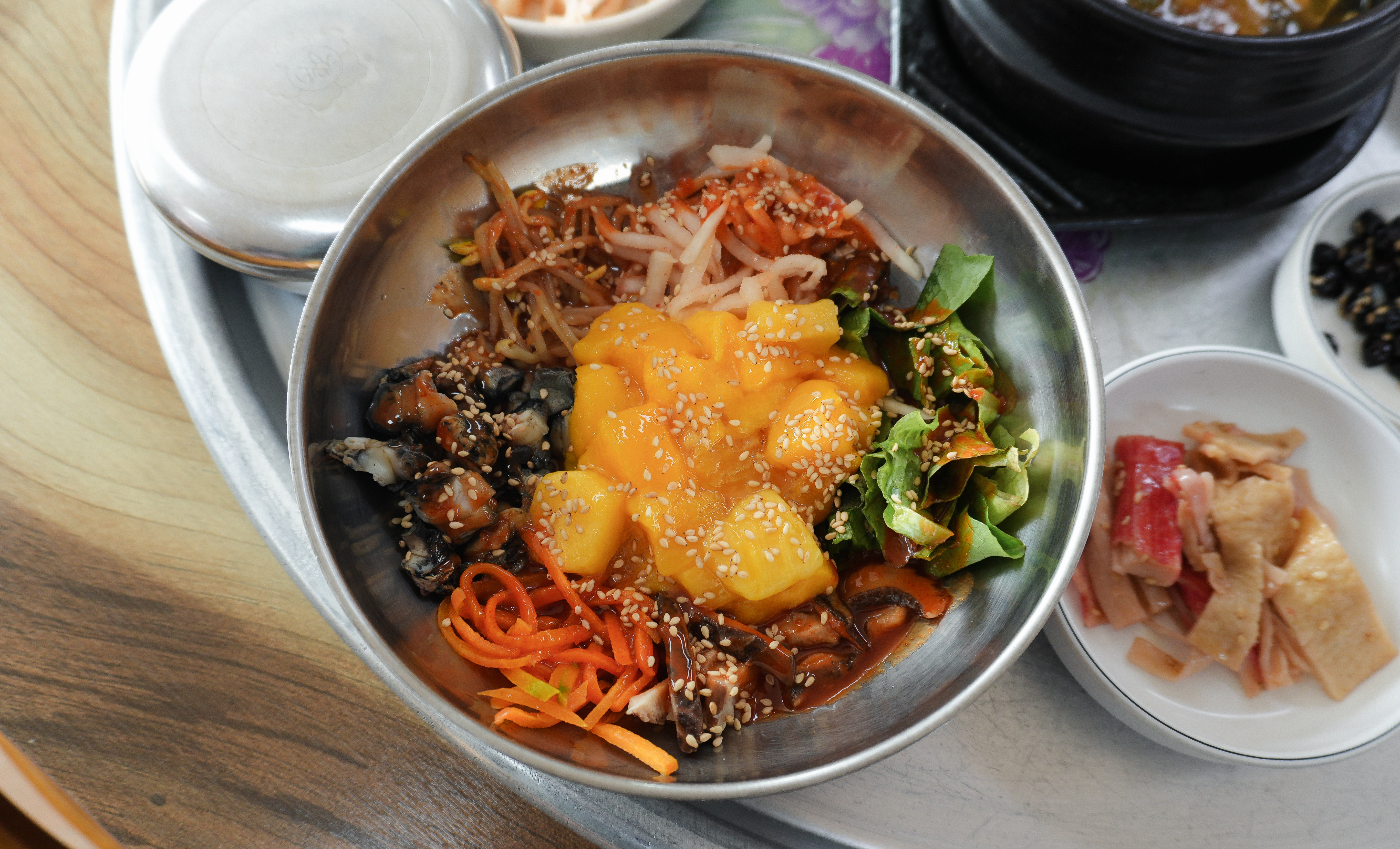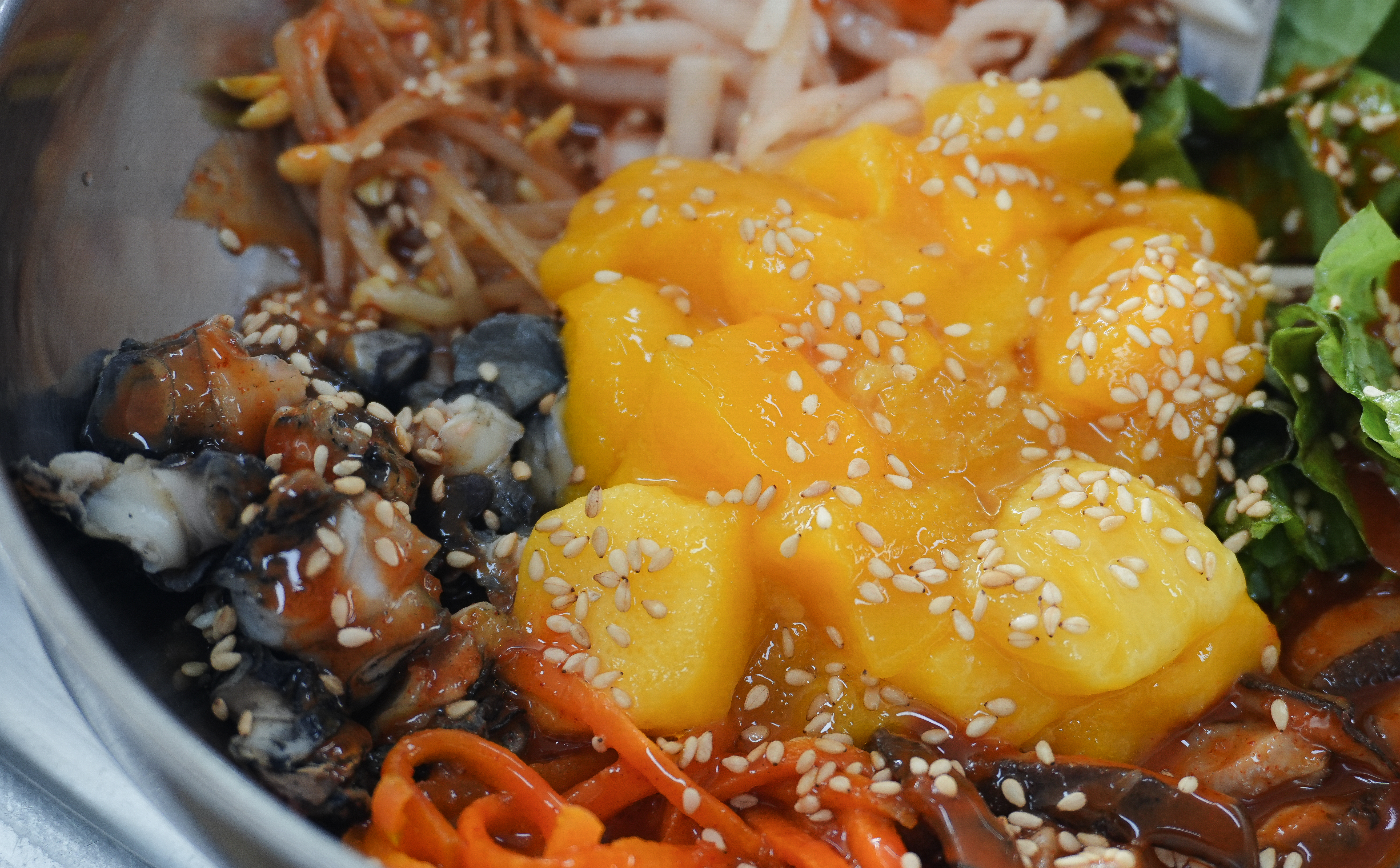 우렁이망고비빔밥의 맛도 새콤달콤한 맛이 물회나 회덮밥과 비슷한 느낌이 들었습니다. 망고의 맛은 아무래도 새콤달콤한 맛이 있어서 비빔밥에 큰 비중을 차지하지만, 우렁이의 맛은 생각보다 강하지 않아서 꼬들한 식감을 담당하고 있었습니다.