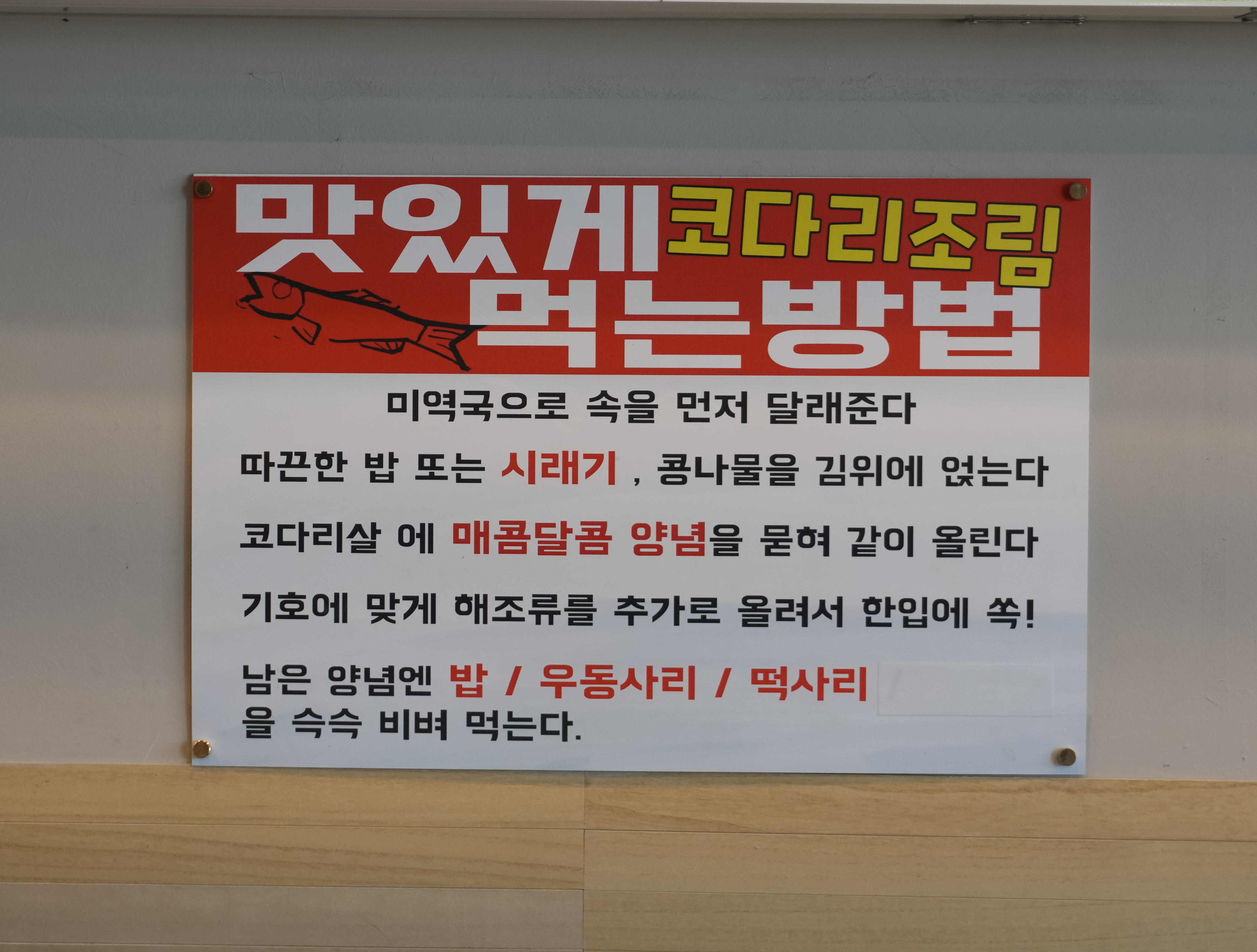 코다리조림 맛있게 먹는 방법이라고, 가게에 붙어있던 게시글이 있는데요. ➊ 따끈한 밥 또는 시래기, 콩나물을 김 위에 얹고, ➋ 코다리 살에 양념을 묻혀 같이 올립니다. ➌ 기호에 맞게 해조류를 추가하여 먹으면 된다고 합니다. 대략 위 사진과 같이 먹으면 된다고 보시면 되겠습니다.
